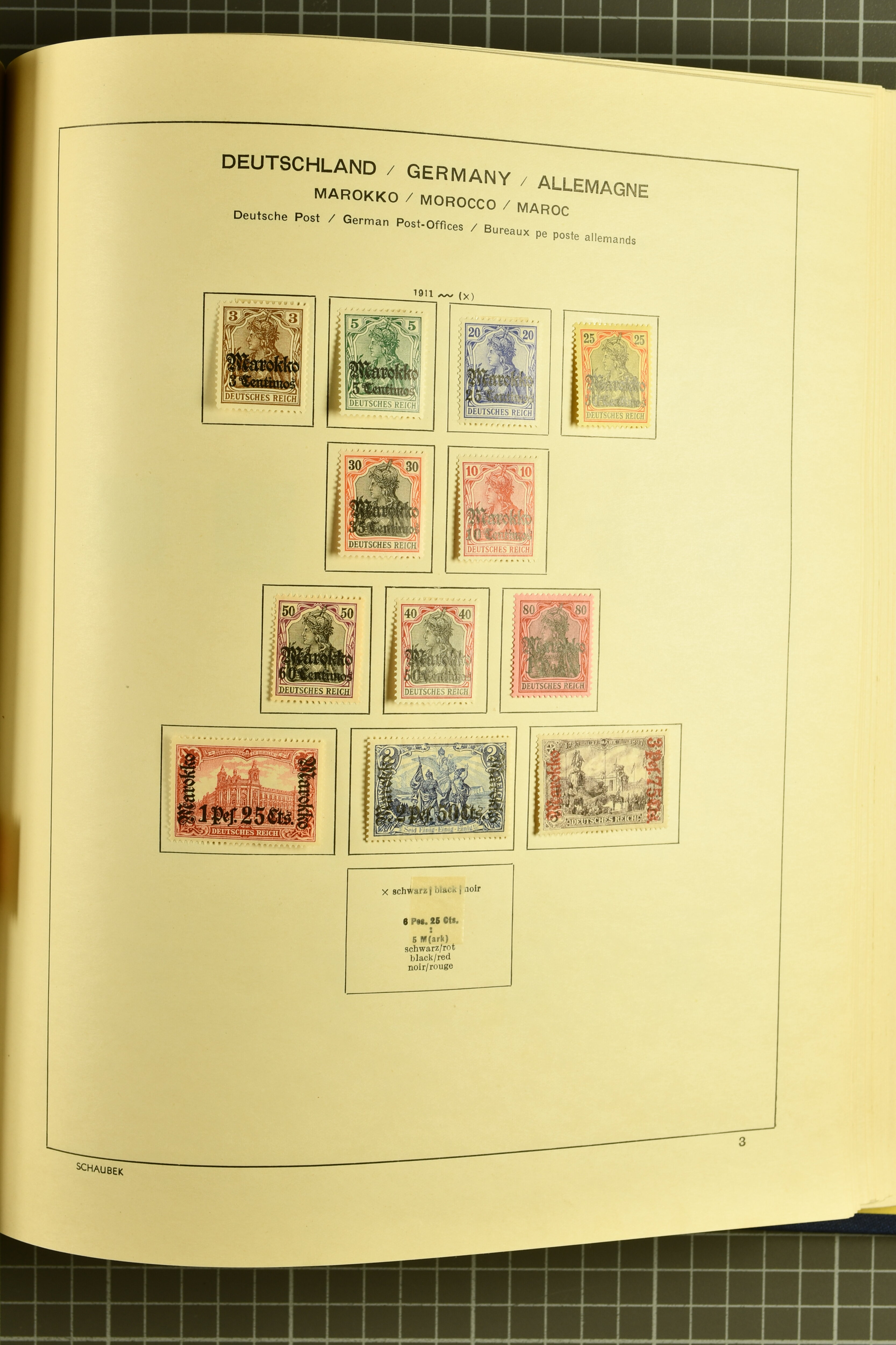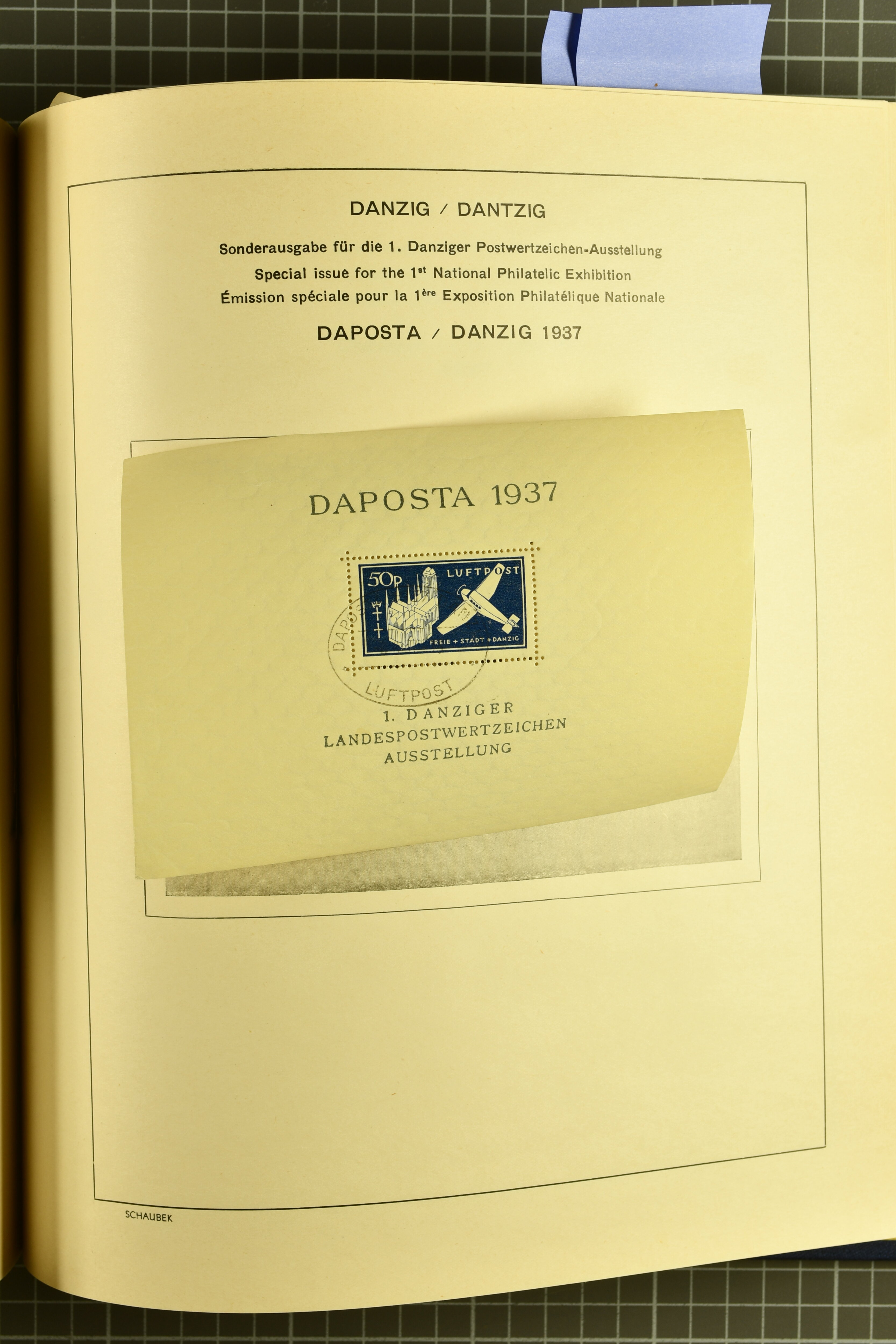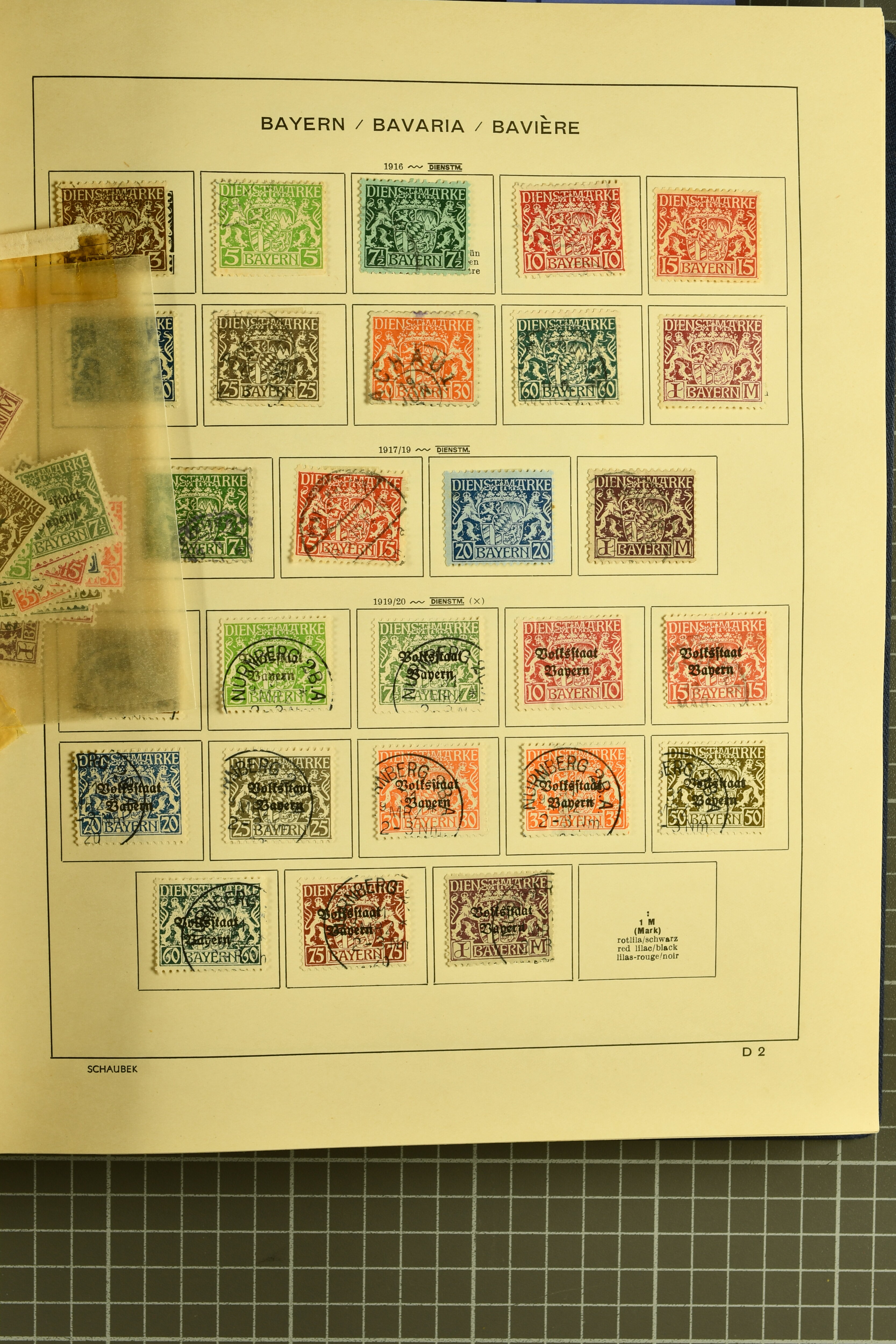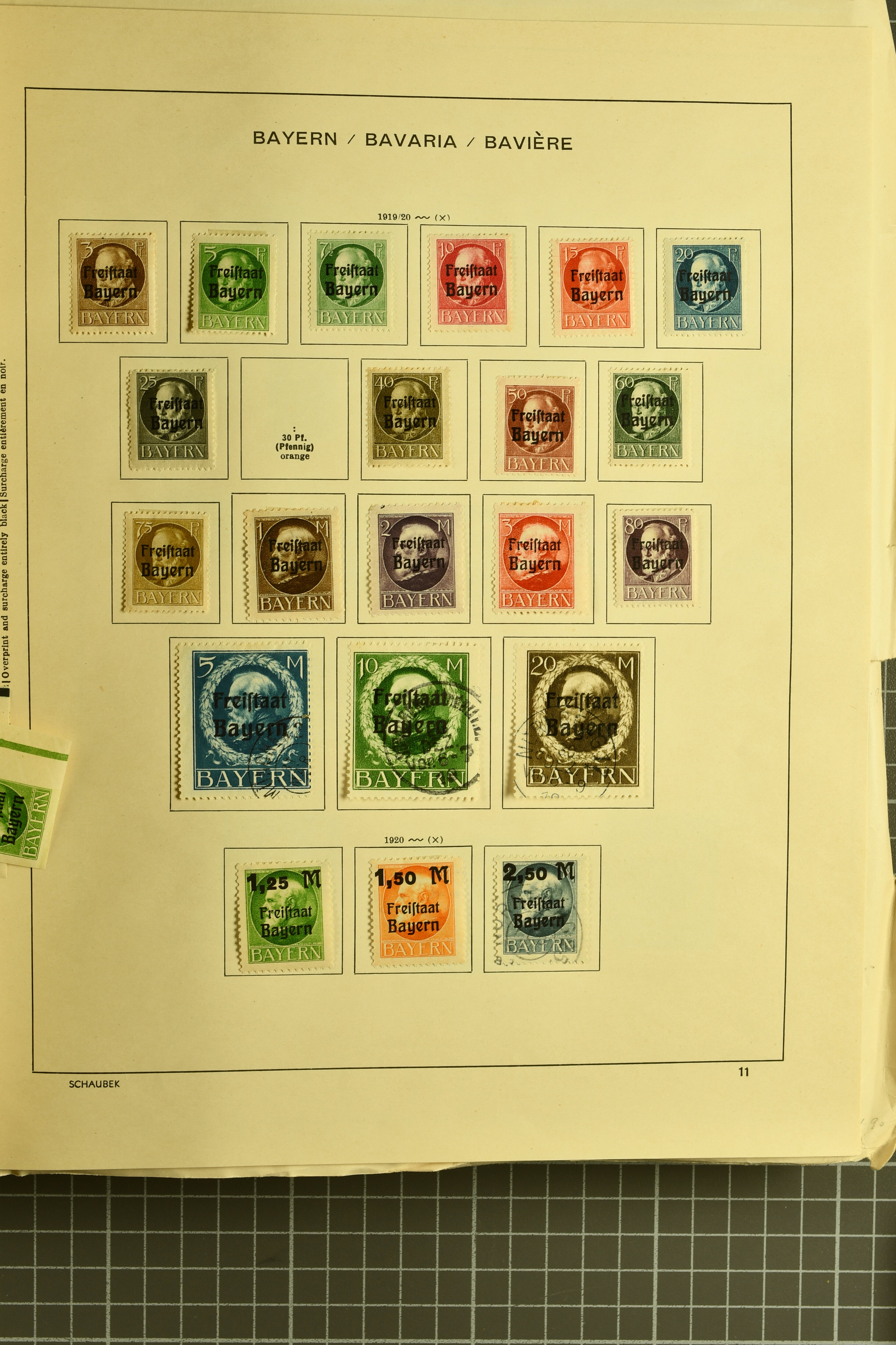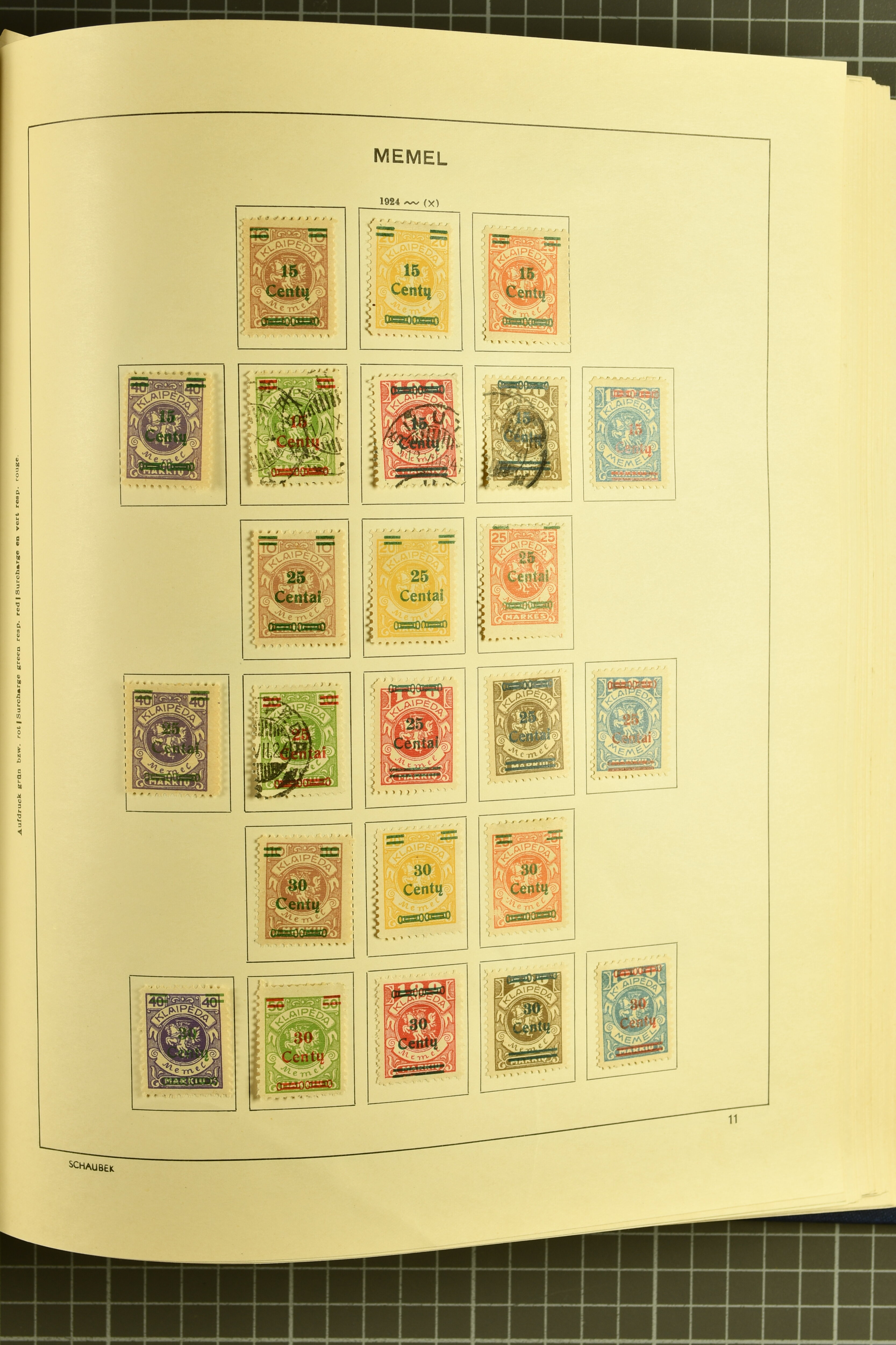 1826 1849/1960ca.: Sammlungskonvolut in insgesamt 9 Vordruckalben, davon 6 Schaubek und 3 mit Vordrucken in Mappen des Noltsch-Verlages, teils mehrfach geführt. Ein Album ab Altdeutschland ist reichhaltig bestückt, wenn auch in sehr unterschiedlicher Qualität. Weitere Bände mit Material in nun zumeist meist besserer Erhaltung vom Deutschen Reich, den Besetzungen und Abstimmungsgebieten, Danzig, Memel sowie den Kolonien. Ein Nachkriegsband mit u. a. mehreren Blättern Bezirkshandstempel (o. Obl.). Jeweils bis zu den mittleren Werte ausgebaut mit vielen Blocks und auch Lokalausgaben. Ungebrauchte Marken zumeist noch in älteren Zellophanhüllen eingepackt; Stichproben ergaben bei Vorkriegsmarken überwiegend Falz, Nachkriegsausgaben, wenn ungebraucht, dann meist postfrisch