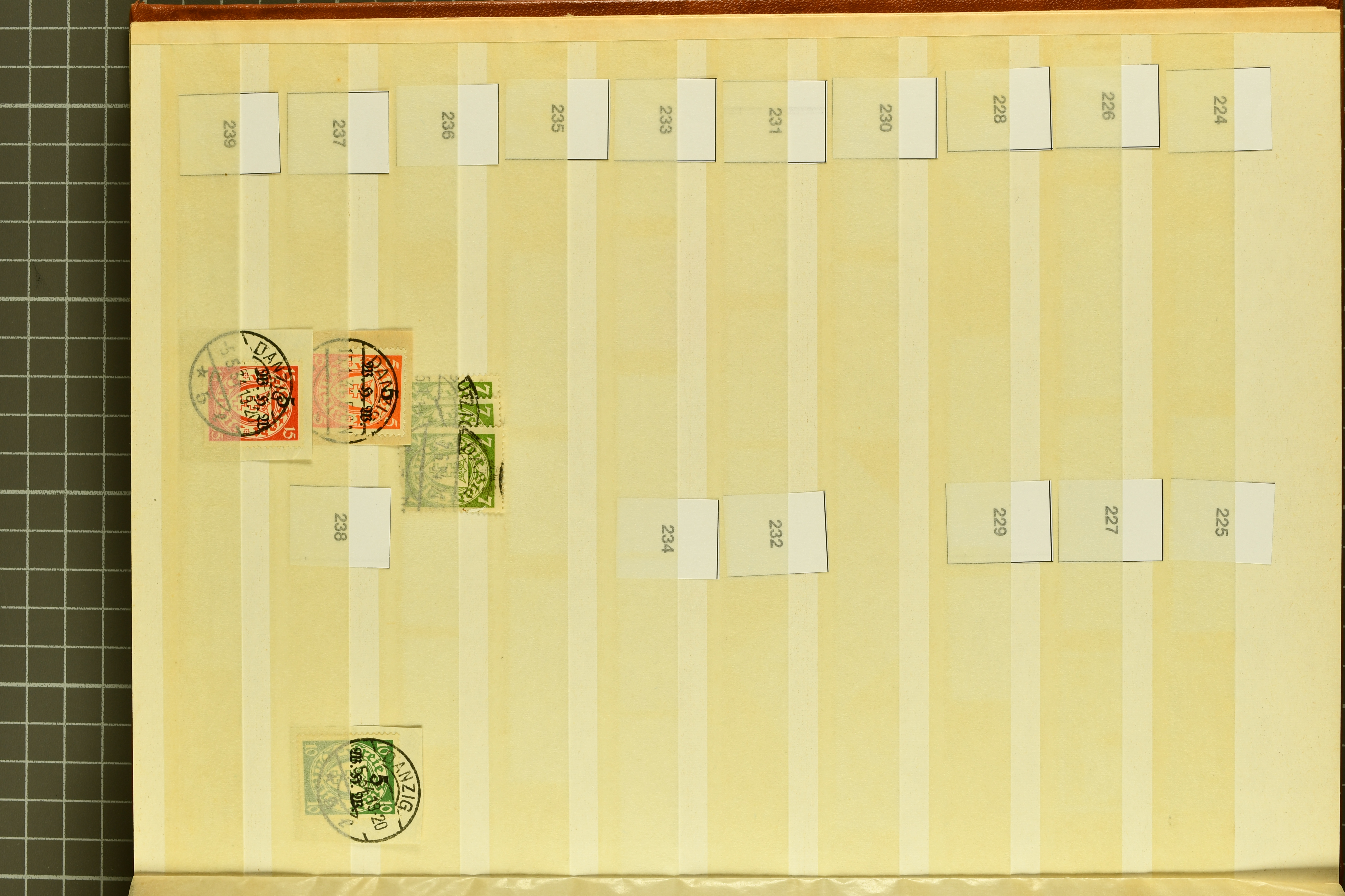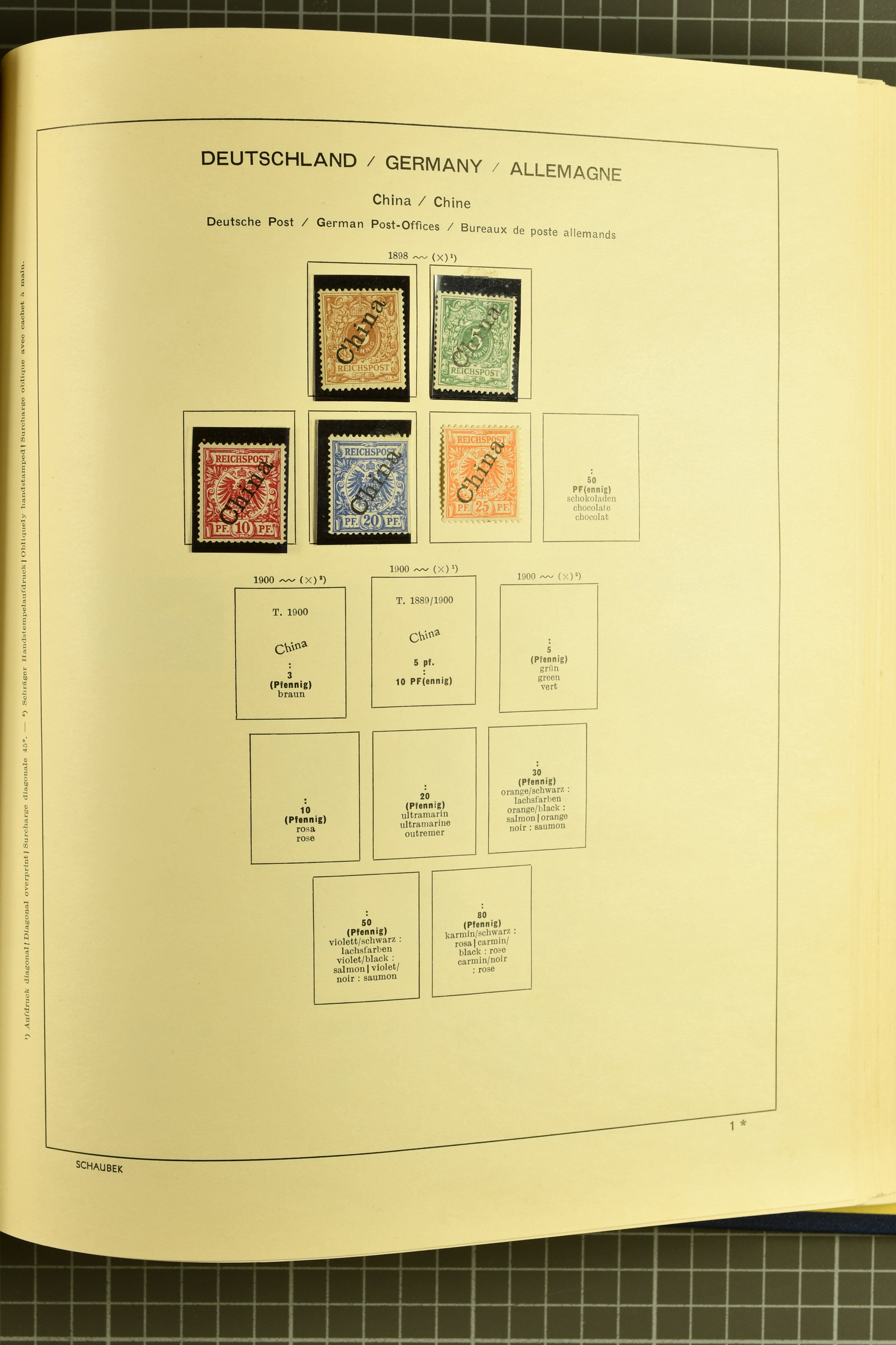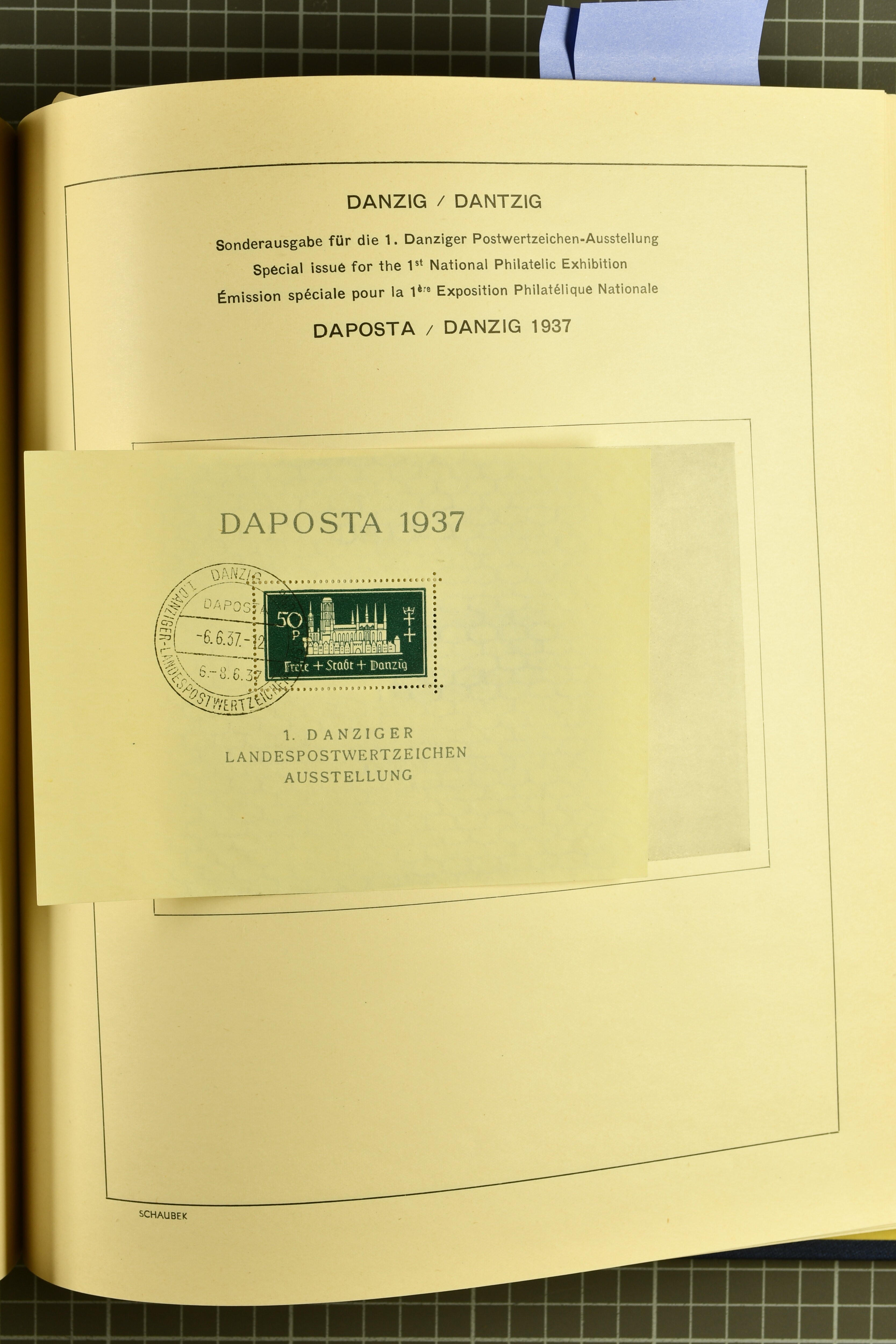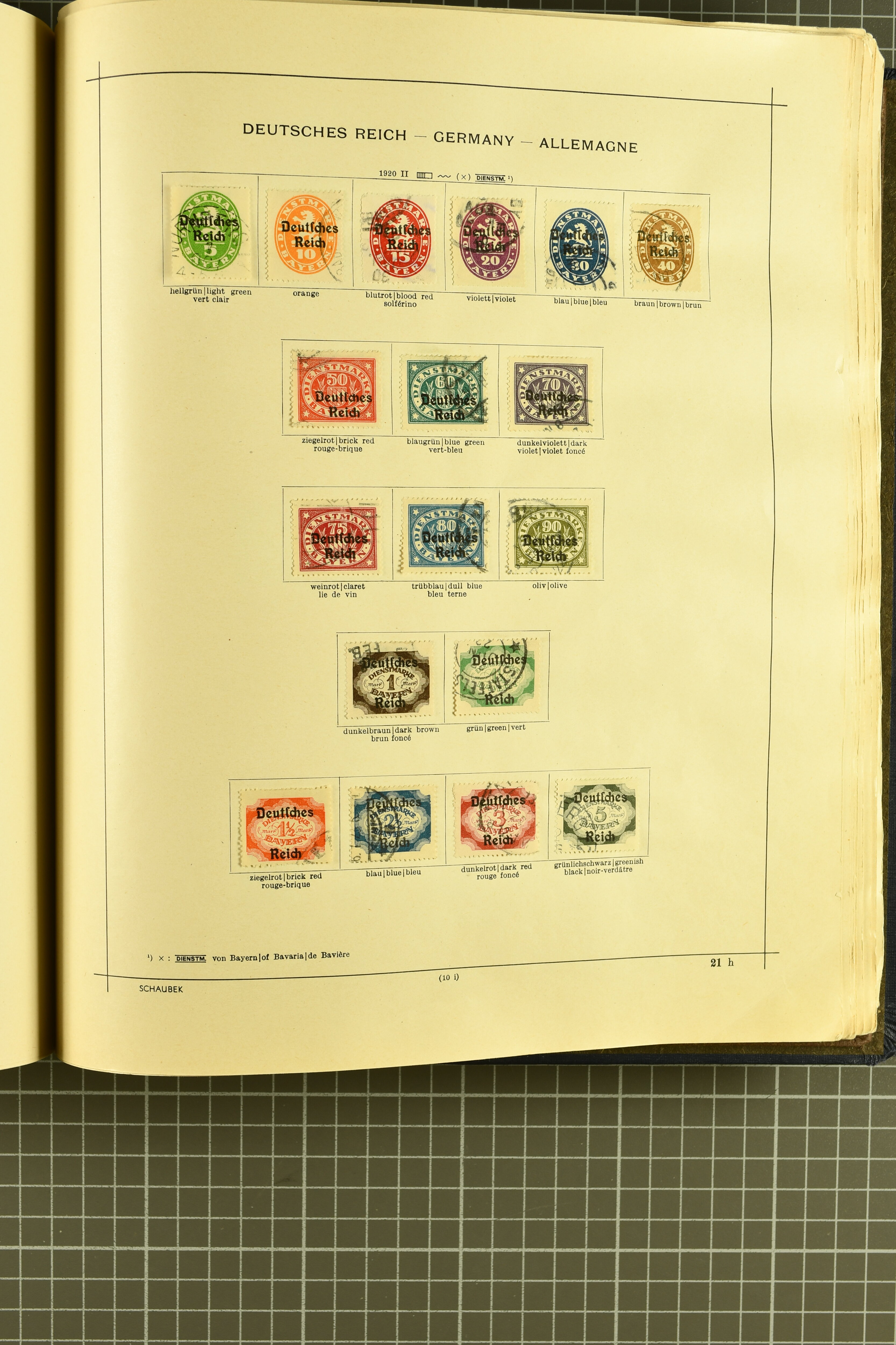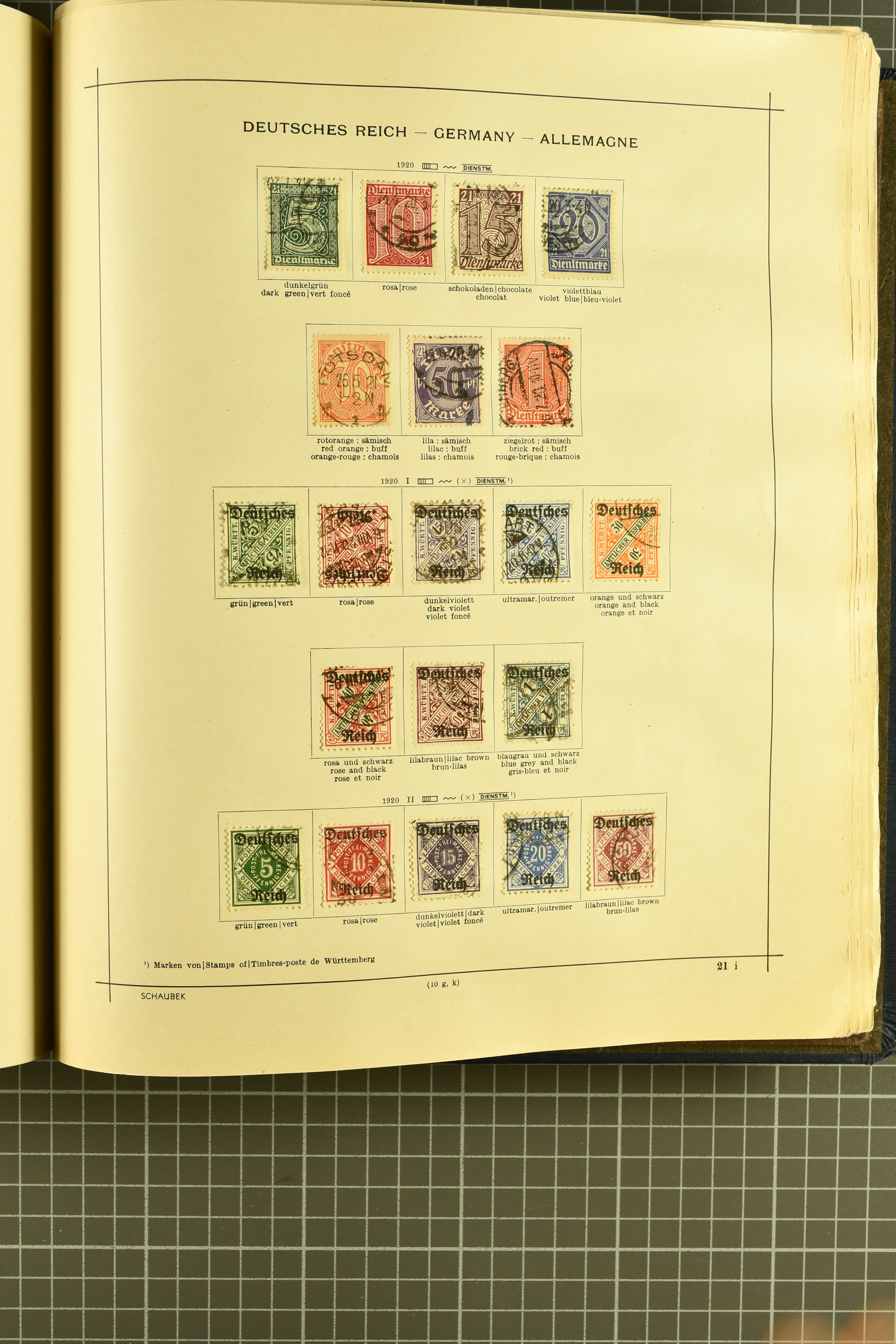 1826 1849/1960ca.: Sammlungskonvolut in insgesamt 9 Vordruckalben, davon 6 Schaubek und 3 mit Vordrucken in Mappen des Noltsch-Verlages, teils mehrfach geführt. Ein Album ab Altdeutschland ist reichhaltig bestückt, wenn auch in sehr unterschiedlicher Qualität. Weitere Bände mit Material in nun zumeist meist besserer Erhaltung vom Deutschen Reich, den Besetzungen und Abstimmungsgebieten, Danzig, Memel sowie den Kolonien. Ein Nachkriegsband mit u. a. mehreren Blättern Bezirkshandstempel (o. Obl.). Jeweils bis zu den mittleren Werte ausgebaut mit vielen Blocks und auch Lokalausgaben. Ungebrauchte Marken zumeist noch in älteren Zellophanhüllen eingepackt; Stichproben ergaben bei Vorkriegsmarken überwiegend Falz, Nachkriegsausgaben, wenn ungebraucht, dann meist postfrisch
