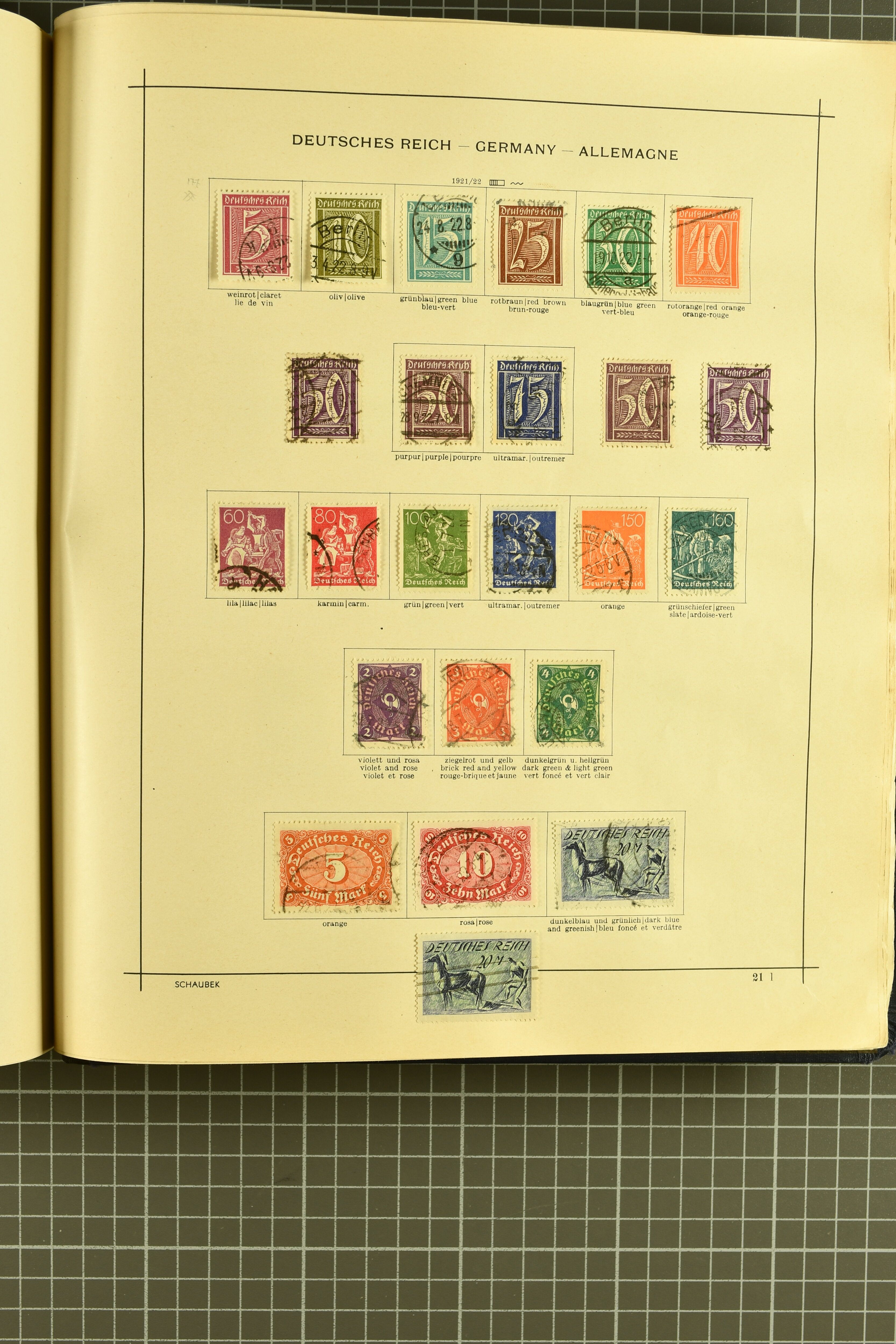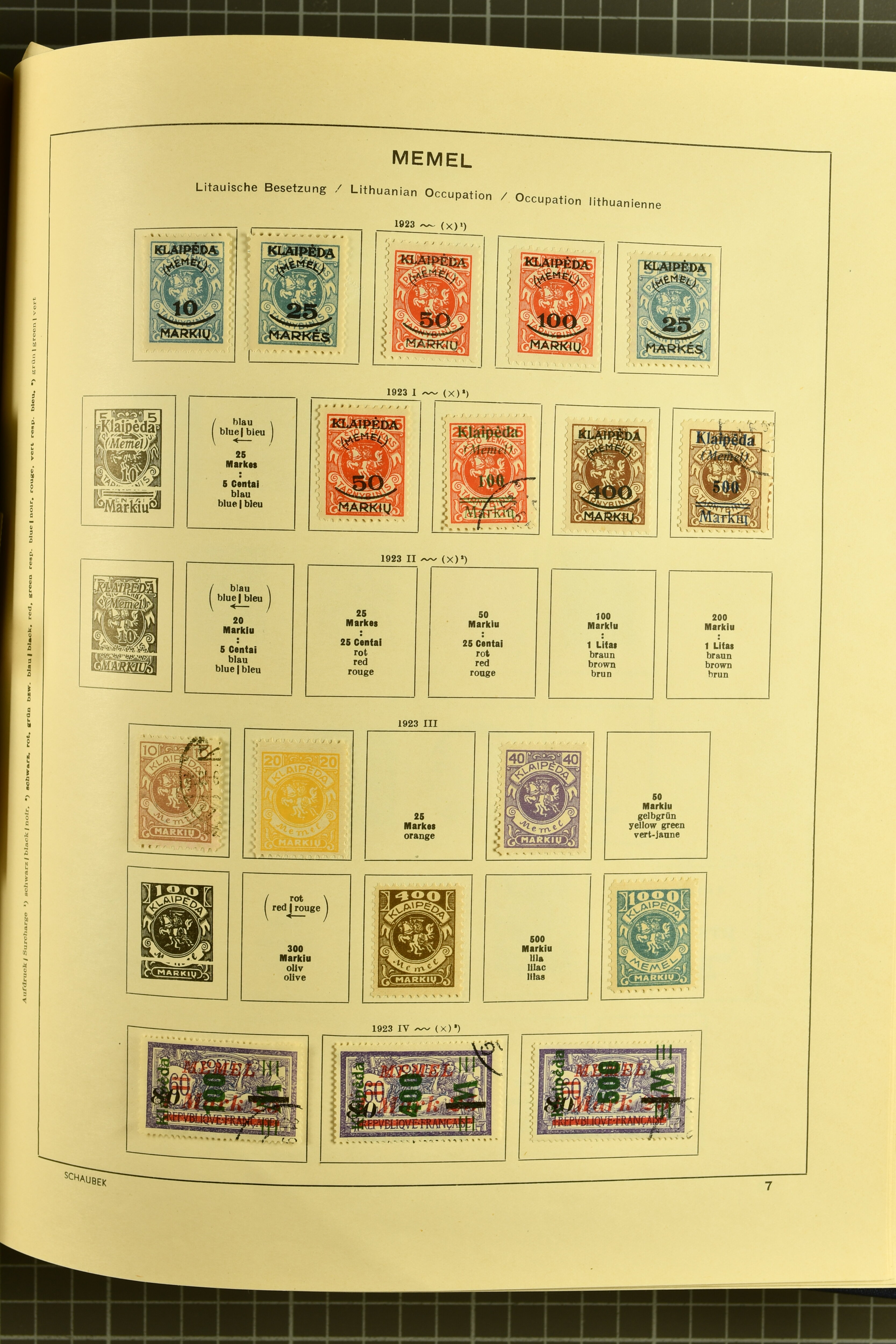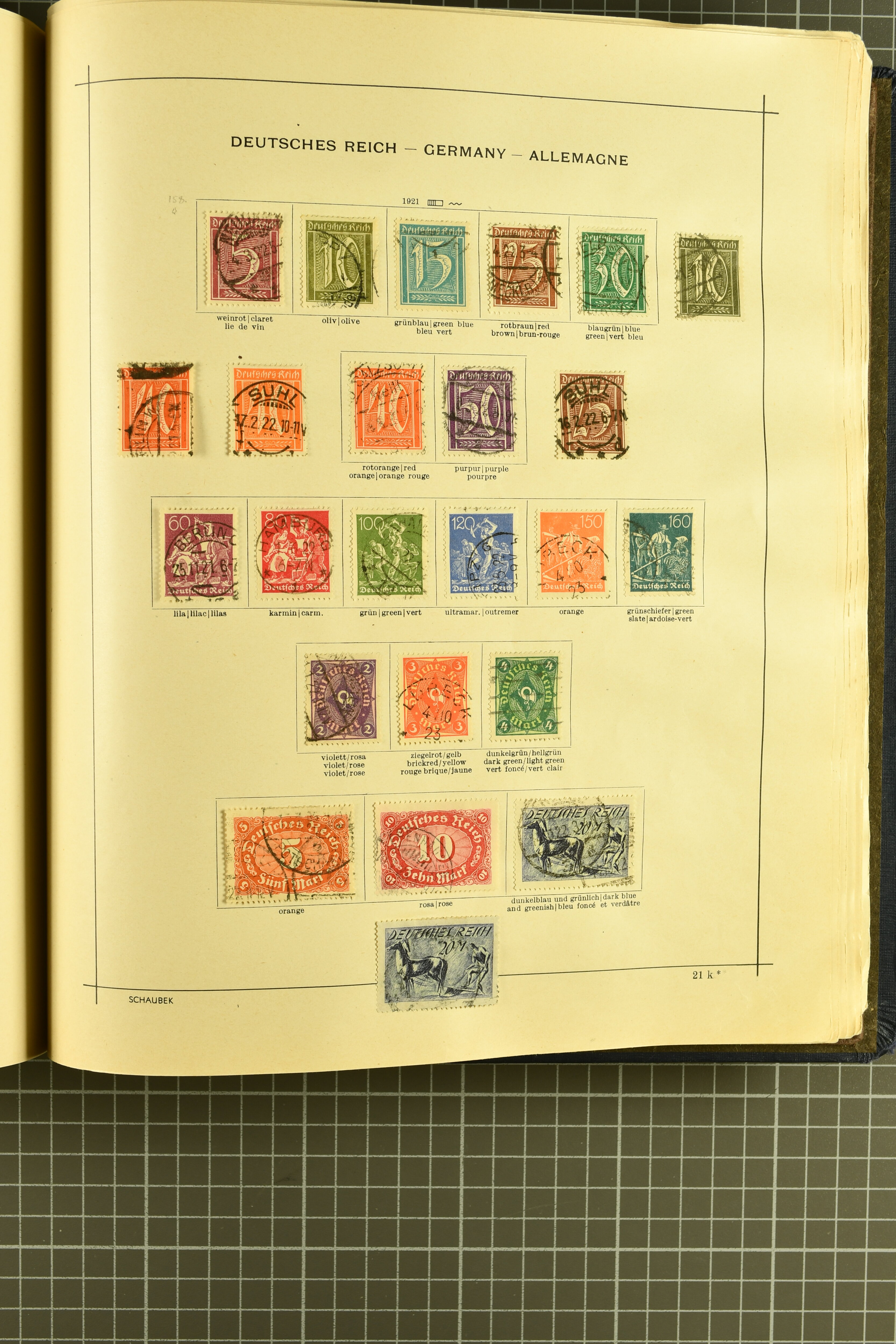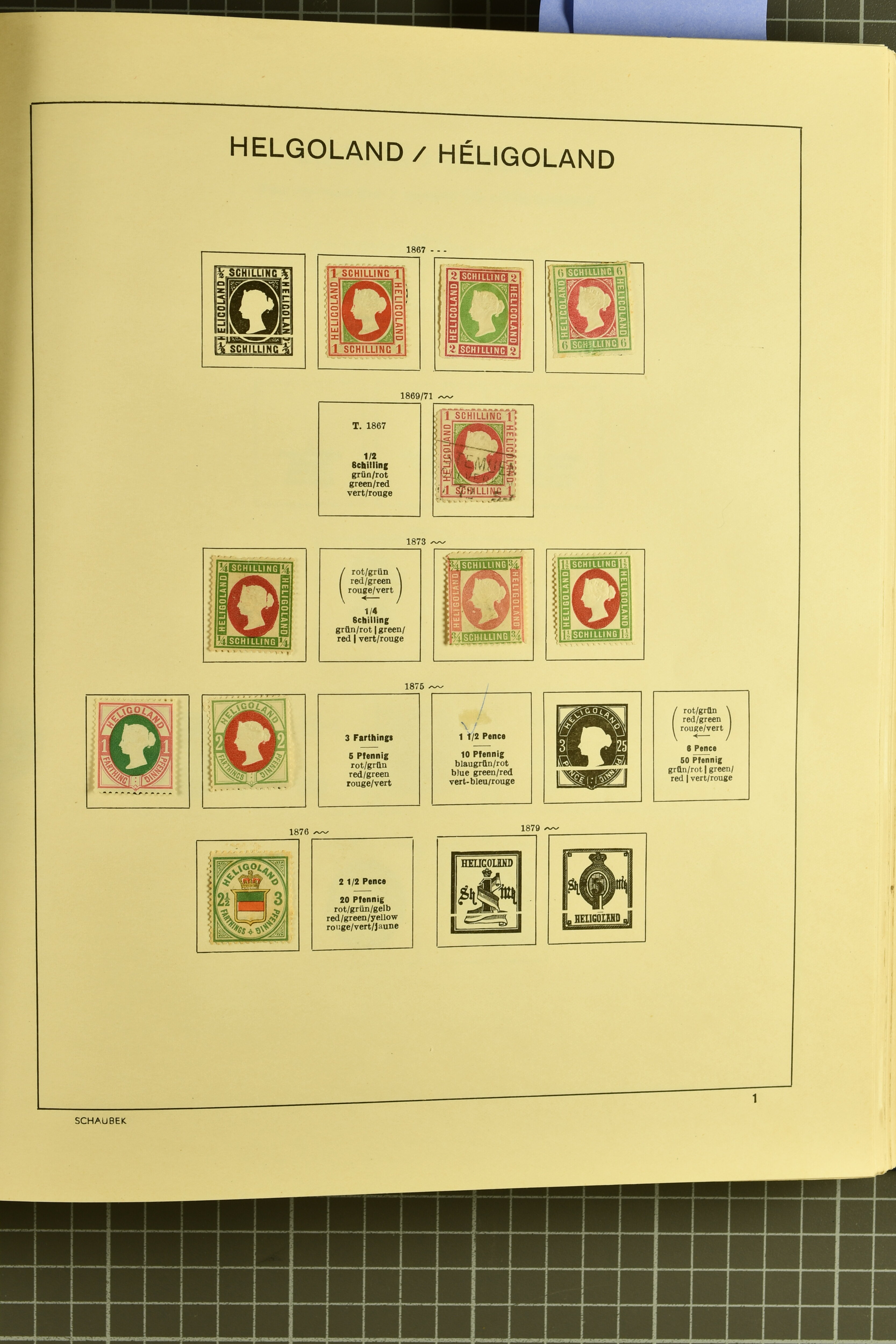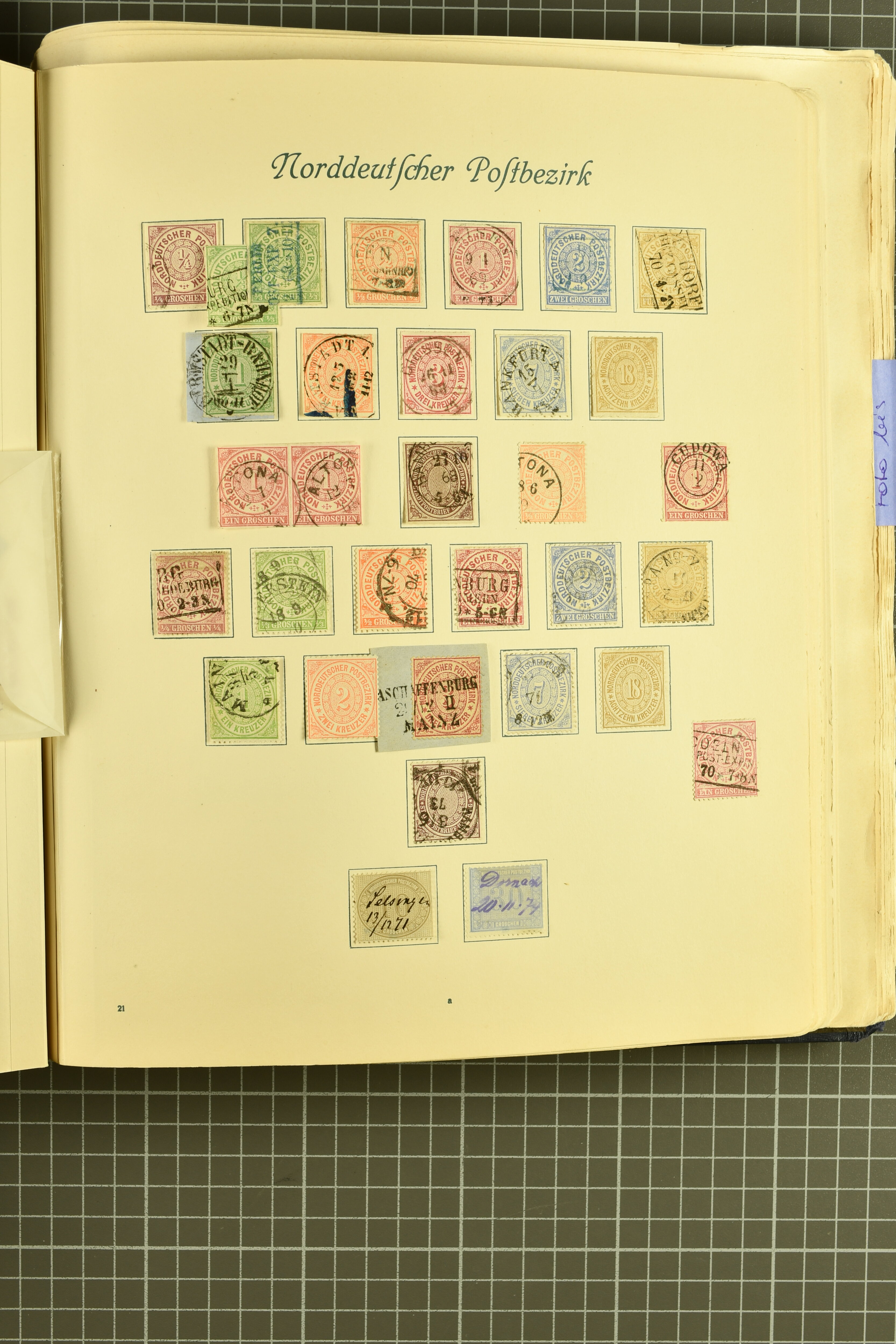 1826 1849/1960ca.: Sammlungskonvolut in insgesamt 9 Vordruckalben, davon 6 Schaubek und 3 mit Vordrucken in Mappen des Noltsch-Verlages, teils mehrfach geführt. Ein Album ab Altdeutschland ist reichhaltig bestückt, wenn auch in sehr unterschiedlicher Qualität. Weitere Bände mit Material in nun zumeist meist besserer Erhaltung vom Deutschen Reich, den Besetzungen und Abstimmungsgebieten, Danzig, Memel sowie den Kolonien. Ein Nachkriegsband mit u. a. mehreren Blättern Bezirkshandstempel (o. Obl.). Jeweils bis zu den mittleren Werte ausgebaut mit vielen Blocks und auch Lokalausgaben. Ungebrauchte Marken zumeist noch in älteren Zellophanhüllen eingepackt; Stichproben ergaben bei Vorkriegsmarken überwiegend Falz, Nachkriegsausgaben, wenn ungebraucht, dann meist postfrisch