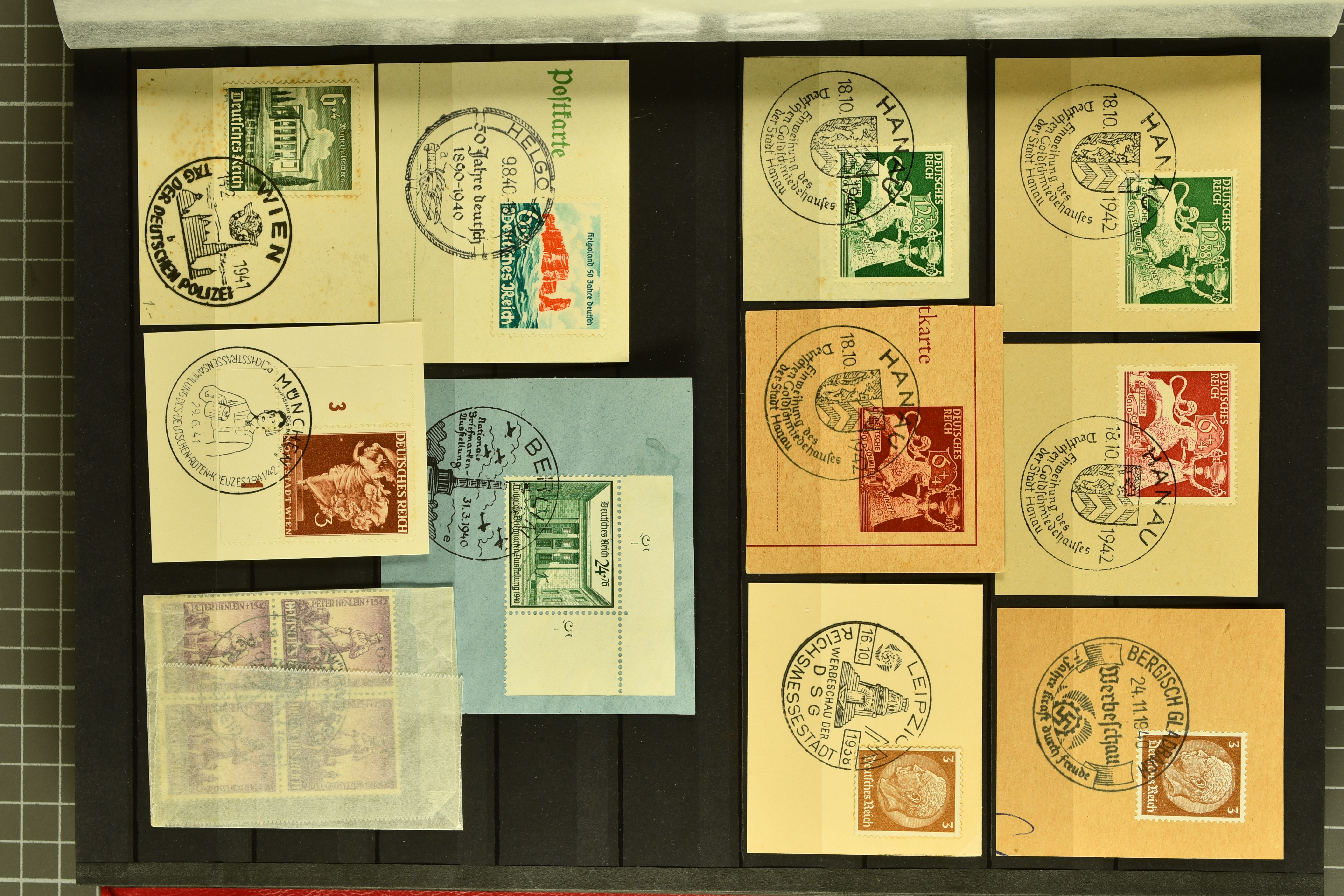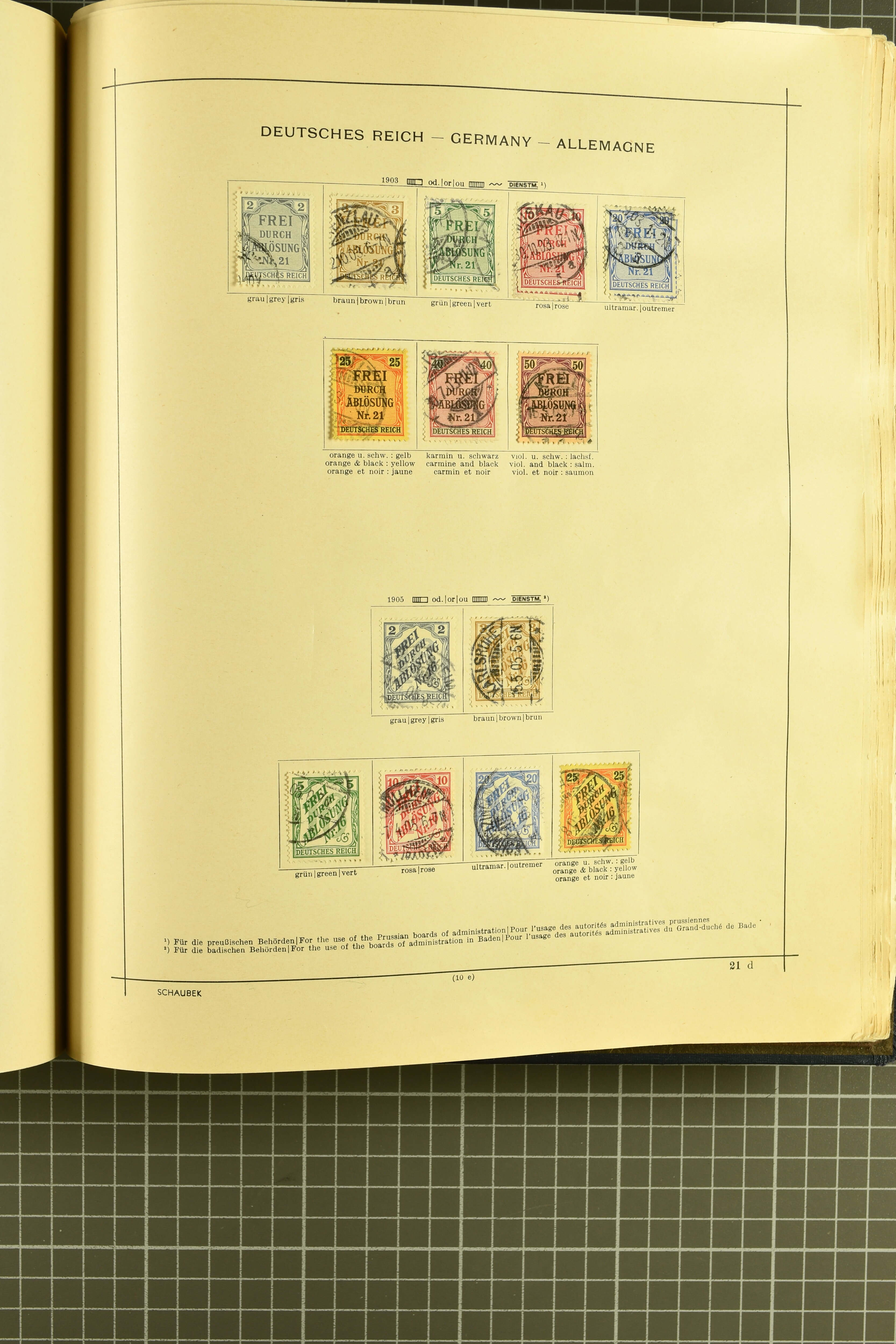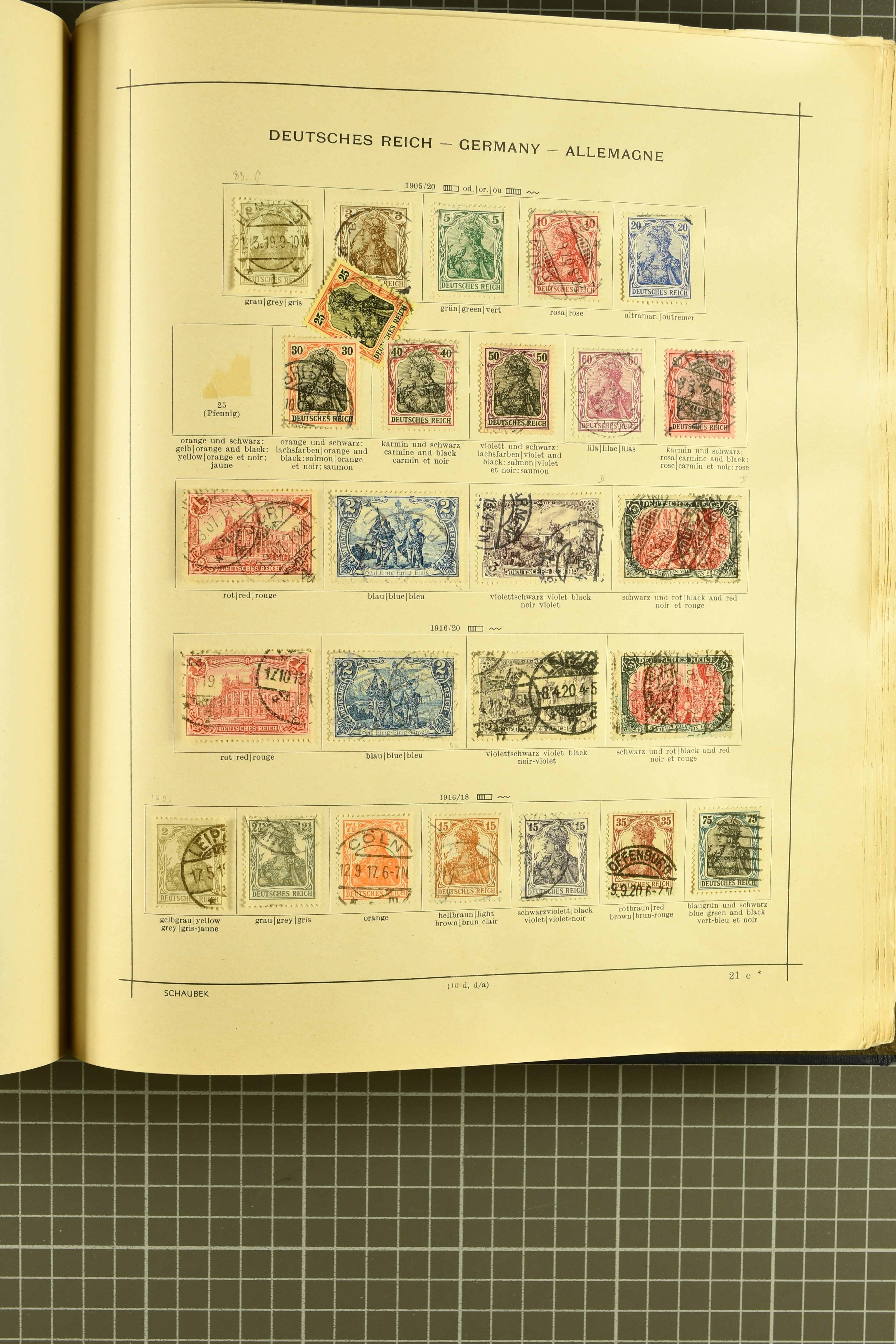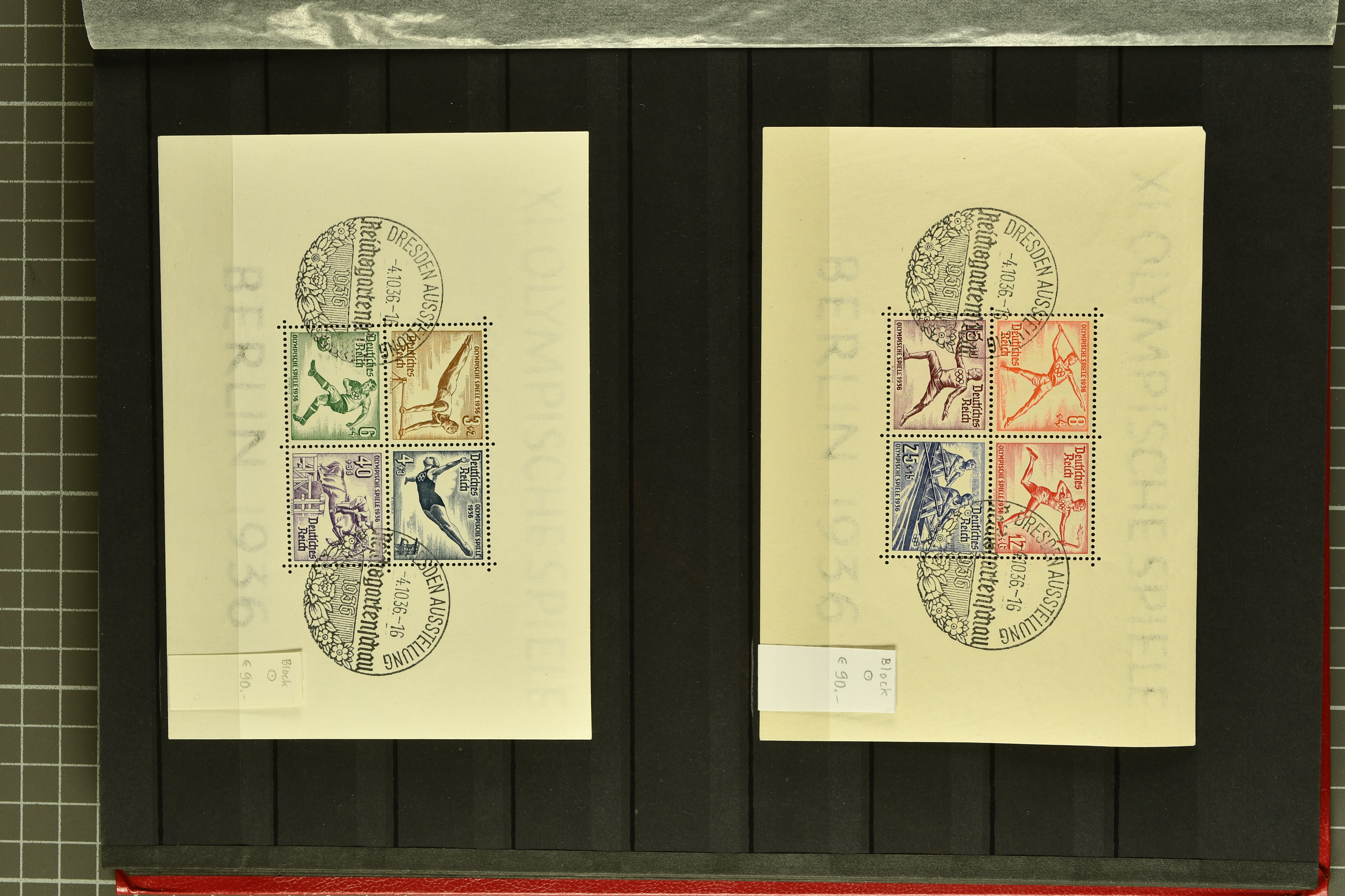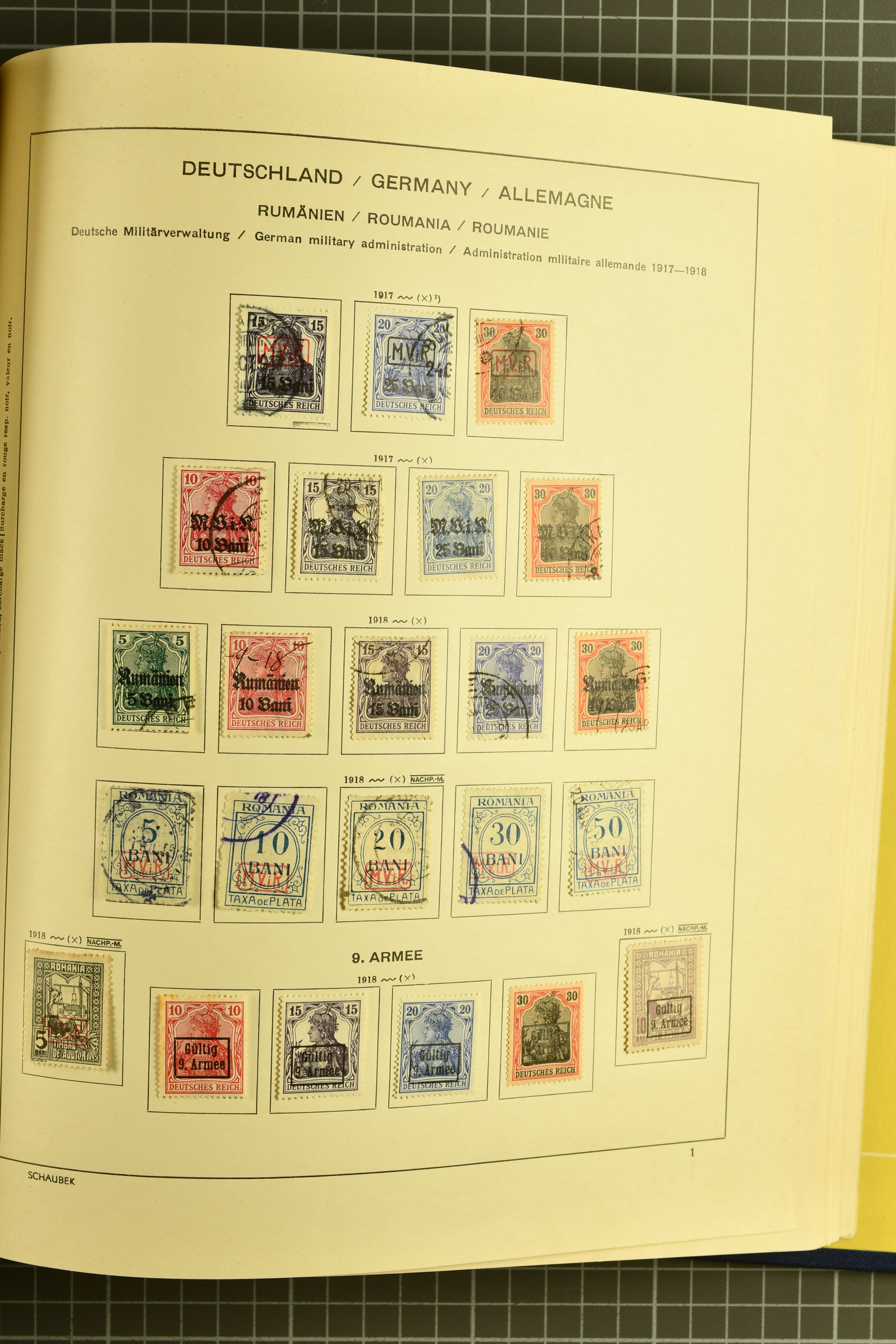 1826 1849/1960ca.: Sammlungskonvolut in insgesamt 9 Vordruckalben, davon 6 Schaubek und 3 mit Vordrucken in Mappen des Noltsch-Verlages, teils mehrfach geführt. Ein Album ab Altdeutschland ist reichhaltig bestückt, wenn auch in sehr unterschiedlicher Qualität. Weitere Bände mit Material in nun zumeist meist besserer Erhaltung vom Deutschen Reich, den Besetzungen und Abstimmungsgebieten, Danzig, Memel sowie den Kolonien. Ein Nachkriegsband mit u. a. mehreren Blättern Bezirkshandstempel (o. Obl.). Jeweils bis zu den mittleren Werte ausgebaut mit vielen Blocks und auch Lokalausgaben. Ungebrauchte Marken zumeist noch in älteren Zellophanhüllen eingepackt; Stichproben ergaben bei Vorkriegsmarken überwiegend Falz, Nachkriegsausgaben, wenn ungebraucht, dann meist postfrisch
