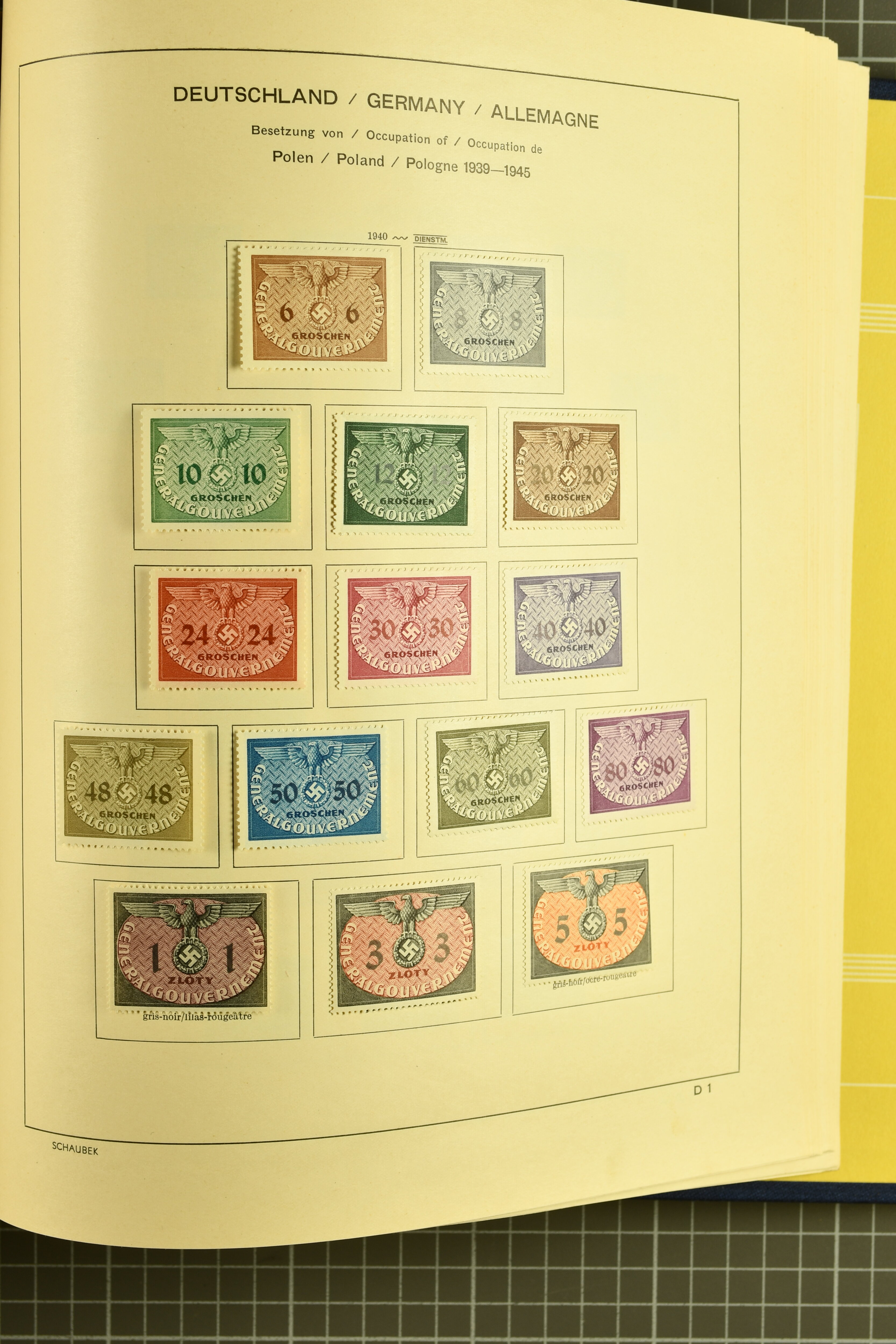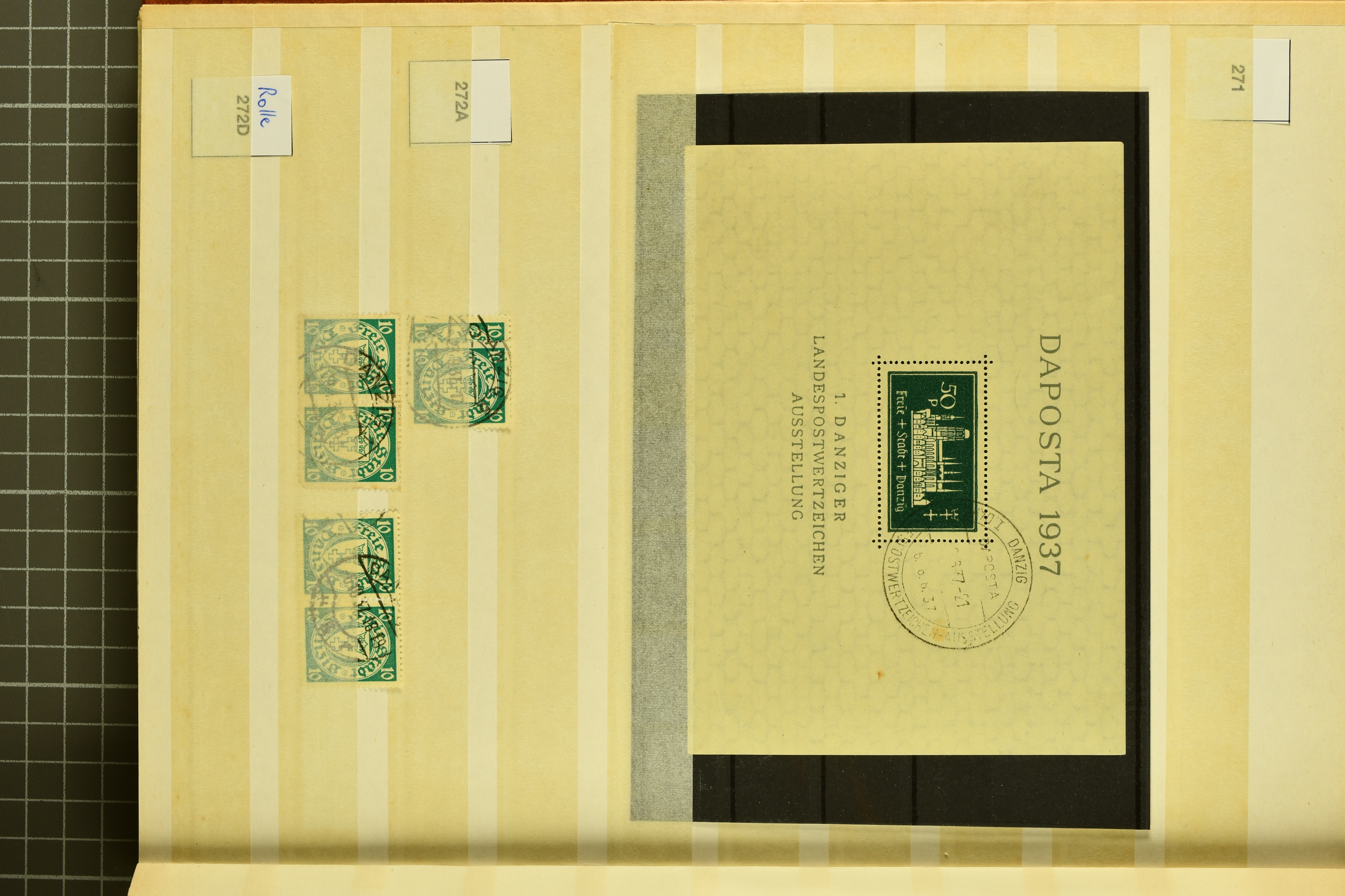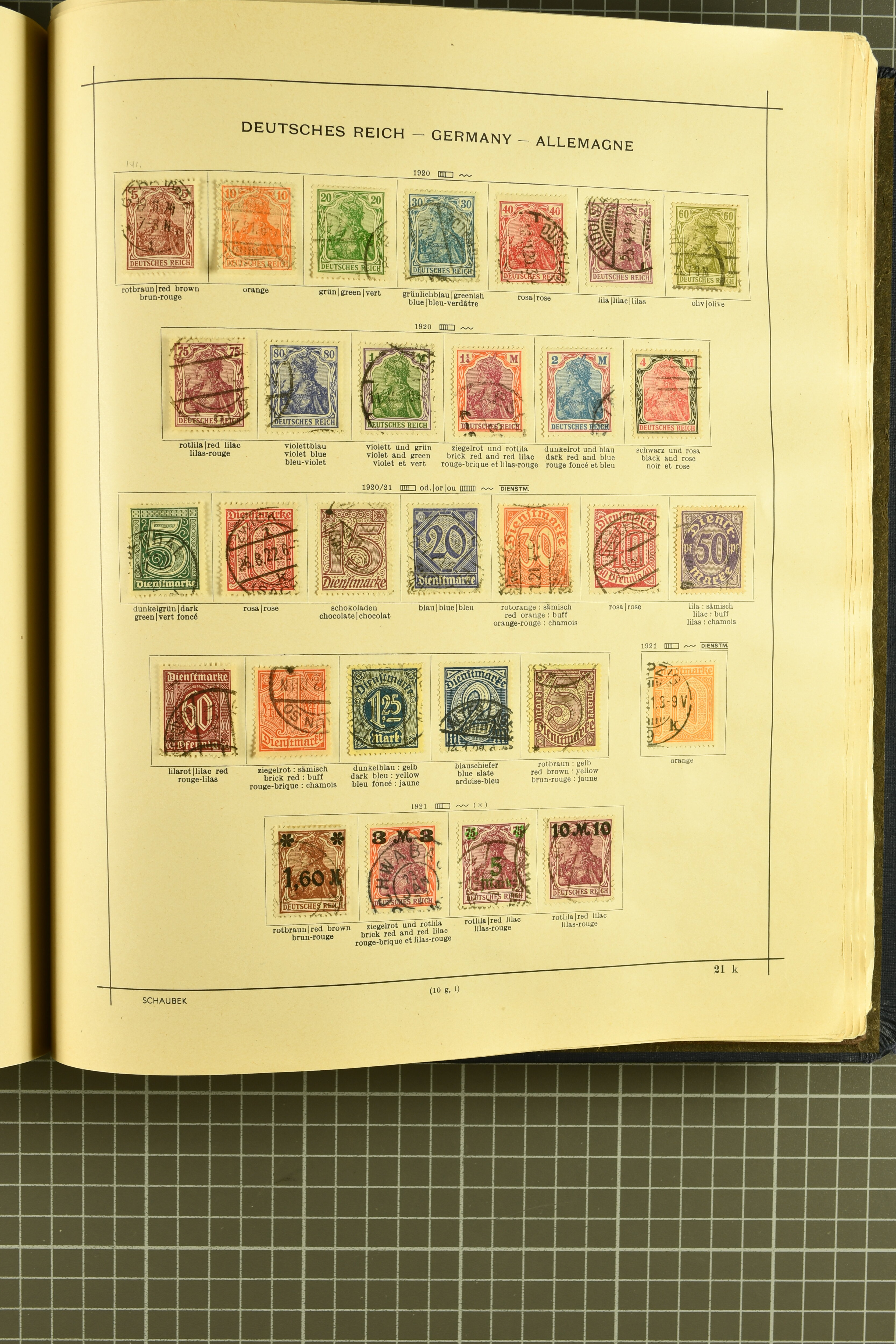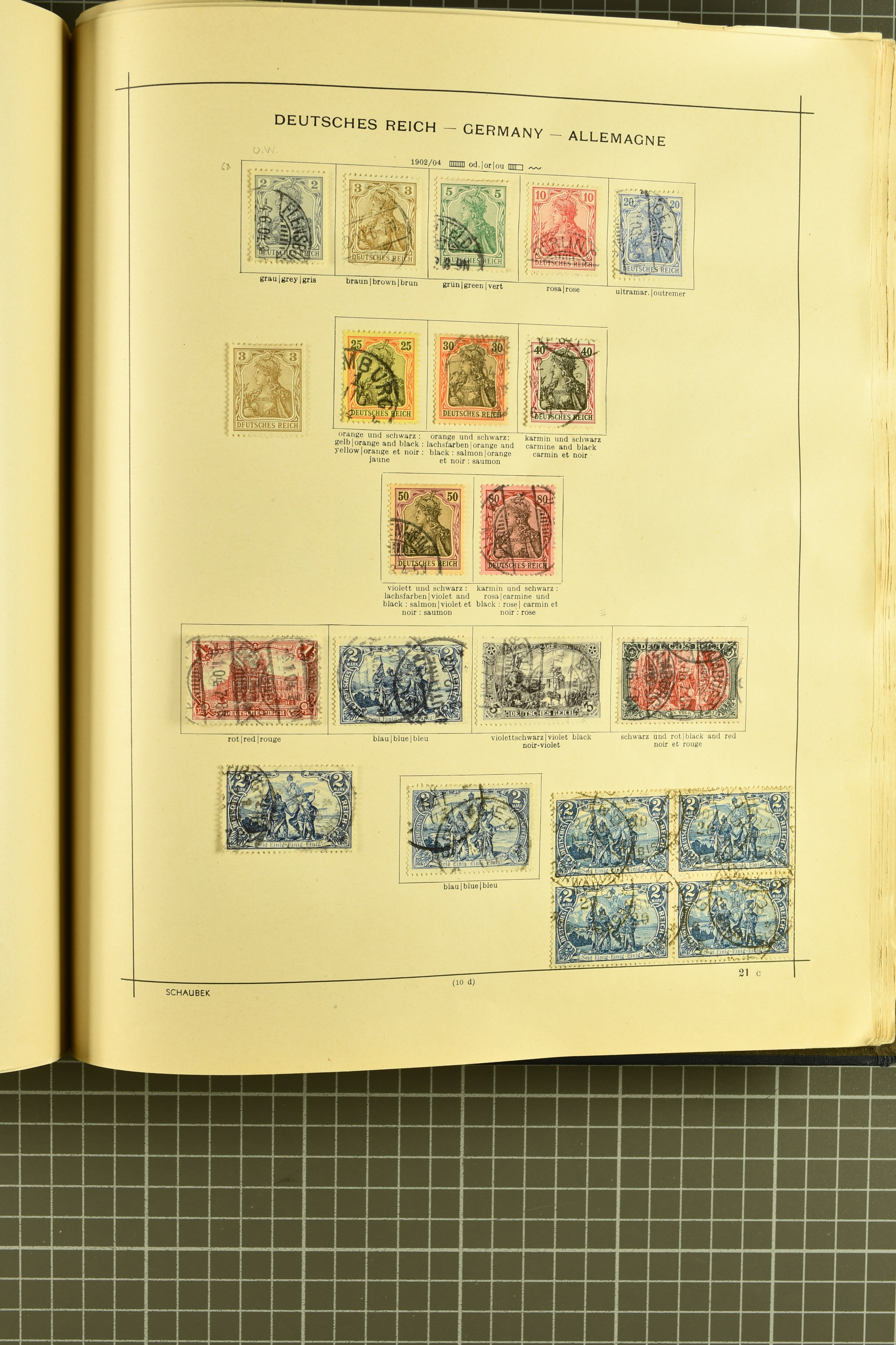 1826 1849/1960ca.: Sammlungskonvolut in insgesamt 9 Vordruckalben, davon 6 Schaubek und 3 mit Vordrucken in Mappen des Noltsch-Verlages, teils mehrfach geführt. Ein Album ab Altdeutschland ist reichhaltig bestückt, wenn auch in sehr unterschiedlicher Qualität. Weitere Bände mit Material in nun zumeist meist besserer Erhaltung vom Deutschen Reich, den Besetzungen und Abstimmungsgebieten, Danzig, Memel sowie den Kolonien. Ein Nachkriegsband mit u. a. mehreren Blättern Bezirkshandstempel (o. Obl.). Jeweils bis zu den mittleren Werte ausgebaut mit vielen Blocks und auch Lokalausgaben. Ungebrauchte Marken zumeist noch in älteren Zellophanhüllen eingepackt; Stichproben ergaben bei Vorkriegsmarken überwiegend Falz, Nachkriegsausgaben, wenn ungebraucht, dann meist postfrisch