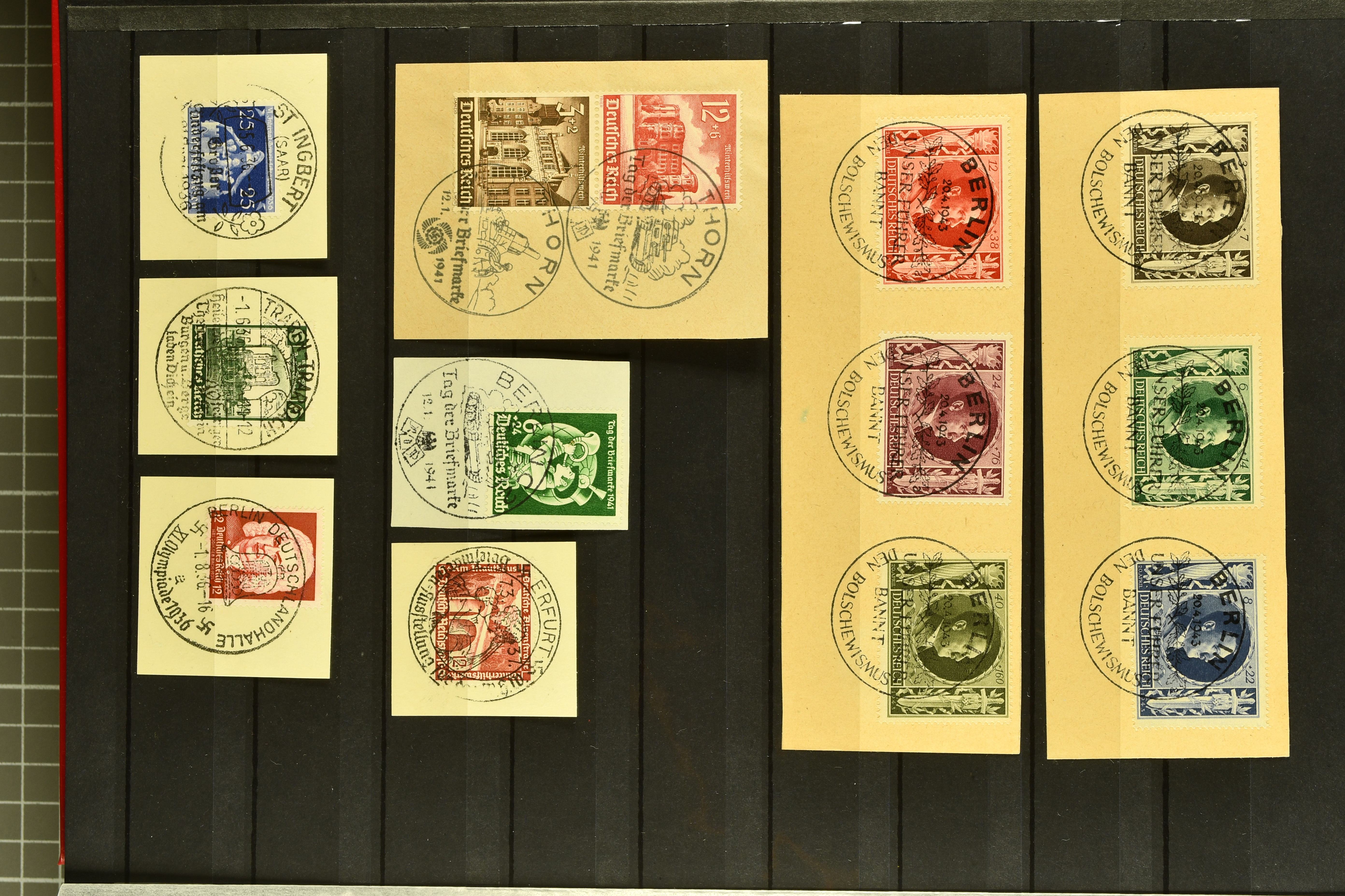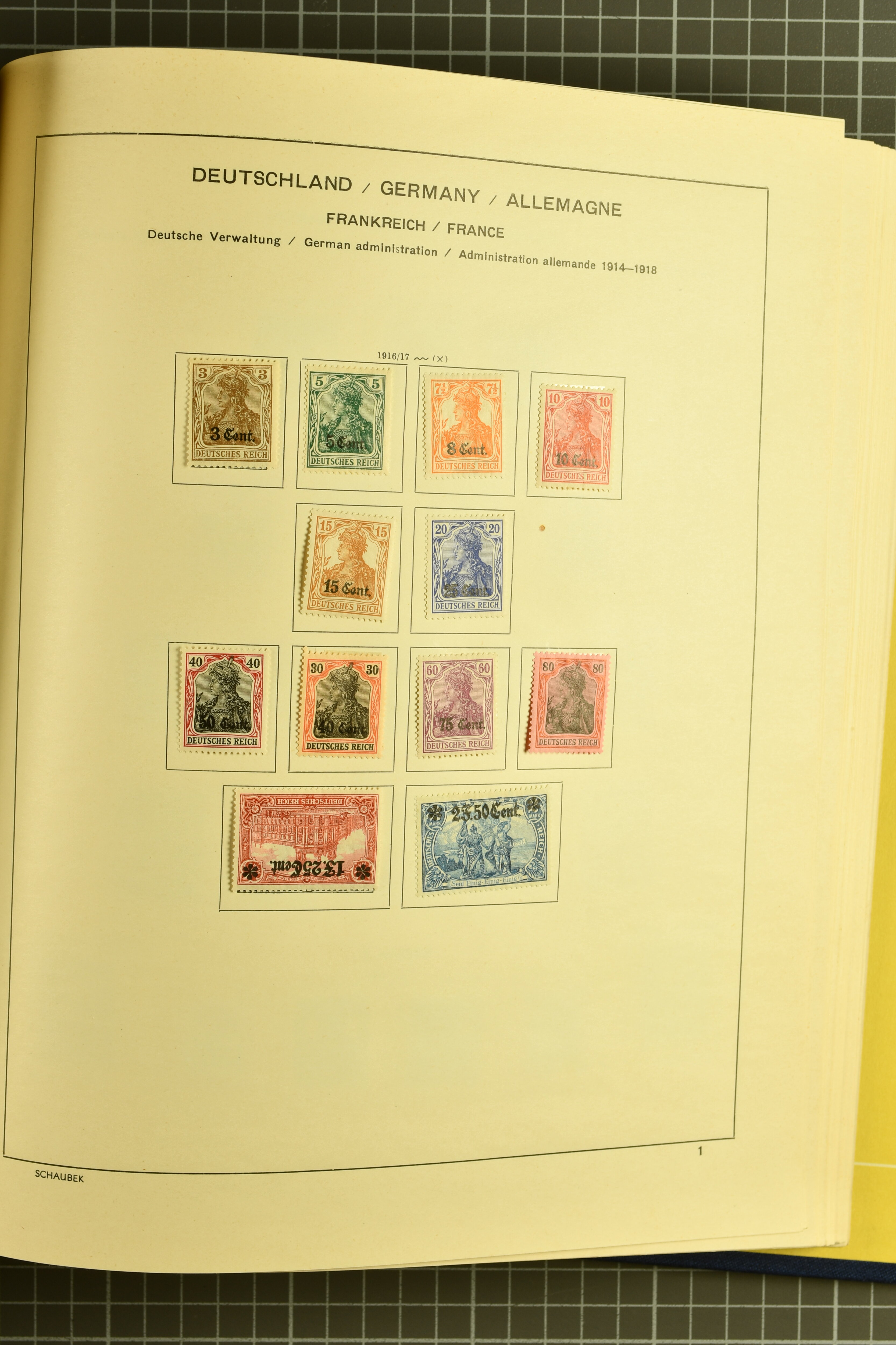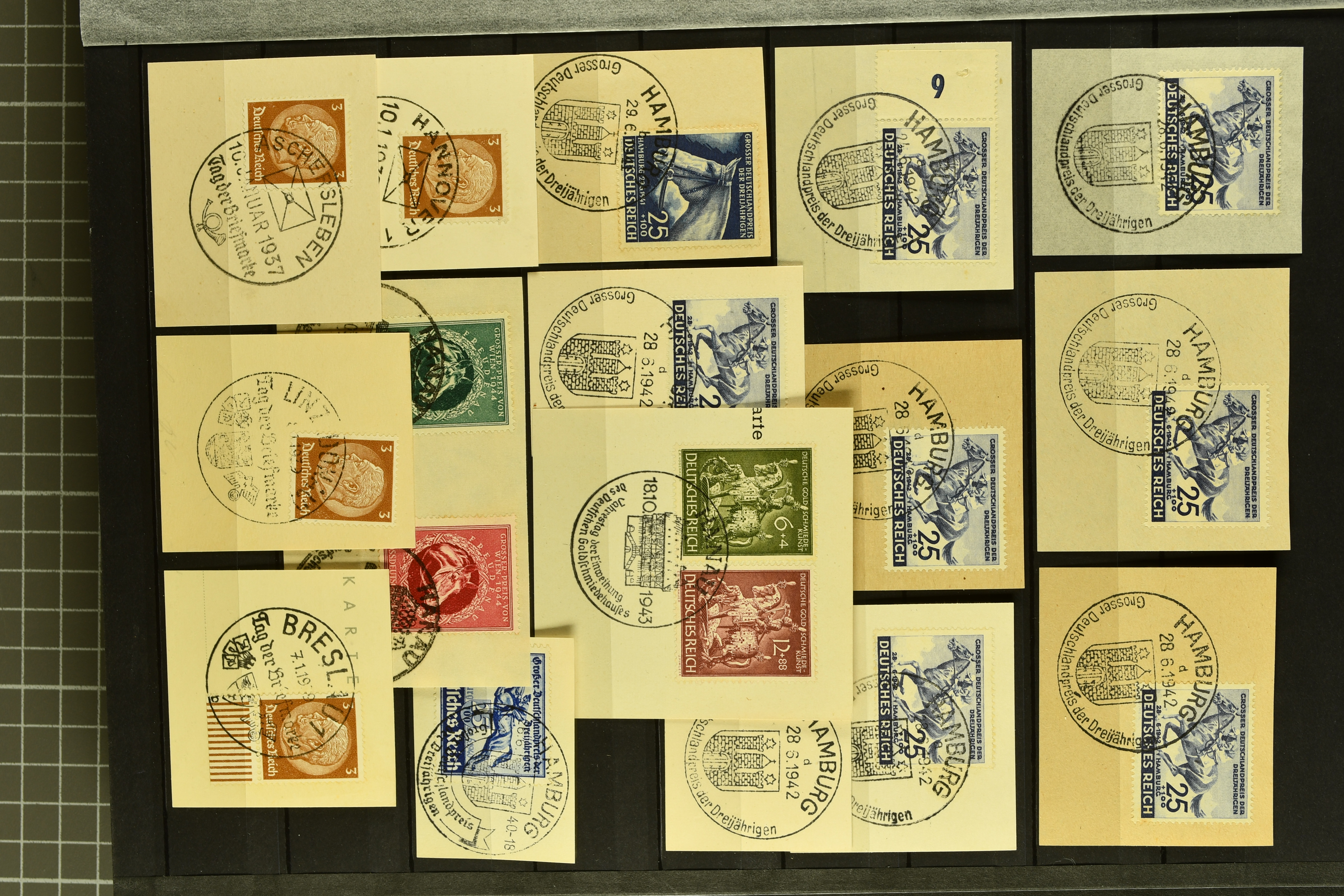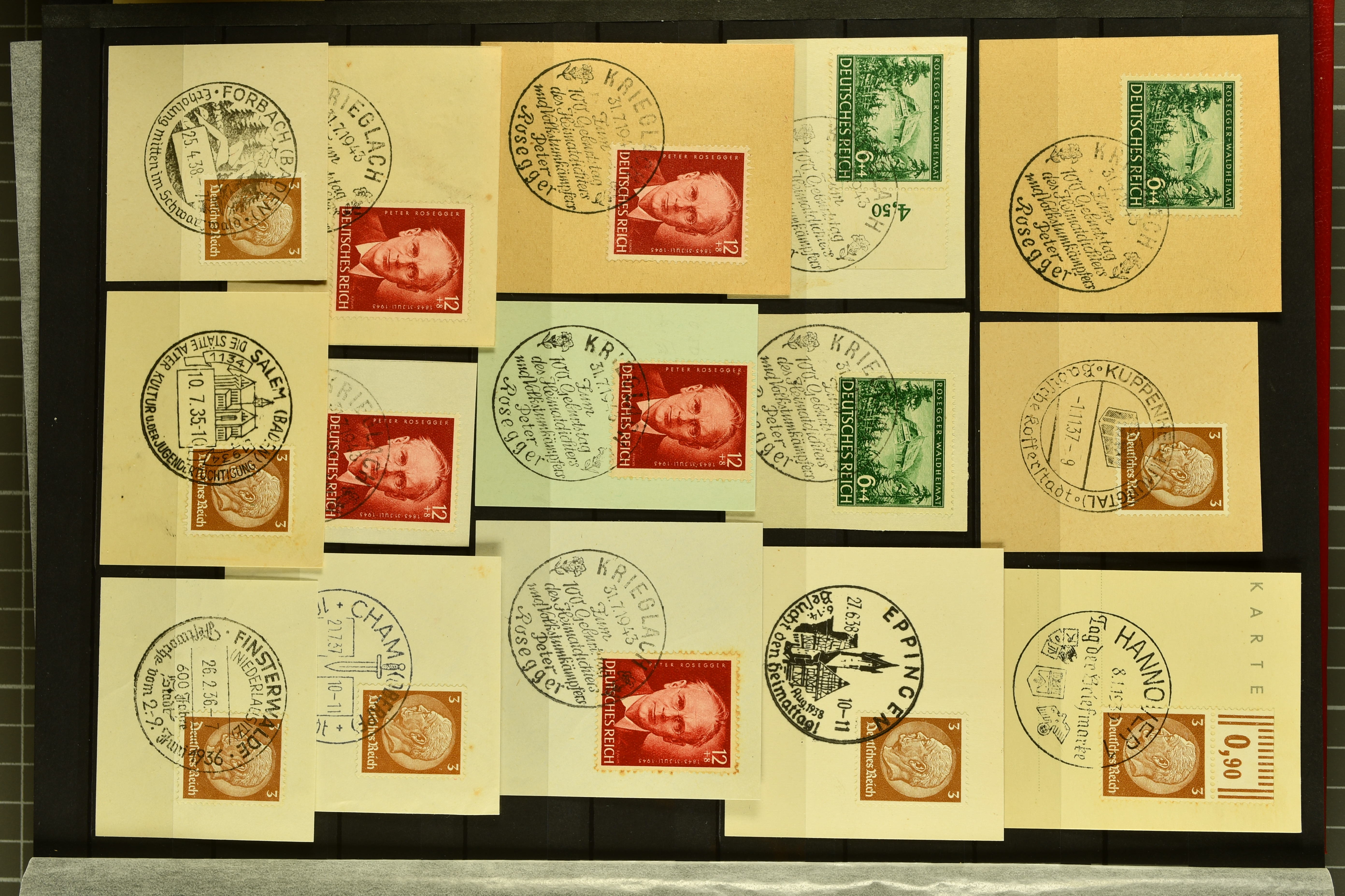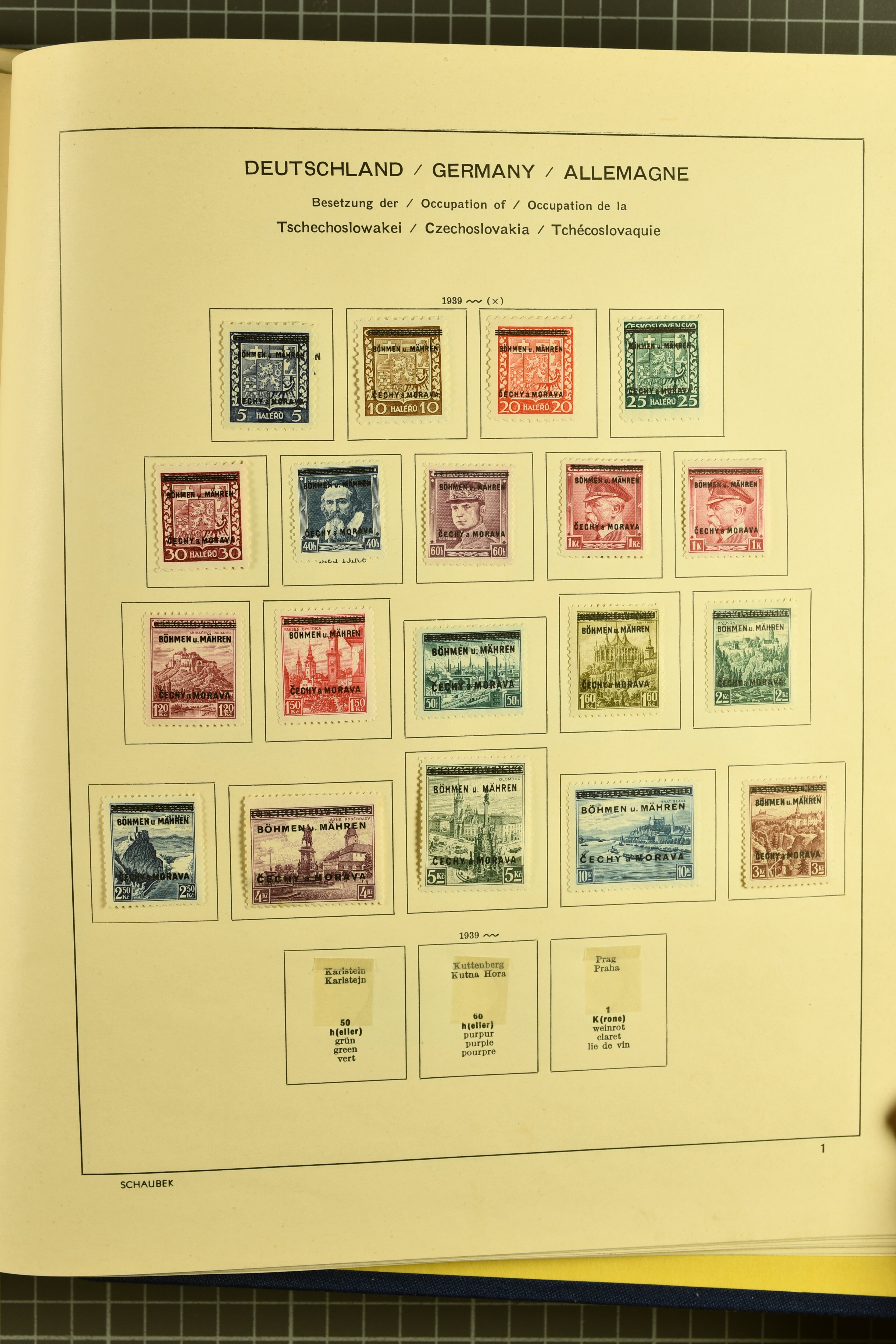 1826 1849/1960ca.: Sammlungskonvolut in insgesamt 9 Vordruckalben, davon 6 Schaubek und 3 mit Vordrucken in Mappen des Noltsch-Verlages, teils mehrfach geführt. Ein Album ab Altdeutschland ist reichhaltig bestückt, wenn auch in sehr unterschiedlicher Qualität. Weitere Bände mit Material in nun zumeist meist besserer Erhaltung vom Deutschen Reich, den Besetzungen und Abstimmungsgebieten, Danzig, Memel sowie den Kolonien. Ein Nachkriegsband mit u. a. mehreren Blättern Bezirkshandstempel (o. Obl.). Jeweils bis zu den mittleren Werte ausgebaut mit vielen Blocks und auch Lokalausgaben. Ungebrauchte Marken zumeist noch in älteren Zellophanhüllen eingepackt; Stichproben ergaben bei Vorkriegsmarken überwiegend Falz, Nachkriegsausgaben, wenn ungebraucht, dann meist postfrisch