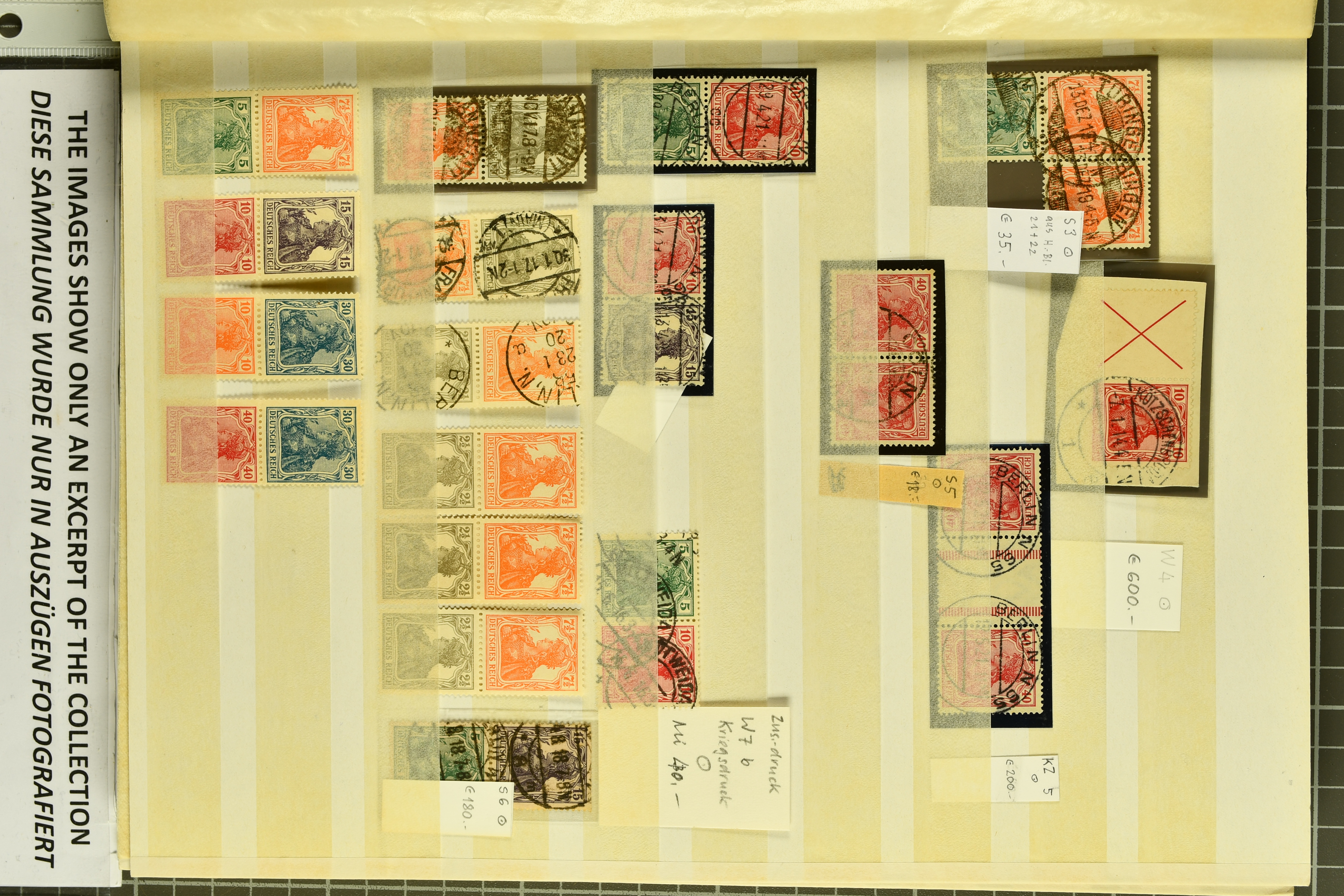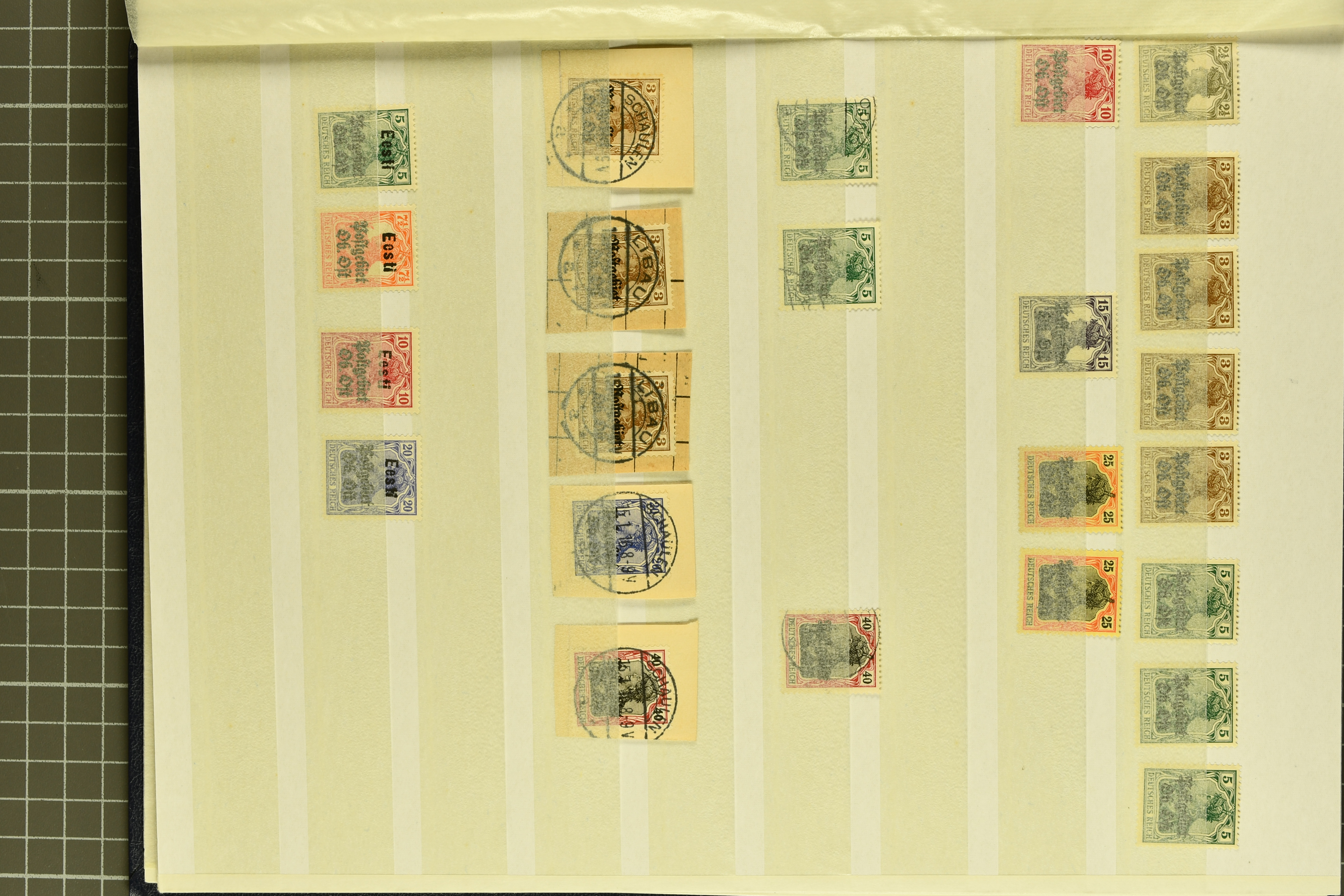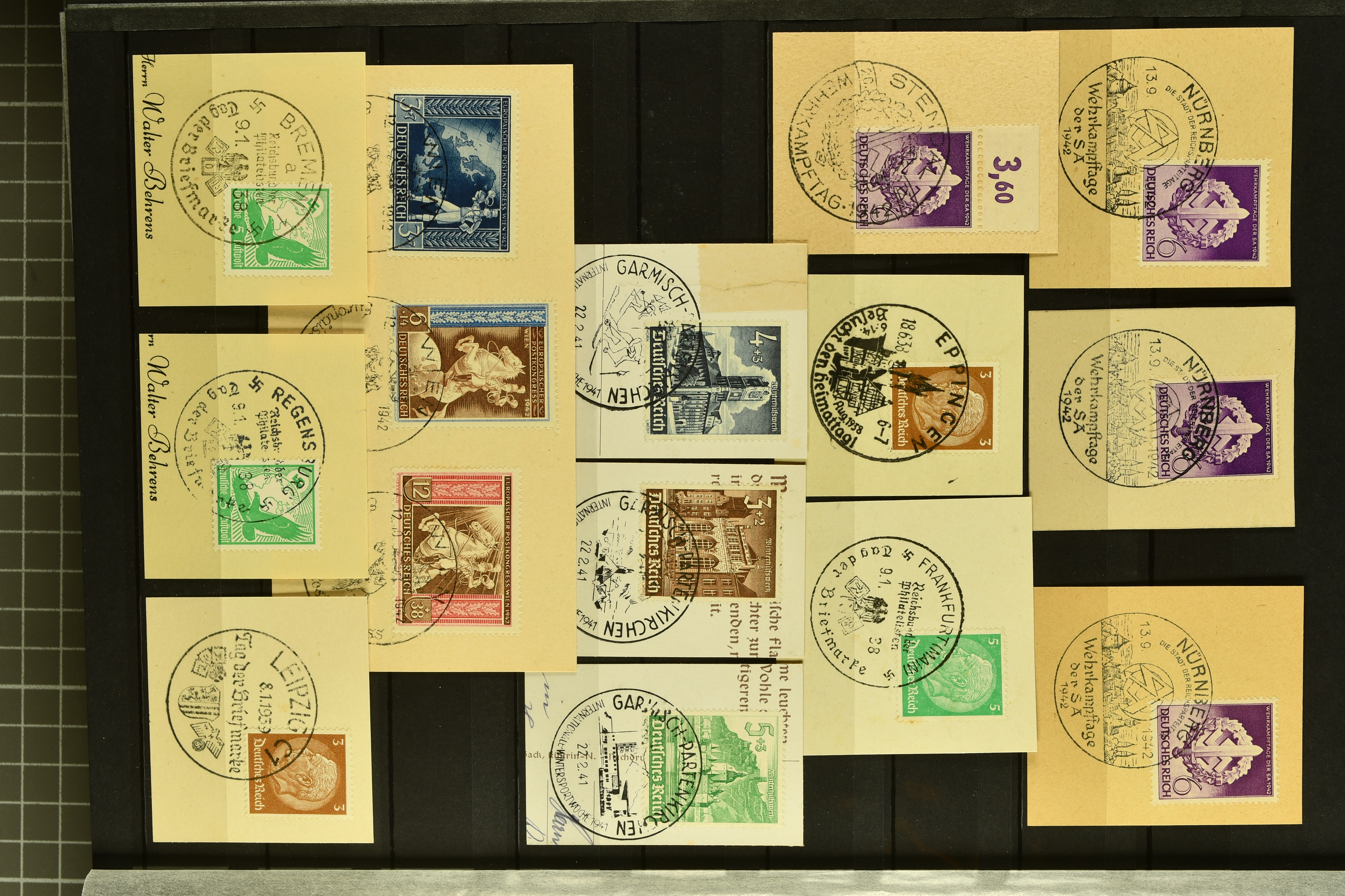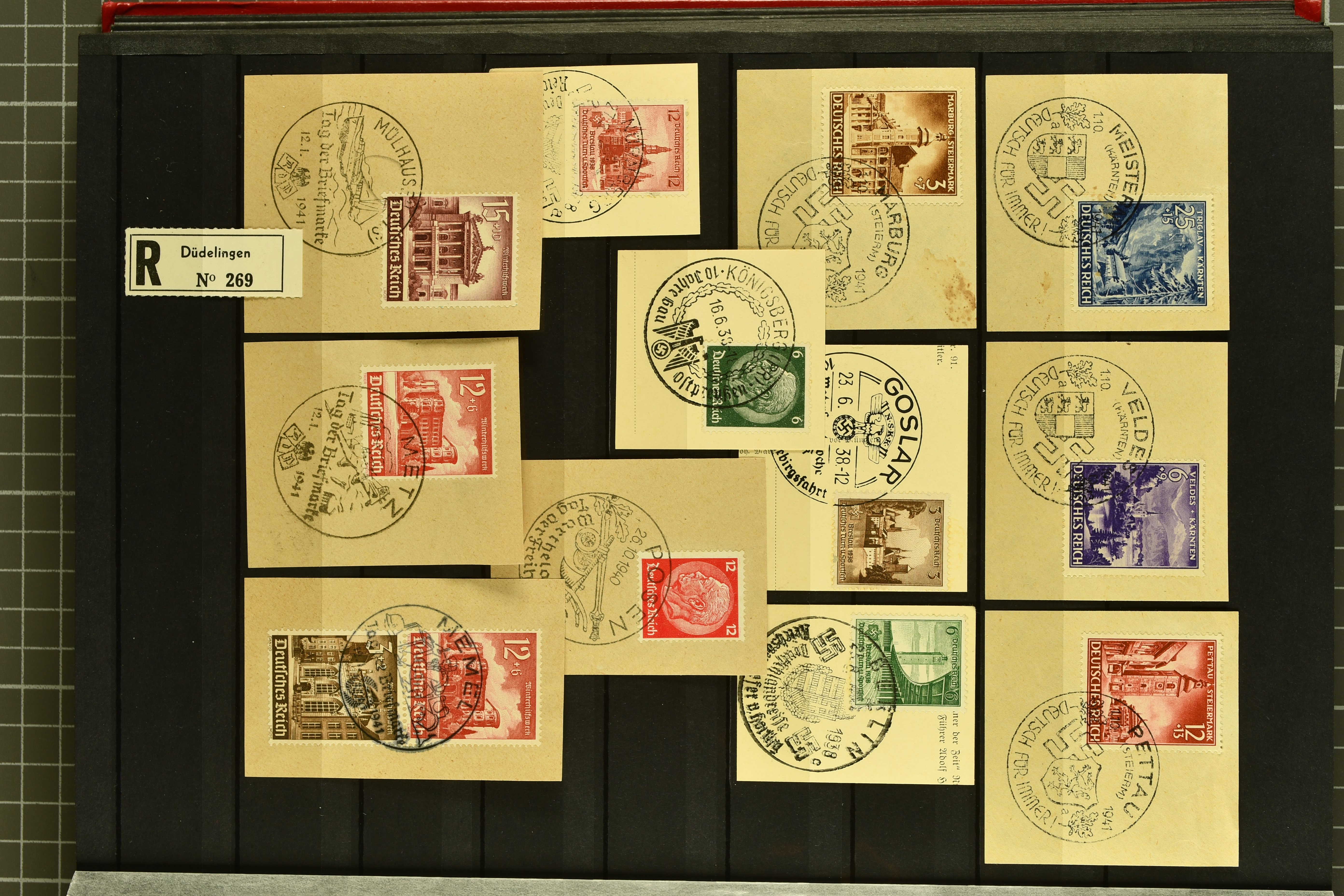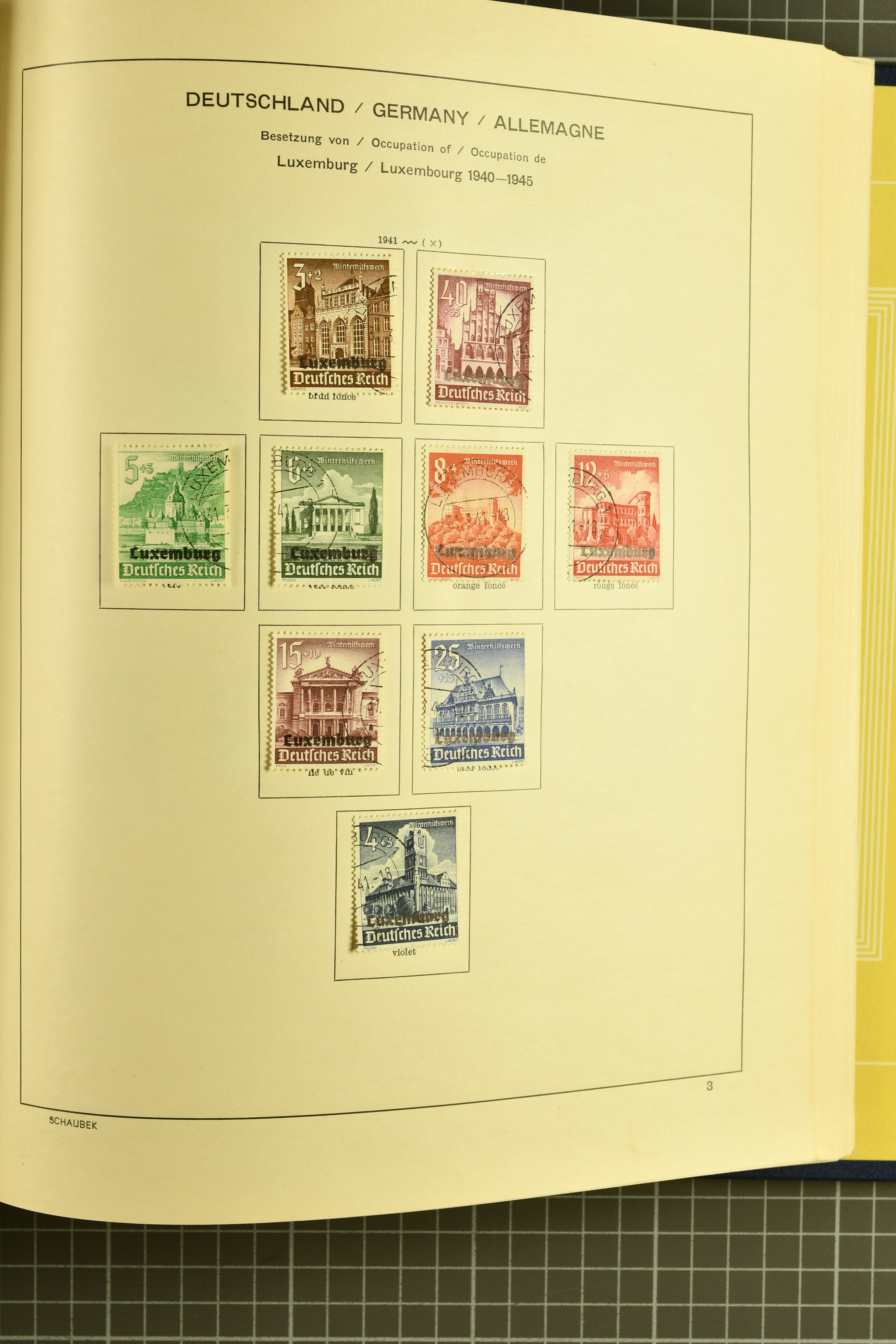 1826 1849/1960ca.: Sammlungskonvolut in insgesamt 9 Vordruckalben, davon 6 Schaubek und 3 mit Vordrucken in Mappen des Noltsch-Verlages, teils mehrfach geführt. Ein Album ab Altdeutschland ist reichhaltig bestückt, wenn auch in sehr unterschiedlicher Qualität. Weitere Bände mit Material in nun zumeist meist besserer Erhaltung vom Deutschen Reich, den Besetzungen und Abstimmungsgebieten, Danzig, Memel sowie den Kolonien. Ein Nachkriegsband mit u. a. mehreren Blättern Bezirkshandstempel (o. Obl.). Jeweils bis zu den mittleren Werte ausgebaut mit vielen Blocks und auch Lokalausgaben. Ungebrauchte Marken zumeist noch in älteren Zellophanhüllen eingepackt; Stichproben ergaben bei Vorkriegsmarken überwiegend Falz, Nachkriegsausgaben, wenn ungebraucht, dann meist postfrisch