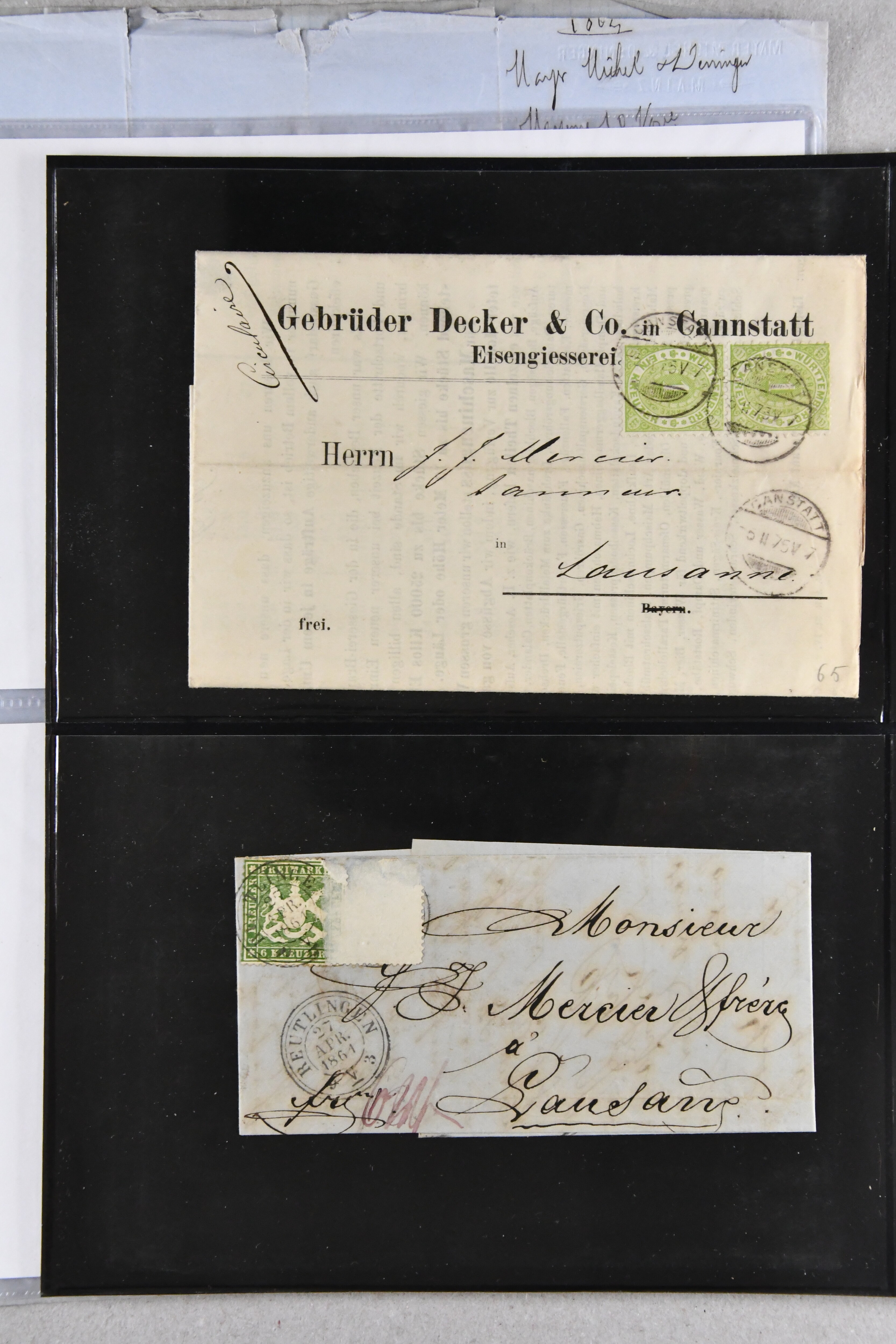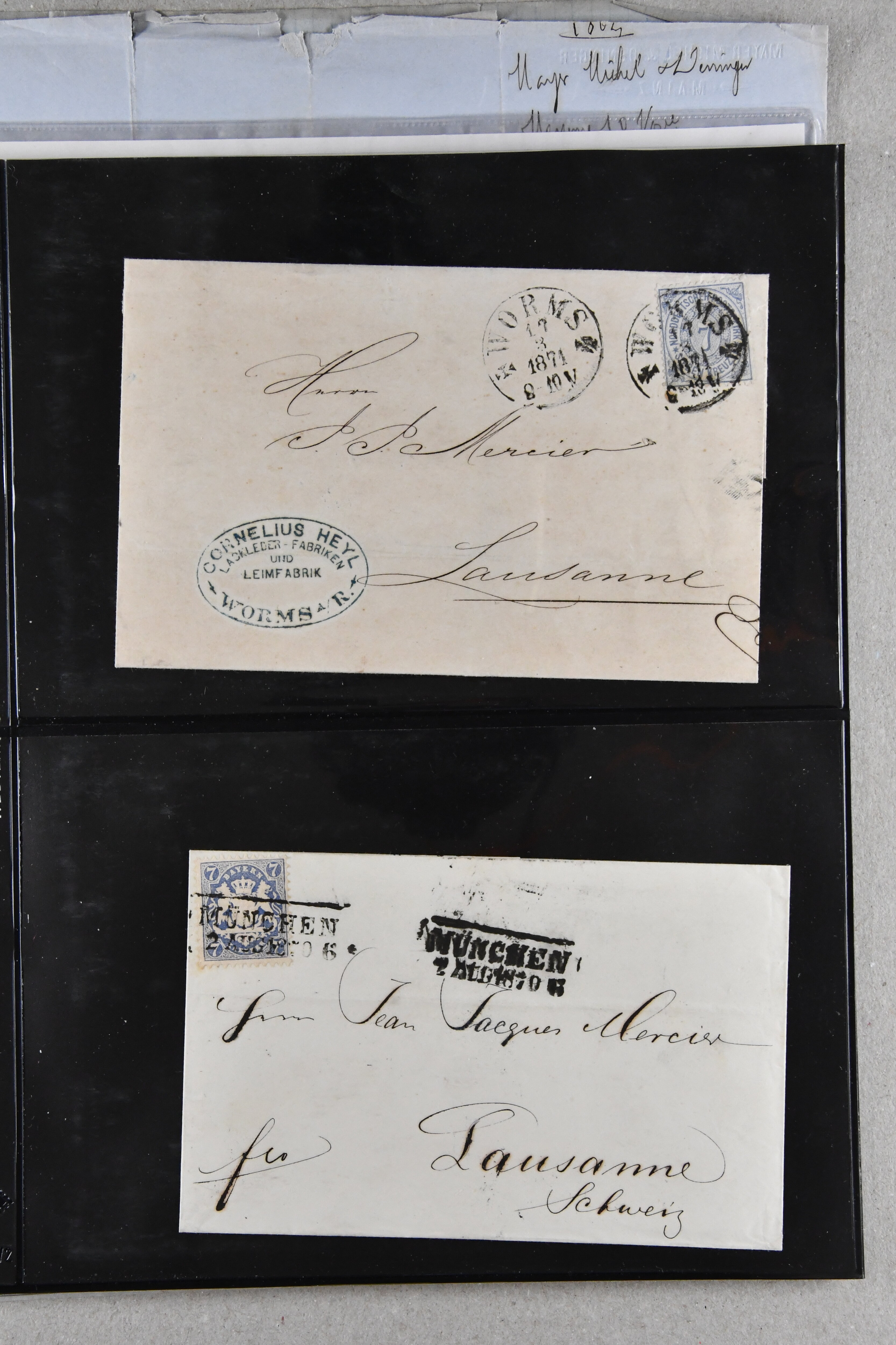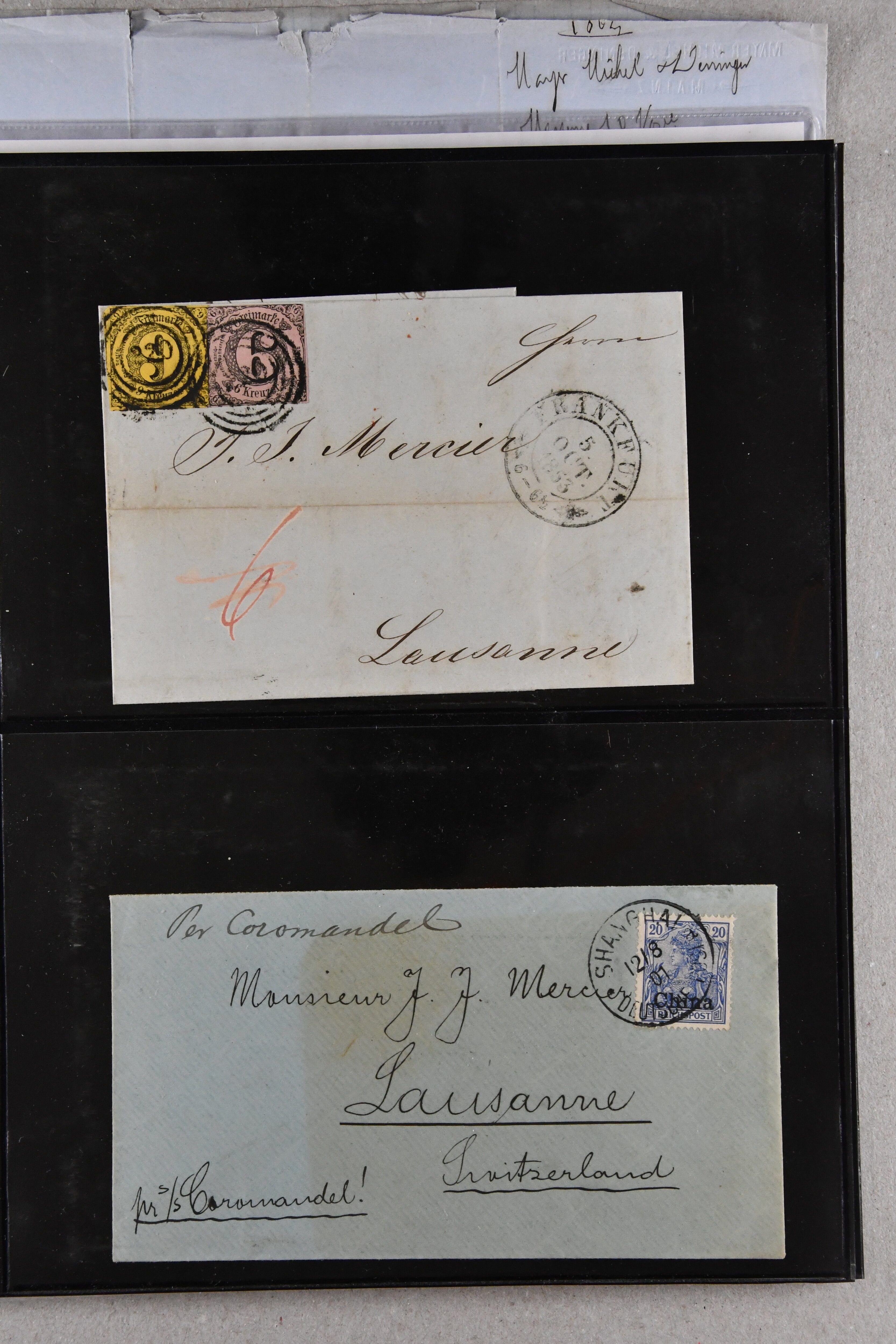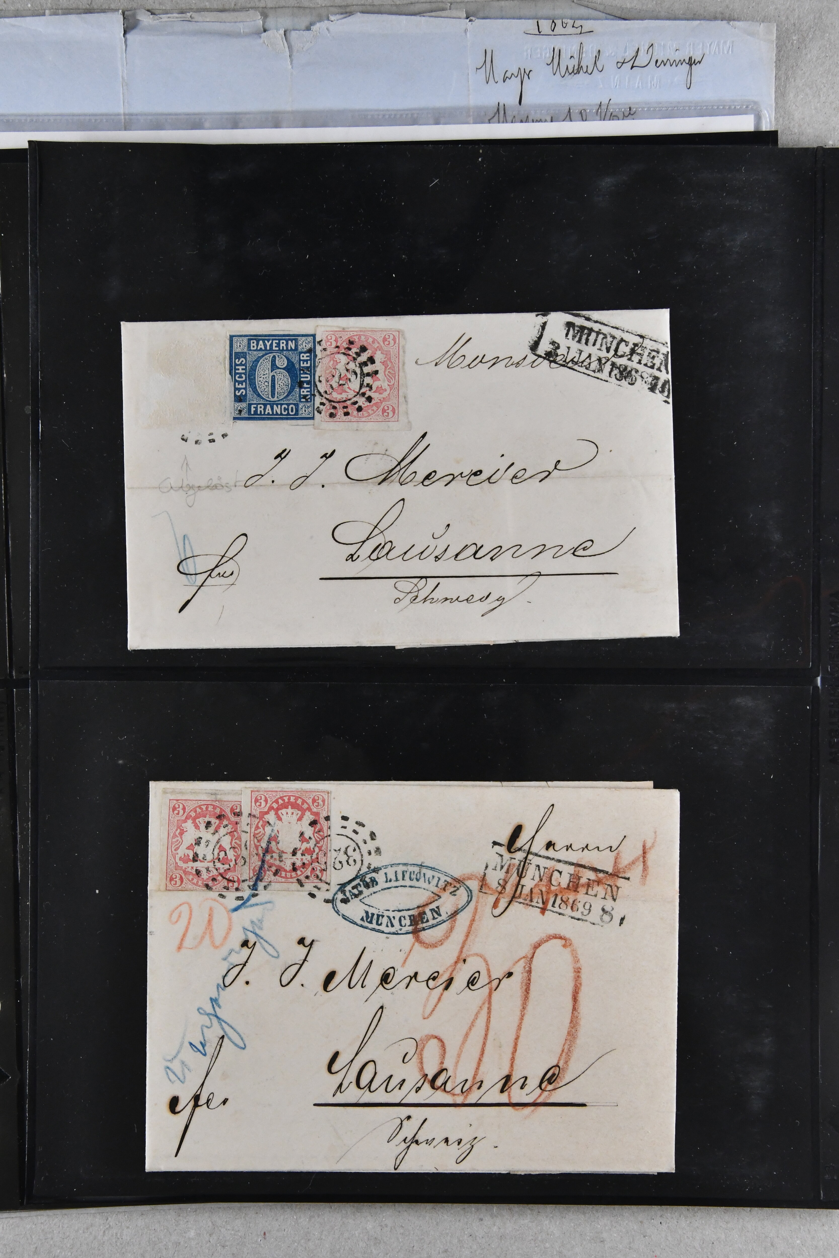 1696 cover image1853/74: Lot 15 Briefe, alle nach Lausanne in der Schweiz gerichtet, dabei T&T 1853 9 + 6 Kr. von Frankfurt, 1863 Brief mit Bayern 1862 12 Kr. dunkelgelbgrün, ein vorab riesenrandiges Stuck, in KOETZING verwendet, 1869 unterfrankierter Brief mit Bayern 3 Kr. (2), 7 Kreuzer - Frankaturen vom NDP, Bayern, Kl. Schild (5), 2 Kreuzer - Drucksachenporti mit NDP, Württemberg, Bayern und Deutschem Reich (4), späterer ¼ - Groschen Tarif; weiterhin 1901 Brief mit 20 Pf. blau, sauber entw. "DEUTSCHE POST SHANGHAI" (Image 1) (Image 2) (Image 3) (Image 4) (Image 5) (Image 6) (Image 7) (Image 8) (Image 9) (Image 10) (Image 11) (Image 12)