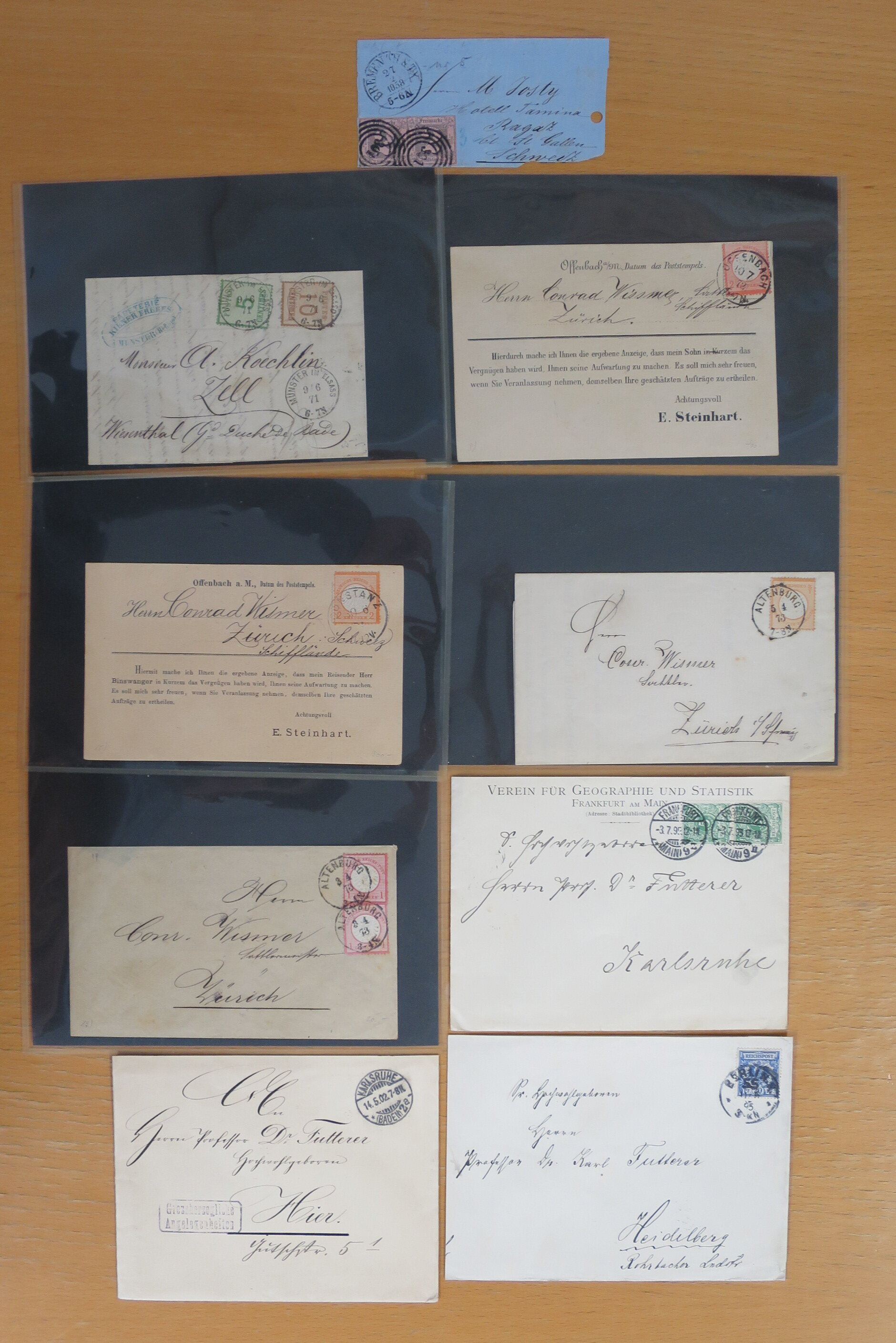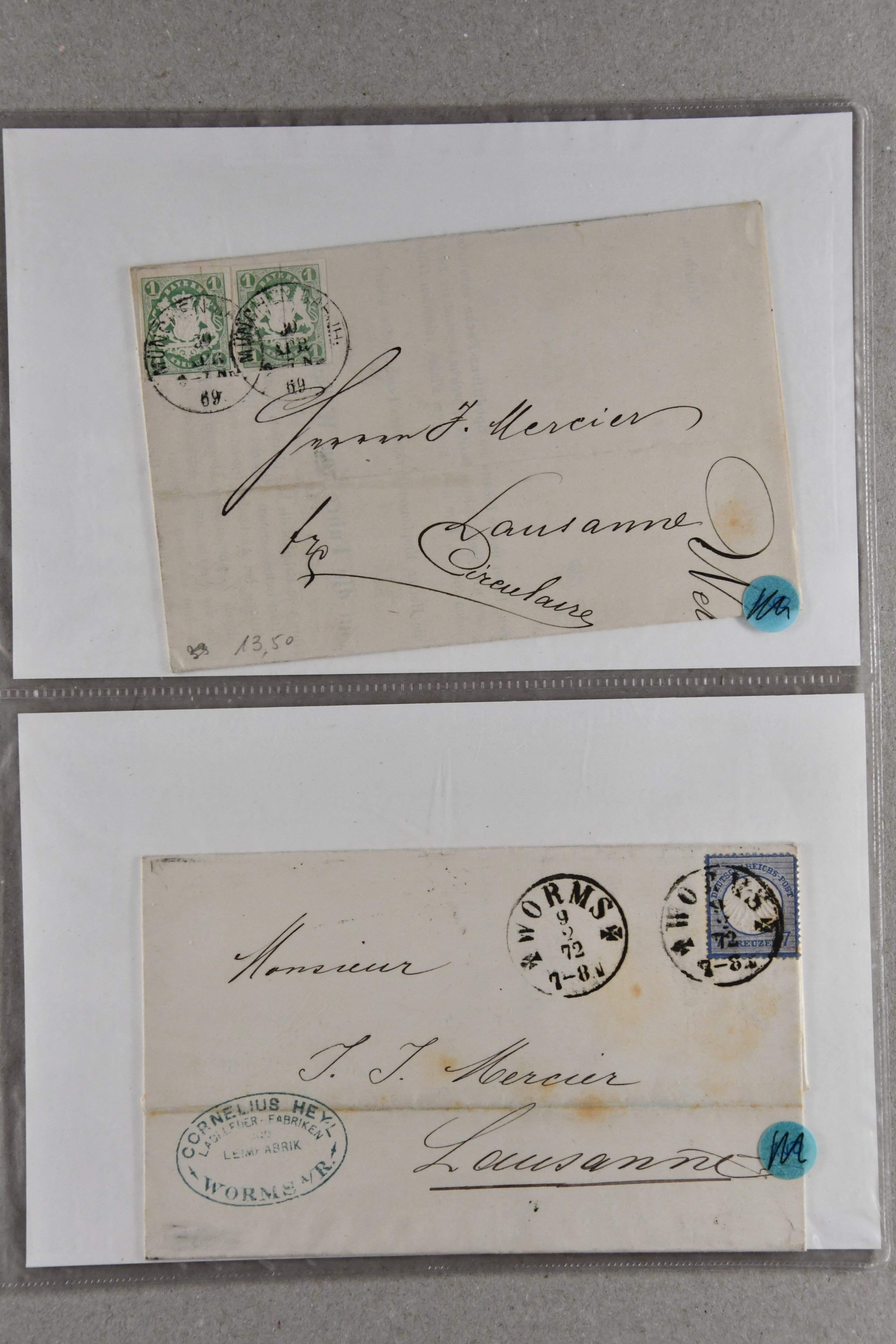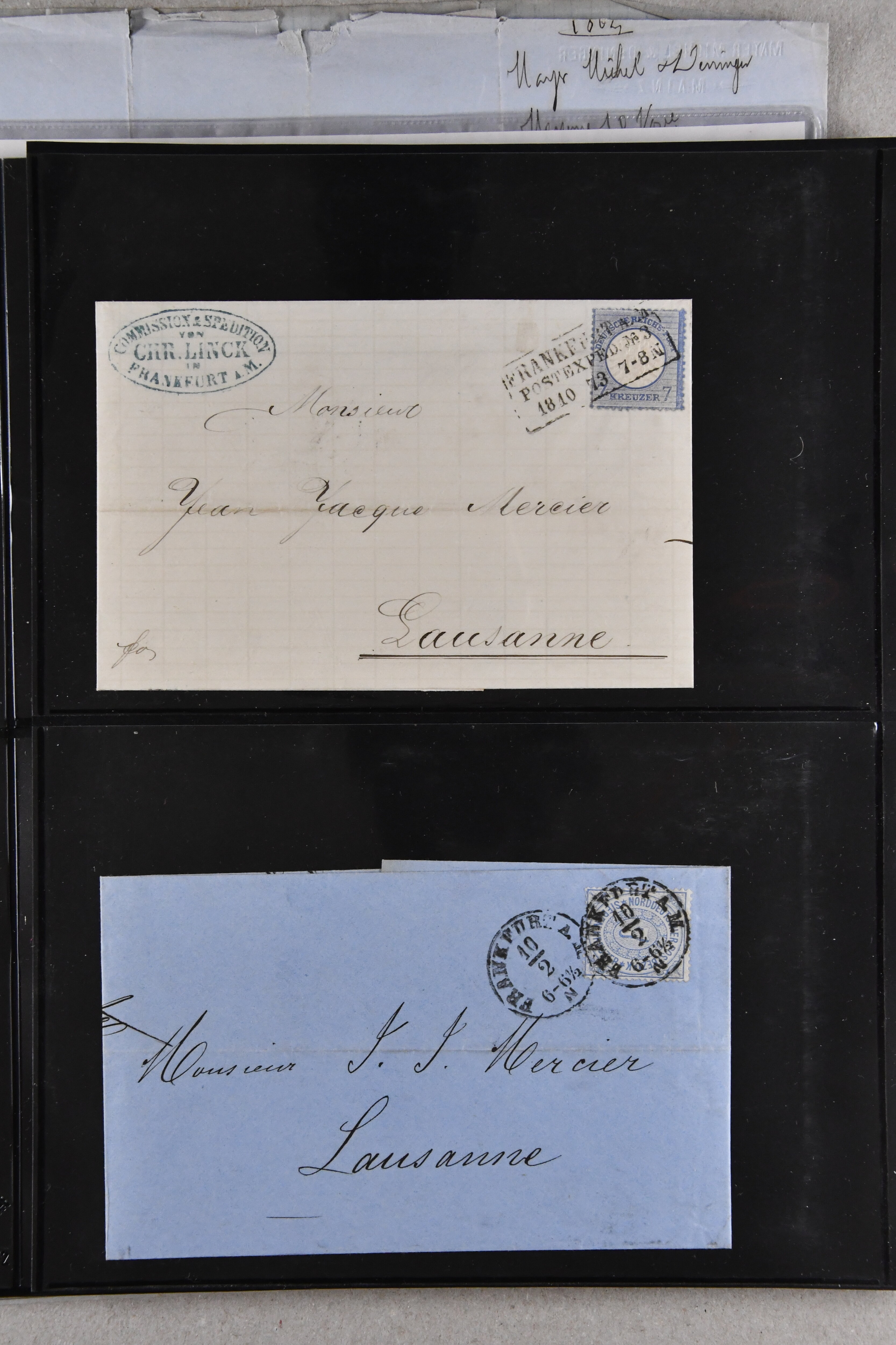 1696 cover image1853/74: Lot 15 Briefe, alle nach Lausanne in der Schweiz gerichtet, dabei T&T 1853 9 + 6 Kr. von Frankfurt, 1863 Brief mit Bayern 1862 12 Kr. dunkelgelbgrün, ein vorab riesenrandiges Stuck, in KOETZING verwendet, 1869 unterfrankierter Brief mit Bayern 3 Kr. (2), 7 Kreuzer - Frankaturen vom NDP, Bayern, Kl. Schild (5), 2 Kreuzer - Drucksachenporti mit NDP, Württemberg, Bayern und Deutschem Reich (4), späterer ¼ - Groschen Tarif; weiterhin 1901 Brief mit 20 Pf. blau, sauber entw. "DEUTSCHE POST SHANGHAI" (Image 1) (Image 2) (Image 3) (Image 4) (Image 5) (Image 6) (Image 7) (Image 8) (Image 9) (Image 10) (Image 11) (Image 12)