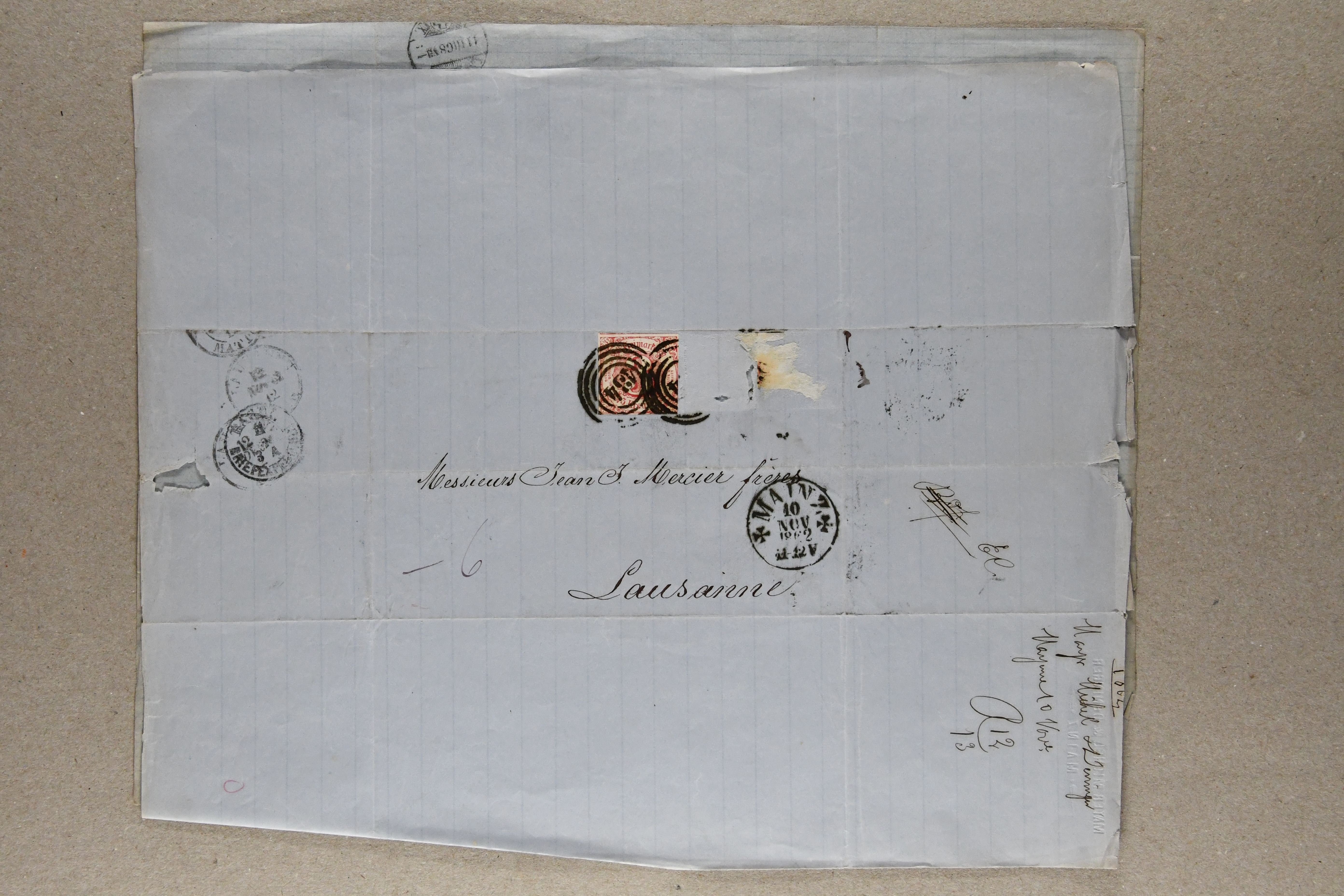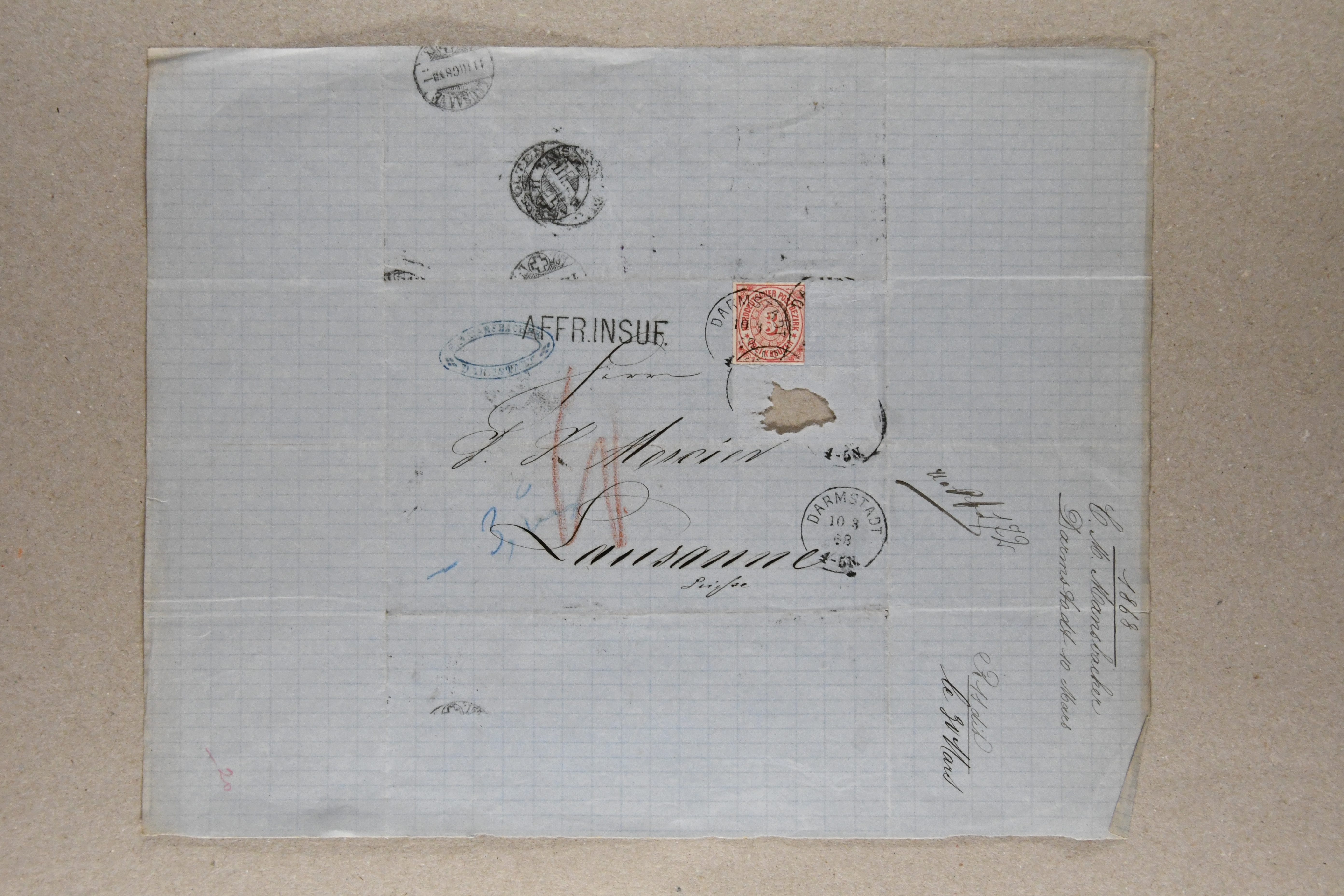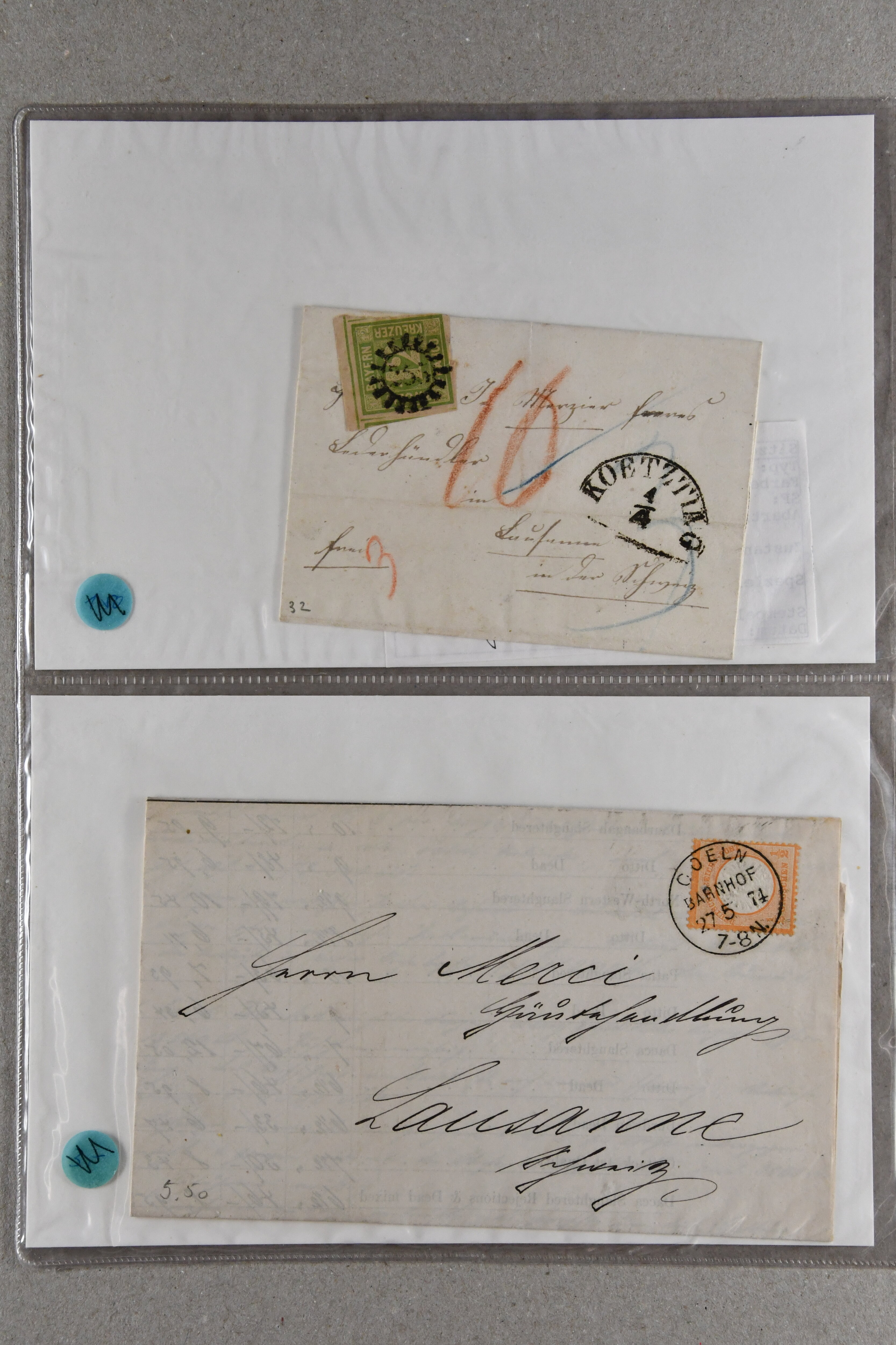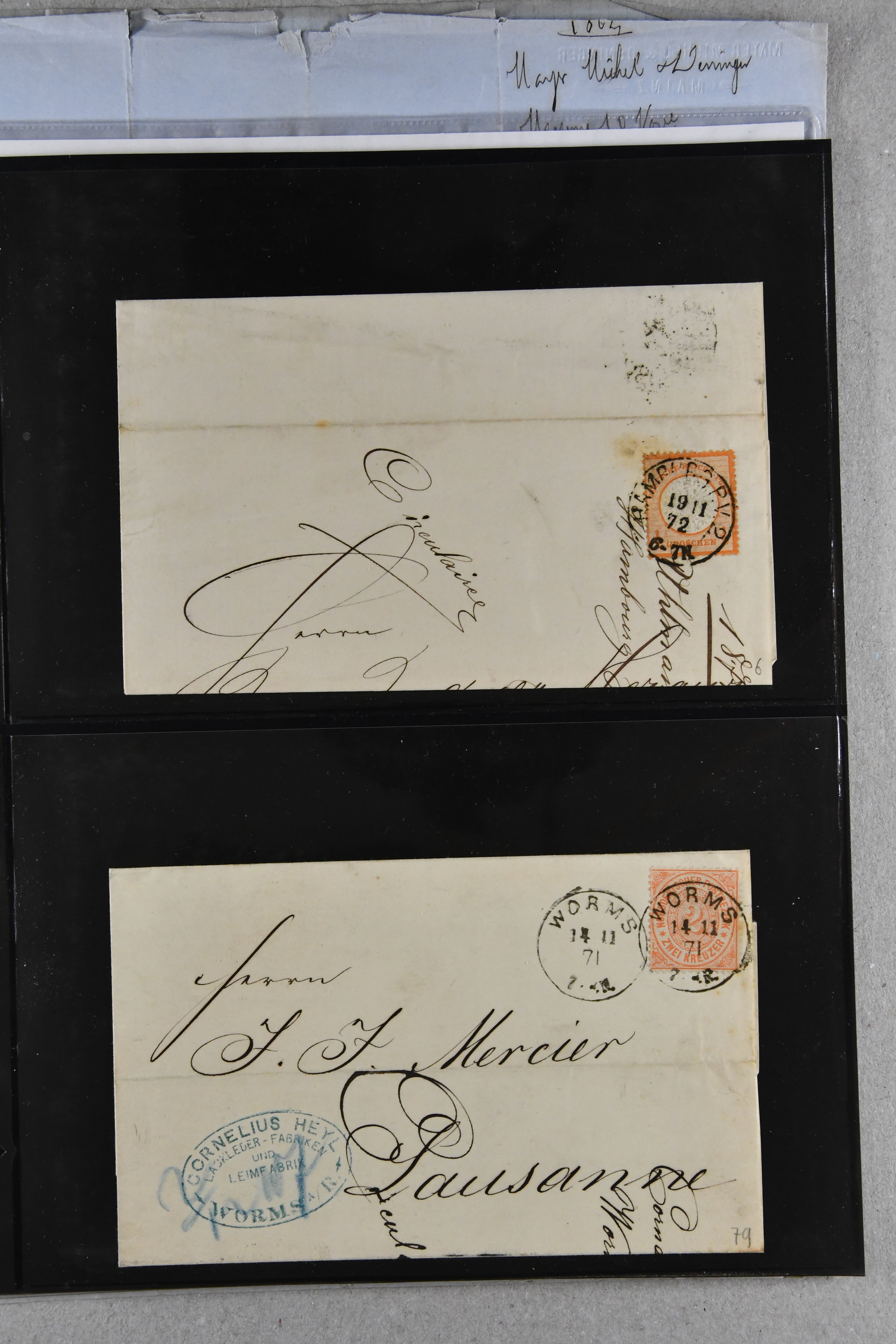 1696 cover image1853/74: Lot 15 Briefe, alle nach Lausanne in der Schweiz gerichtet, dabei T&T 1853 9 + 6 Kr. von Frankfurt, 1863 Brief mit Bayern 1862 12 Kr. dunkelgelbgrün, ein vorab riesenrandiges Stuck, in KOETZING verwendet, 1869 unterfrankierter Brief mit Bayern 3 Kr. (2), 7 Kreuzer - Frankaturen vom NDP, Bayern, Kl. Schild (5), 2 Kreuzer - Drucksachenporti mit NDP, Württemberg, Bayern und Deutschem Reich (4), späterer ¼ - Groschen Tarif; weiterhin 1901 Brief mit 20 Pf. blau, sauber entw. "DEUTSCHE POST SHANGHAI" (Image 1) (Image 2) (Image 3) (Image 4) (Image 5) (Image 6) (Image 7) (Image 8) (Image 9) (Image 10) (Image 11) (Image 12)