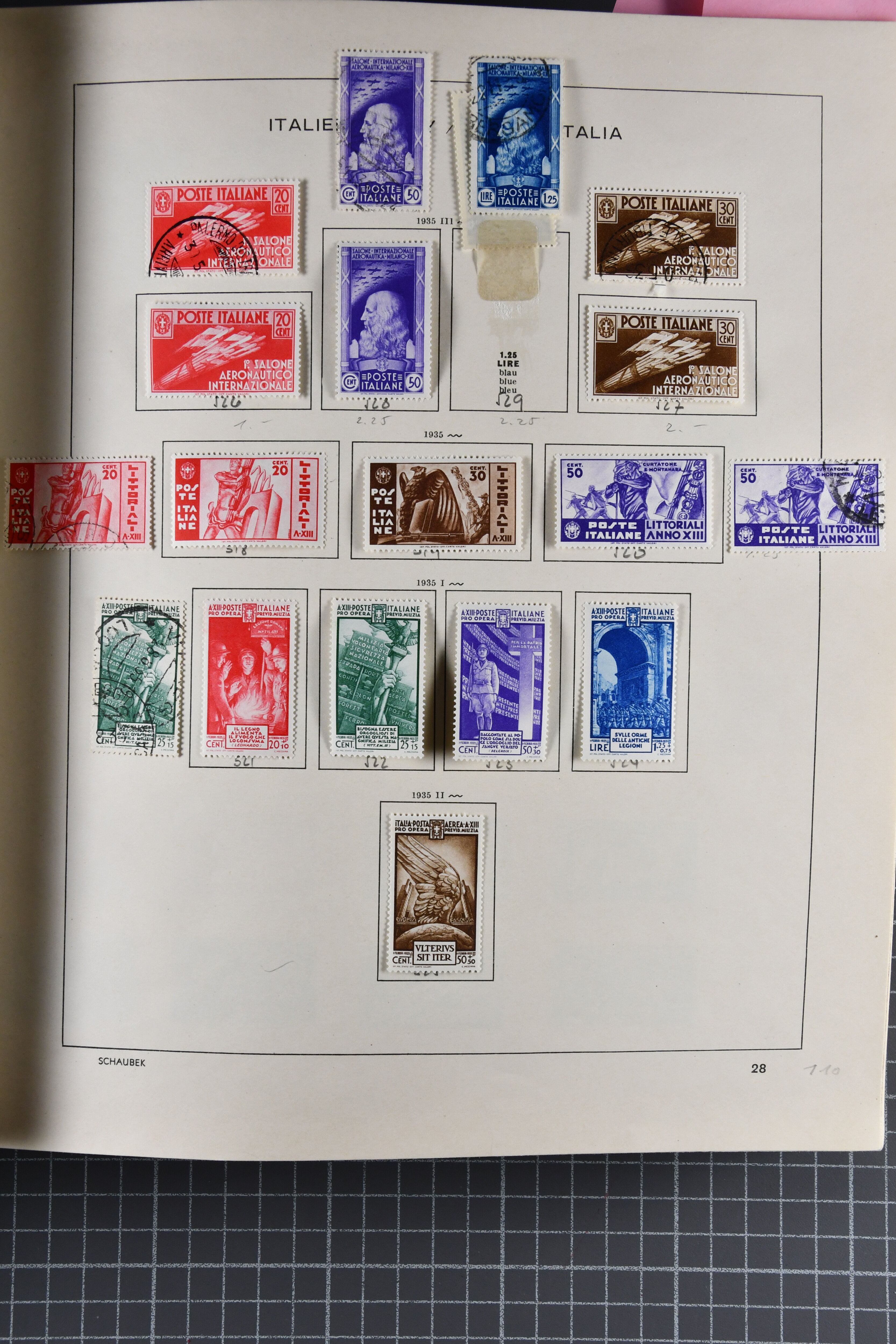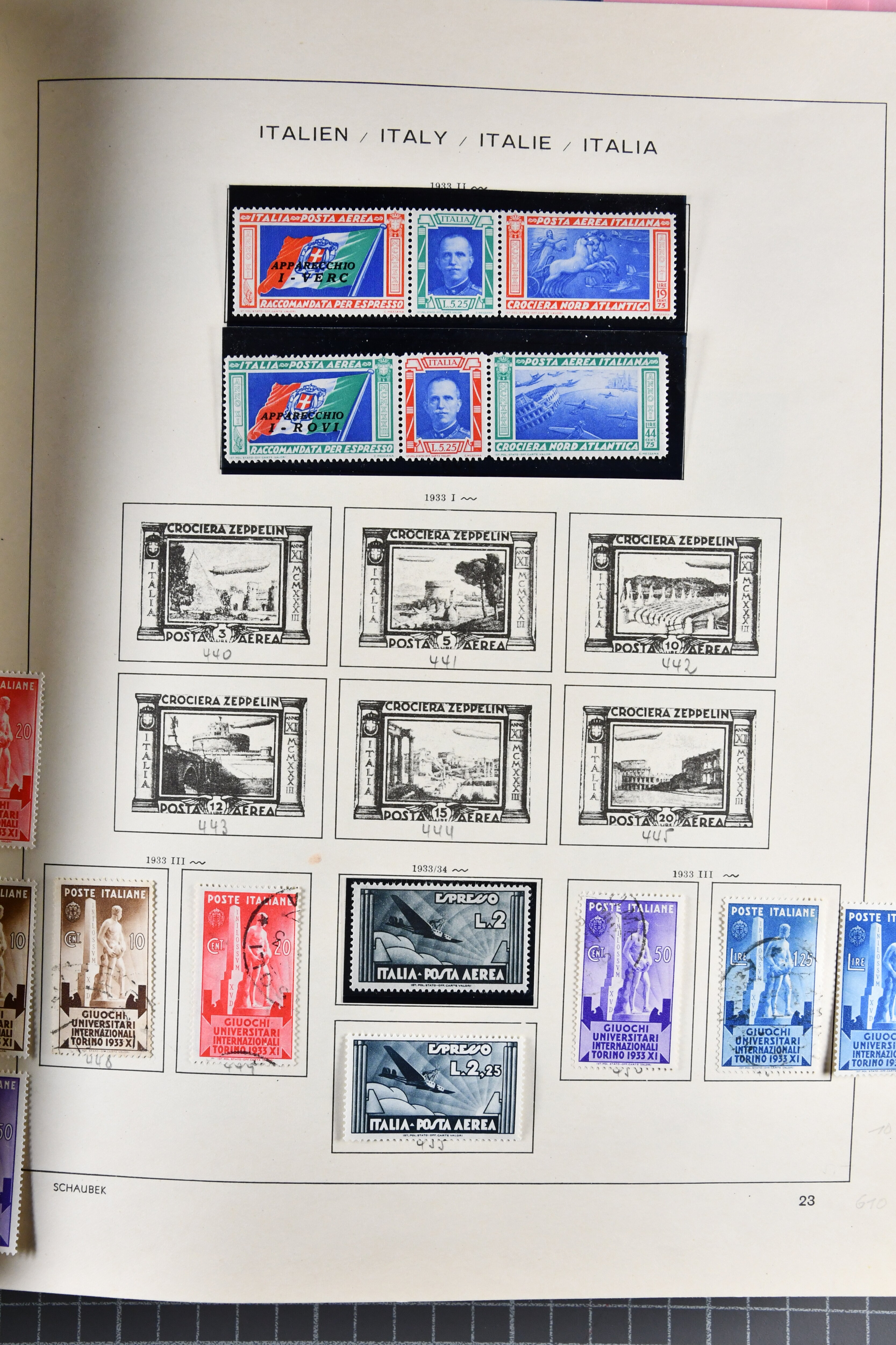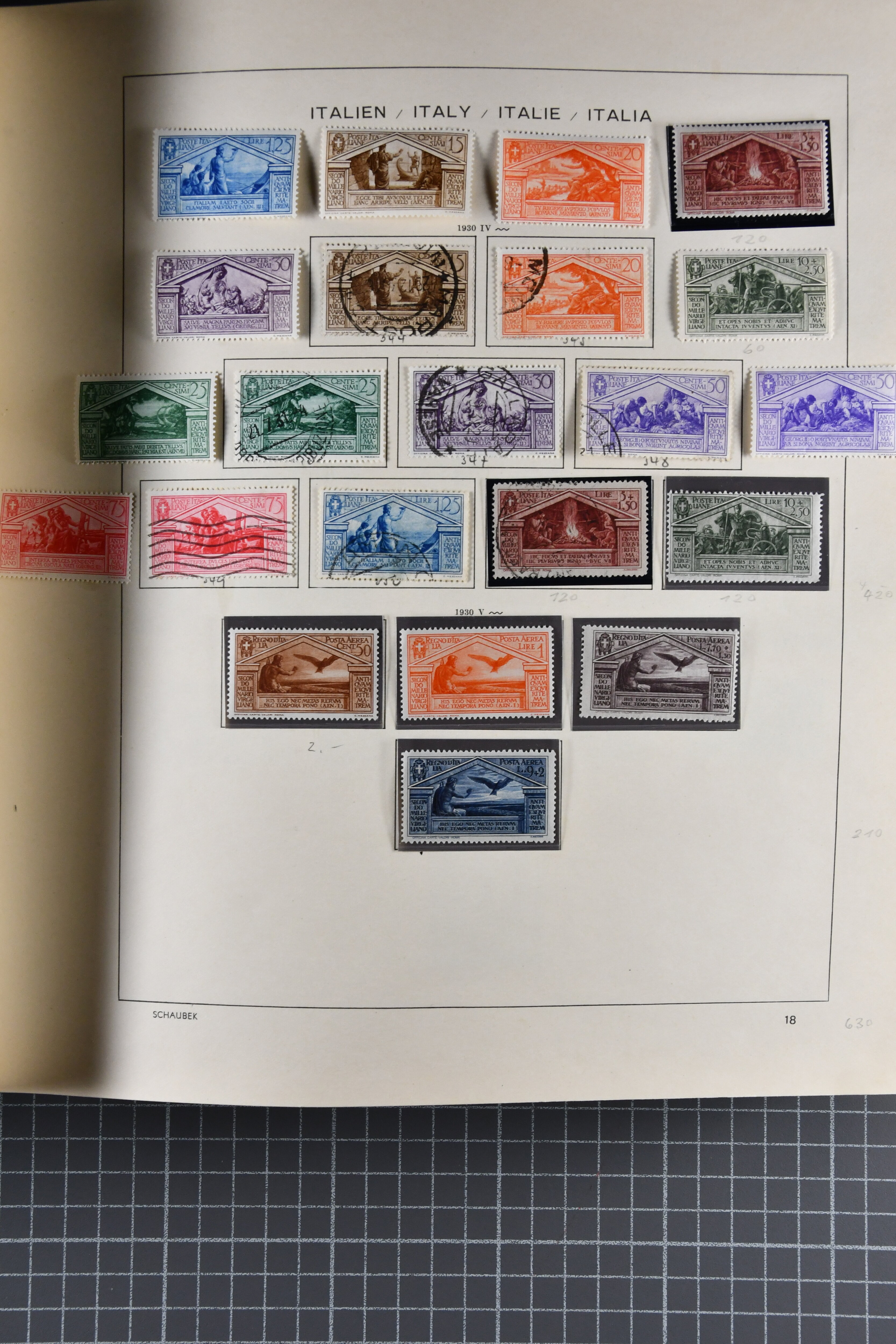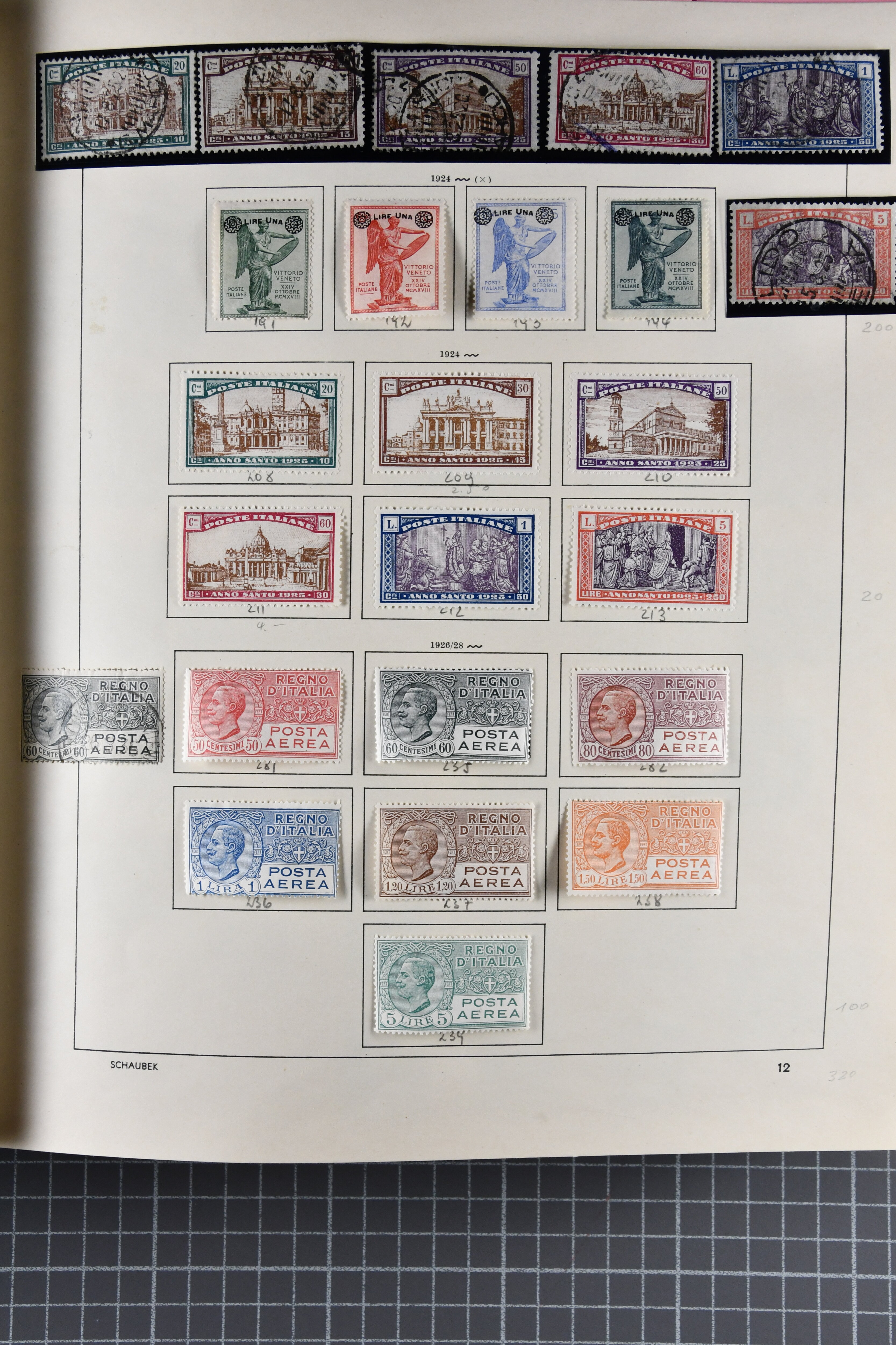 2050 image1851/1989: Old Italian States to Colonies – collection mounted on Schaubek pages in one volume, opening with a well-filled section of the Old Italian States, in very mixed condition. The Kingdom of Italy is well represented with a broad selection of mostly unused and some used sets, notably including the Manzoni issue (this part generally in good condition). The Republic is predominantly used, with Trieste, Fiume, a few occupation issues and colonies. Also included are two albums Papal States / Vatican City – one with loose stamps, the other with covers, including some better full sets incl. Catholic Press and Archaeological Congress on envelope and a set of Papal Voyages. Very high catalogue value (Image 1) (Image 2) (Image 3) (Image 4) (Image 5) (Image 6) (Image 7) (Image 8) (Image 9) (Image 10) (Image 11) (Image 12) (Image 13) (Image 14) (Image 15) (Image 16) (Image 17) (Image 18) (Image 19) (Image 20)