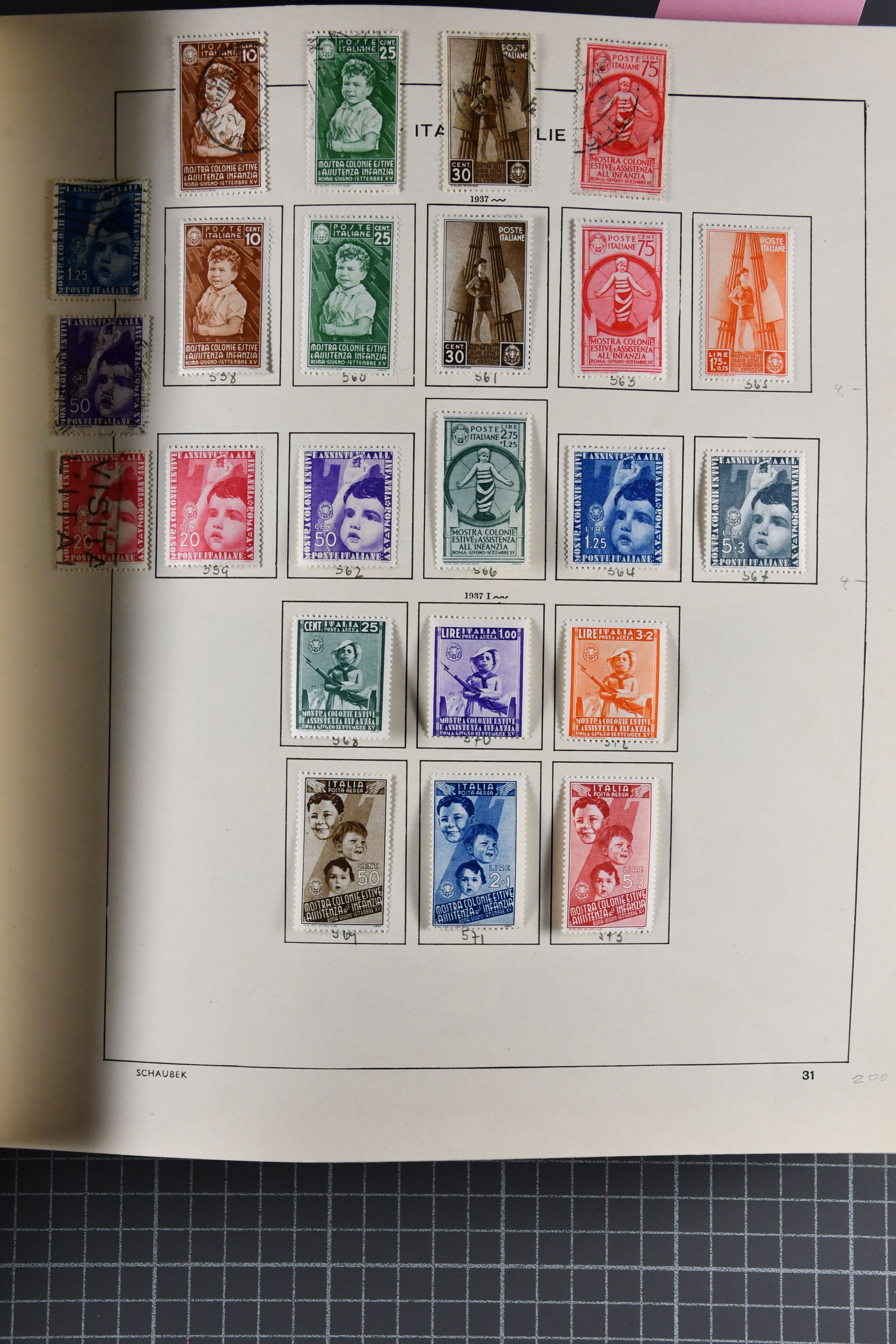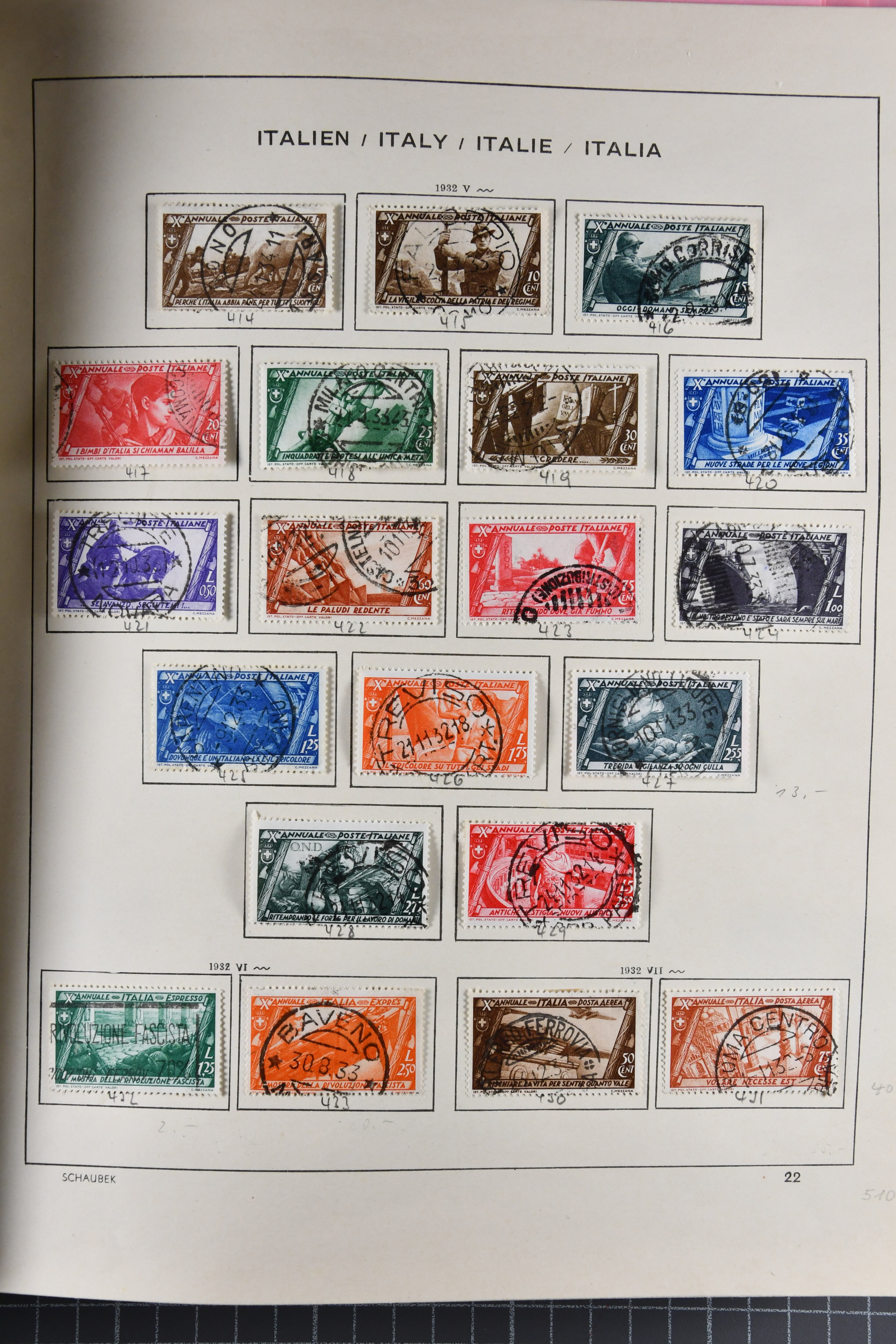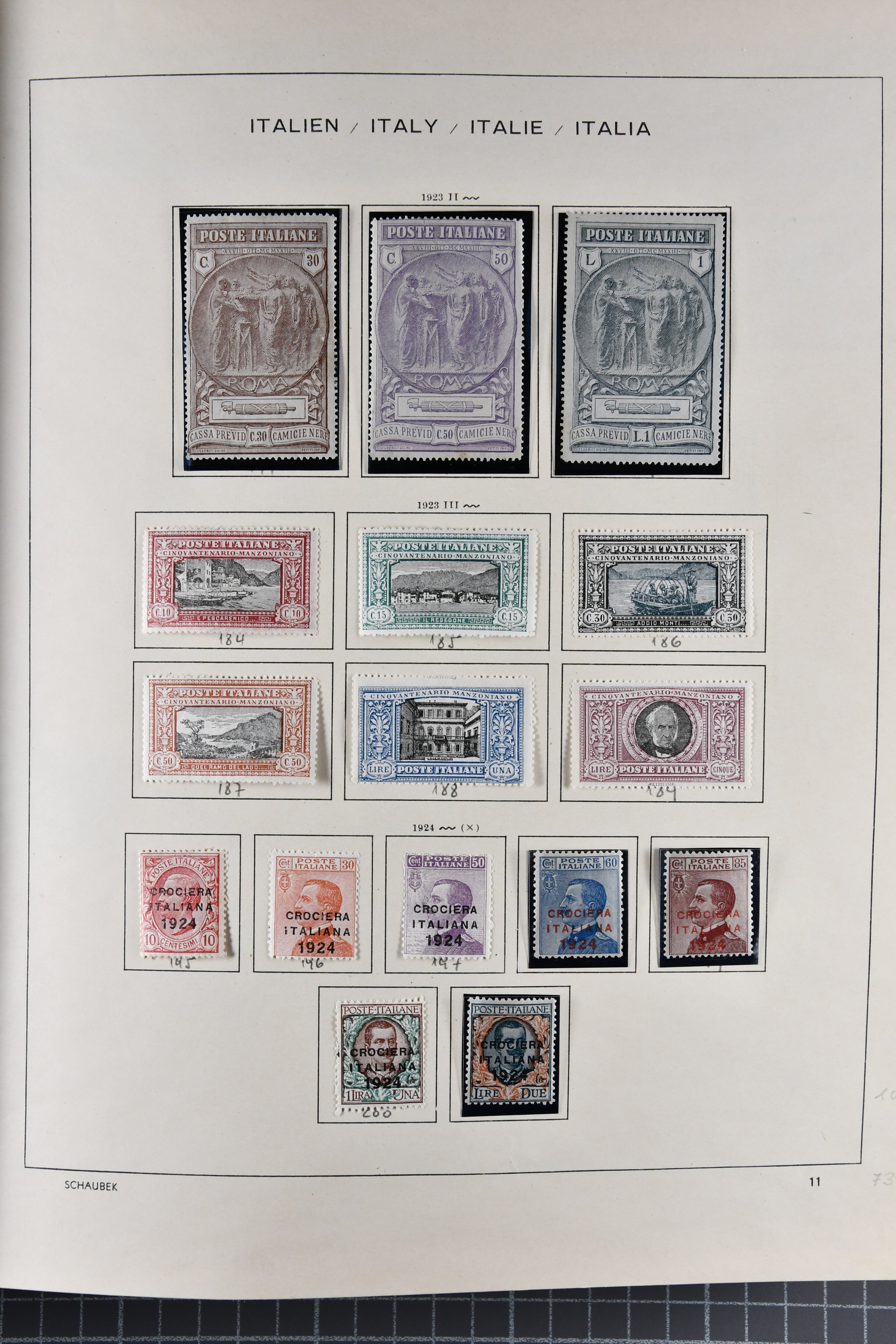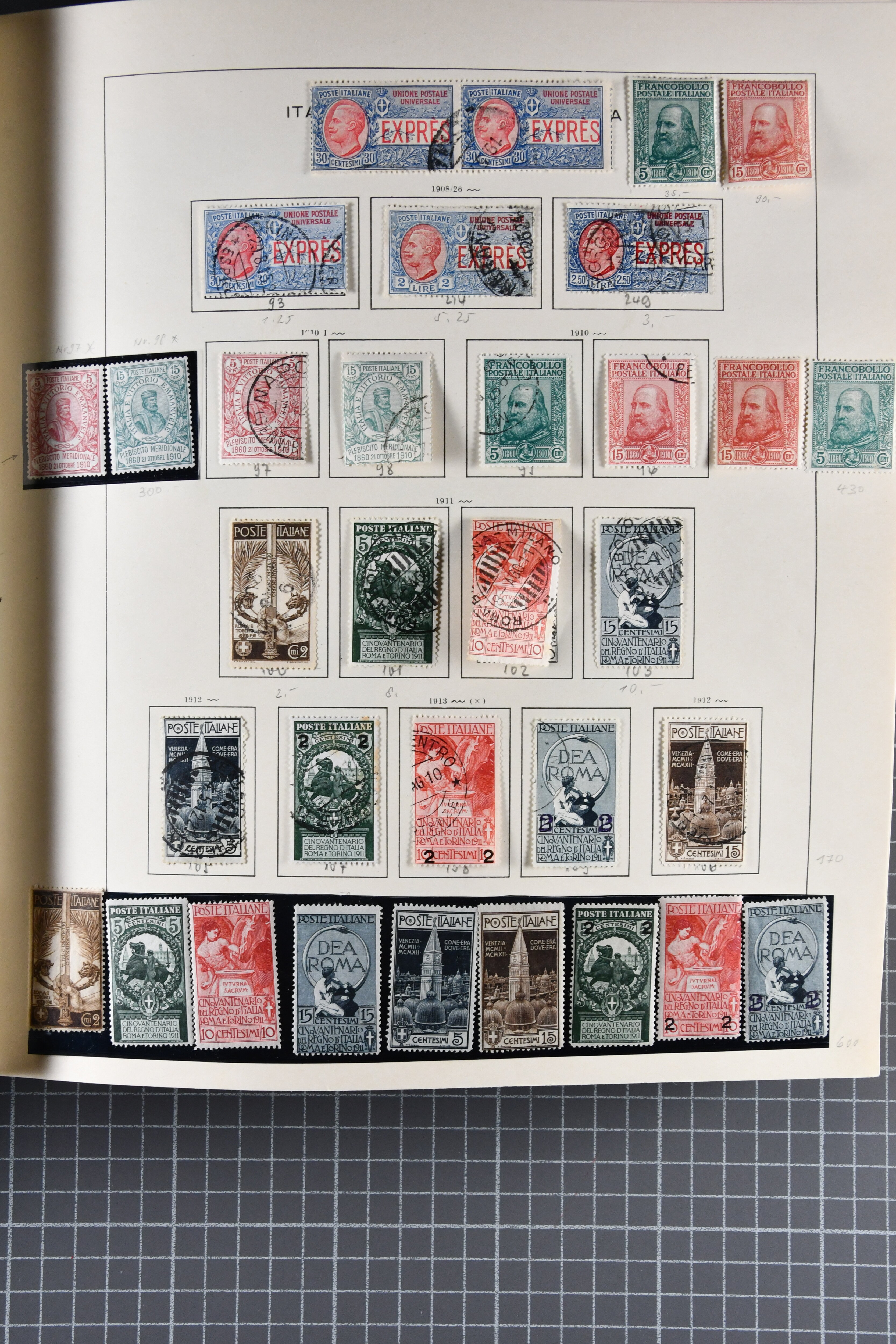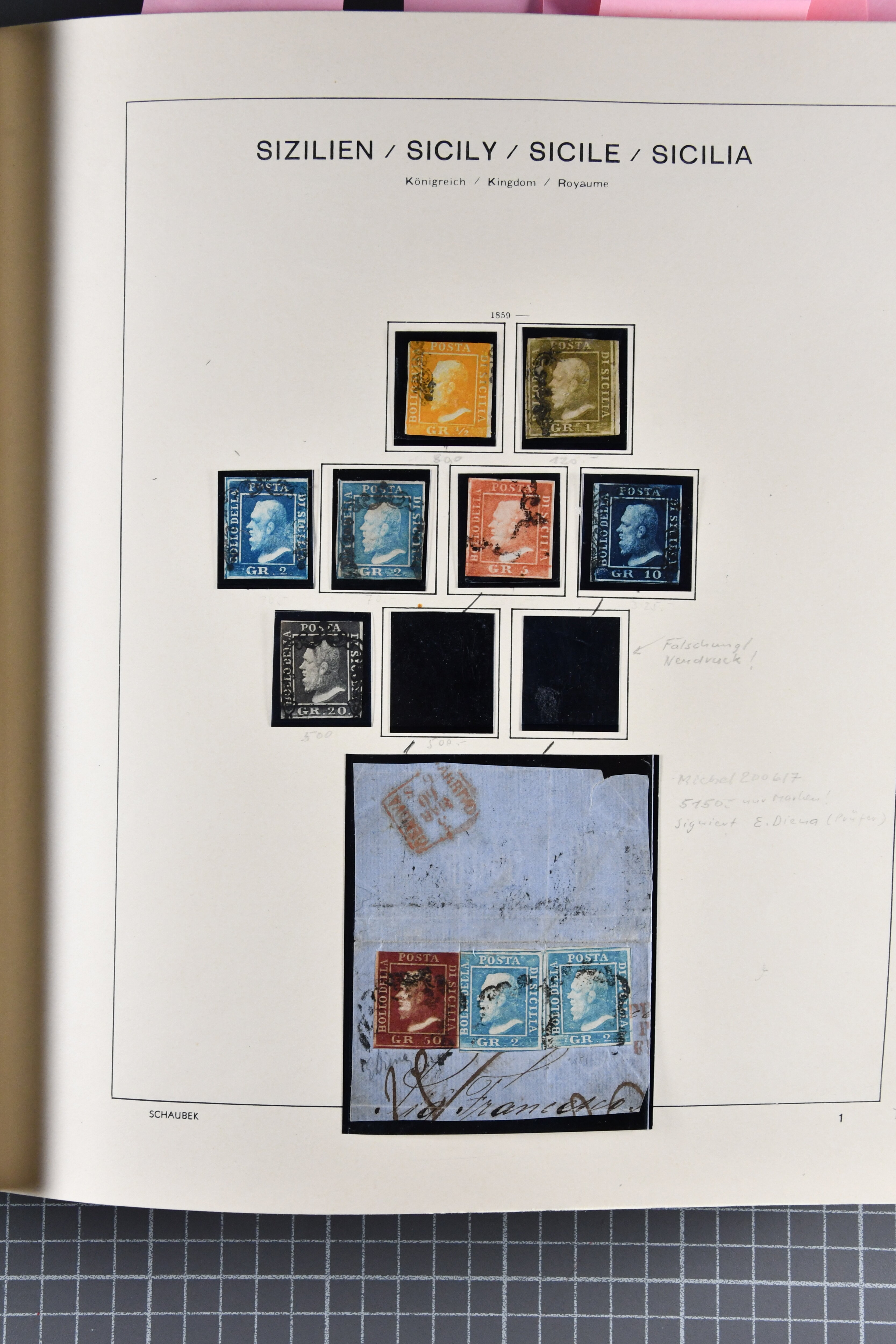 2050 image1851/1989: Old Italian States to Colonies – collection mounted on Schaubek pages in one volume, opening with a well-filled section of the Old Italian States, in very mixed condition. The Kingdom of Italy is well represented with a broad selection of mostly unused and some used sets, notably including the Manzoni issue (this part generally in good condition). The Republic is predominantly used, with Trieste, Fiume, a few occupation issues and colonies. Also included are two albums Papal States / Vatican City – one with loose stamps, the other with covers, including some better full sets incl. Catholic Press and Archaeological Congress on envelope and a set of Papal Voyages. Very high catalogue value (Image 1) (Image 2) (Image 3) (Image 4) (Image 5) (Image 6) (Image 7) (Image 8) (Image 9) (Image 10) (Image 11) (Image 12) (Image 13) (Image 14) (Image 15) (Image 16) (Image 17) (Image 18) (Image 19) (Image 20)