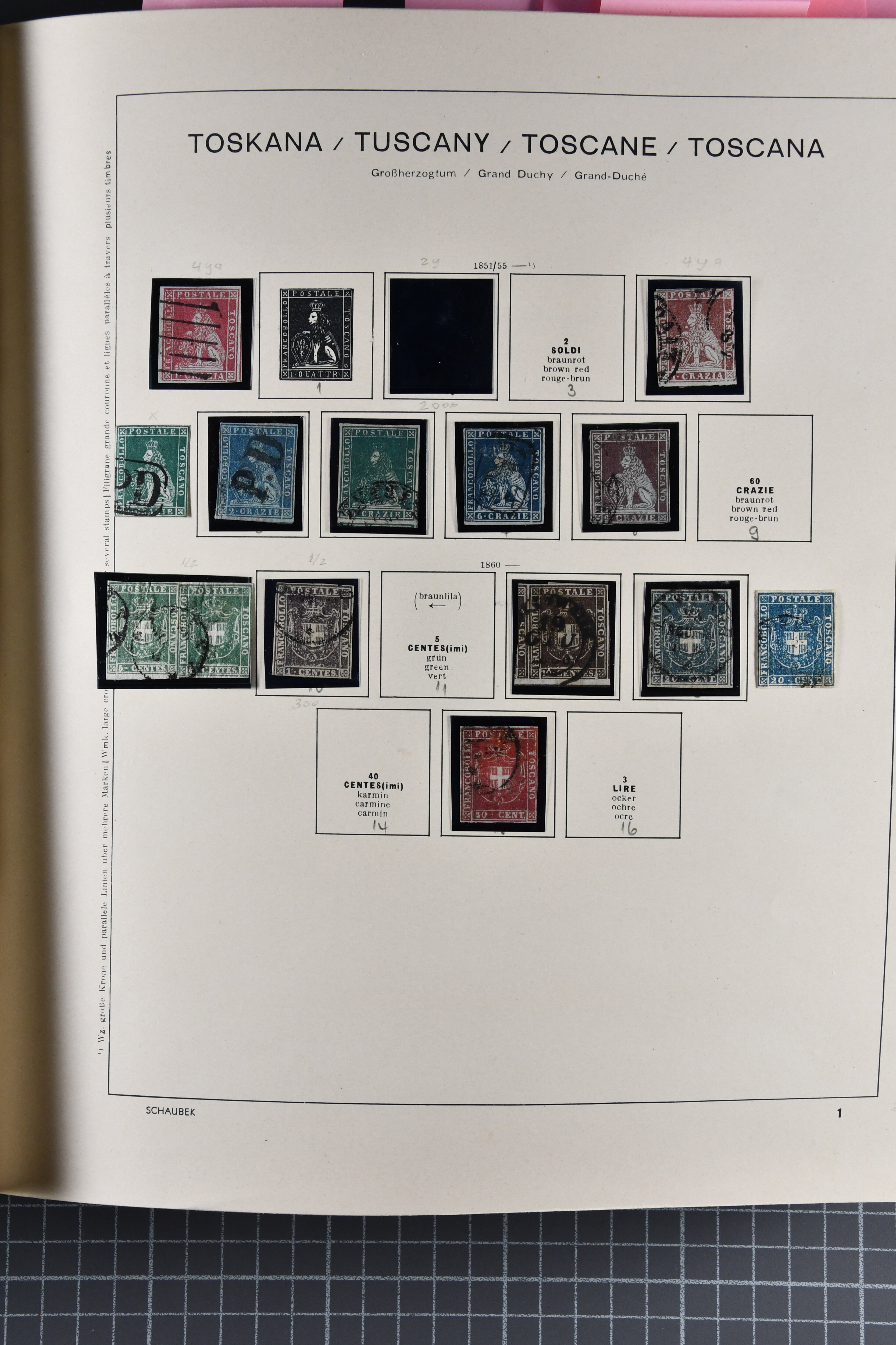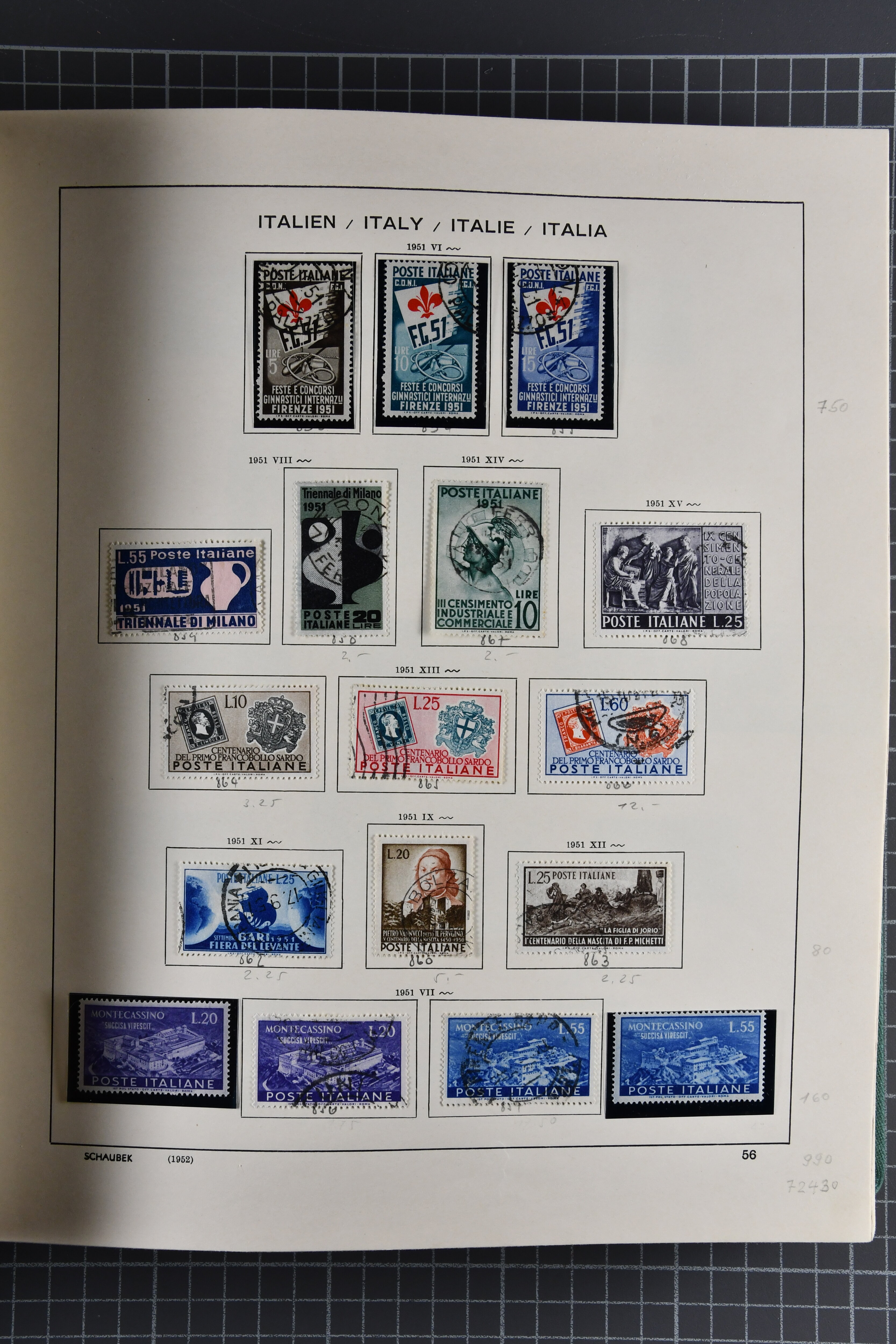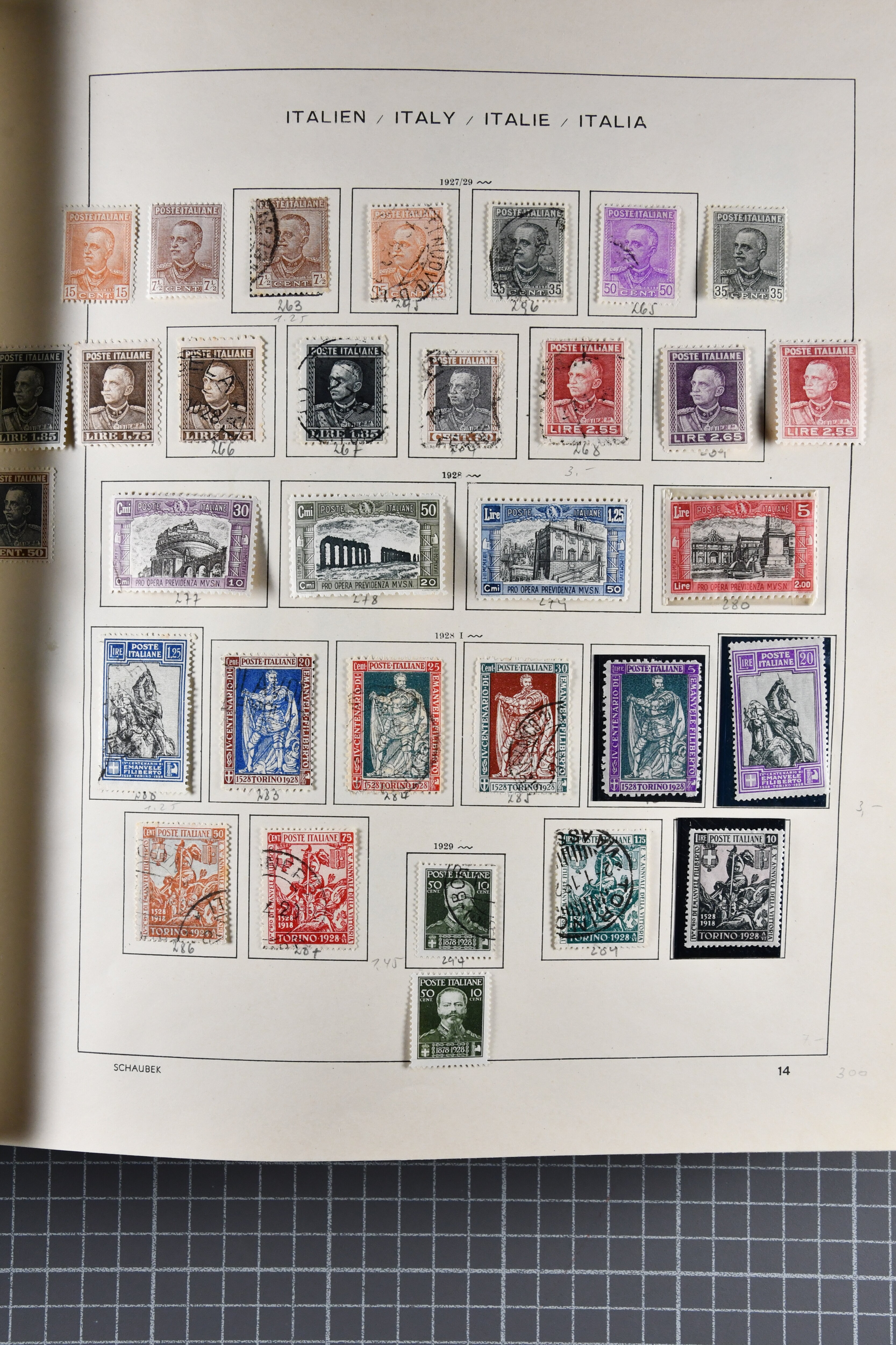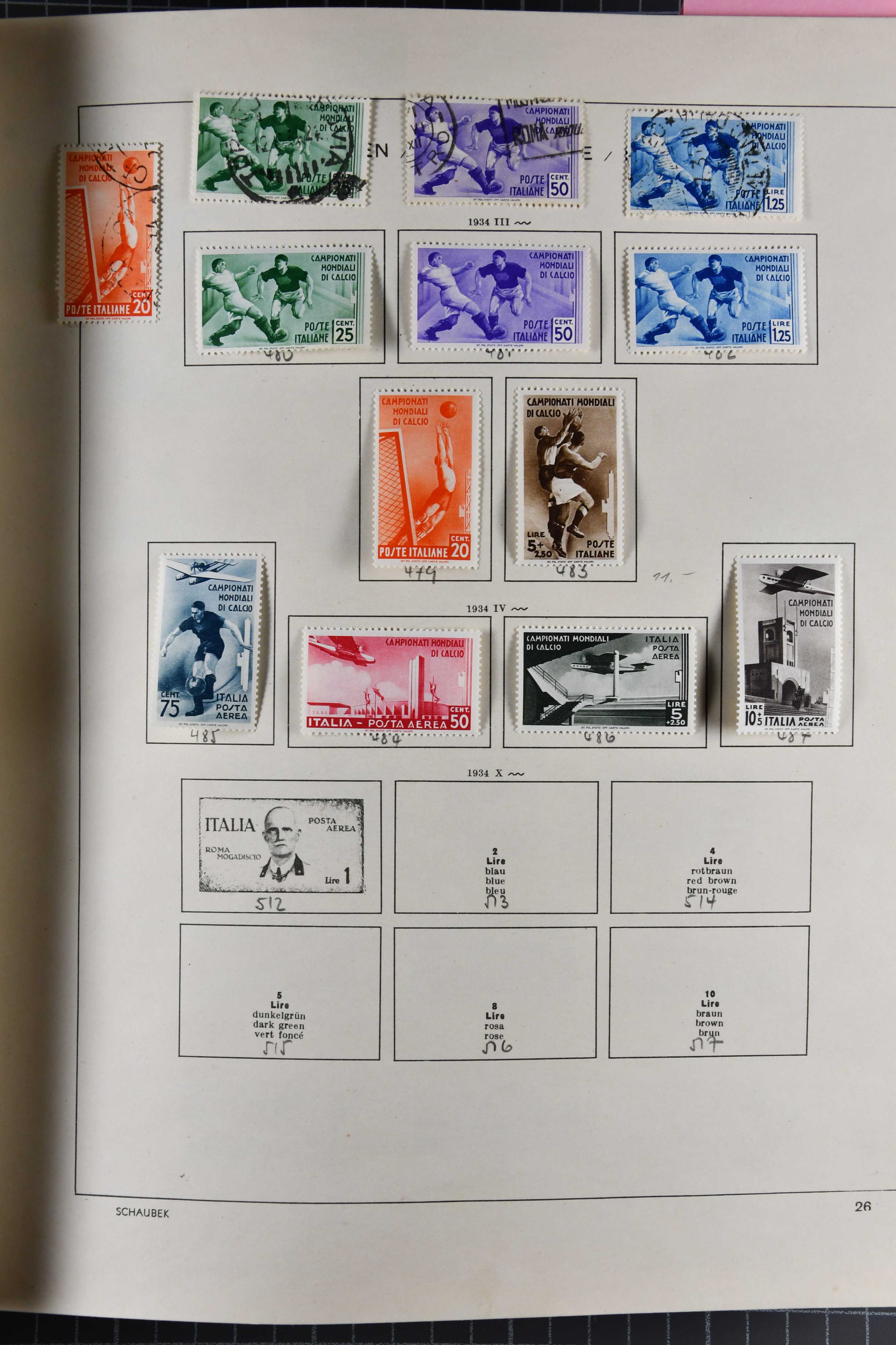 2050 image1851/1989: Old Italian States to Colonies – collection mounted on Schaubek pages in one volume, opening with a well-filled section of the Old Italian States, in very mixed condition. The Kingdom of Italy is well represented with a broad selection of mostly unused and some used sets, notably including the Manzoni issue (this part generally in good condition). The Republic is predominantly used, with Trieste, Fiume, a few occupation issues and colonies. Also included are two albums Papal States / Vatican City – one with loose stamps, the other with covers, including some better full sets incl. Catholic Press and Archaeological Congress on envelope and a set of Papal Voyages. Very high catalogue value (Image 1) (Image 2) (Image 3) (Image 4) (Image 5) (Image 6) (Image 7) (Image 8) (Image 9) (Image 10) (Image 11) (Image 12) (Image 13) (Image 14) (Image 15) (Image 16) (Image 17) (Image 18) (Image 19) (Image 20)