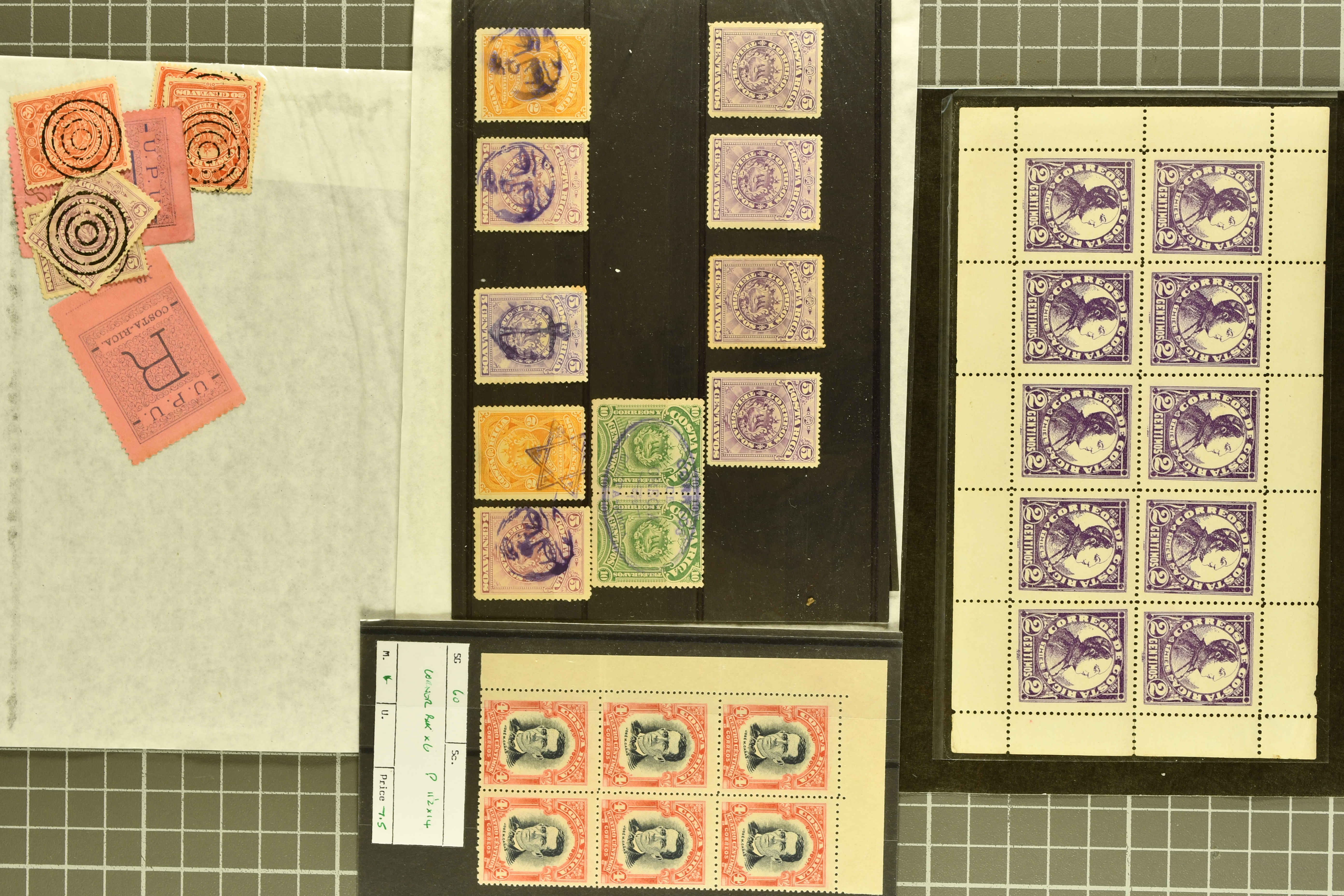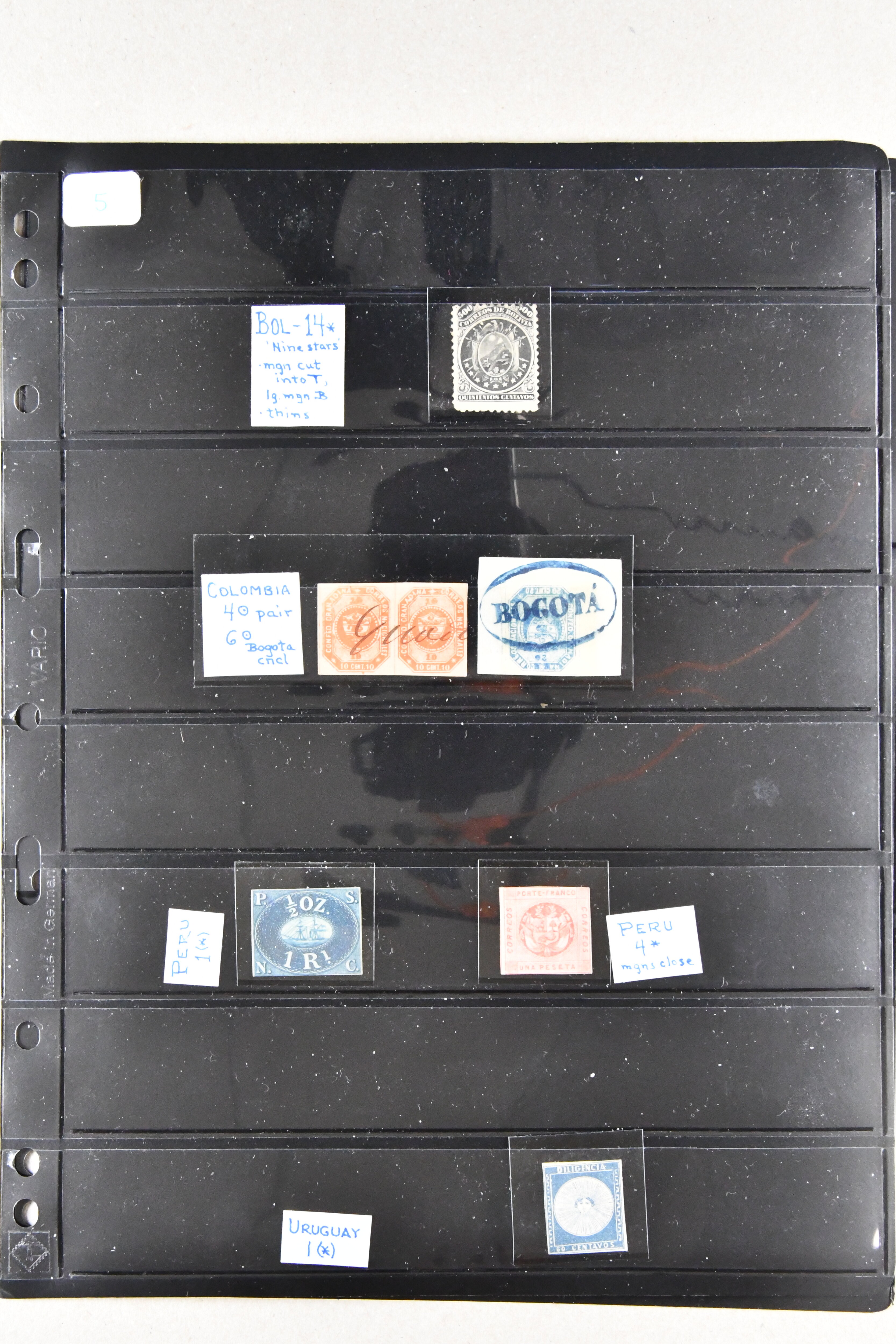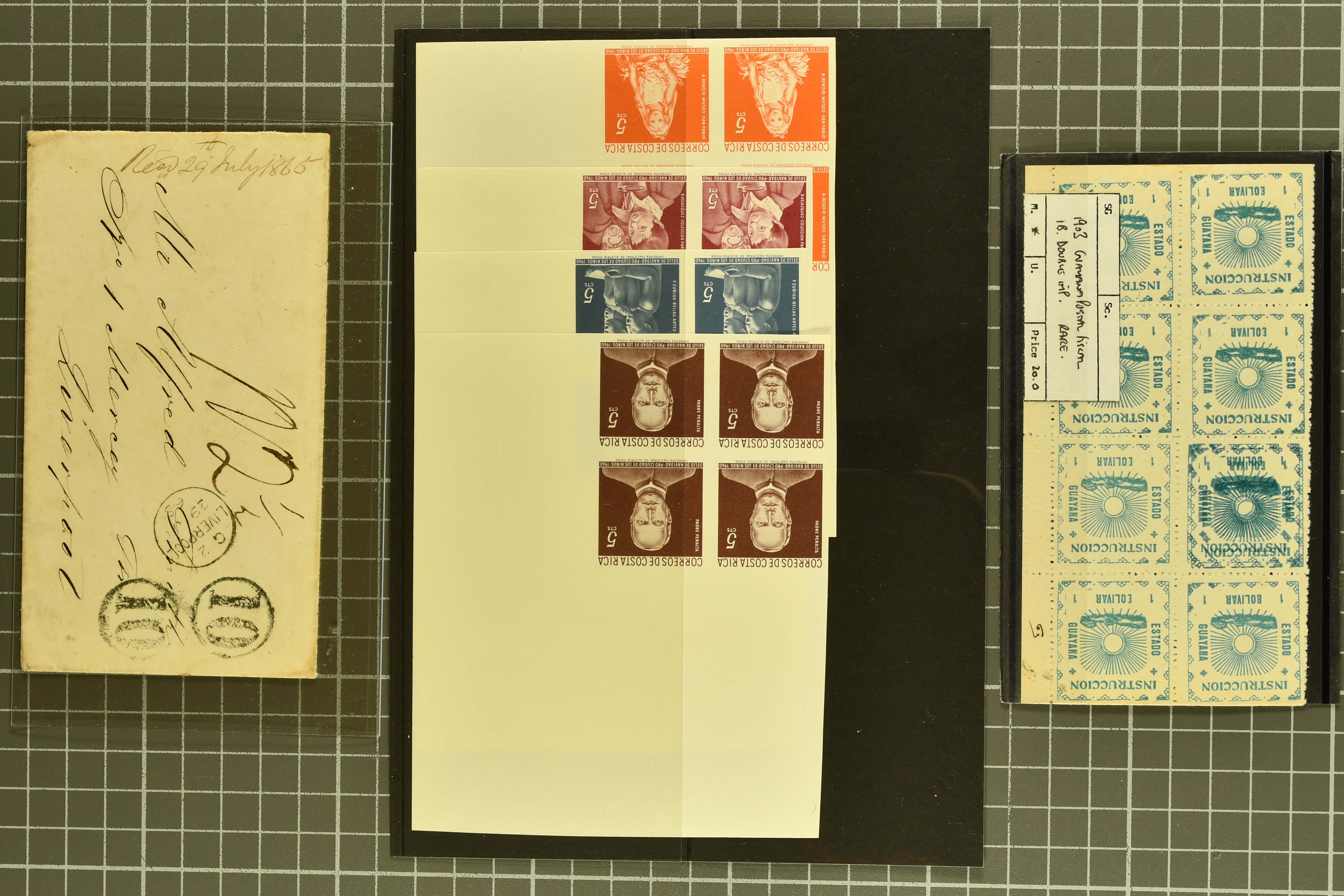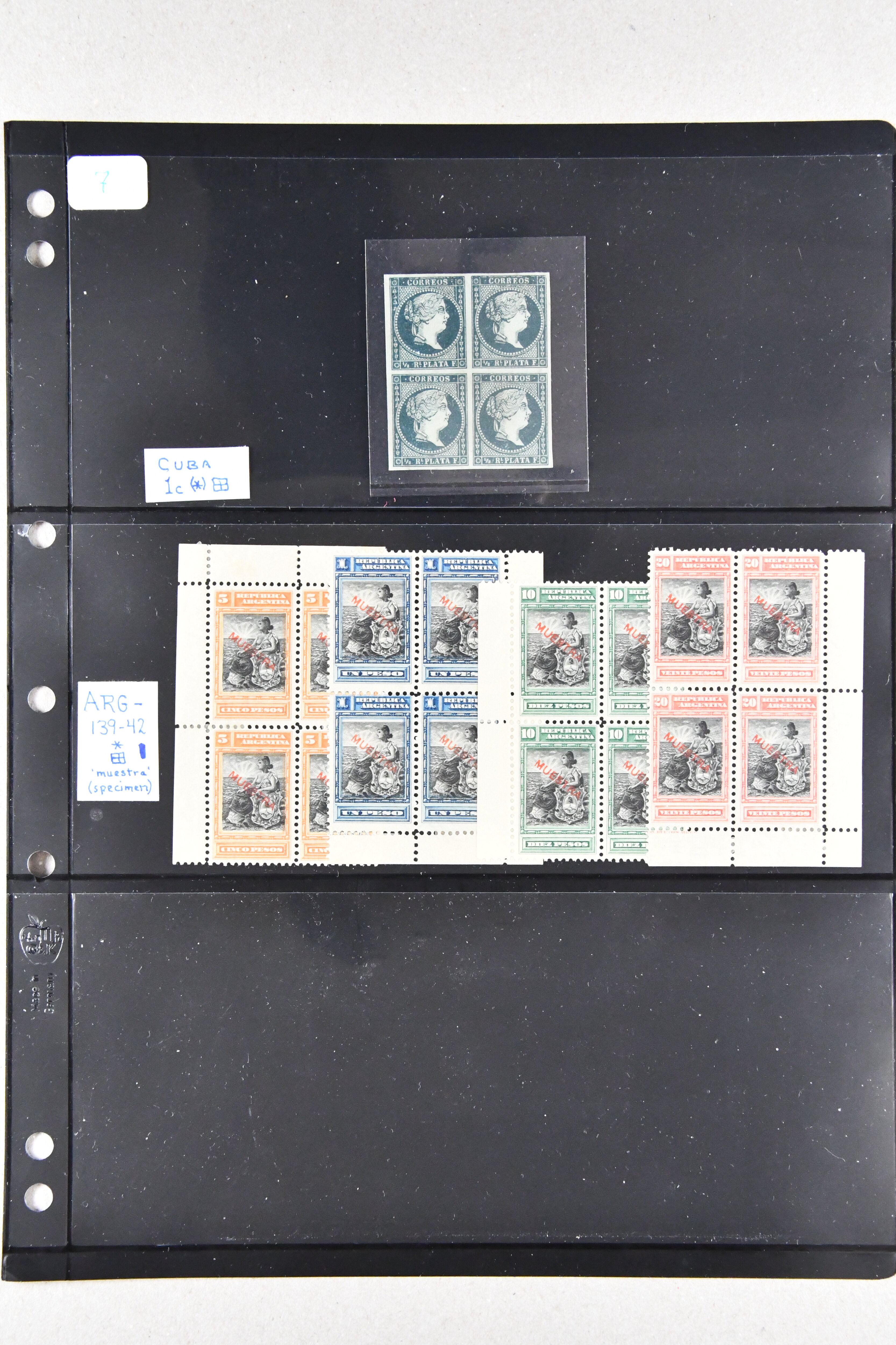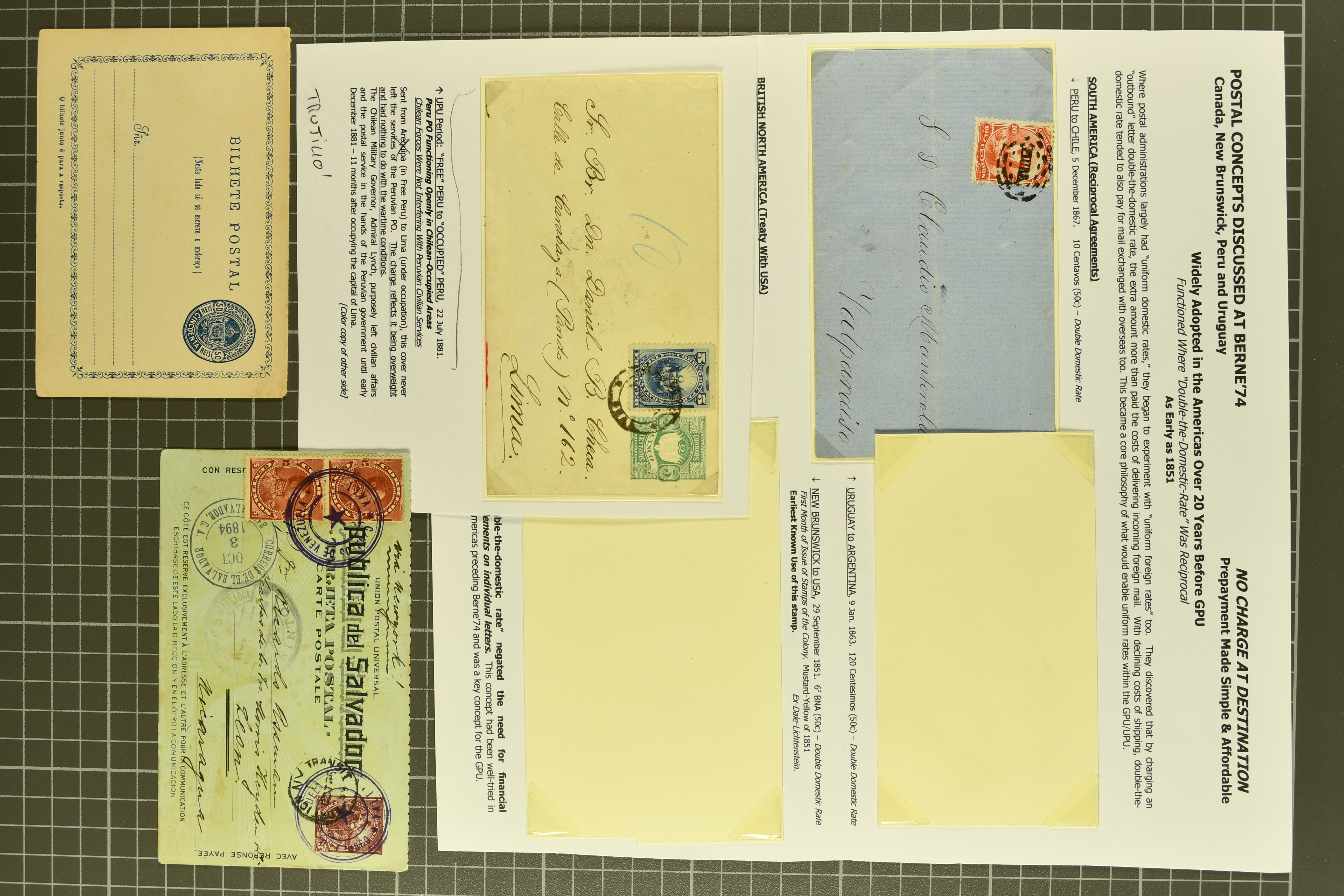 1459 image1855/1903ca.: Fine selection starting with Argentine 1867 'Seated Liberty' issue the four top values 1p. to 20 p. with MUESTRA' overprints in unused corner blocks of four, Bolivia 1869 Coat of Arms 'nine stars' 500 c. black (Scott 14) unused, Colombia hoirz. pair of 1859 10 c. orange brown cancelled by manuscript "Guaduas" (ex Goeggel) and 1859 5 c. blue tied by bold 'BOGOTÀ' h.s. in blue to small piece. Further Cuba with 1855 Queen Isabella 1/2 p. blue-green in an unused block of four together with 1917 'José de la Luz Caballero' imperf colour trial plate proof on wove thick paper printed in a cross gutter block of 16 in green instead of violet as later issued. Peru with unused PSNC 2r. blue and 1857 Coat of Arms 1p. red, together with 1856 Uruguay Carrier stamp 60 c. blue also unused. In addition an unused part sheet of twelve of 1891 Poppe'rs 'Tierra del Fuego' local issue together with 1874 price-list sent from Brazil to Portugal as well as business cover 'Oliver Ditson & cO. Pianos & Organs' locally used in Boston USA (Image 1) (Image 2) (Image 3) (Image 4)