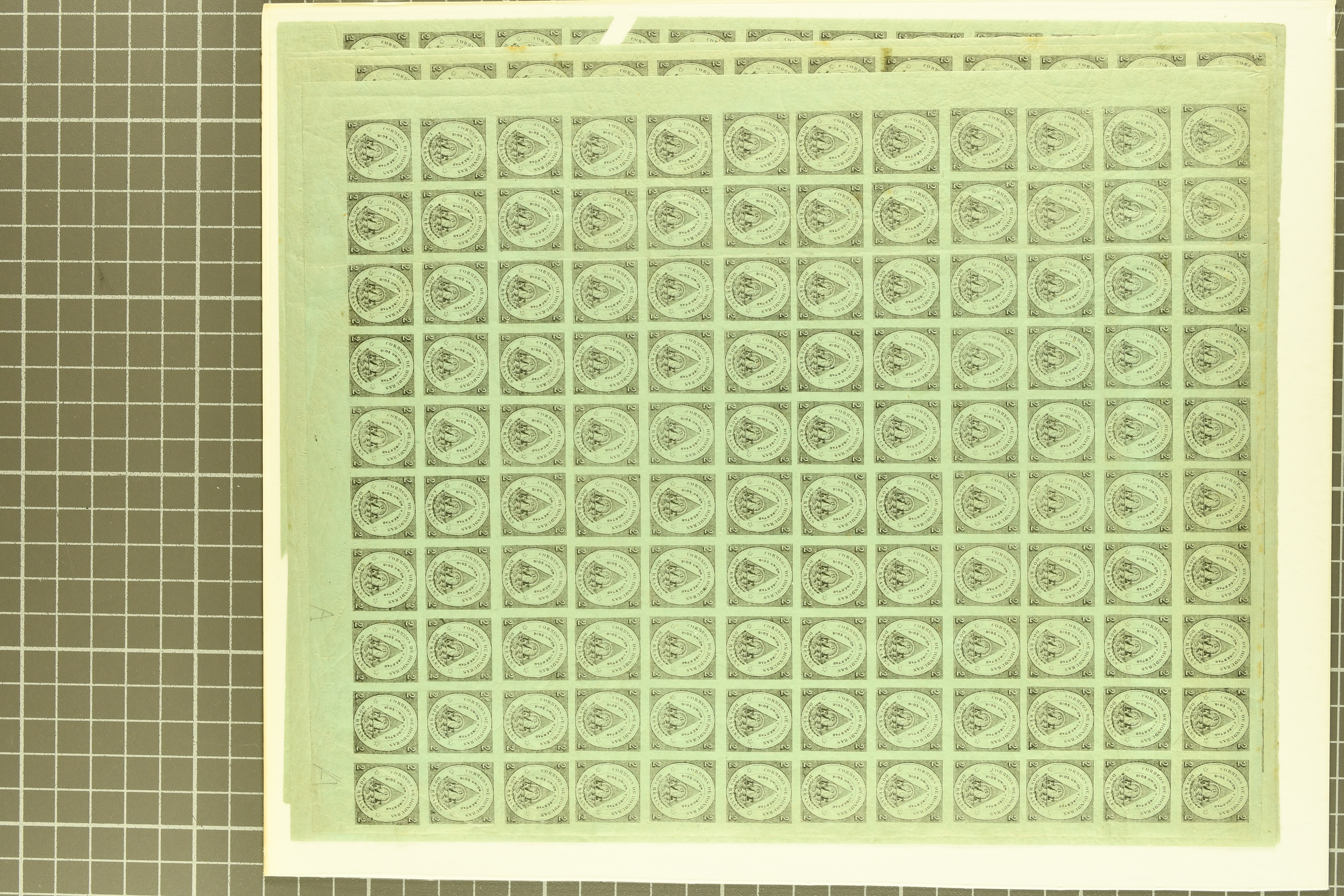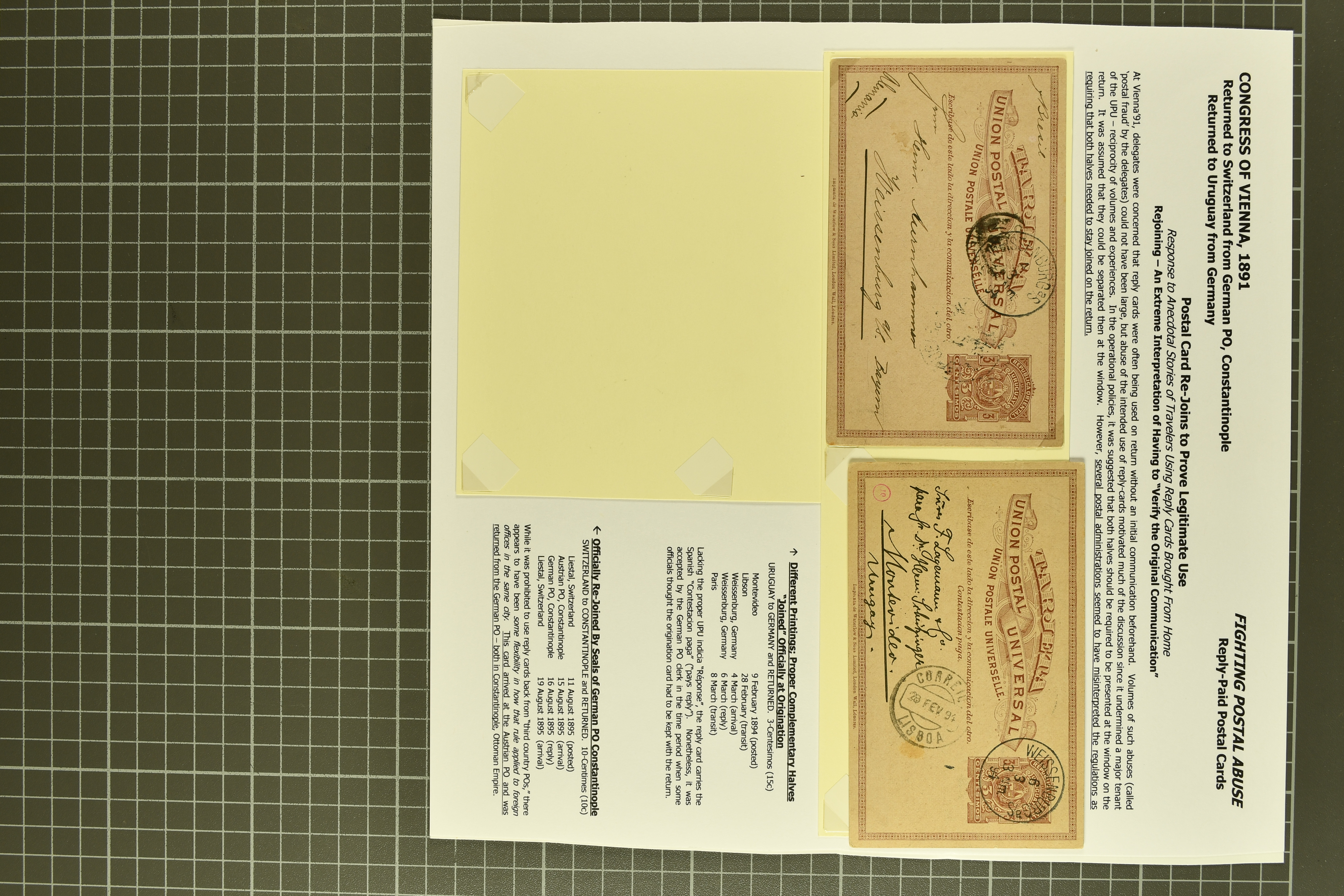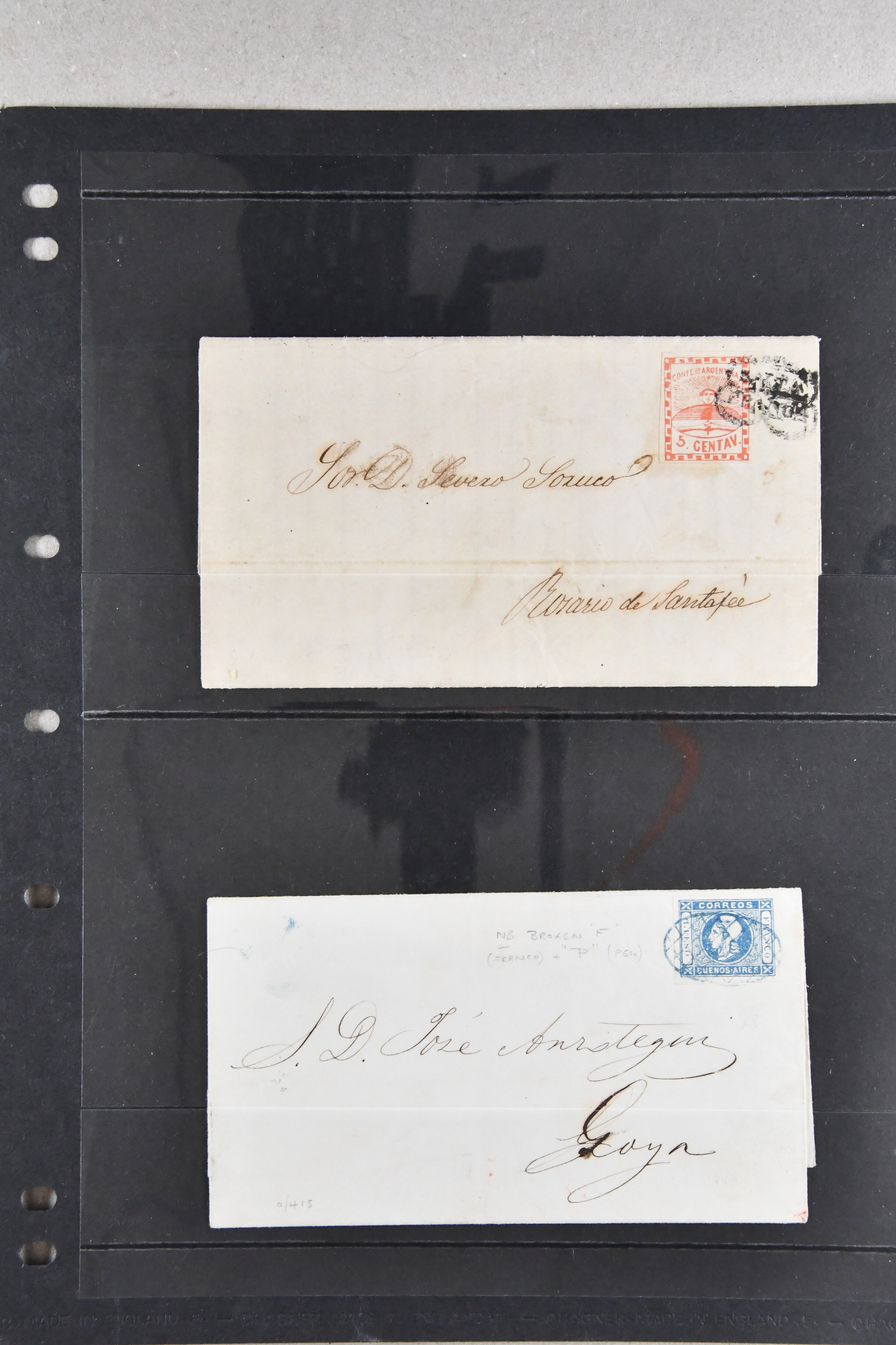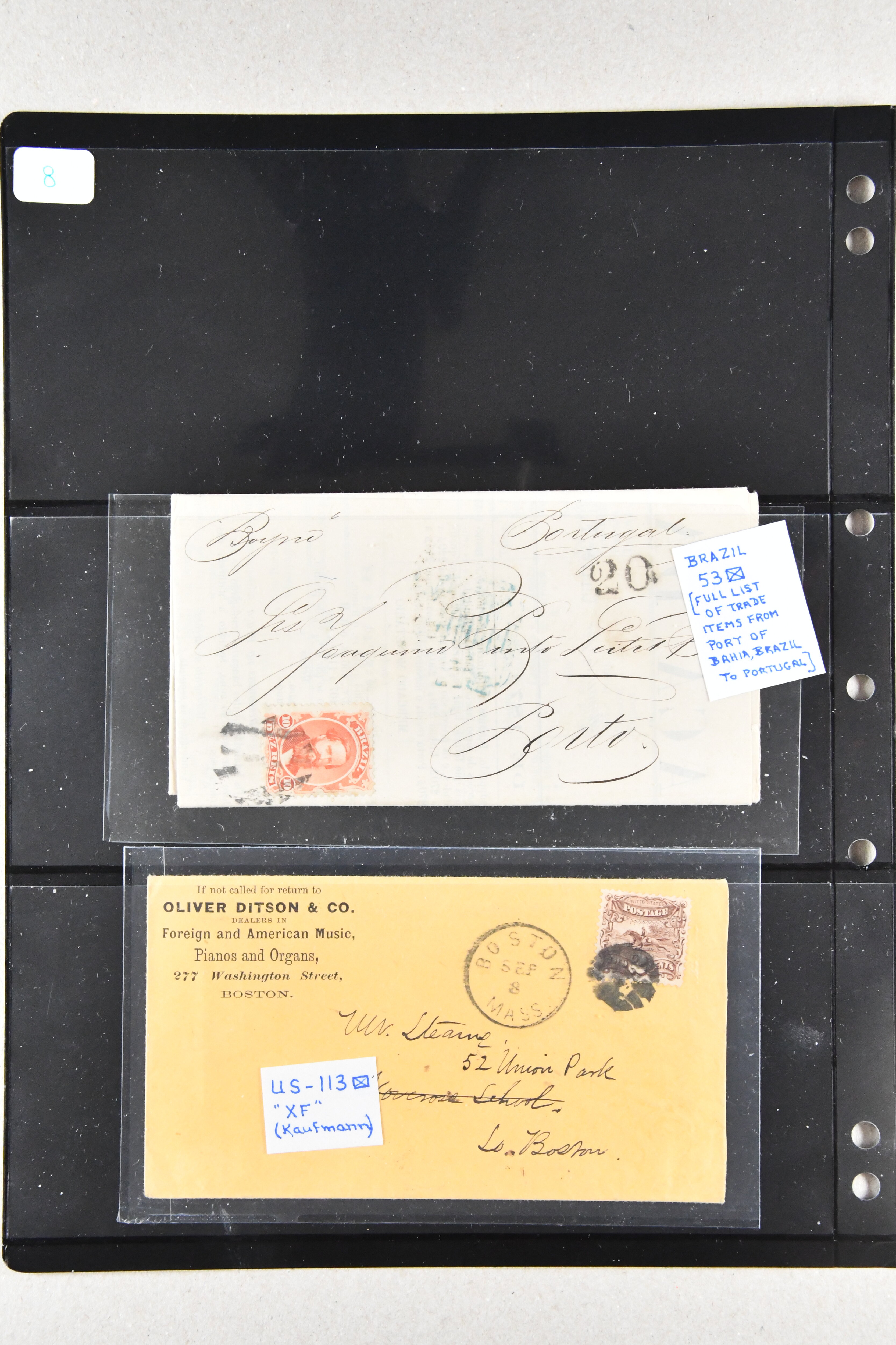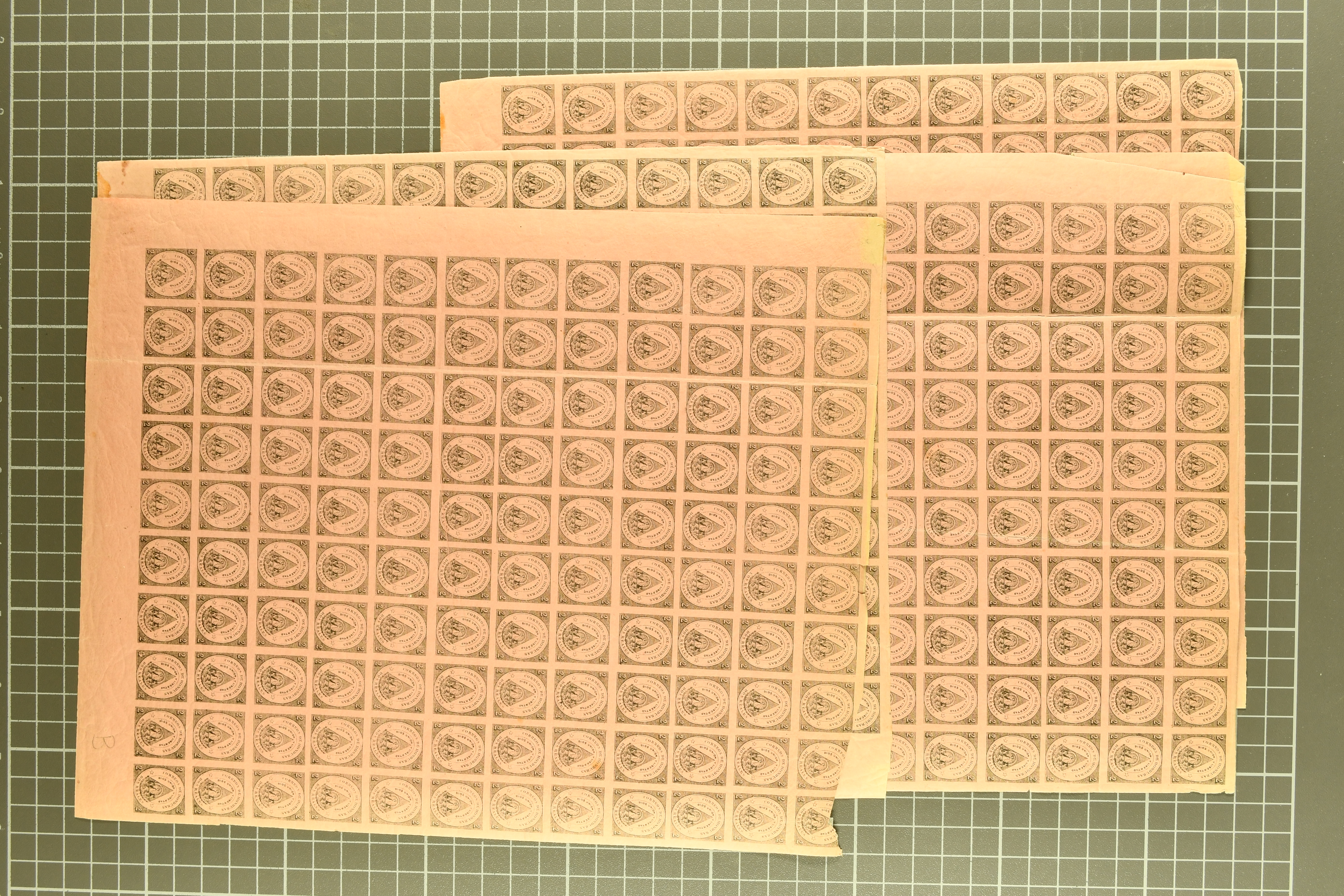 1459 image1855/1903ca.: Fine selection starting with Argentine 1867 'Seated Liberty' issue the four top values 1p. to 20 p. with MUESTRA' overprints in unused corner blocks of four, Bolivia 1869 Coat of Arms 'nine stars' 500 c. black (Scott 14) unused, Colombia hoirz. pair of 1859 10 c. orange brown cancelled by manuscript "Guaduas" (ex Goeggel) and 1859 5 c. blue tied by bold 'BOGOTÀ' h.s. in blue to small piece. Further Cuba with 1855 Queen Isabella 1/2 p. blue-green in an unused block of four together with 1917 'José de la Luz Caballero' imperf colour trial plate proof on wove thick paper printed in a cross gutter block of 16 in green instead of violet as later issued. Peru with unused PSNC 2r. blue and 1857 Coat of Arms 1p. red, together with 1856 Uruguay Carrier stamp 60 c. blue also unused. In addition an unused part sheet of twelve of 1891 Poppe'rs 'Tierra del Fuego' local issue together with 1874 price-list sent from Brazil to Portugal as well as business cover 'Oliver Ditson & cO. Pianos & Organs' locally used in Boston USA (Image 1) (Image 2) (Image 3) (Image 4)