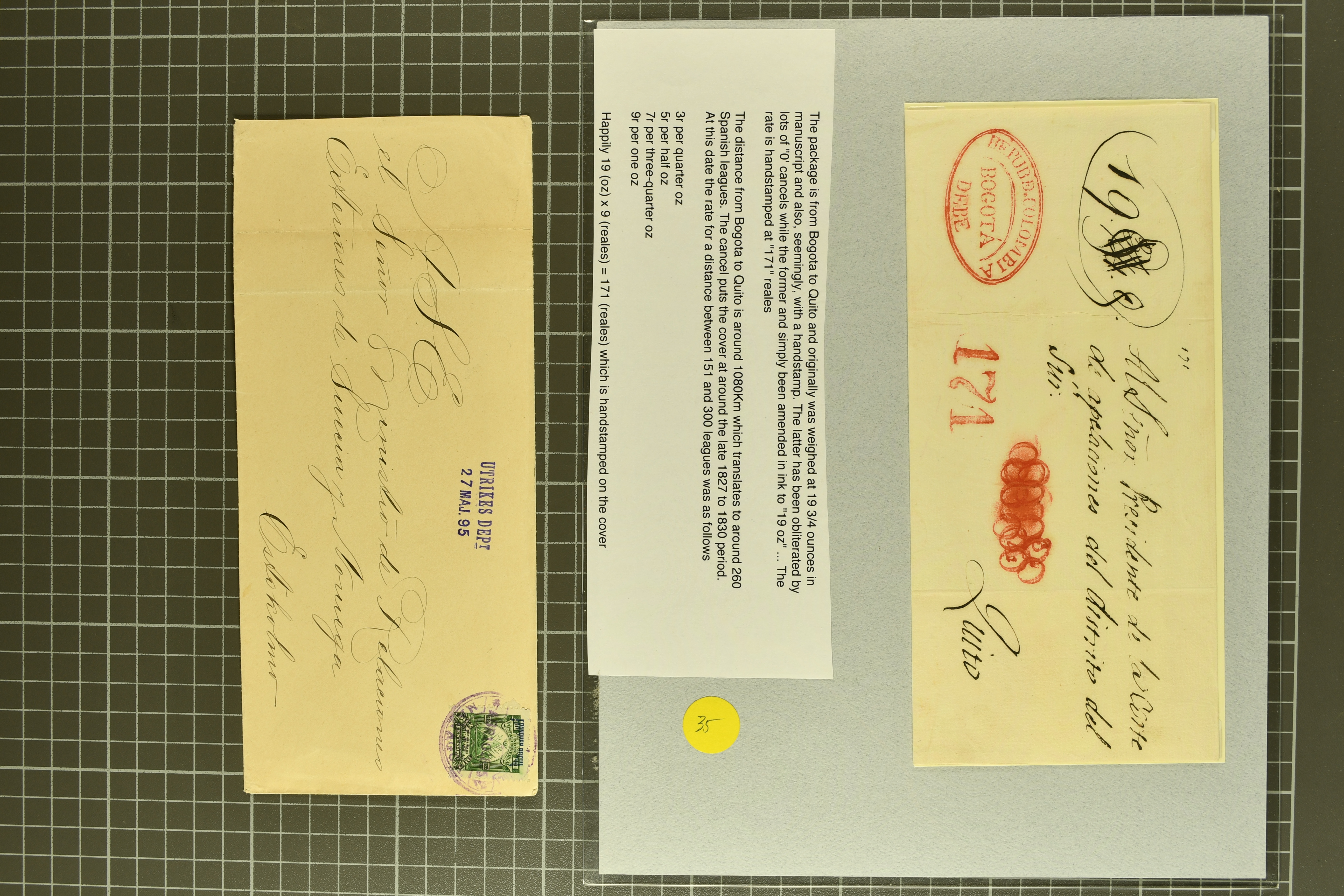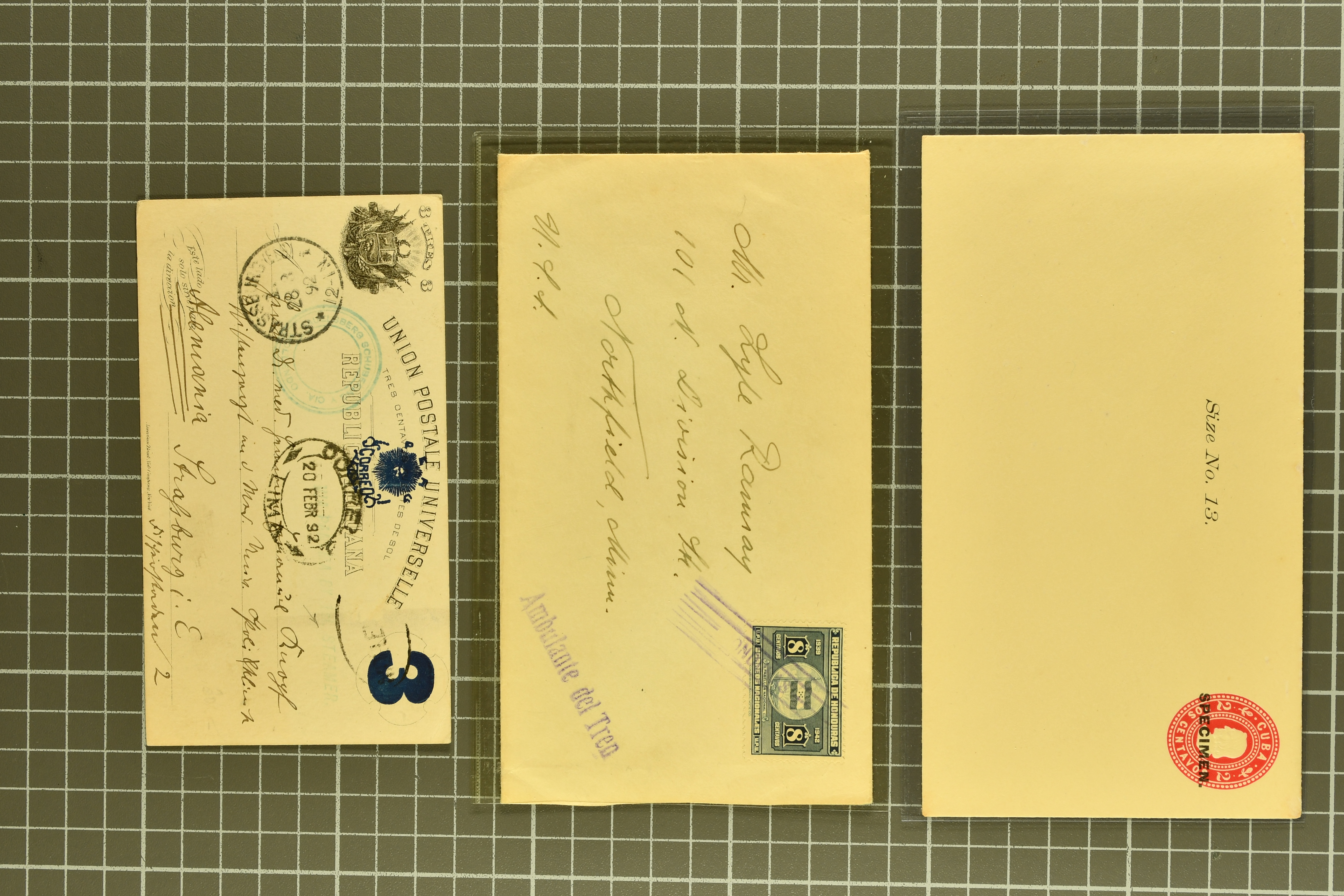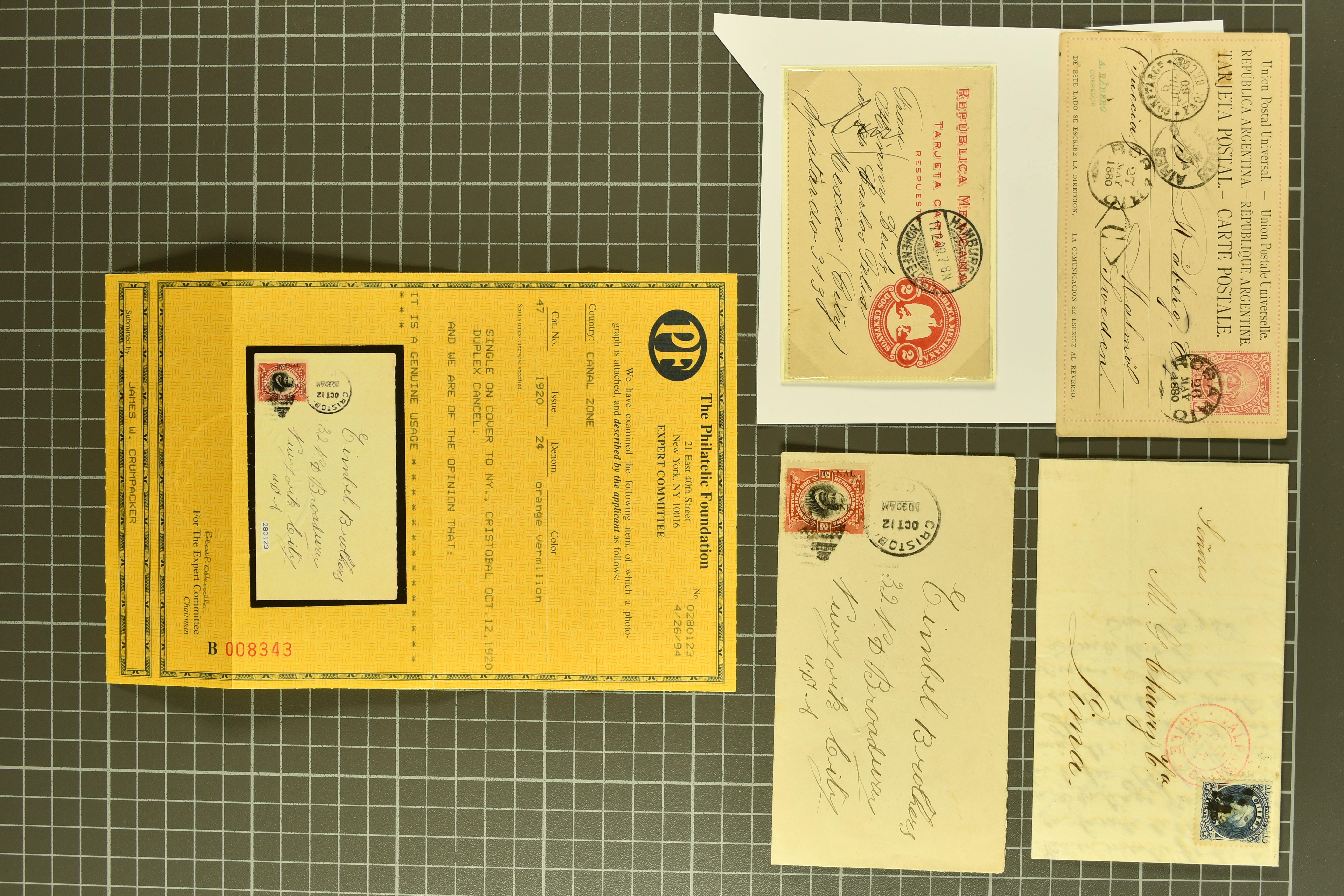90392 cover image1830/1920 (ca.), attractive group of 14 covers and cards with some better and unusual usages, noted a scarce 1830s parcel receipt from Bogota to Quito correctly paid at 171 reales, a well travelled 1894 reply card via Salvador, Venezuela and Nicaragua, also Mexico 2 centavos reply card used with cds “HAMBURG HOHENFELD 17.2.00”, Canal Zone 2 cents orange vermilion (Scott-Nr. 47) as single franking to USA (certificate PF), Nicaragua 1895 Official (Mi.-Nr 55) tied by cds “MANAGUA ABR 10 95” to envelope to Stockholm, Argentina scarce transatlantic 6 centavos stationery card from Rosario to Sweden via Belgium packet with cds “CONF.on ARG PAQ: BELGE 5 JUIL. 80”, etc, some occasional faults, overall in good condition (Image 1) (Image 2) (Image 3) (Image 4)