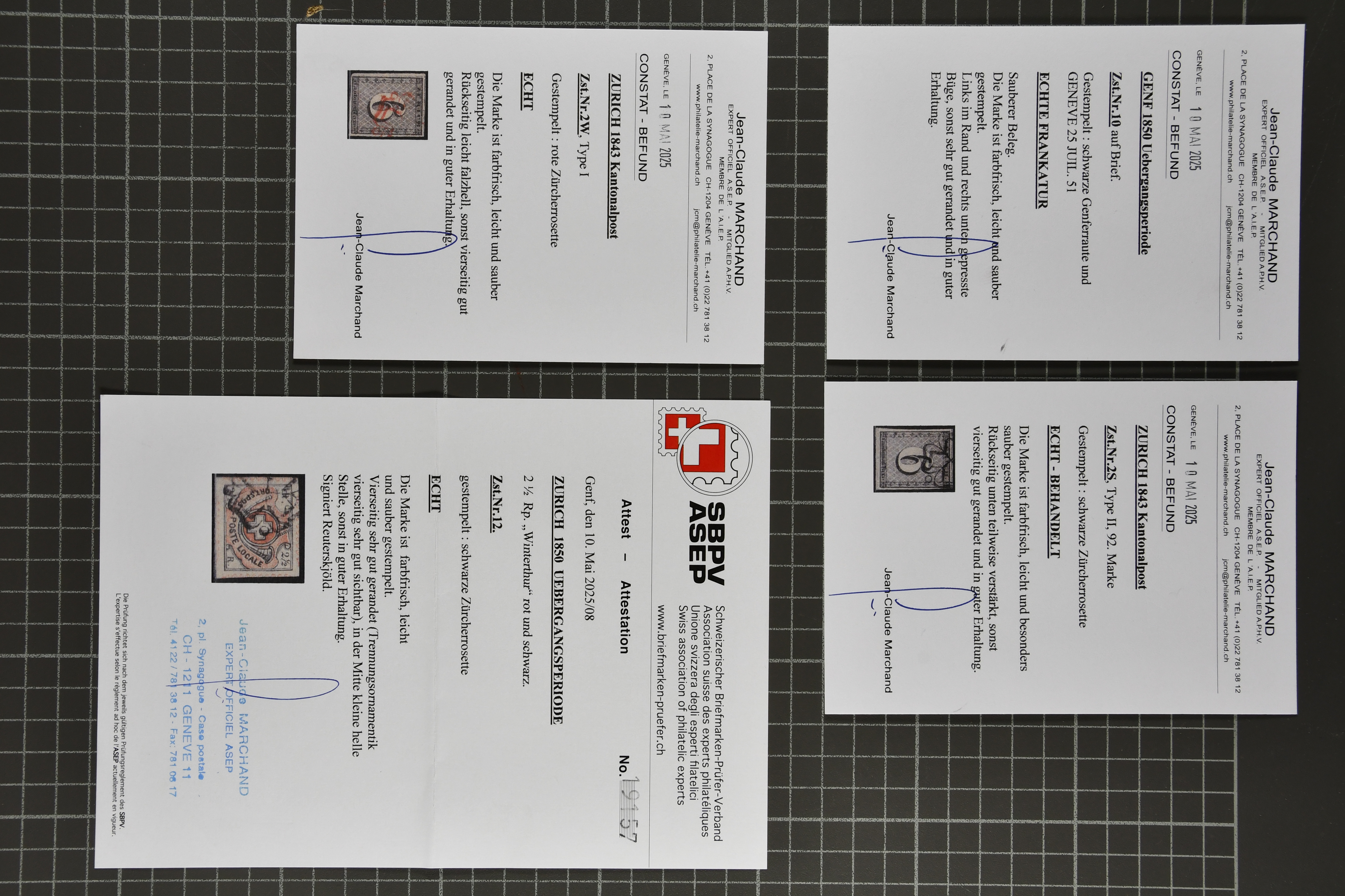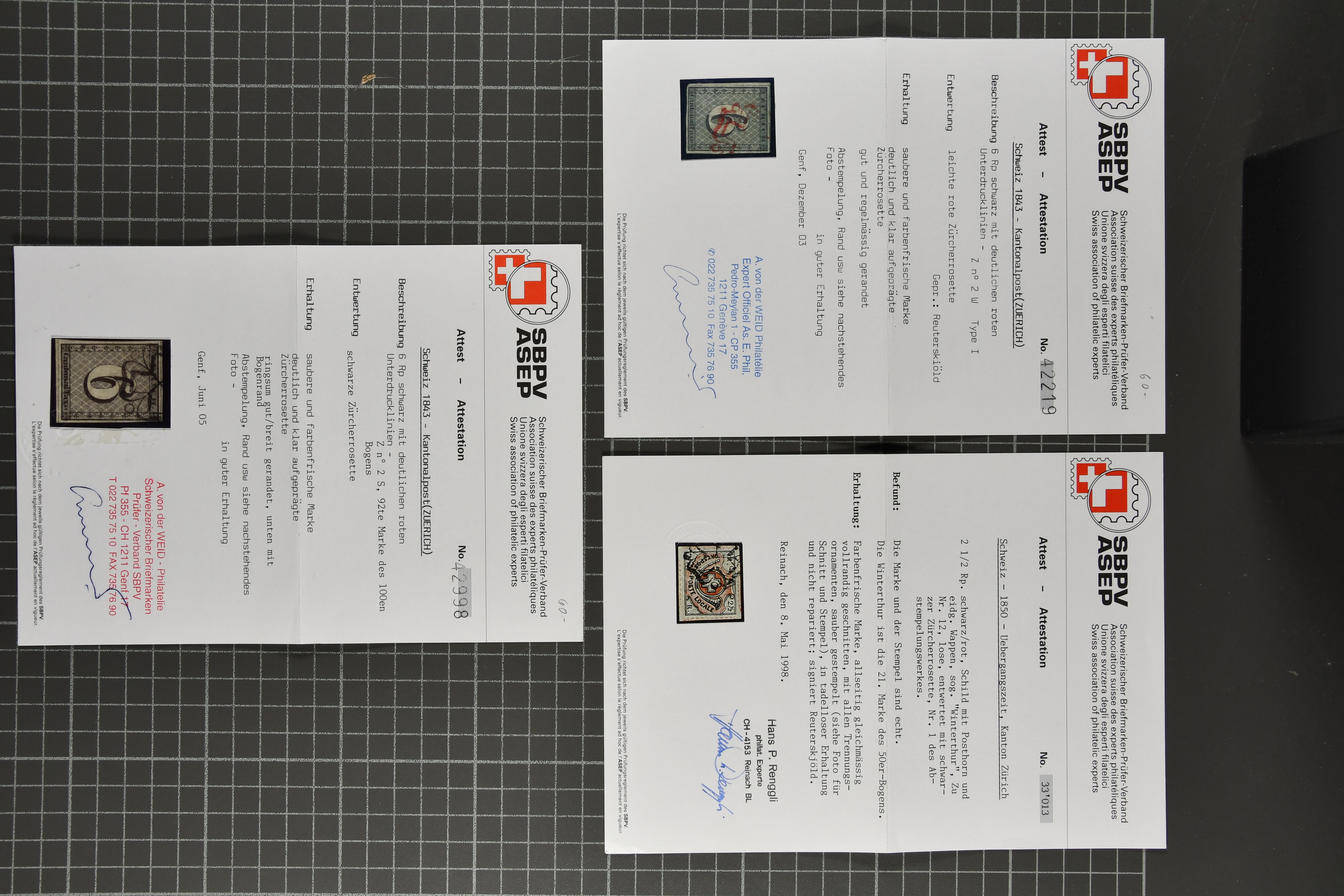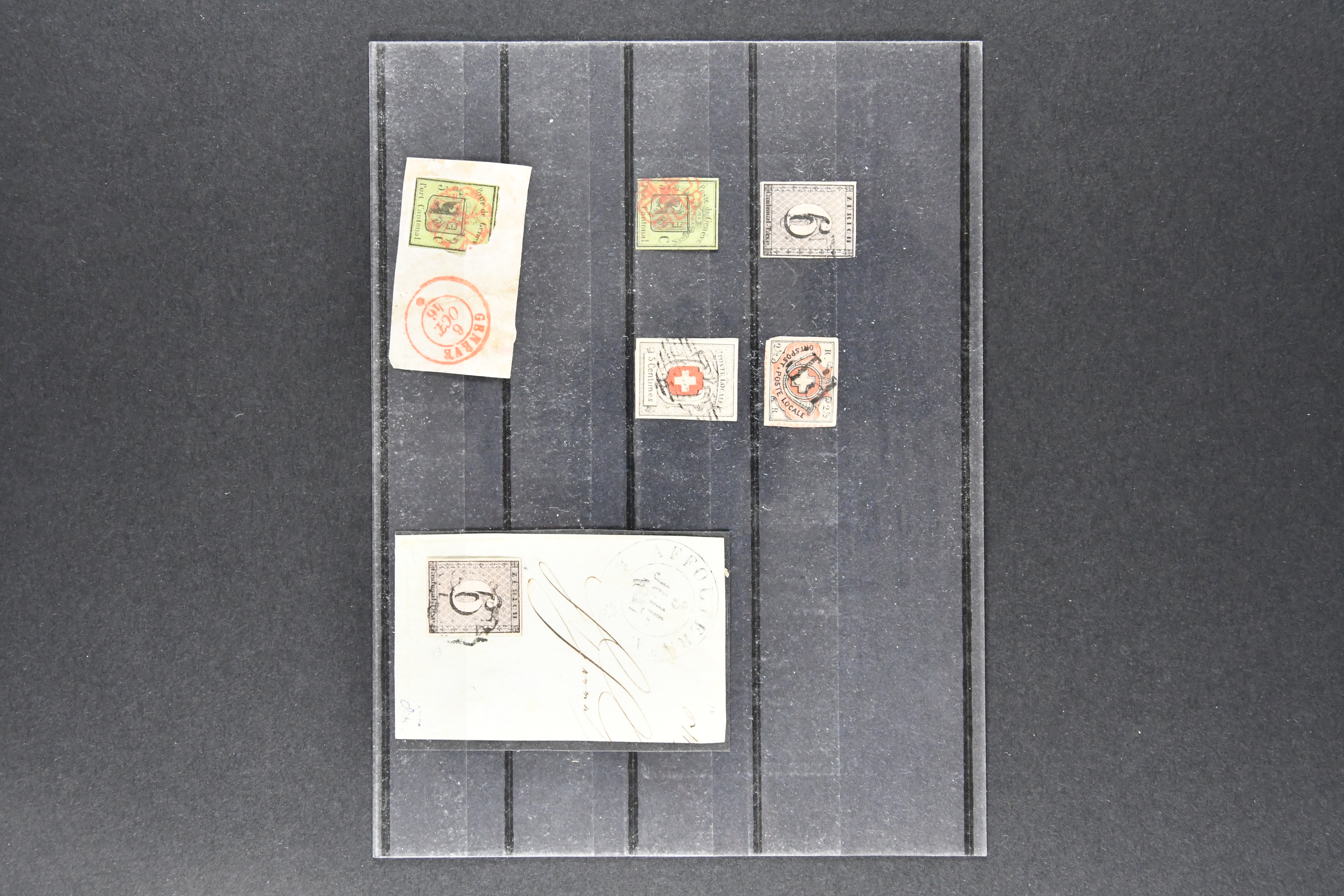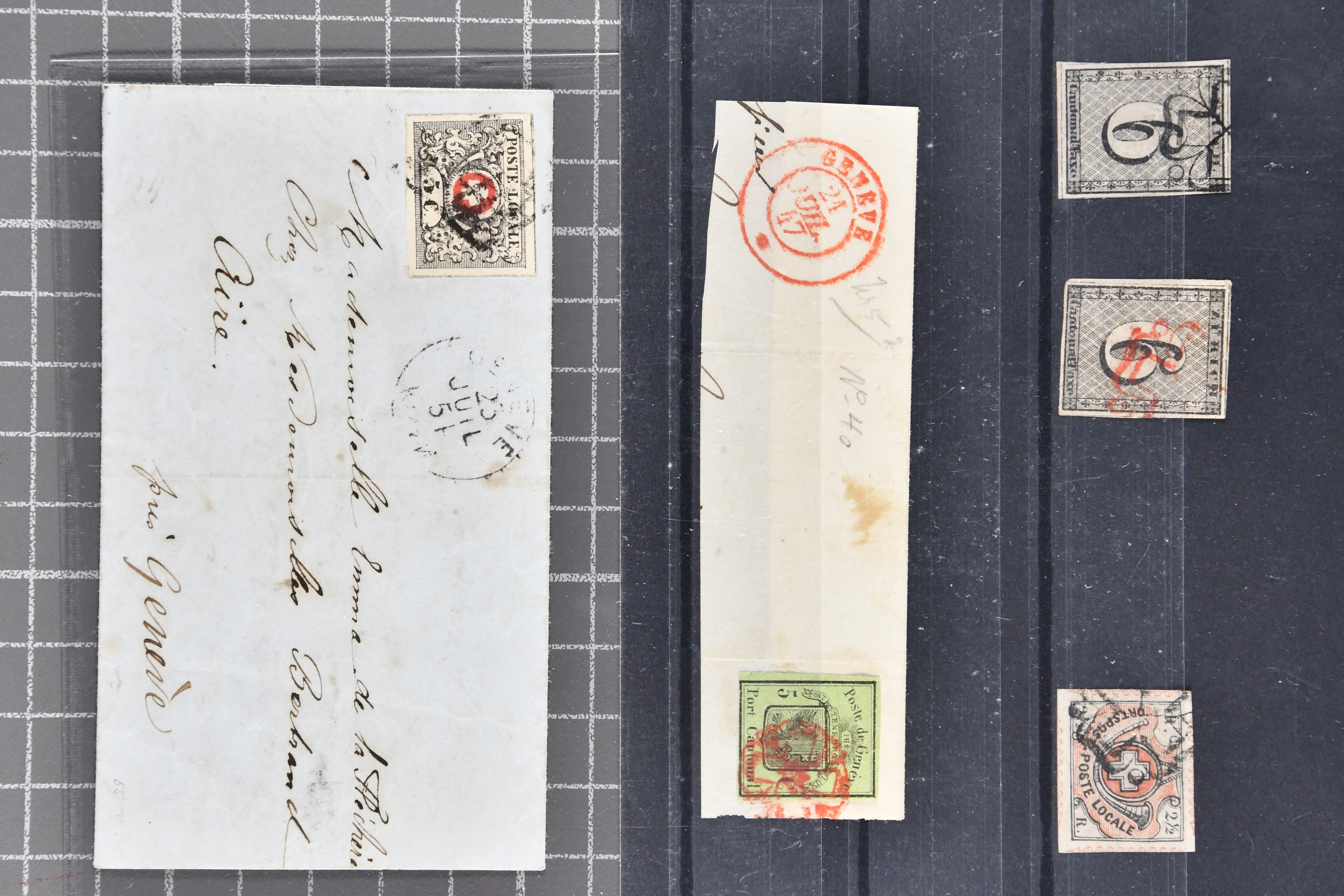 9728 image1843/50: Attraktive Partie fünf Kantonalmarken einzeln, auf Briefstück und auf Brief. Dabei Zürich 6 mit senkr. Unterdrucklinien (SBK 2S), Type II, die 92. Marke des Hunderterbogens, dekorativ entw. mit zartklar und fein ausgeprägter schwarzer Zürcher Rosette (AW 1), Zürich 6 mit waagr. Unterdrucklinien (SBK 1W), Winterthur (SBK 12), Gr. Adler (SBK 6), farbfr. und breit- bis überrandig, klar und übergehend entw. mit roter Genfer Rosette (AW 2) auf Briefstück mit Nebenstempel sowie Waadt 5, klar entw. mit schwarzer Genfer Gitterraute (AW 101) auf kleinformatigem Faltbrief nach Aire-la-Ville. Teils unbedeutende Mängel aber eine sehr schön präsentierende Zusammenstellung; drei Befunde, drei Atteste. SBK=CHF 18'000 (Image 1) (Image 2) (Image 3)