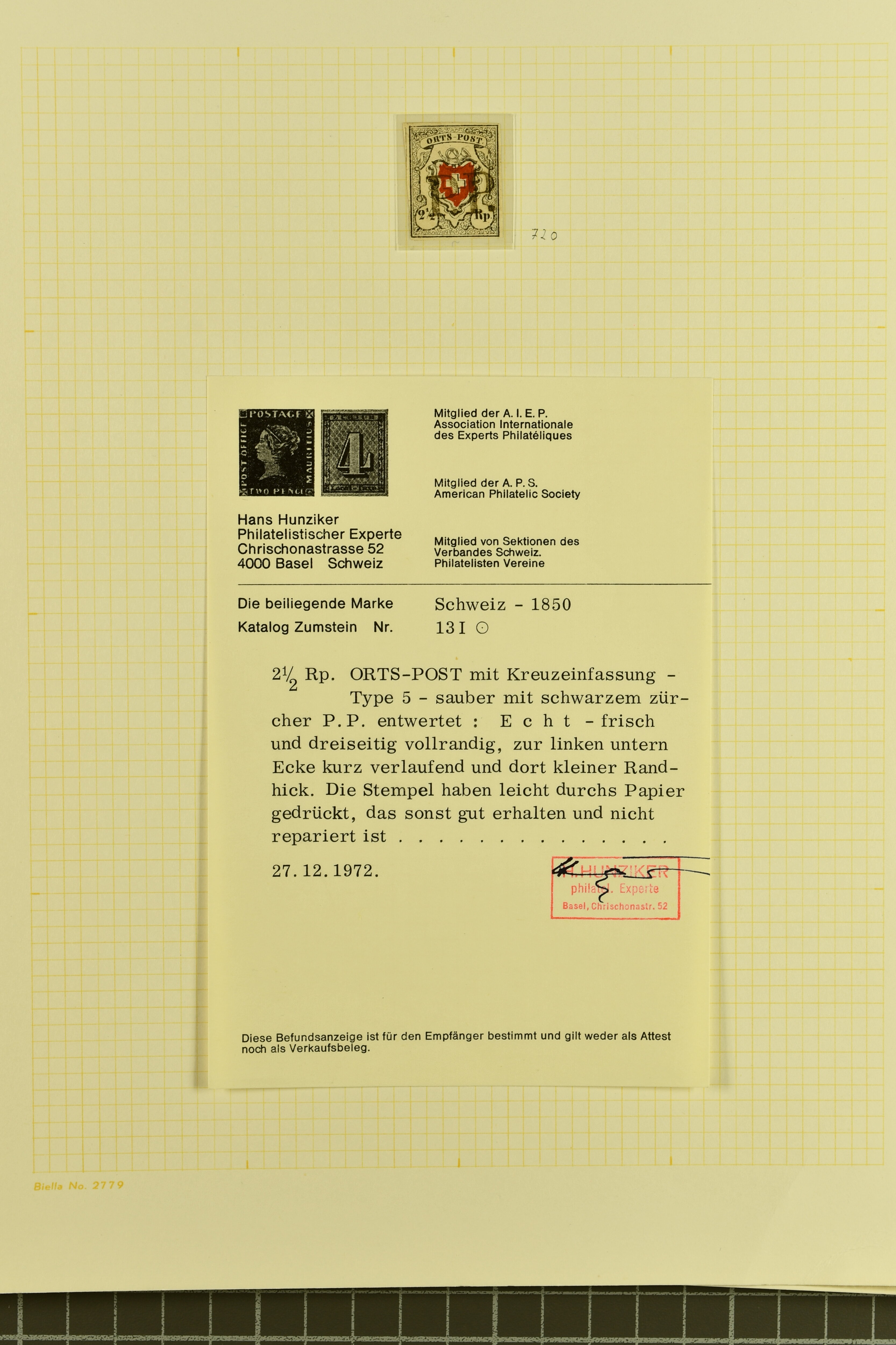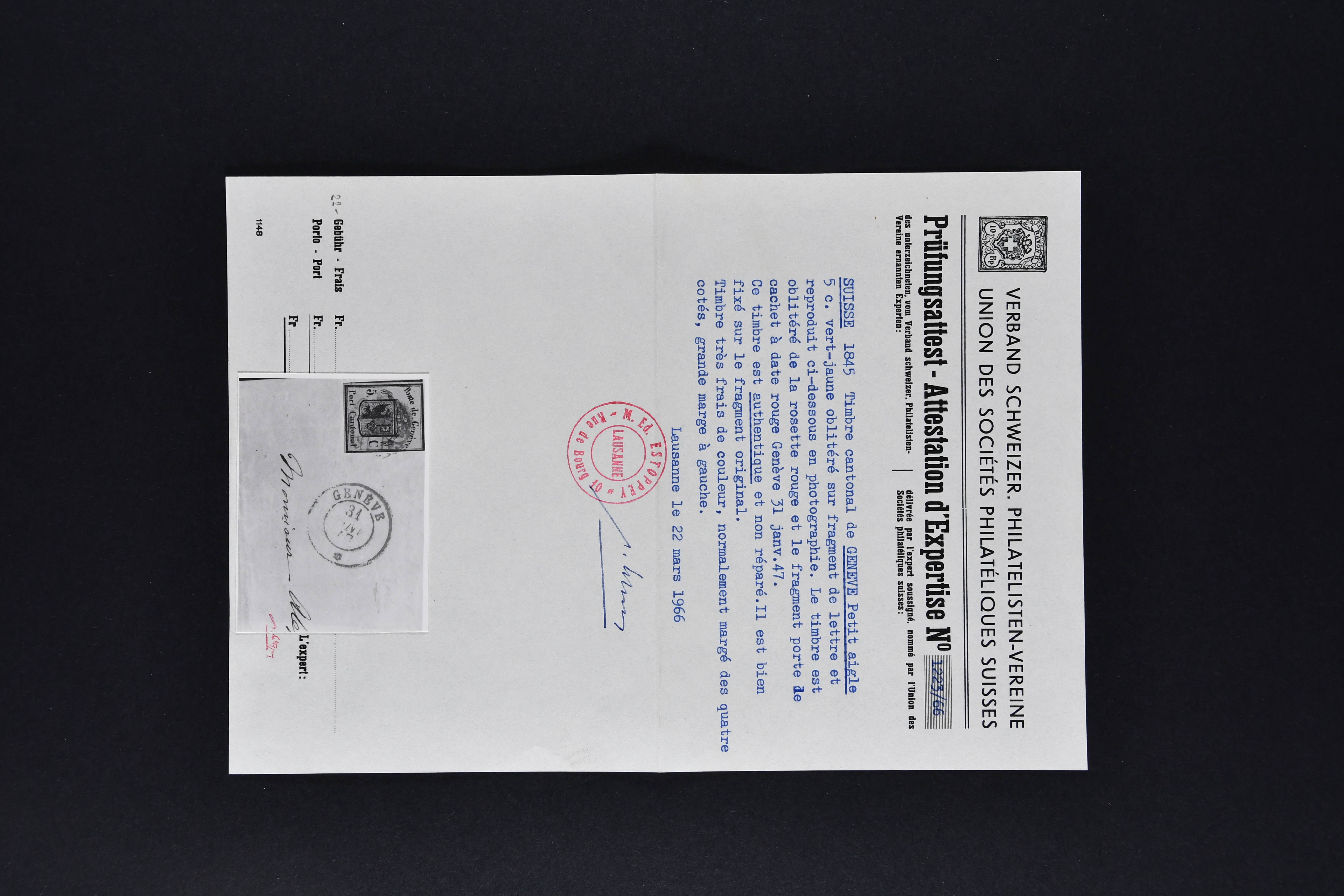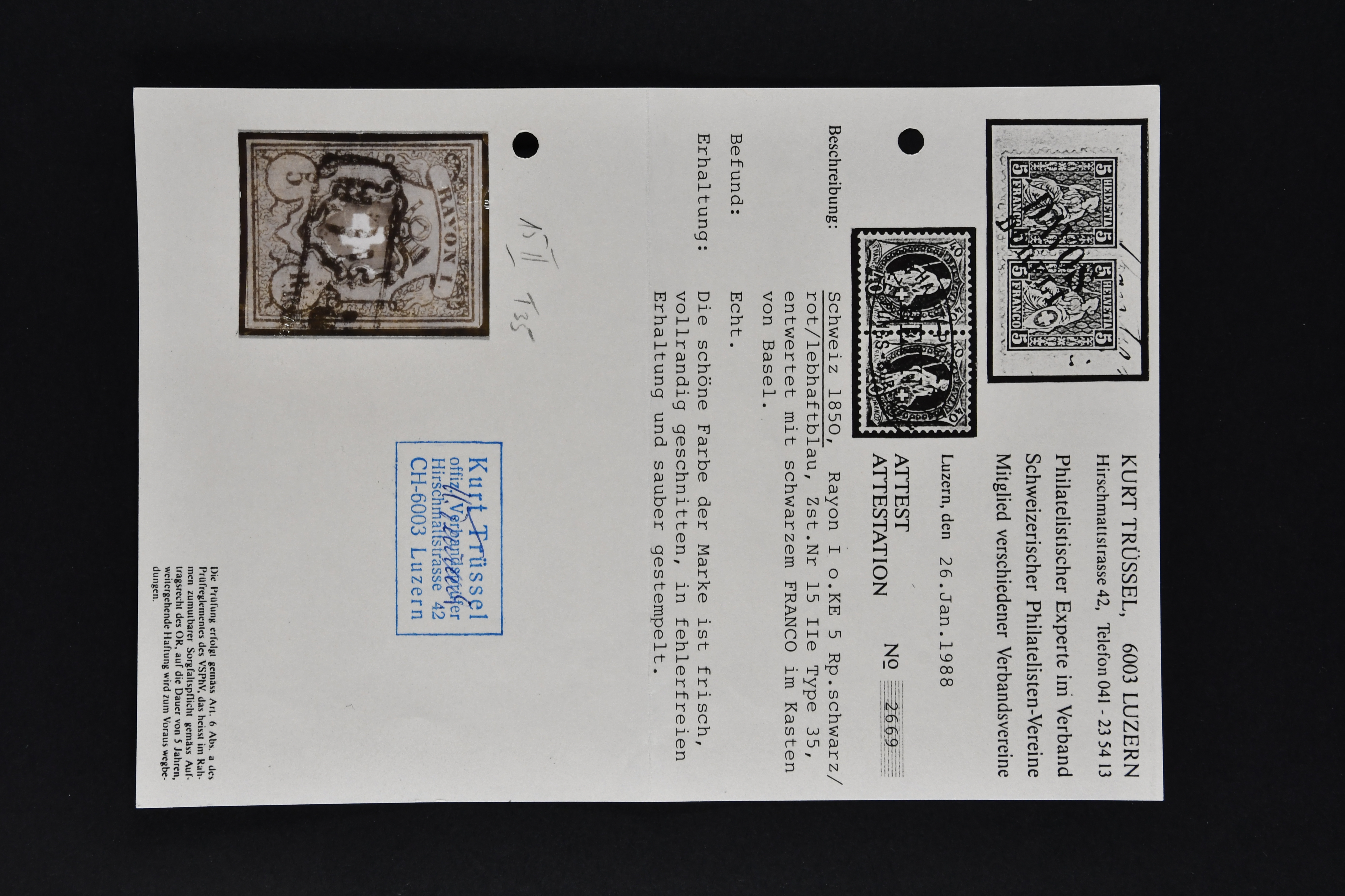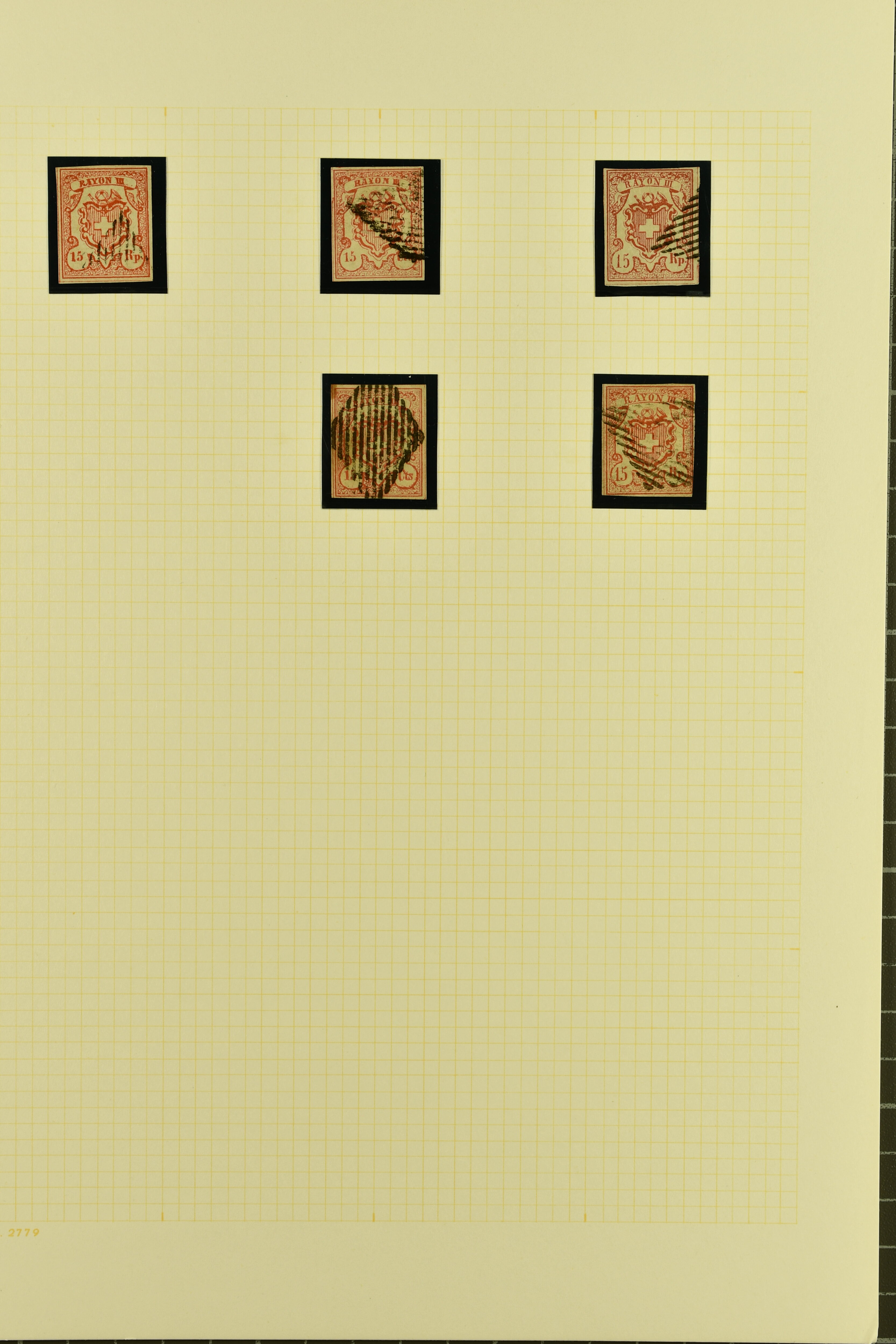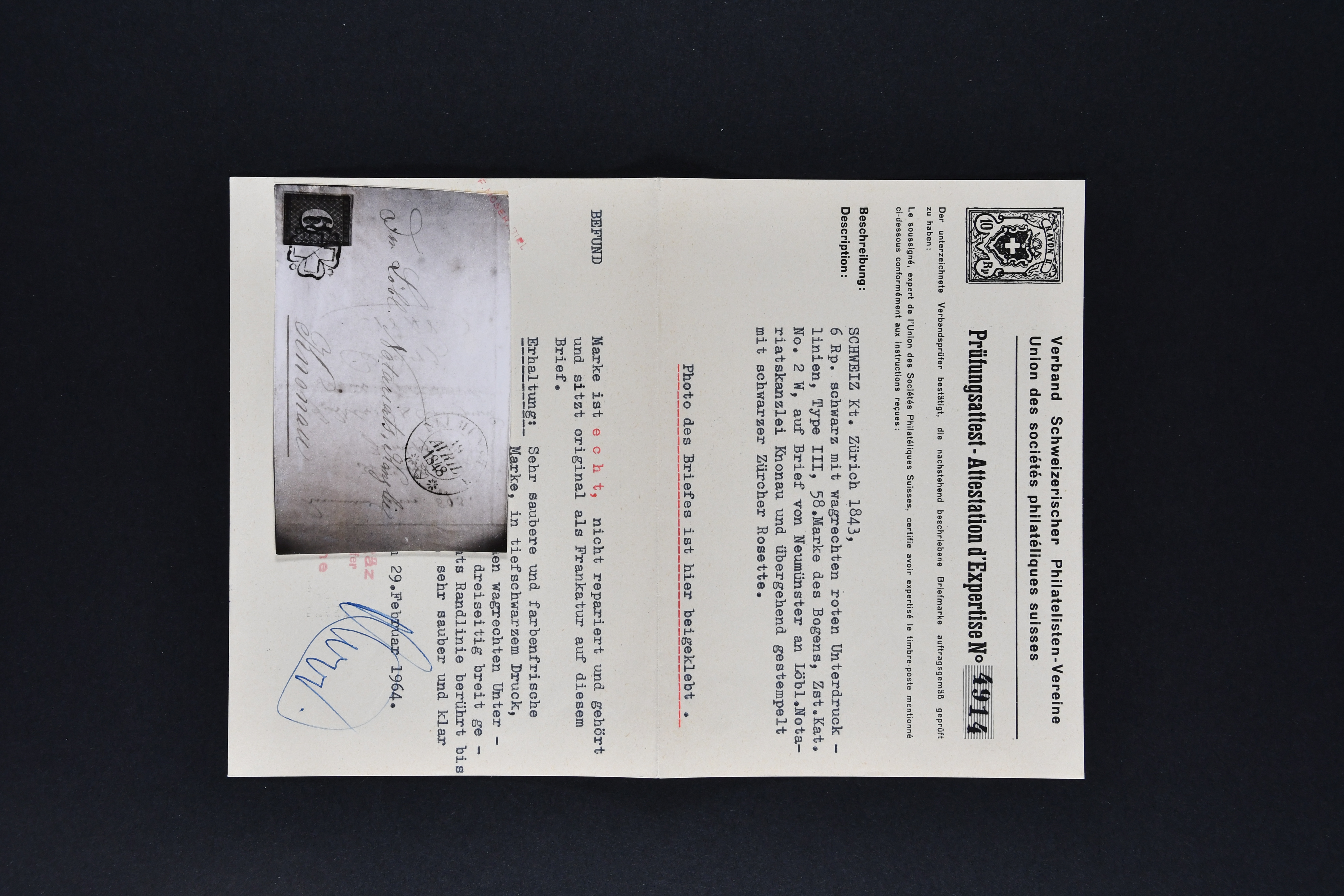 9728 image1843/50: Attraktive Partie fünf Kantonalmarken einzeln, auf Briefstück und auf Brief. Dabei Zürich 6 mit senkr. Unterdrucklinien (SBK 2S), Type II, die 92. Marke des Hunderterbogens, dekorativ entw. mit zartklar und fein ausgeprägter schwarzer Zürcher Rosette (AW 1), Zürich 6 mit waagr. Unterdrucklinien (SBK 1W), Winterthur (SBK 12), Gr. Adler (SBK 6), farbfr. und breit- bis überrandig, klar und übergehend entw. mit roter Genfer Rosette (AW 2) auf Briefstück mit Nebenstempel sowie Waadt 5, klar entw. mit schwarzer Genfer Gitterraute (AW 101) auf kleinformatigem Faltbrief nach Aire-la-Ville. Teils unbedeutende Mängel aber eine sehr schön präsentierende Zusammenstellung; drei Befunde, drei Atteste. SBK=CHF 18'000 (Image 1) (Image 2) (Image 3)