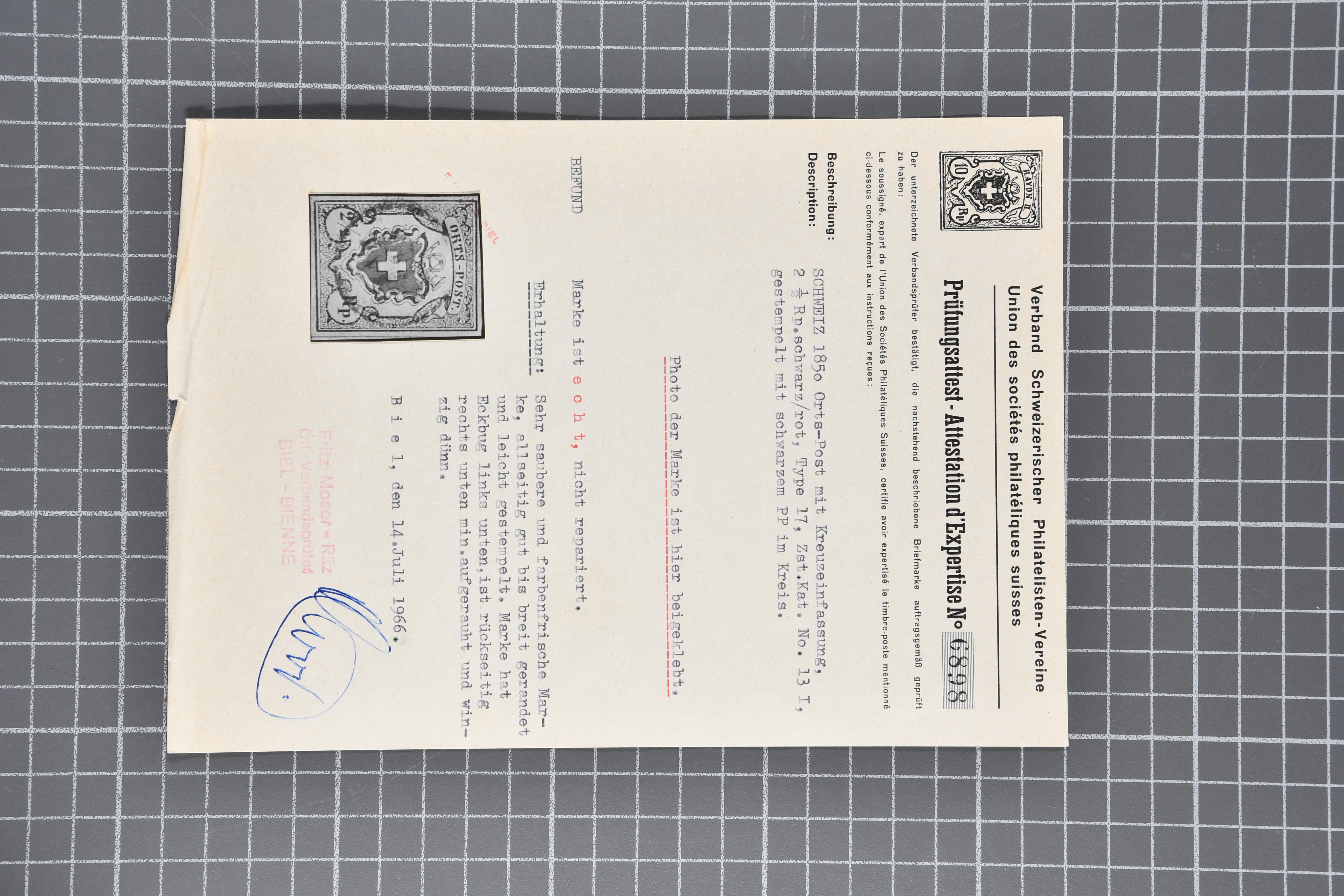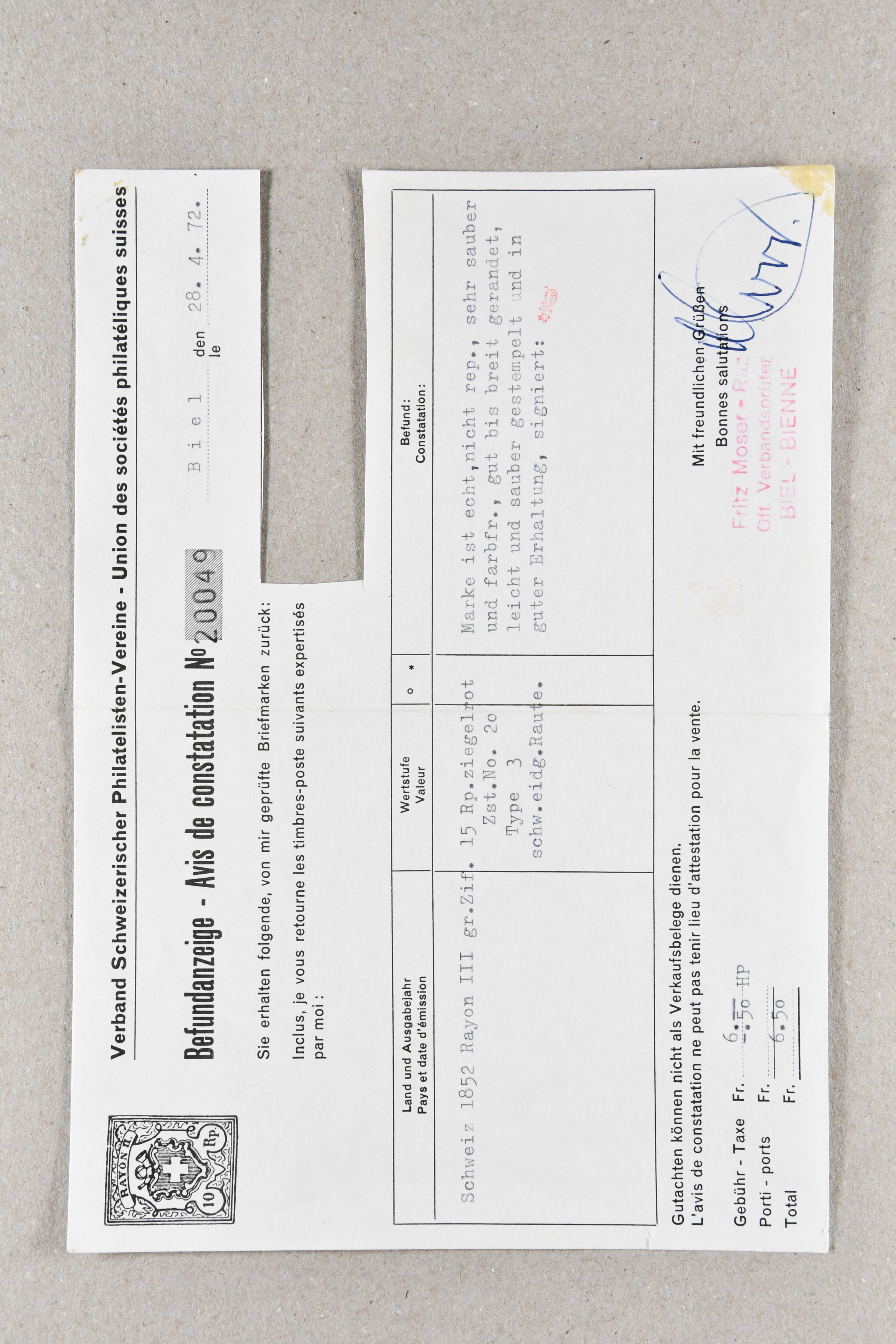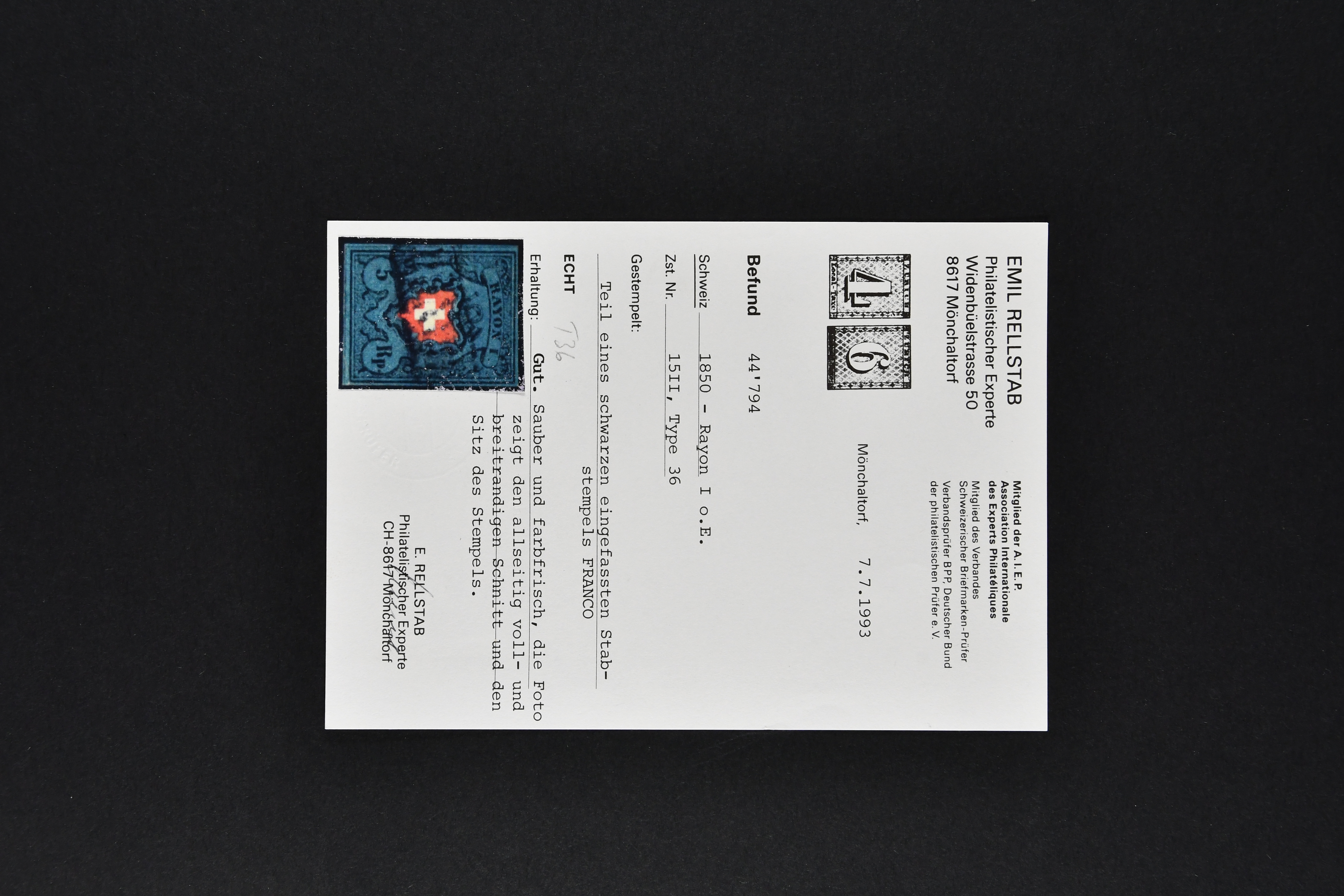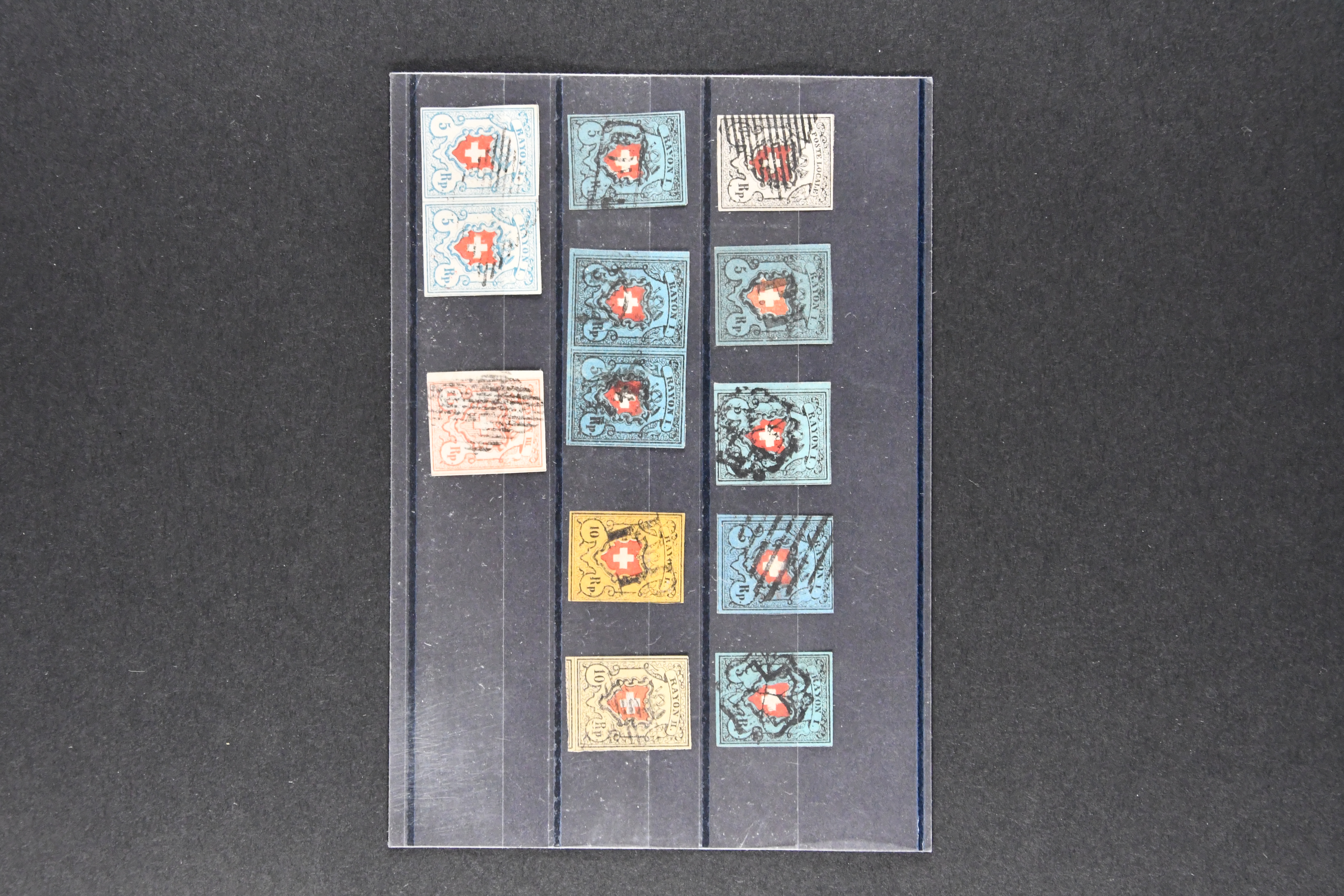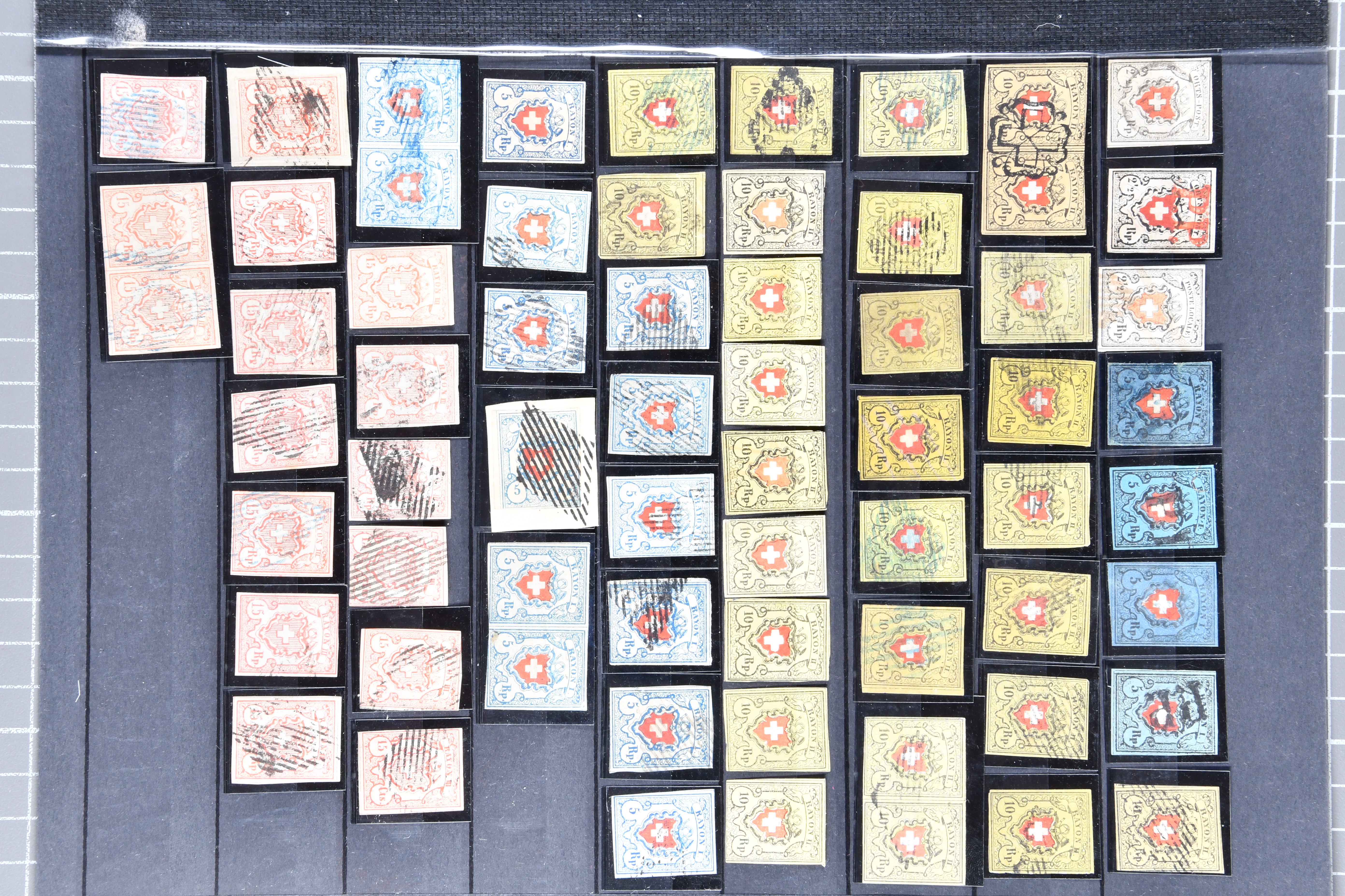9748 image1850/54: Partie 55 Einzelwerte und fünf Paare der Durheim-Ausgaben. Dabei Ortspost mit Kreuzeinfassung (SBK 13/I), Ortspost ohne Kreuzeinfassung (SBK 13/II), Type 32, schön klar und kontrastreich entw. mit wie üblich oberhalb des Kreuzes aufgesetztem rotem "P.P." von Bischofszell (AW 235), Poste Locale mit Kreuzeinfassung (SBK 14/I), Rayon I mit KE (SBK 15/I), drei schöne Rayon I ohne KE (SBK 15/II), Rayon II (28) inkl. einem waagr. Paar, klar, zentrisch und voll aufges. entw. mit nur einem Abschlag der schwarzen Zürcher Rosette (AW 1), Rayon I hellblau (14) inkl. zwei waagr. Paaren, Rayon III, kl. Wertziffer (3), Centimes (4) und gr. Wertziffer (9) inkl. einem waagr. Paar, zart entw. mit zwei Abschlägen der blauen eidg. Raute. Eine gehaltvolle Partie in unterschiedlicher Erhaltung; zwei Atteste Moser/Hunziker. SBK=CHF 31'650 (Image 1) (Image 2) (Image 3)