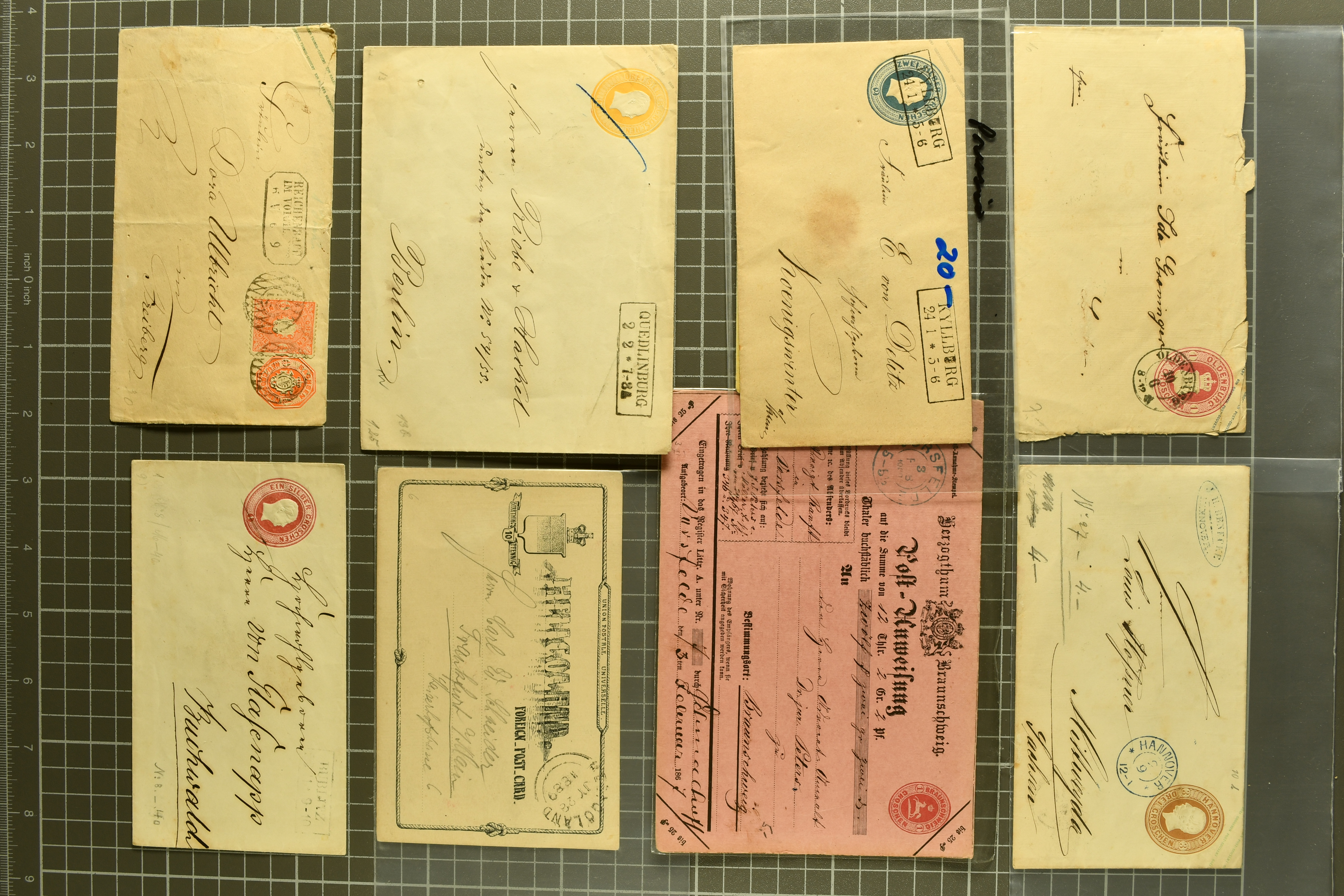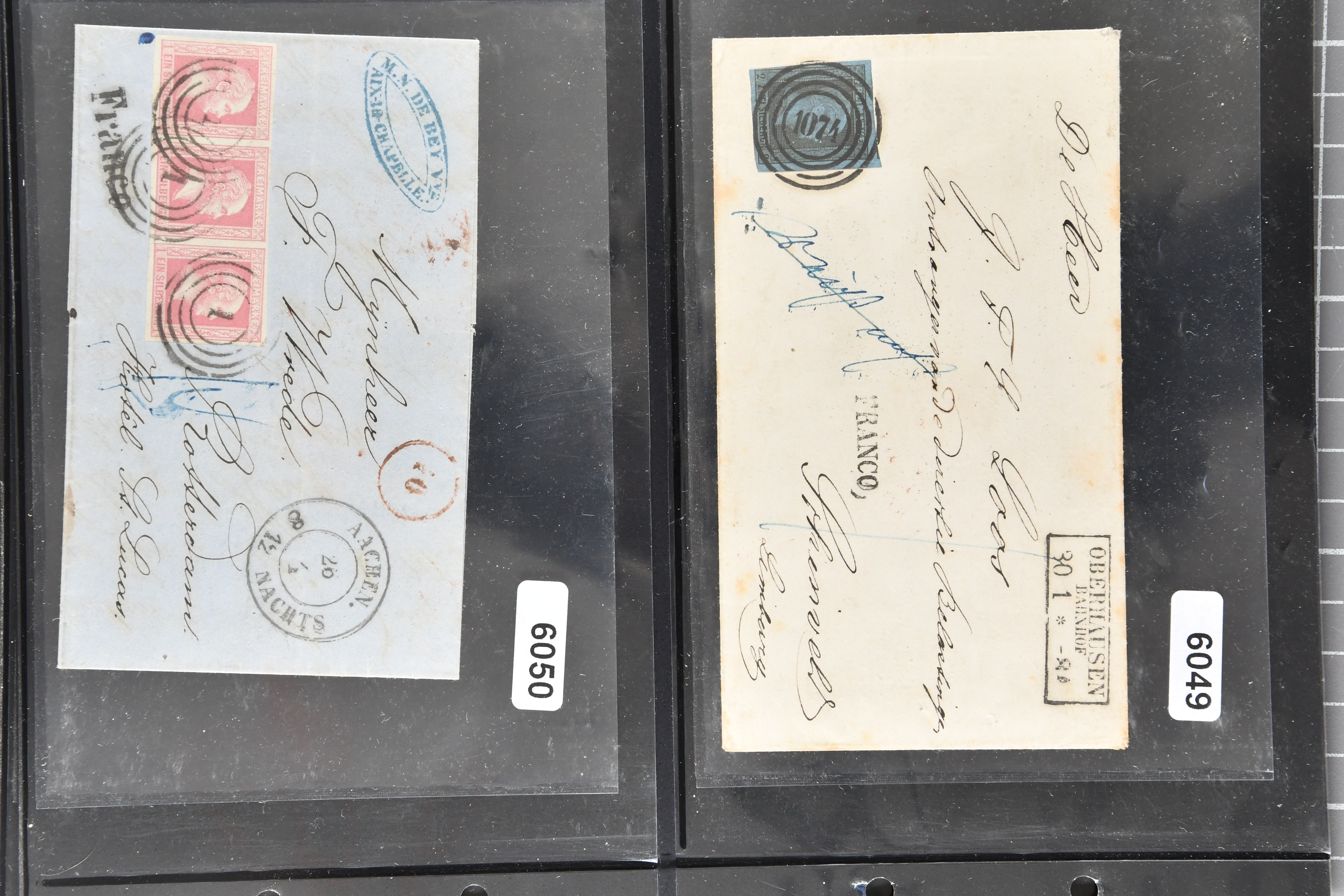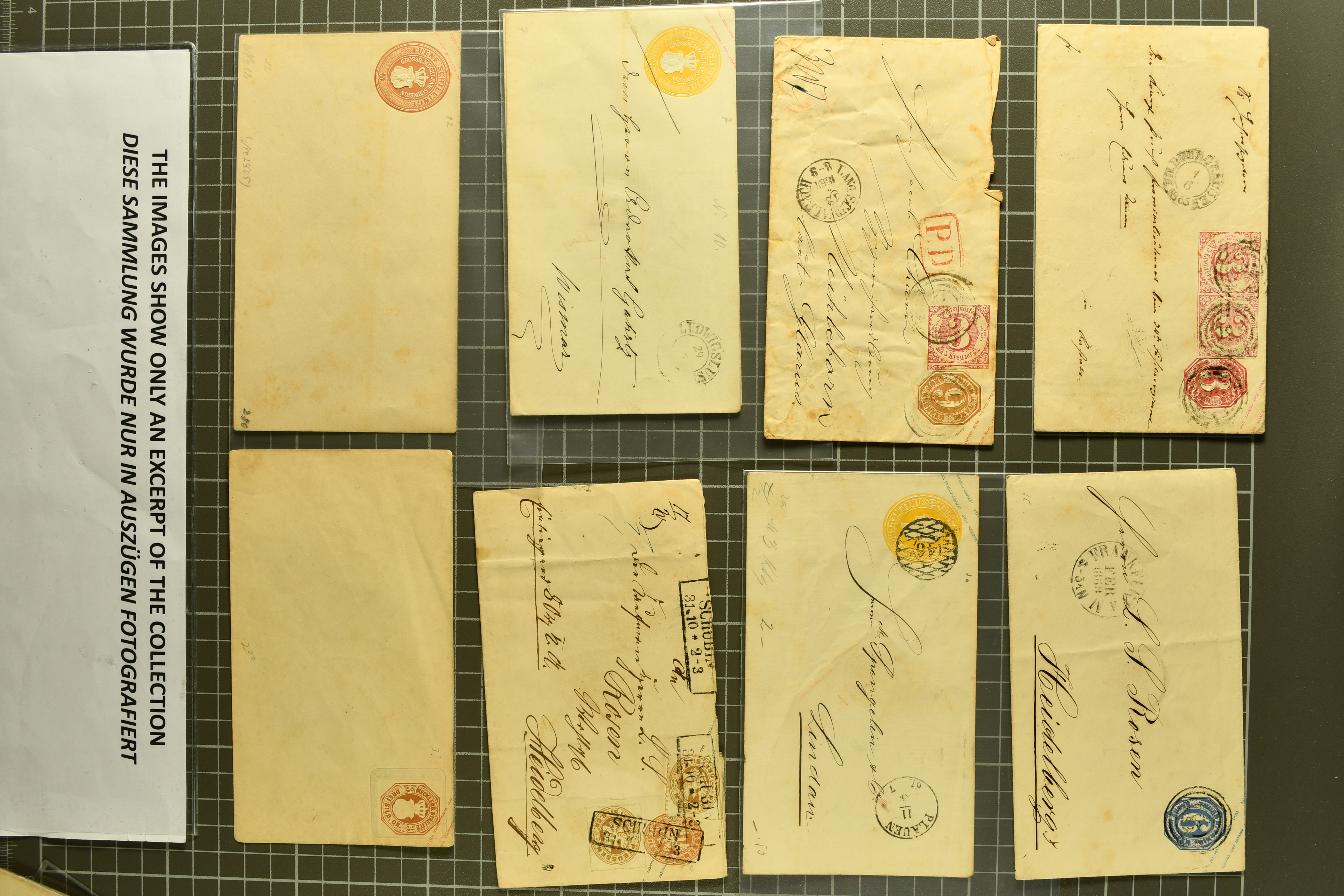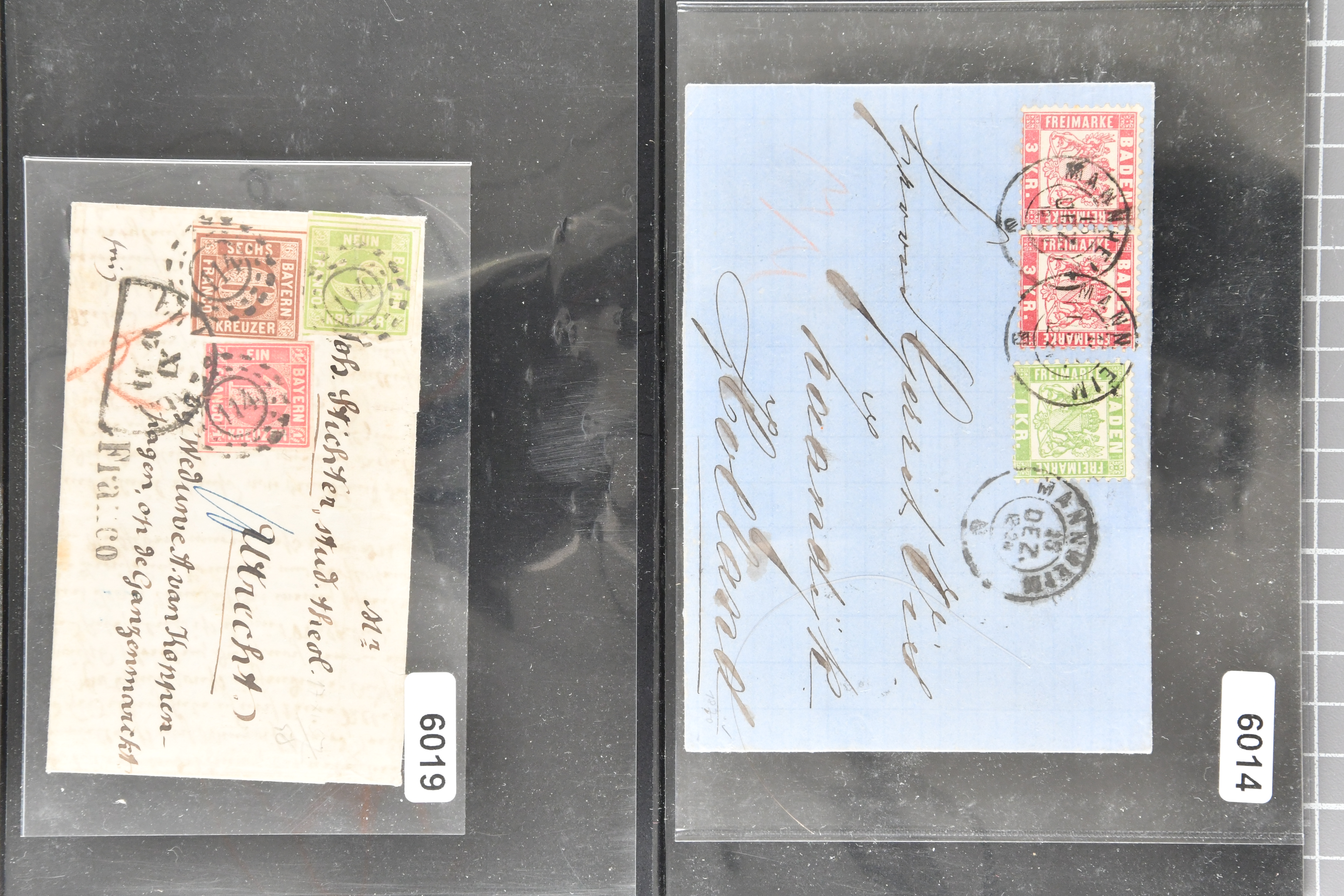 1697 cover image1857/70ca: Lot 12 Briefe aus den altdeutschen Staaten, alle in die Niederlande gelaufen, dabei Baden 1870 Mannheim mit 1868 1 Kr. und Paar 3 Kr.; Bayern 1857 mit 1850/58 1 K., 6 Kr. & 9 Kr. nach Utrecht; Preussen Umschlag mit 1850 2 Sgr. von Oberhausen nach Schinveld bei Sittard. Kreis Limburg, portogerechte Frankatur vom 1. preussischen in den 1. niederländischen Rayon, 1859 Dreierstreifen der 1857 1 Sgr. rosa von Aachen nach Rotterdam, 1859 von Barmen mit 1857 2 Sgr. blau, gerichtet nach Arnheim; Sachsen 1858 mit Johann 5 Ngr. von Waldenburg nach Amsterdam, 1861 mit gleicher Frankatur von Oelsnitz; Thurn & Taxis von Mainz mit Paar 1862/64 6 Kr. hellblau nach Deventer; NDP 1868 Drucksachen-Faltbrief von Emden mit senkrechtem Dreierstreifen der ¼ Groschen, gleicher Tarif aber mit ¼ Gr. & ½ Gr. - Frankatur, 1868 doppelgewichtige Briefhülle von Frankfurt mit 3 Kr. und drei Werten der 7 Kr., 1868 nach der Portoreduktion im neuen Tarif vom Oktober d. J. auf einfachgewichtigem Brief mit Einzelfrankatur der 7 Kr., 1868; weiterhin eingeschriebener Ganzsachen-Brief 1890 des deutschen Postamts in Konstantinopel nach Haarlem mit einer gesamthaften Frankatur von 3 Piastern (Image 1) (Image 2) (Image 3) (Image 4) (Image 5) (Image 6) (Image 7)