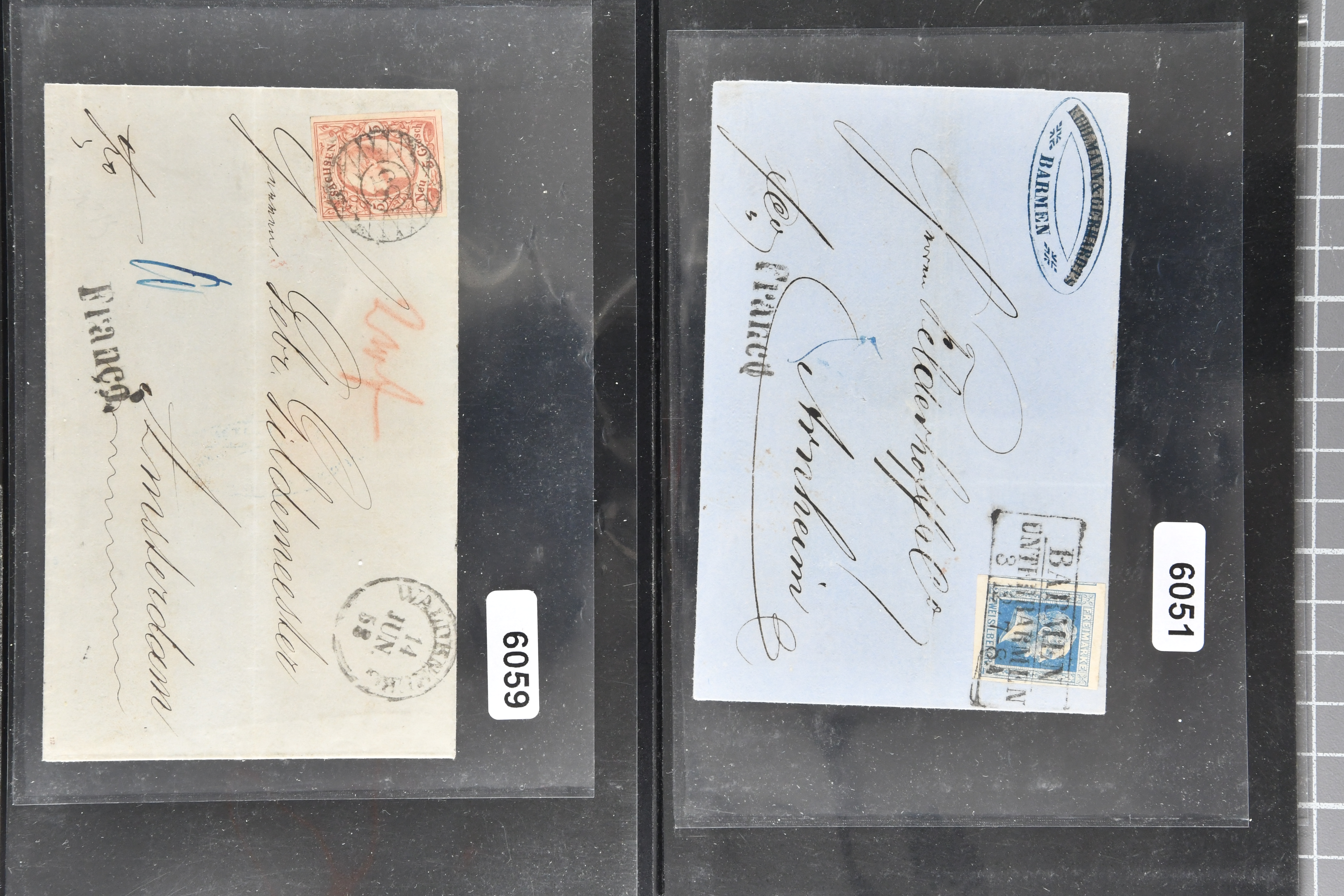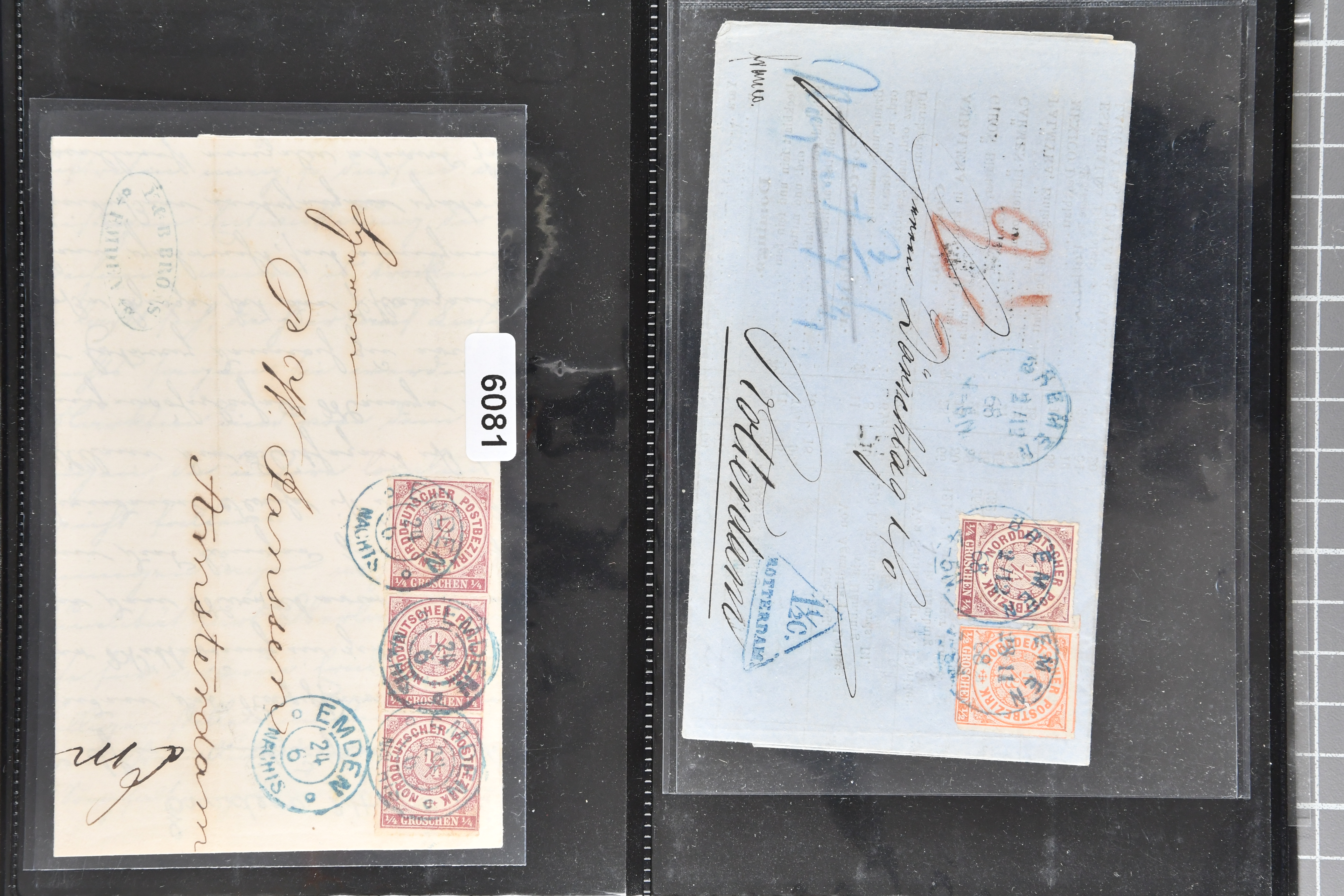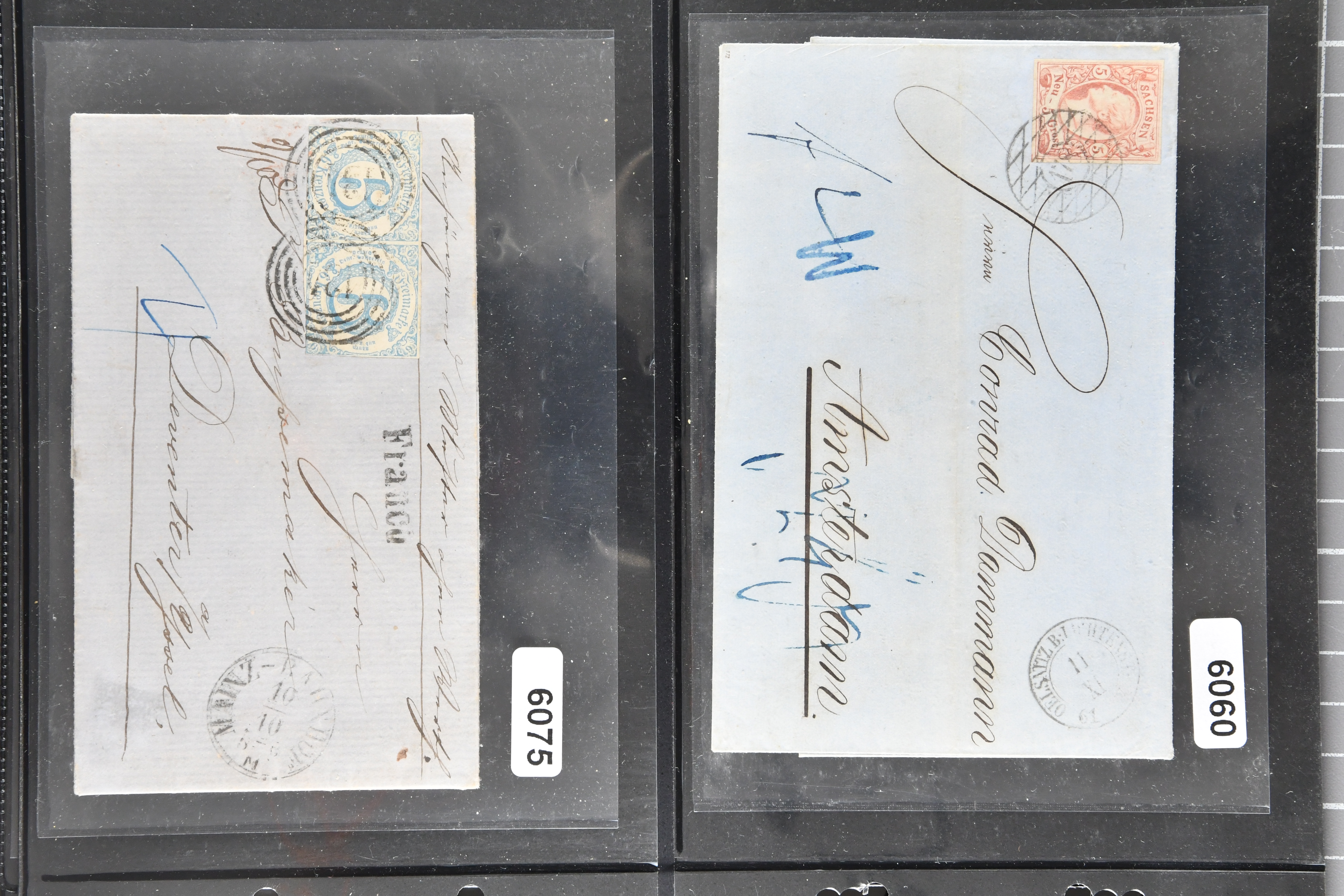 1697 cover image1857/70ca: Lot 12 Briefe aus den altdeutschen Staaten, alle in die Niederlande gelaufen, dabei Baden 1870 Mannheim mit 1868 1 Kr. und Paar 3 Kr.; Bayern 1857 mit 1850/58 1 K., 6 Kr. & 9 Kr. nach Utrecht; Preussen Umschlag mit 1850 2 Sgr. von Oberhausen nach Schinveld bei Sittard. Kreis Limburg, portogerechte Frankatur vom 1. preussischen in den 1. niederländischen Rayon, 1859 Dreierstreifen der 1857 1 Sgr. rosa von Aachen nach Rotterdam, 1859 von Barmen mit 1857 2 Sgr. blau, gerichtet nach Arnheim; Sachsen 1858 mit Johann 5 Ngr. von Waldenburg nach Amsterdam, 1861 mit gleicher Frankatur von Oelsnitz; Thurn & Taxis von Mainz mit Paar 1862/64 6 Kr. hellblau nach Deventer; NDP 1868 Drucksachen-Faltbrief von Emden mit senkrechtem Dreierstreifen der ¼ Groschen, gleicher Tarif aber mit ¼ Gr. & ½ Gr. - Frankatur, 1868 doppelgewichtige Briefhülle von Frankfurt mit 3 Kr. und drei Werten der 7 Kr., 1868 nach der Portoreduktion im neuen Tarif vom Oktober d. J. auf einfachgewichtigem Brief mit Einzelfrankatur der 7 Kr., 1868; weiterhin eingeschriebener Ganzsachen-Brief 1890 des deutschen Postamts in Konstantinopel nach Haarlem mit einer gesamthaften Frankatur von 3 Piastern (Image 1) (Image 2) (Image 3) (Image 4) (Image 5) (Image 6) (Image 7)