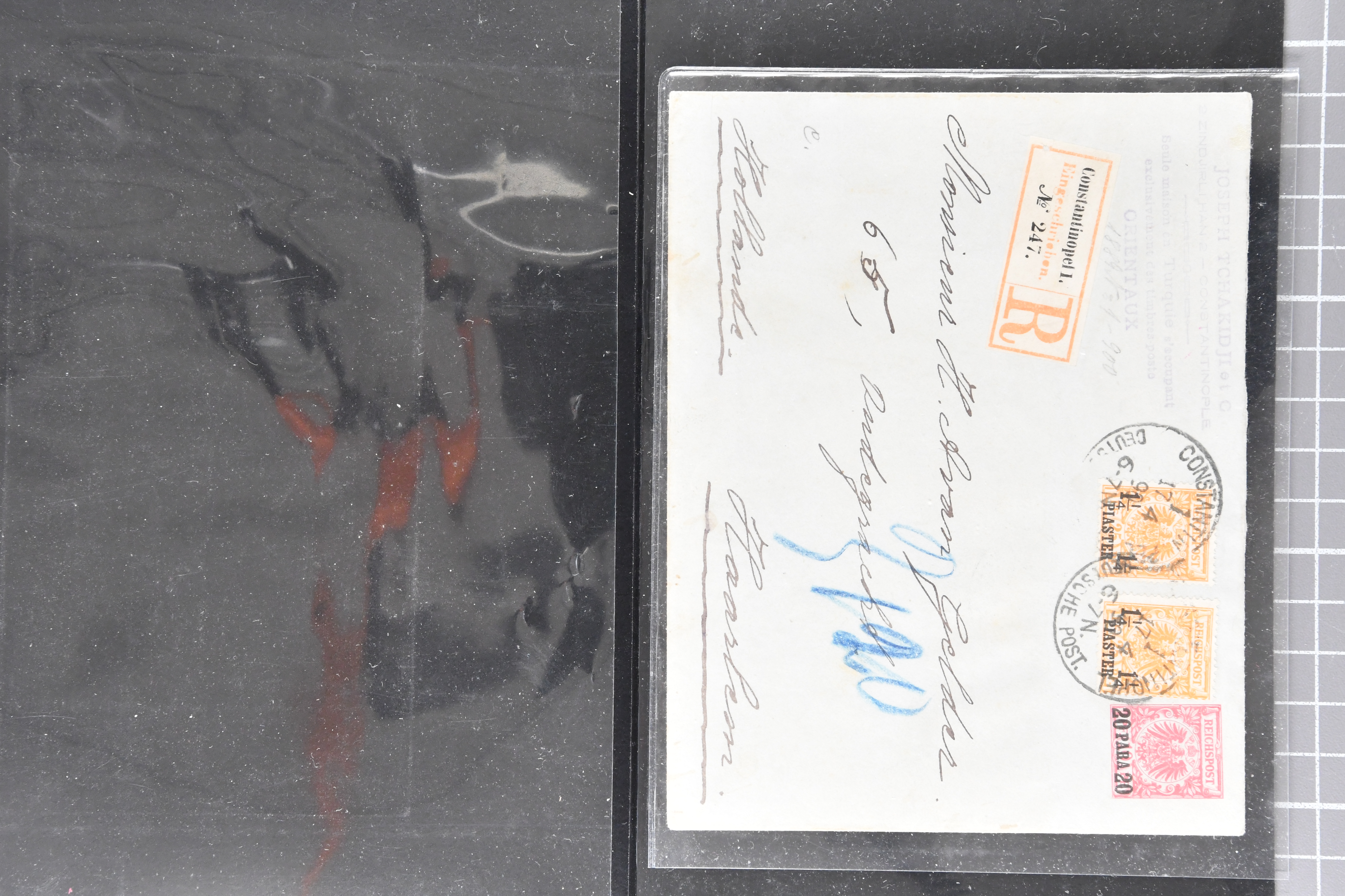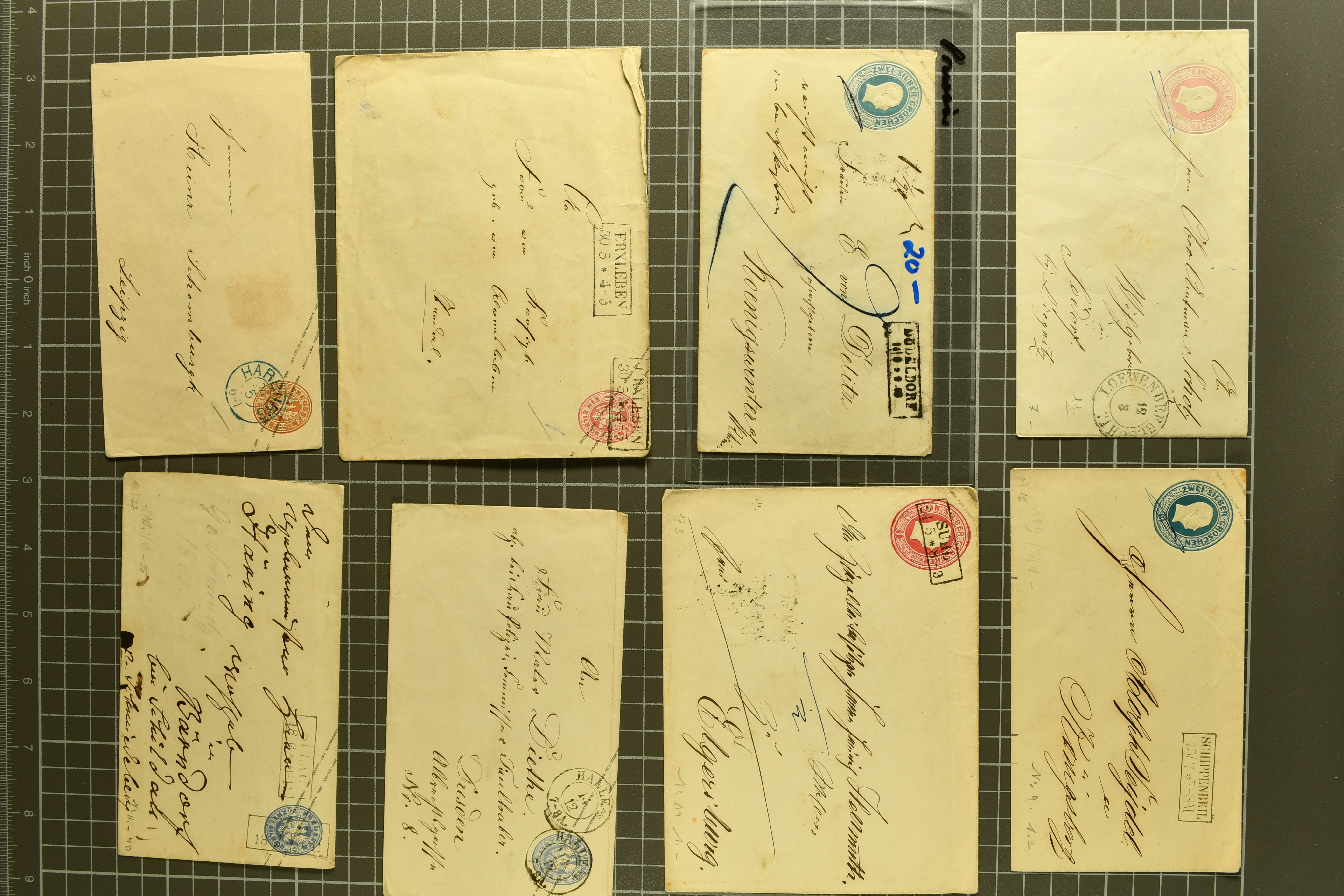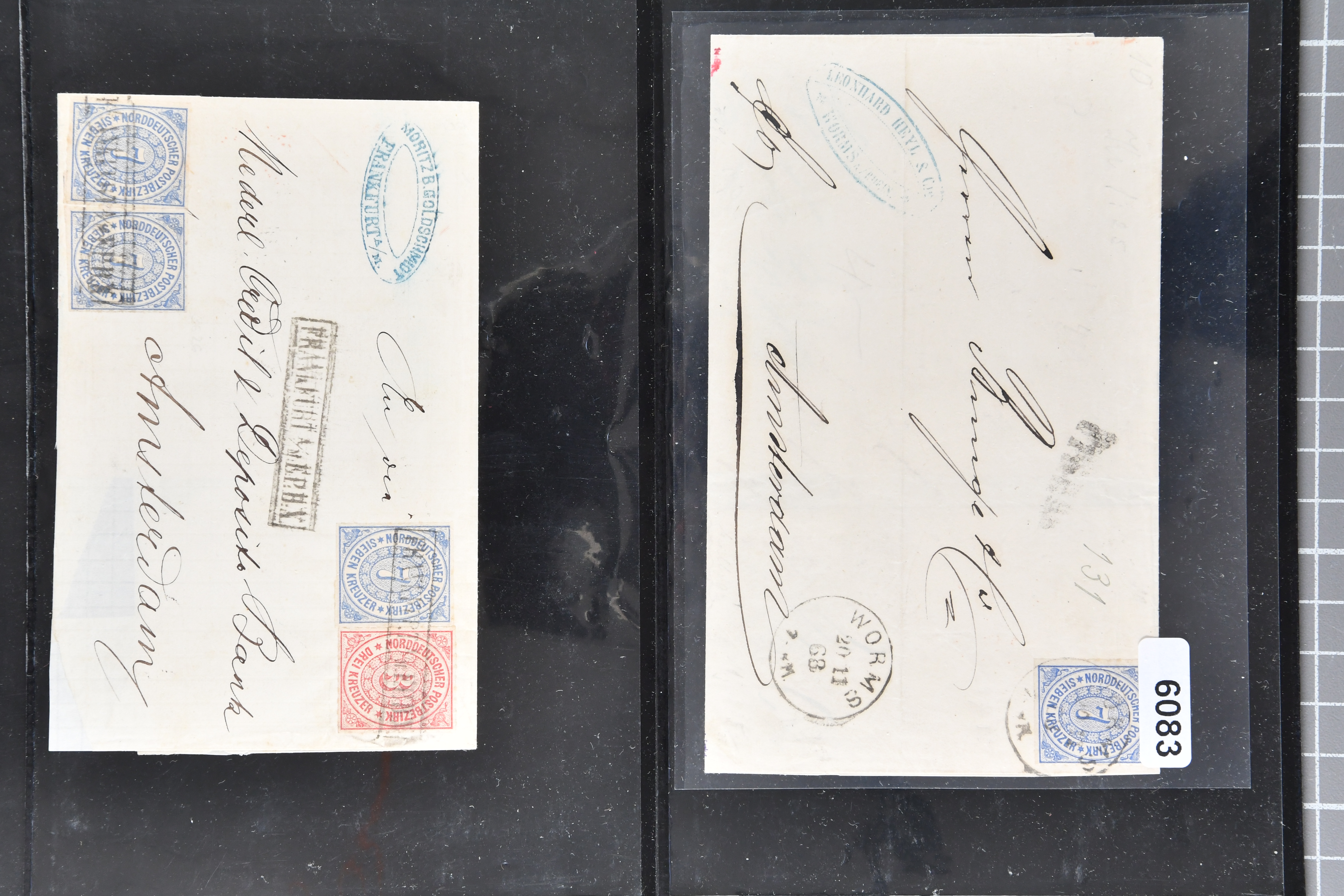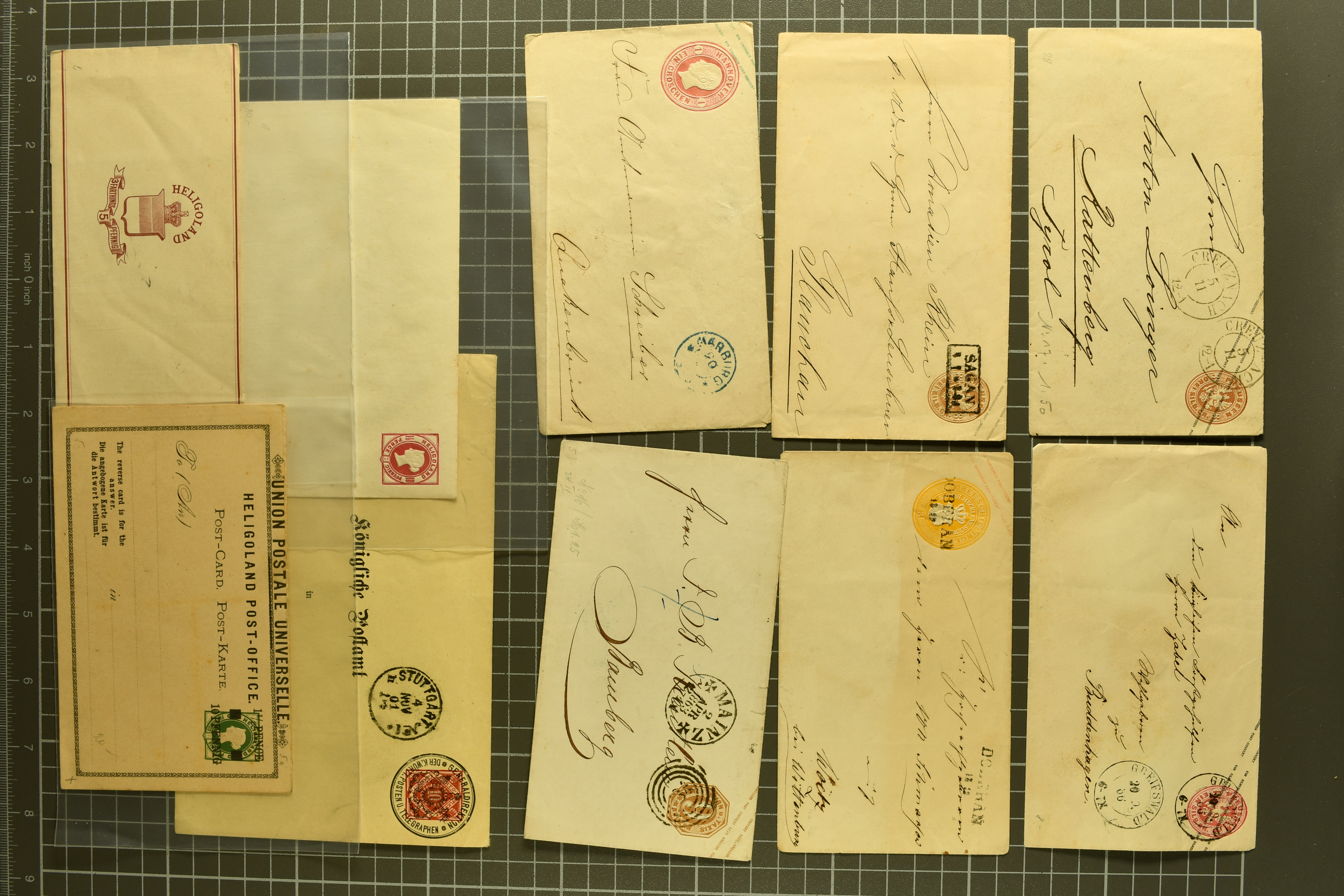 1697 cover image1857/70ca: Lot 12 Briefe aus den altdeutschen Staaten, alle in die Niederlande gelaufen, dabei Baden 1870 Mannheim mit 1868 1 Kr. und Paar 3 Kr.; Bayern 1857 mit 1850/58 1 K., 6 Kr. & 9 Kr. nach Utrecht; Preussen Umschlag mit 1850 2 Sgr. von Oberhausen nach Schinveld bei Sittard. Kreis Limburg, portogerechte Frankatur vom 1. preussischen in den 1. niederländischen Rayon, 1859 Dreierstreifen der 1857 1 Sgr. rosa von Aachen nach Rotterdam, 1859 von Barmen mit 1857 2 Sgr. blau, gerichtet nach Arnheim; Sachsen 1858 mit Johann 5 Ngr. von Waldenburg nach Amsterdam, 1861 mit gleicher Frankatur von Oelsnitz; Thurn & Taxis von Mainz mit Paar 1862/64 6 Kr. hellblau nach Deventer; NDP 1868 Drucksachen-Faltbrief von Emden mit senkrechtem Dreierstreifen der ¼ Groschen, gleicher Tarif aber mit ¼ Gr. & ½ Gr. - Frankatur, 1868 doppelgewichtige Briefhülle von Frankfurt mit 3 Kr. und drei Werten der 7 Kr., 1868 nach der Portoreduktion im neuen Tarif vom Oktober d. J. auf einfachgewichtigem Brief mit Einzelfrankatur der 7 Kr., 1868; weiterhin eingeschriebener Ganzsachen-Brief 1890 des deutschen Postamts in Konstantinopel nach Haarlem mit einer gesamthaften Frankatur von 3 Piastern (Image 1) (Image 2) (Image 3) (Image 4) (Image 5) (Image 6) (Image 7)