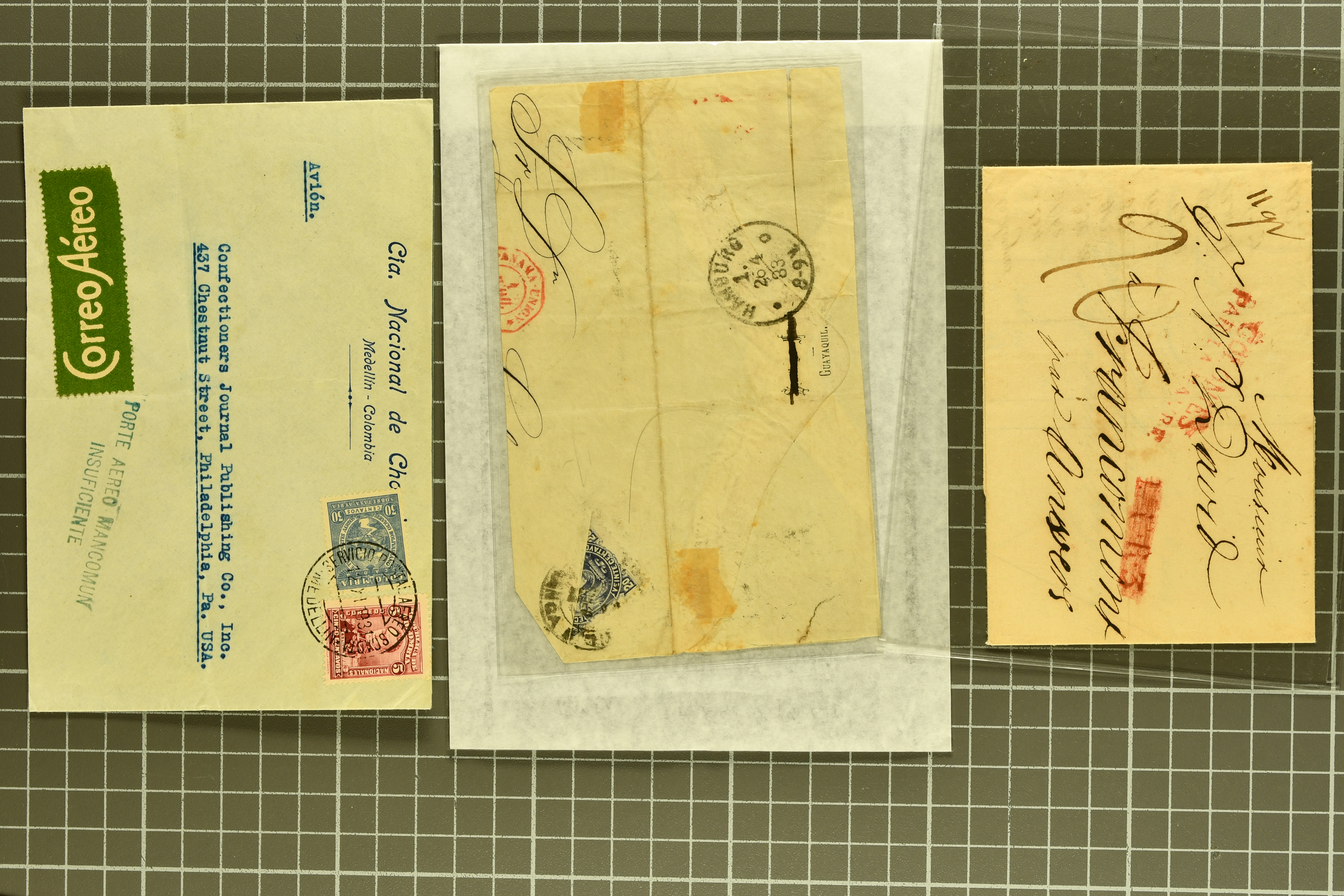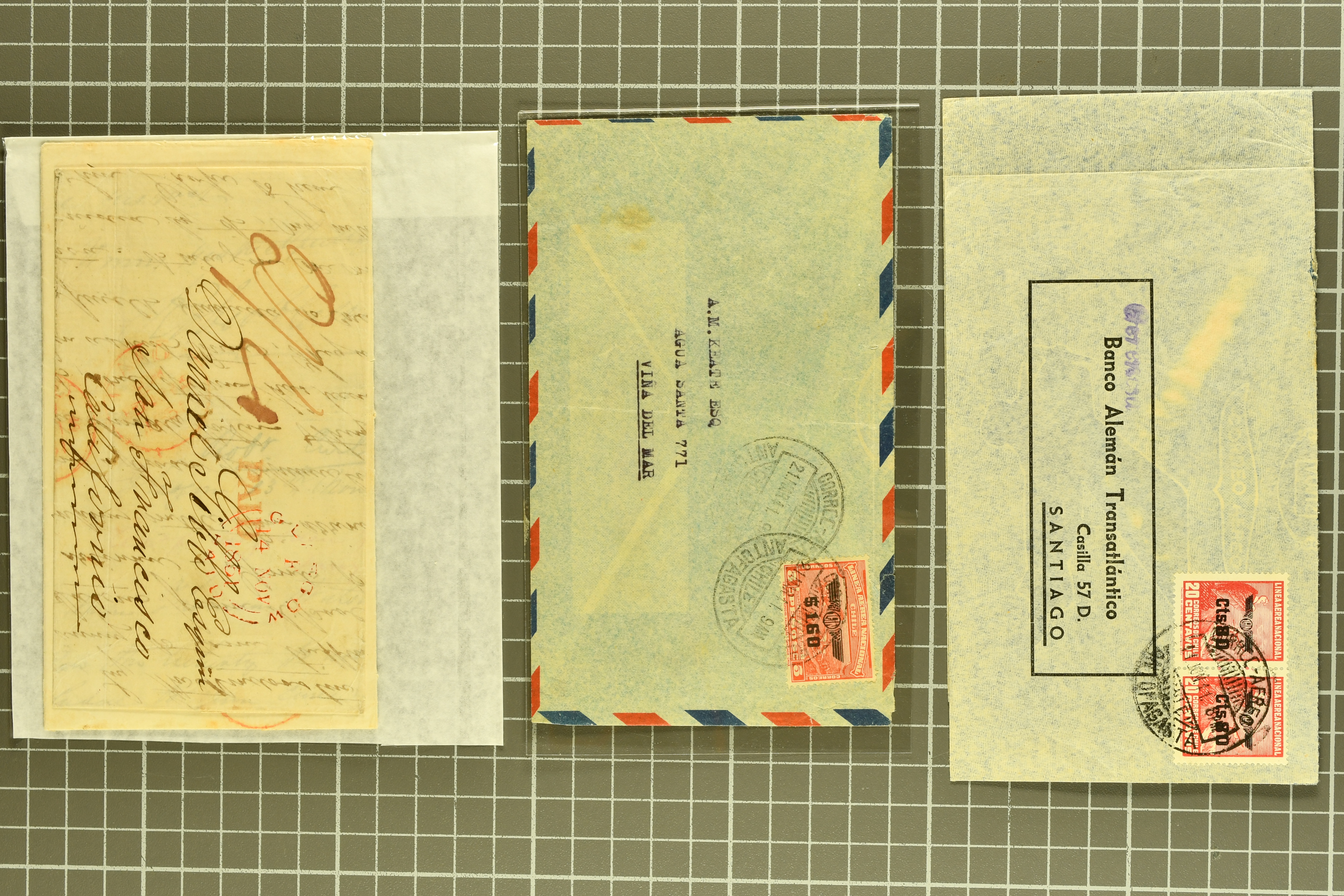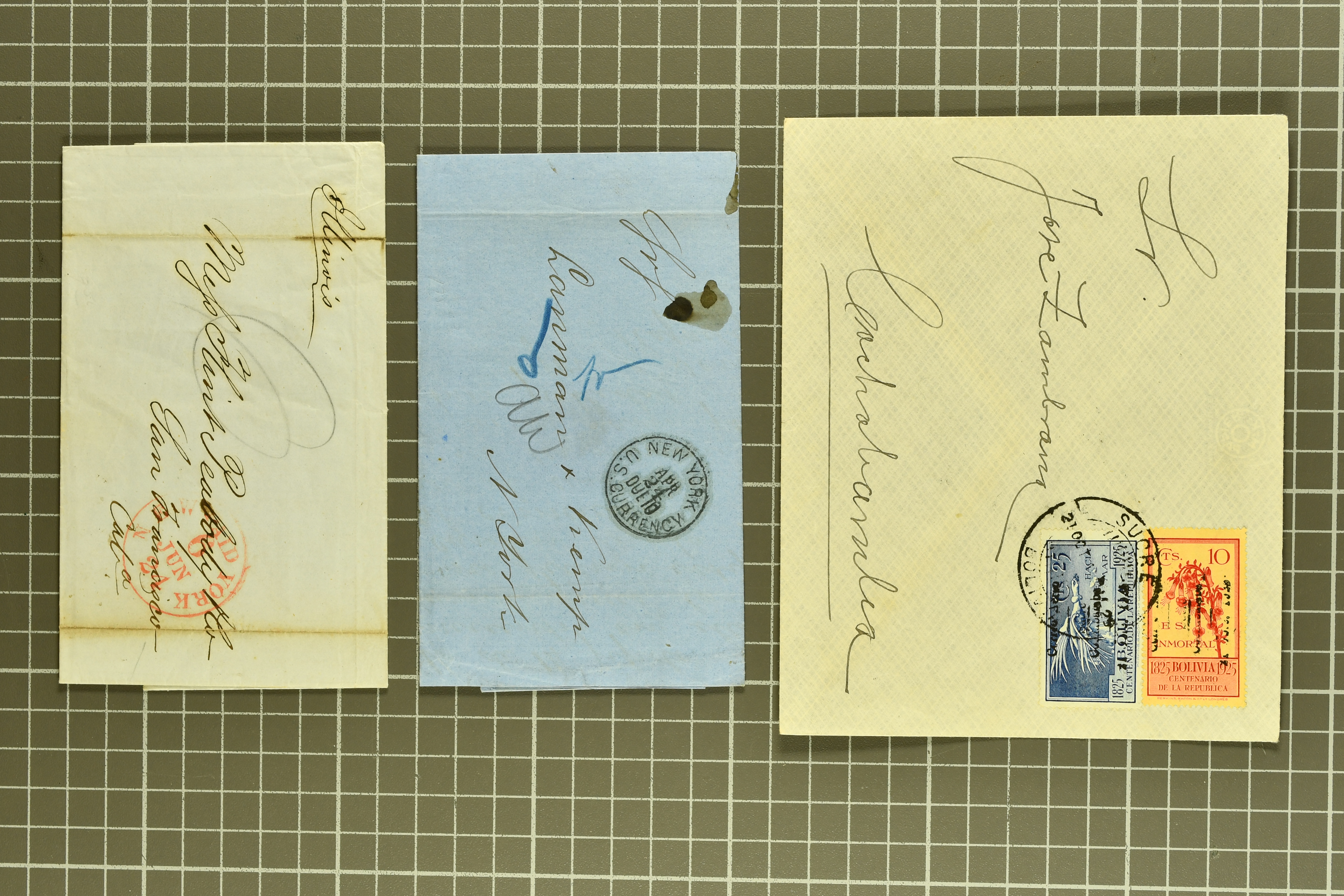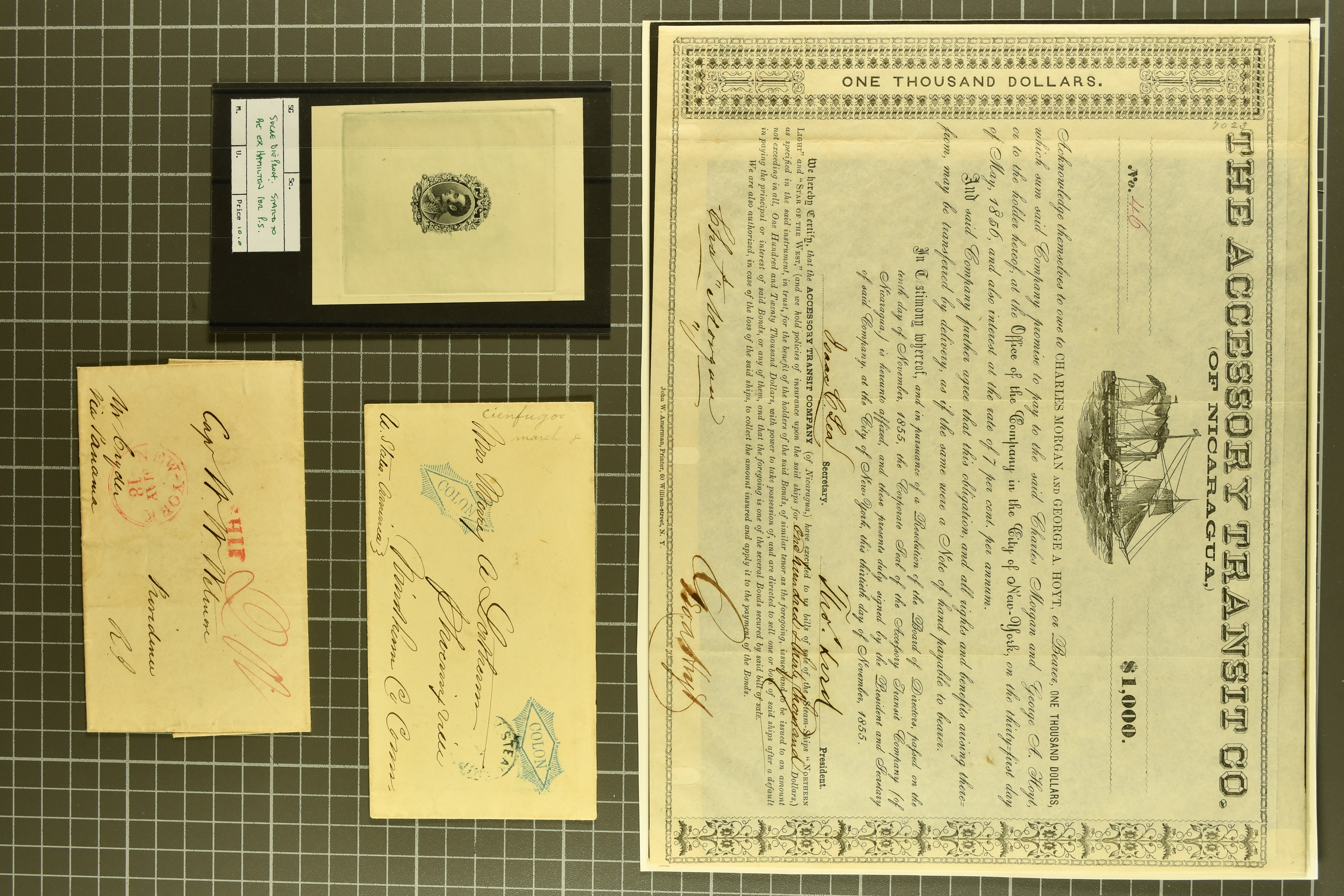 1468 cover image1791/1950c.: A very diverse selection with "Papel Sellado" handstamped letter from El Rosario, Nicaragua, 1855 $ 1'000 Bond in the "Accessory Transit Co. of Nicaragua" signed by Charles Morgan with fine steamer vignette, 1850 and 1851 covers prepaid from Glasgow to San Francisco, 1865 Honduras first issue complete sheets, 1874 entire from Buga, Colombia to New York with two Forwarding Agent cachets on reverse; 1941 covers (3) each with scarce "U.S. POSTAL AGENCY, CALI, COLOMBIA" datestamps on reverse, rare 1927 Guatemala - Honduras flight cover delayed due to crash, Colombia 1927 cover with Scadta issues and Santander 4 c. green on yellow, 1928 cover with Scadta 40 c. violet bisected and a 1931 Zeppelin cover, Bolivia 1924 First Flight Sucre - Cochabamba cover, Chile 1941 airmail covers (13) at $ 1.60 rates from Antofagusta to Santiago, Die Proofs (3) featuring birds two probably ex Banknotes, viewing is recommended (Image 1) (Image 2) (Image 3) (Image 4) (Image 5) (Image 6) (Image 7) (Image 8) (Image 9) (Image 10) (Image 11) (Image 12) (Image 13) (Image 14) (Image 15) (Image 16) (Image 17) (Image 18) (Image 19) (Image 20)