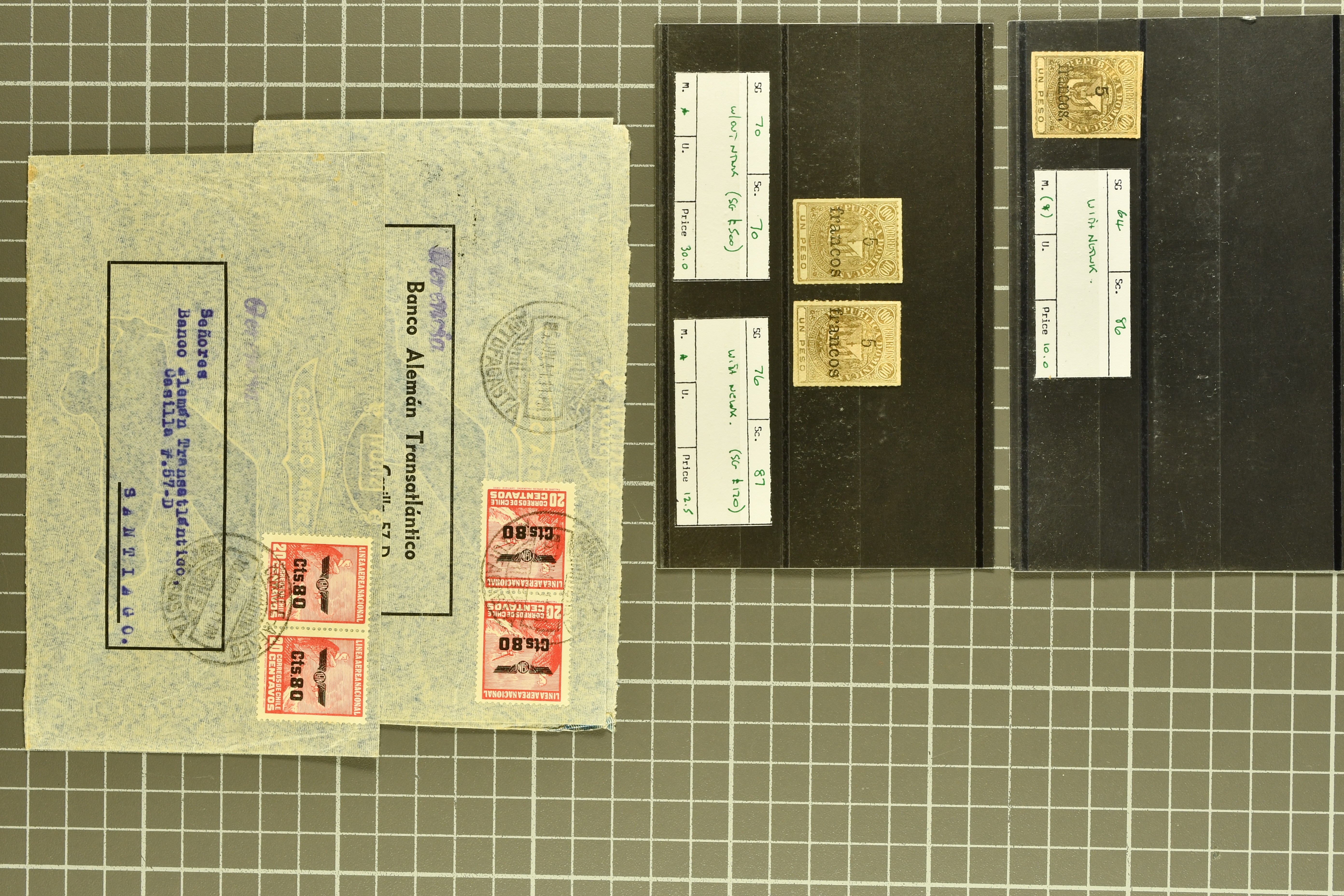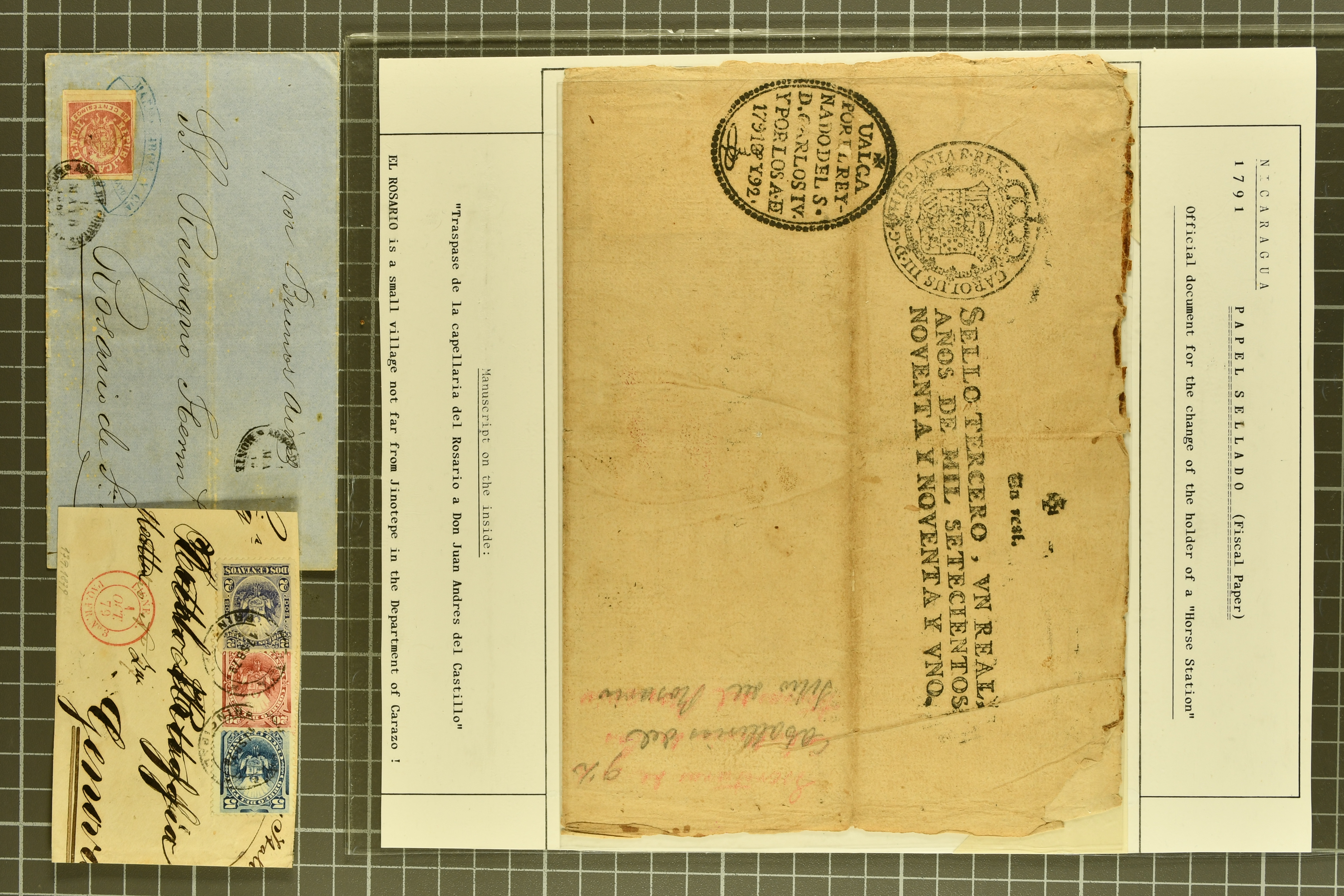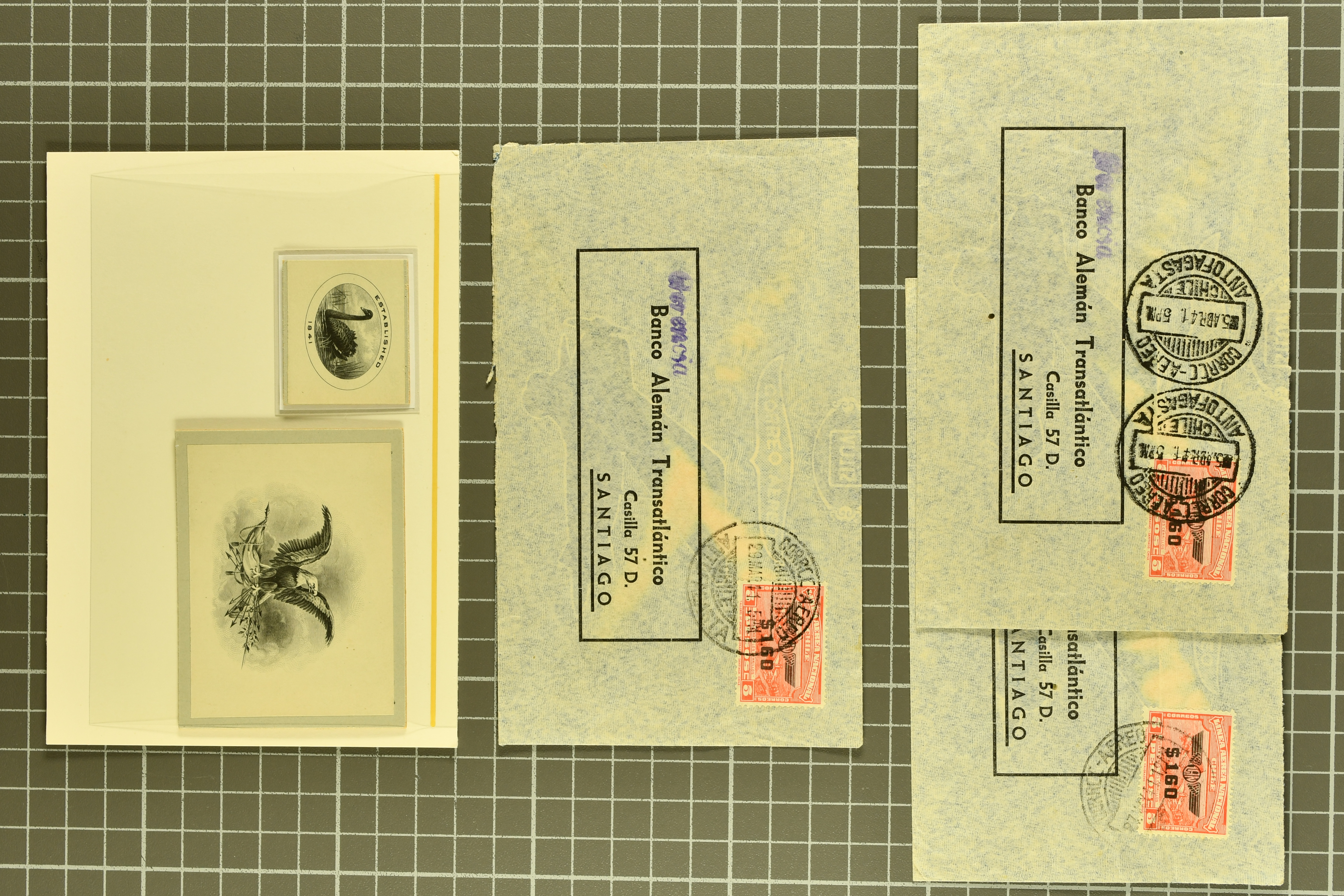 1468 cover image1791/1950c.: A very diverse selection with "Papel Sellado" handstamped letter from El Rosario, Nicaragua, 1855 $ 1'000 Bond in the "Accessory Transit Co. of Nicaragua" signed by Charles Morgan with fine steamer vignette, 1850 and 1851 covers prepaid from Glasgow to San Francisco, 1865 Honduras first issue complete sheets, 1874 entire from Buga, Colombia to New York with two Forwarding Agent cachets on reverse; 1941 covers (3) each with scarce "U.S. POSTAL AGENCY, CALI, COLOMBIA" datestamps on reverse, rare 1927 Guatemala - Honduras flight cover delayed due to crash, Colombia 1927 cover with Scadta issues and Santander 4 c. green on yellow, 1928 cover with Scadta 40 c. violet bisected and a 1931 Zeppelin cover, Bolivia 1924 First Flight Sucre - Cochabamba cover, Chile 1941 airmail covers (13) at $ 1.60 rates from Antofagusta to Santiago, Die Proofs (3) featuring birds two probably ex Banknotes, viewing is recommended (Image 1) (Image 2) (Image 3) (Image 4) (Image 5) (Image 6) (Image 7) (Image 8) (Image 9) (Image 10) (Image 11) (Image 12) (Image 13) (Image 14) (Image 15) (Image 16) (Image 17) (Image 18) (Image 19) (Image 20)