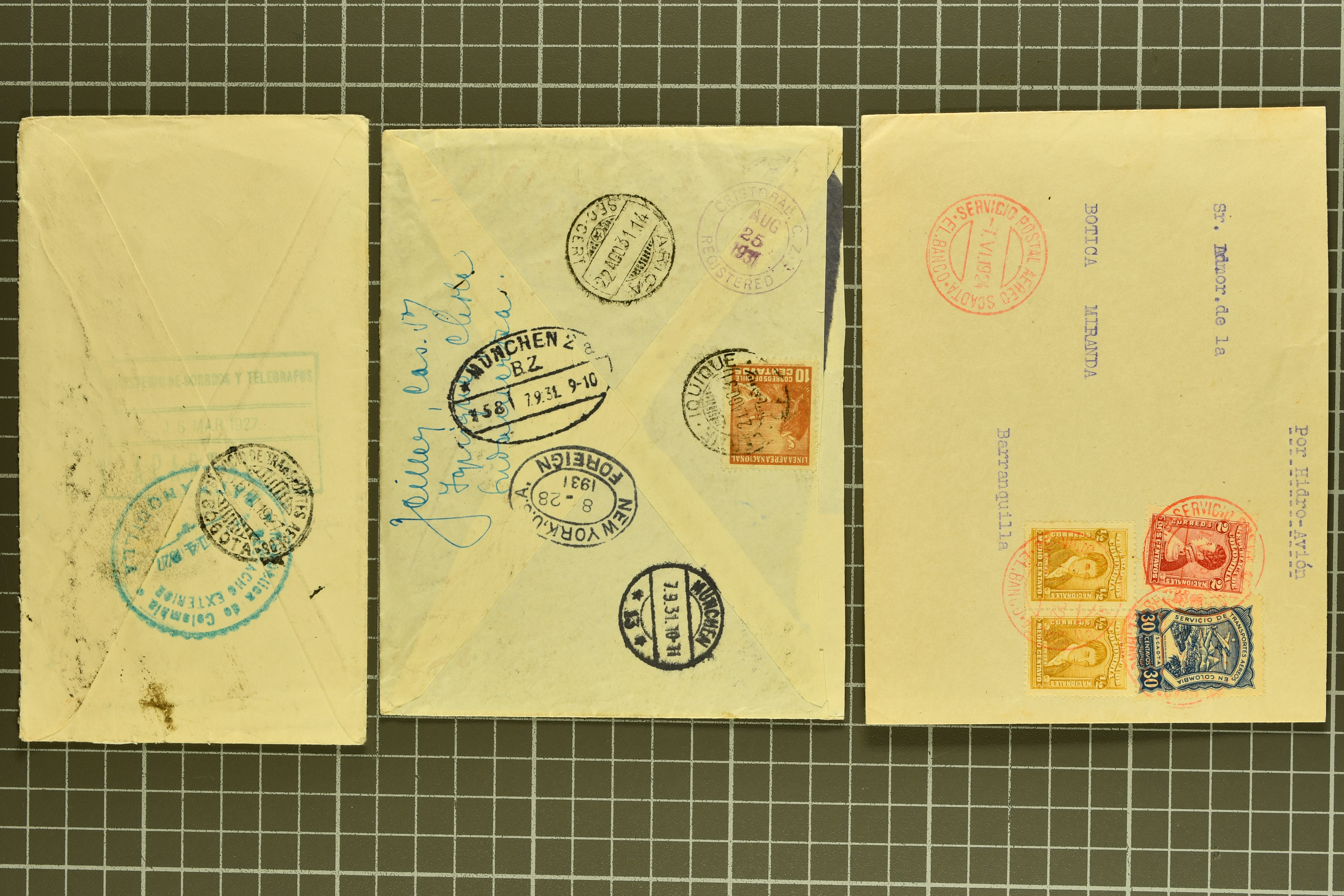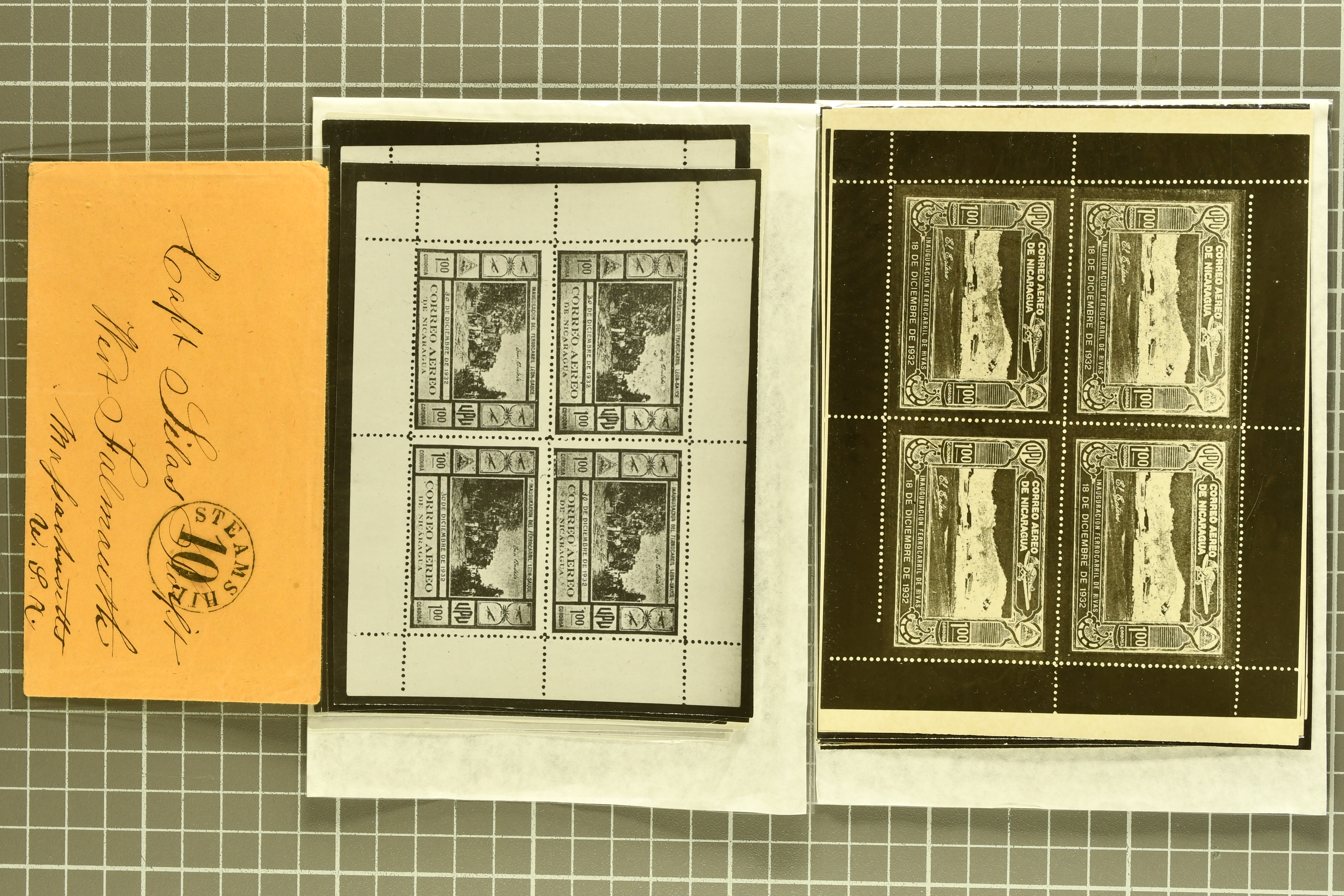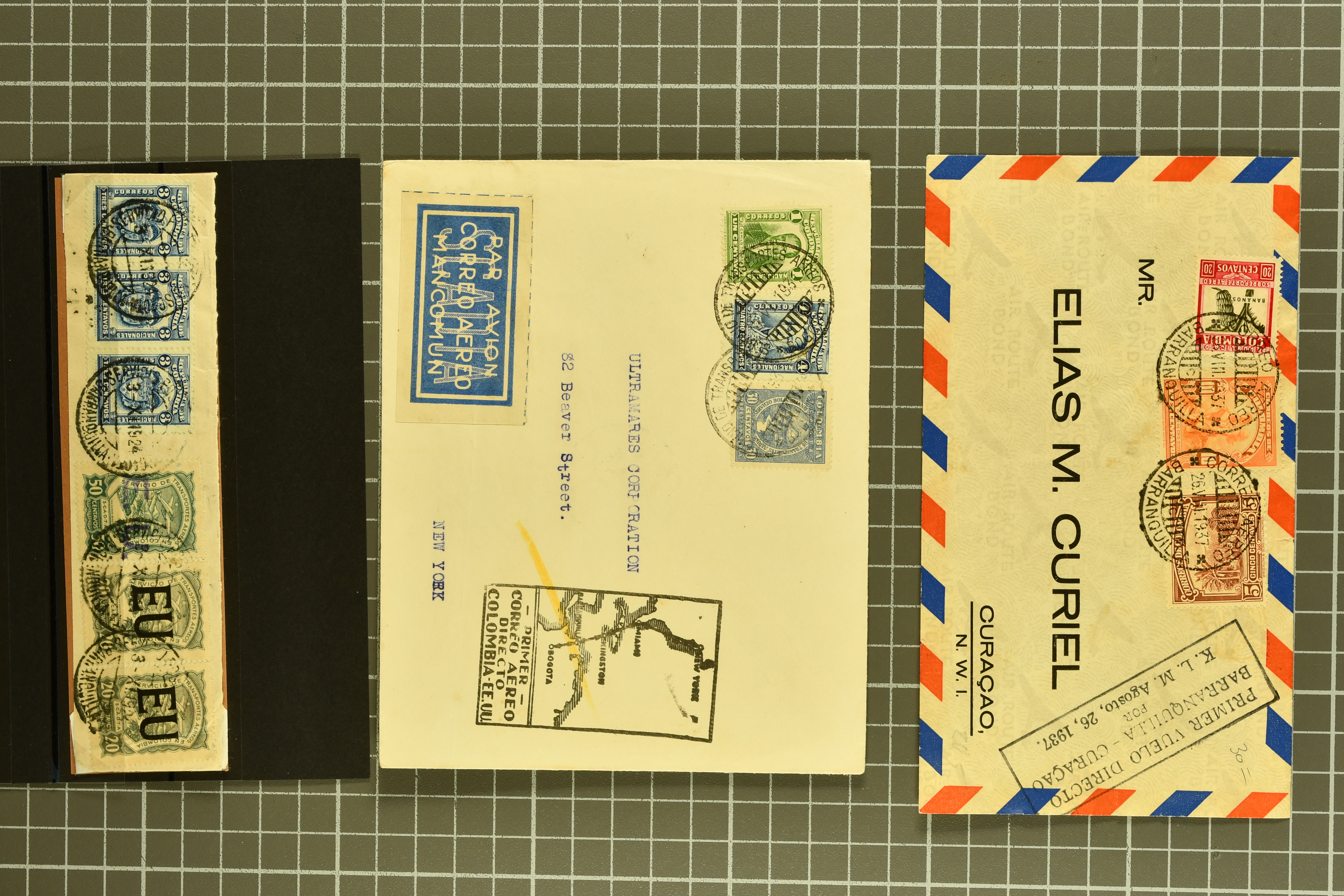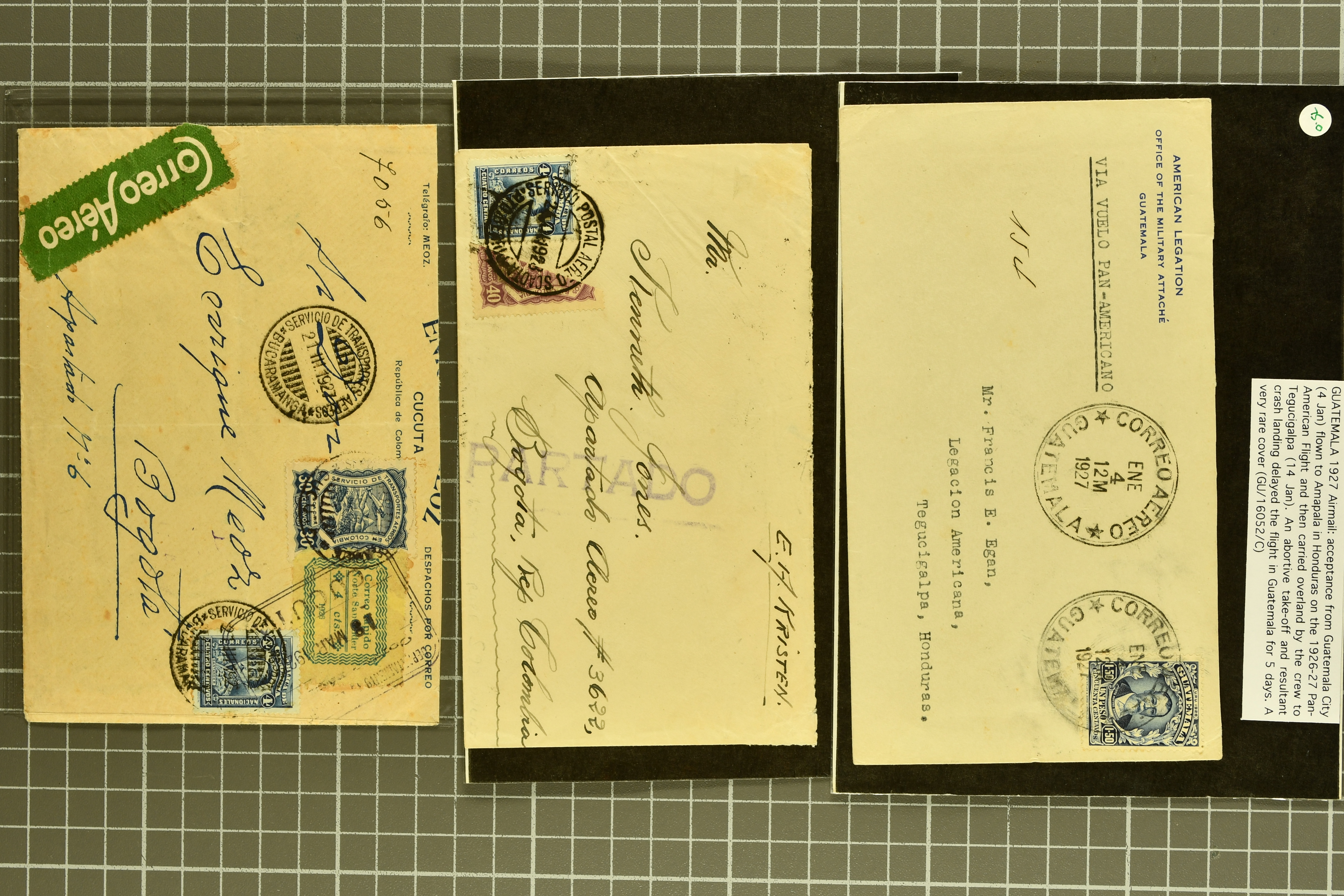 1468 cover image1791/1950c.: A very diverse selection with "Papel Sellado" handstamped letter from El Rosario, Nicaragua, 1855 $ 1'000 Bond in the "Accessory Transit Co. of Nicaragua" signed by Charles Morgan with fine steamer vignette, 1850 and 1851 covers prepaid from Glasgow to San Francisco, 1865 Honduras first issue complete sheets, 1874 entire from Buga, Colombia to New York with two Forwarding Agent cachets on reverse; 1941 covers (3) each with scarce "U.S. POSTAL AGENCY, CALI, COLOMBIA" datestamps on reverse, rare 1927 Guatemala - Honduras flight cover delayed due to crash, Colombia 1927 cover with Scadta issues and Santander 4 c. green on yellow, 1928 cover with Scadta 40 c. violet bisected and a 1931 Zeppelin cover, Bolivia 1924 First Flight Sucre - Cochabamba cover, Chile 1941 airmail covers (13) at $ 1.60 rates from Antofagusta to Santiago, Die Proofs (3) featuring birds two probably ex Banknotes, viewing is recommended (Image 1) (Image 2) (Image 3) (Image 4) (Image 5) (Image 6) (Image 7) (Image 8) (Image 9) (Image 10) (Image 11) (Image 12) (Image 13) (Image 14) (Image 15) (Image 16) (Image 17) (Image 18) (Image 19) (Image 20)