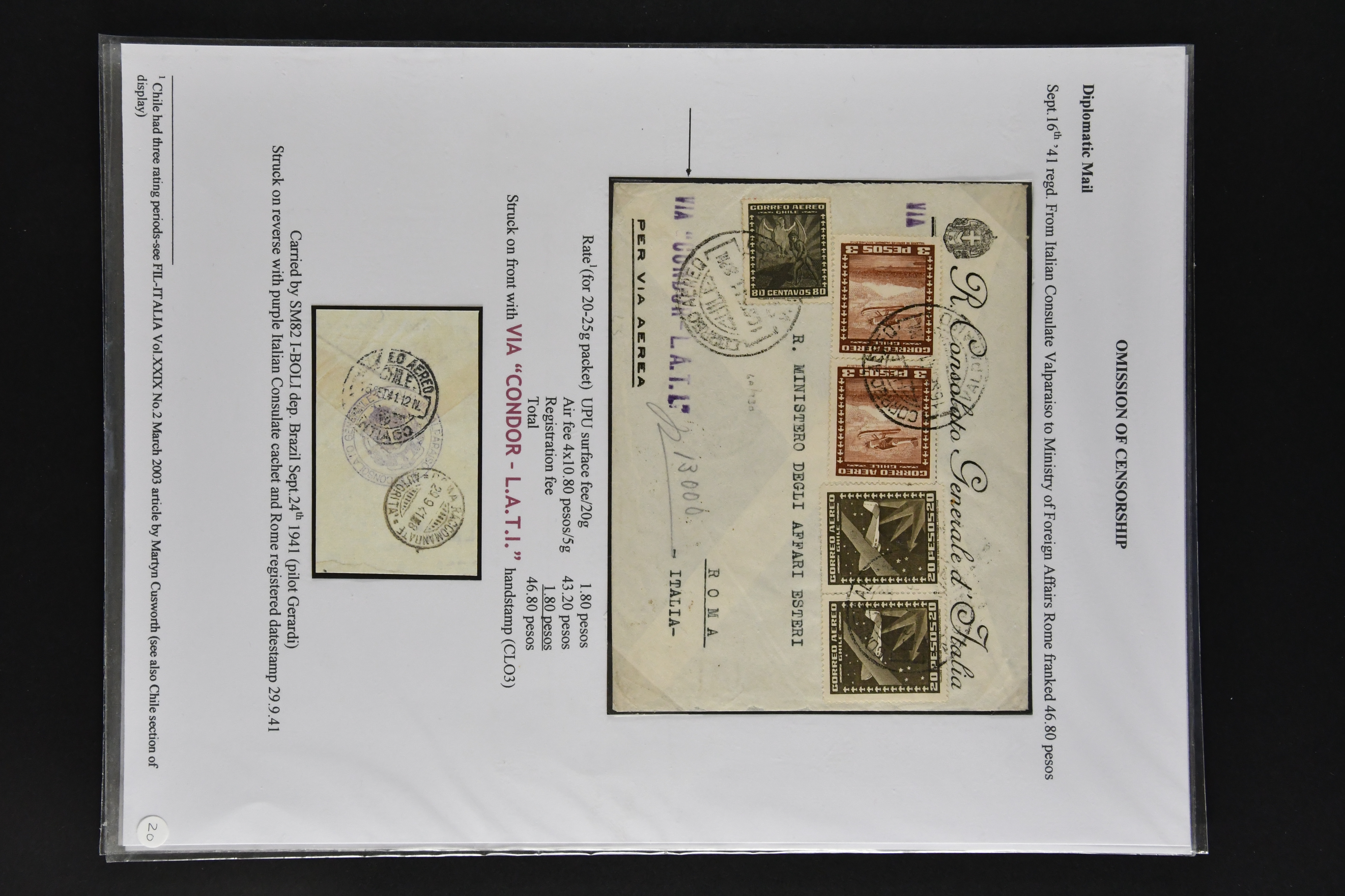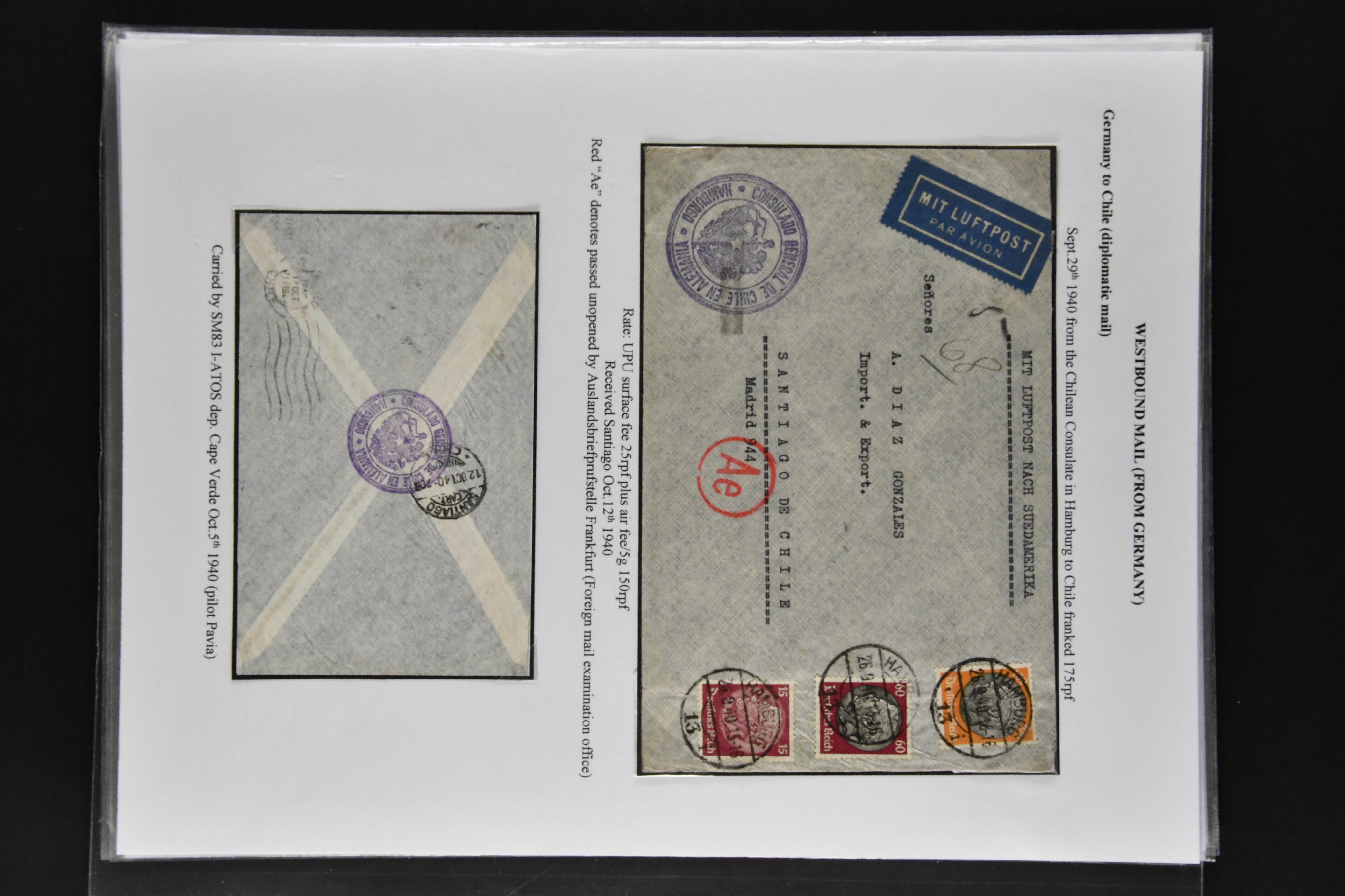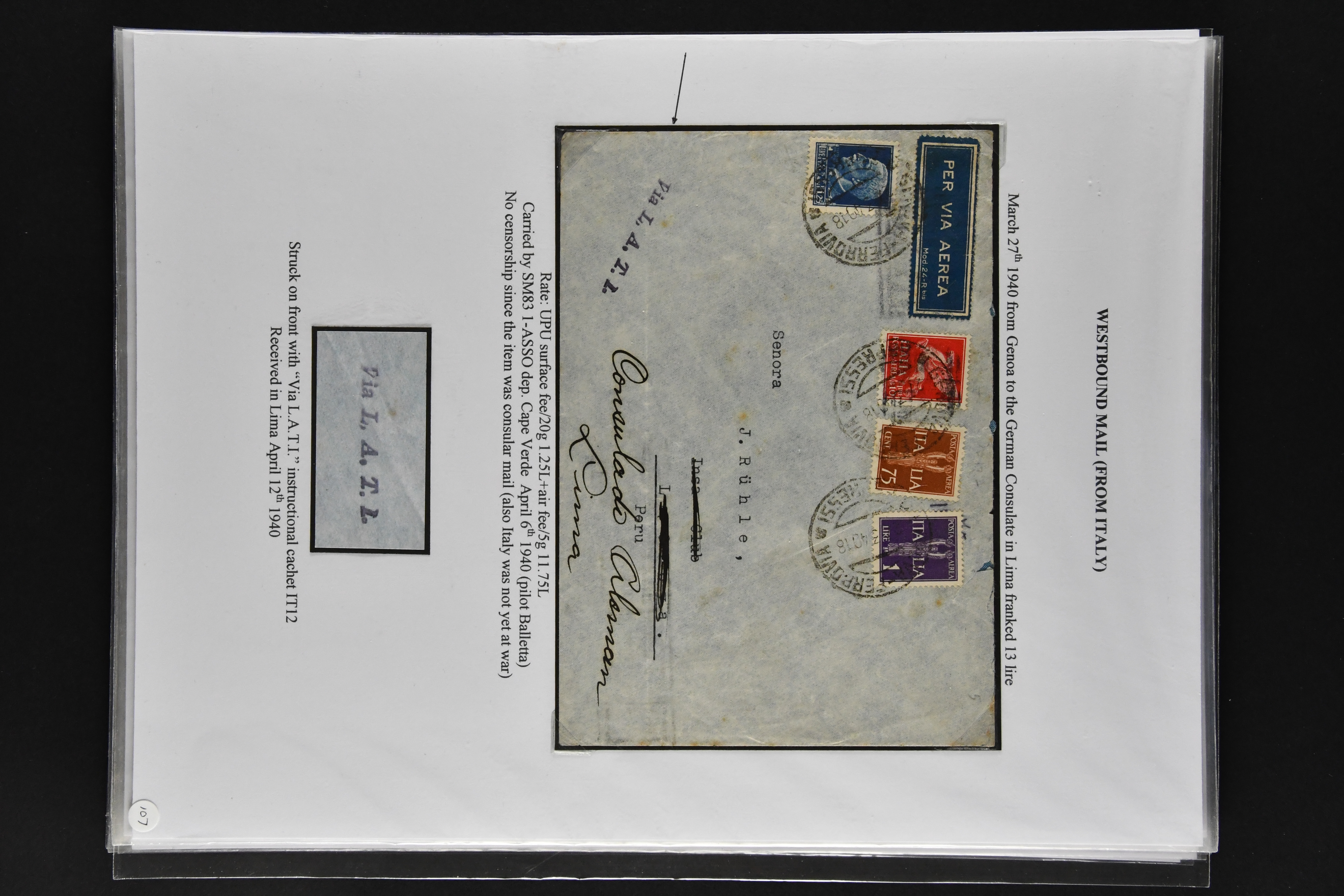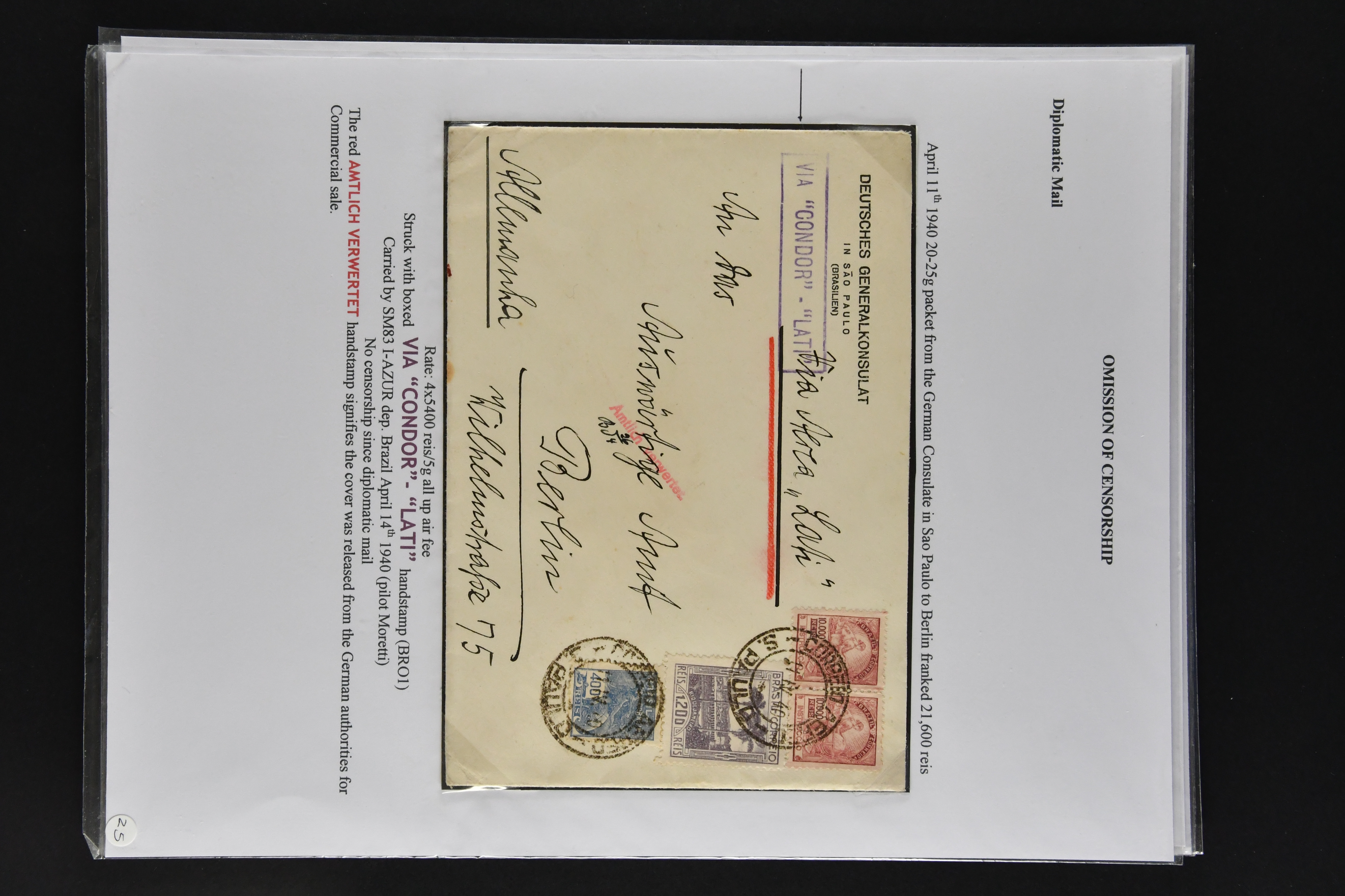 1467 cover imageLATI - Diplomatic Mail 1940/41: Interesting assembly of Consular Mail with ten envelopes without censorship, incl. cover franked with 13 L. from Genoa to German Consulate in Lima showing instructional 'Via L.A.T.I.' handstamp in violet, three envelopes to German Embassy in Santiago de Chile, registered envelope from the Brazilian Embassy in Berlin to Rio, vice-versa with cover from German Consulate in Sao Paulo with boxed hs. 'VIA "CONDOR"-"LATI" to Berlin, cover from Italian Consulate 'VIA "CONDOR L.A.T.I.' hs. (CLO3) back to Rome as well as two covers to Switzerland and a LATI printed envelope addressed to 'Wagons Lits // Cook' to Sweden (Image 1) (Image 2) (Image 3) (Image 4) (Image 5) (Image 6) (Image 7) (Image 8) (Image 9) (Image 10)