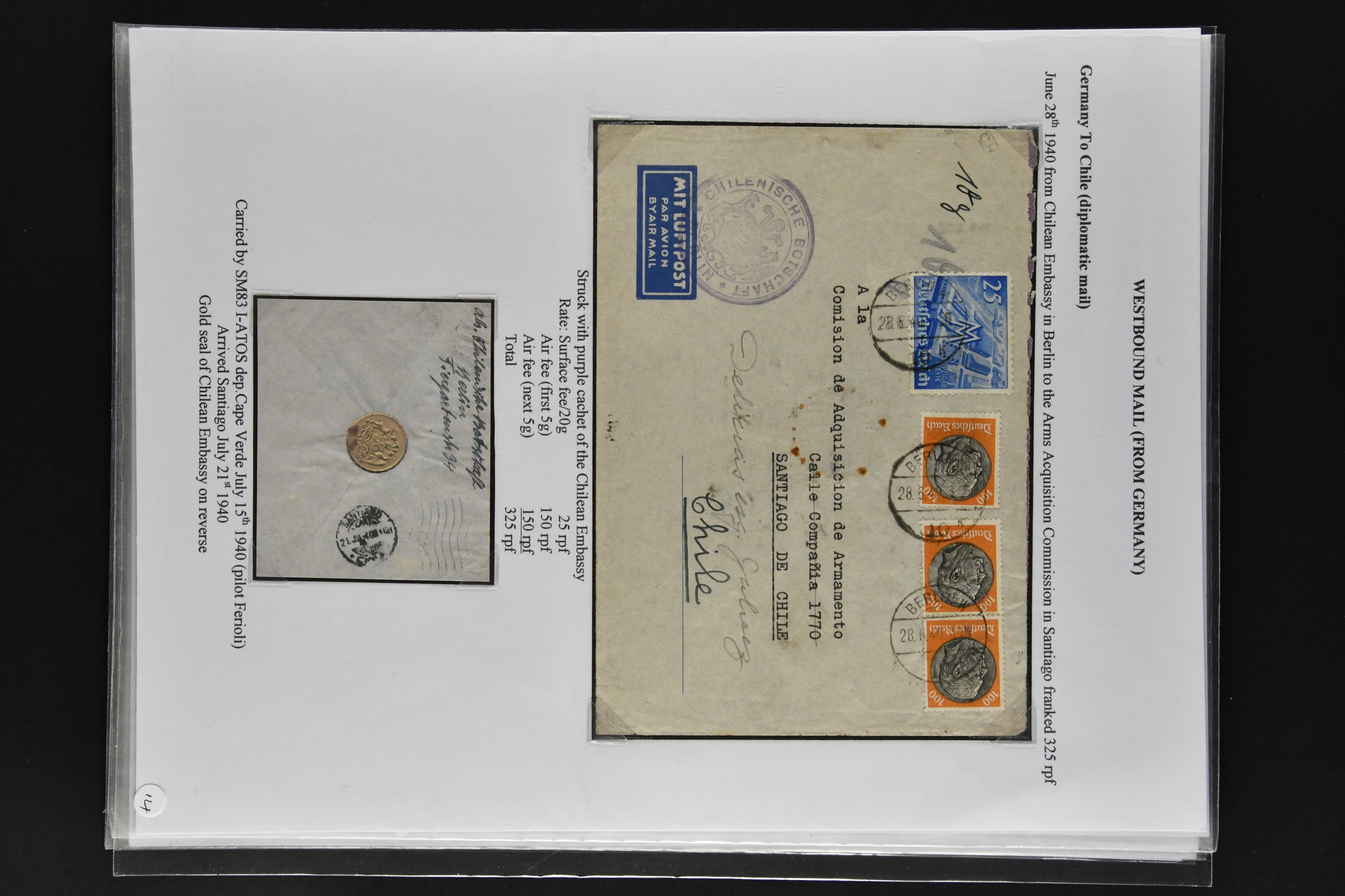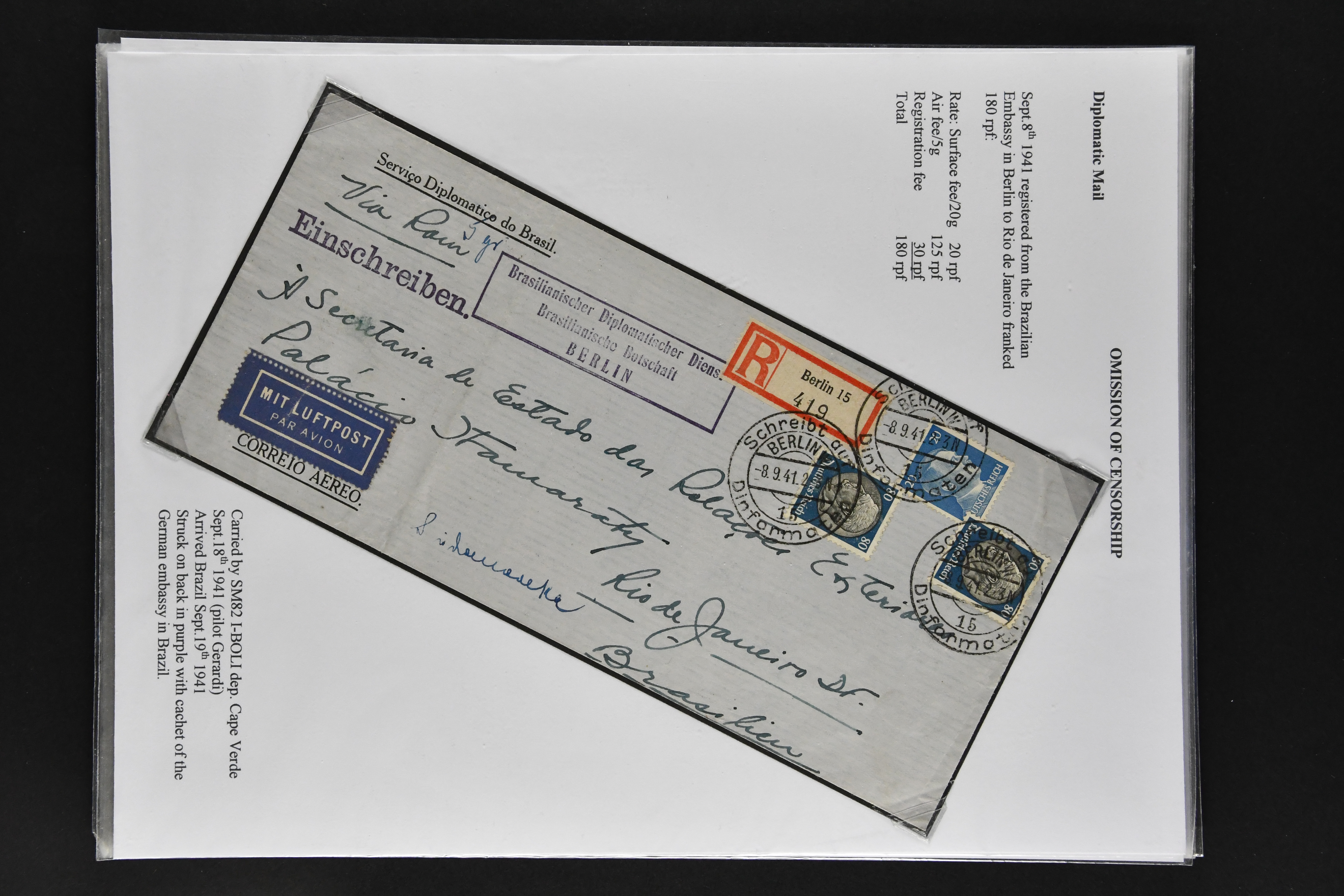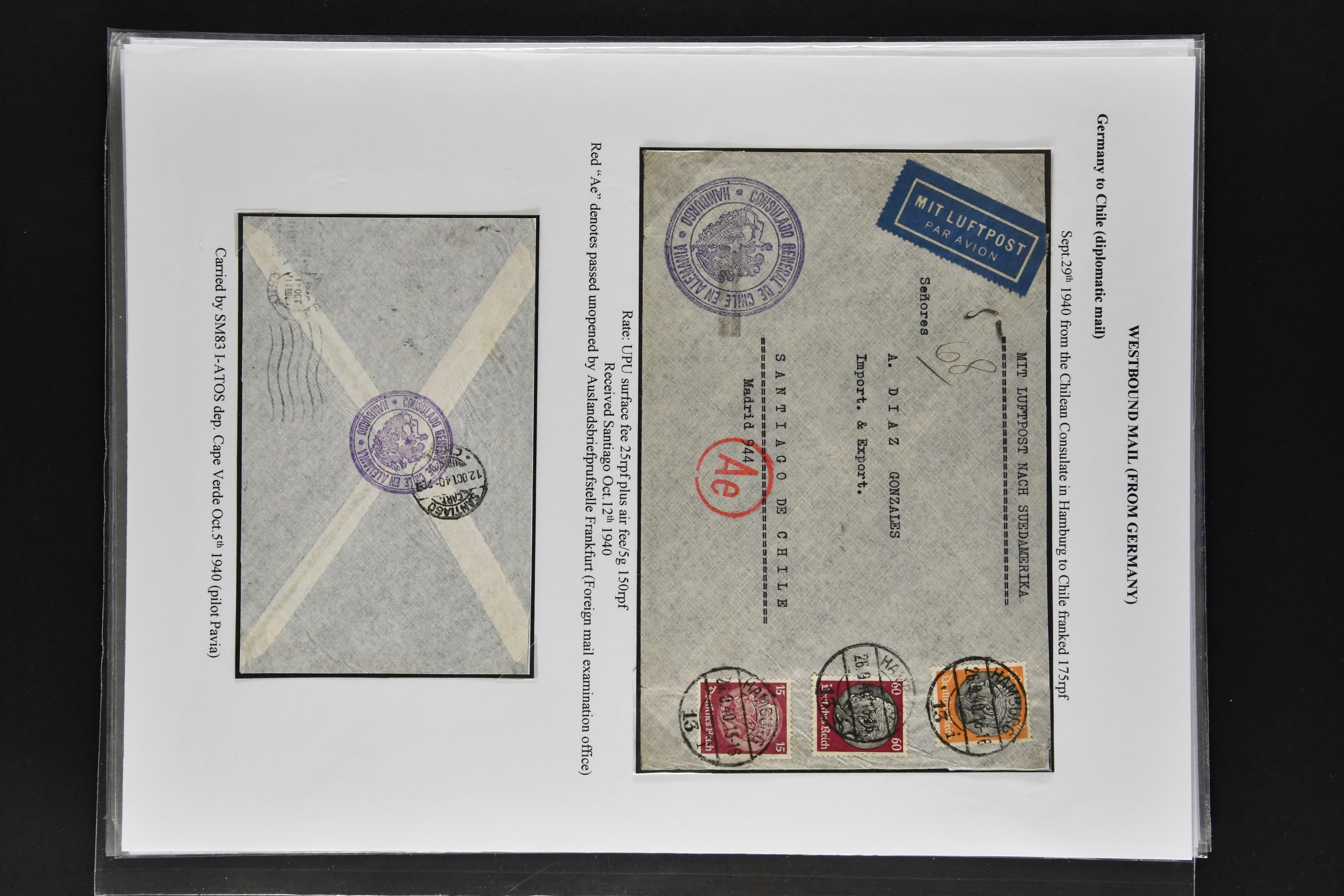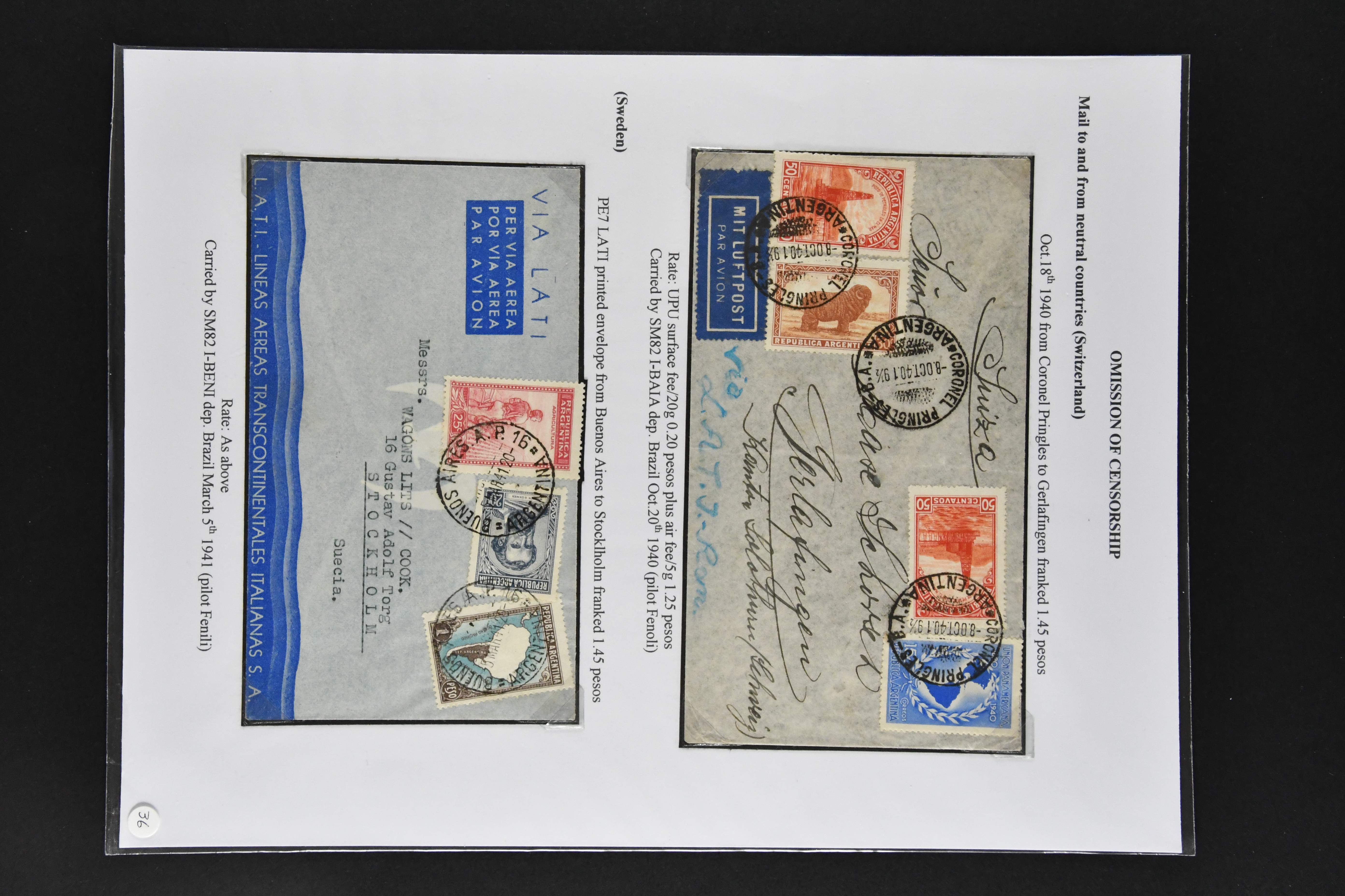 1467 cover imageLATI - Diplomatic Mail 1940/41: Interesting assembly of Consular Mail with ten envelopes without censorship, incl. cover franked with 13 L. from Genoa to German Consulate in Lima showing instructional 'Via L.A.T.I.' handstamp in violet, three envelopes to German Embassy in Santiago de Chile, registered envelope from the Brazilian Embassy in Berlin to Rio, vice-versa with cover from German Consulate in Sao Paulo with boxed hs. 'VIA "CONDOR"-"LATI" to Berlin, cover from Italian Consulate 'VIA "CONDOR L.A.T.I.' hs. (CLO3) back to Rome as well as two covers to Switzerland and a LATI printed envelope addressed to 'Wagons Lits // Cook' to Sweden (Image 1) (Image 2) (Image 3) (Image 4) (Image 5) (Image 6) (Image 7) (Image 8) (Image 9) (Image 10)
