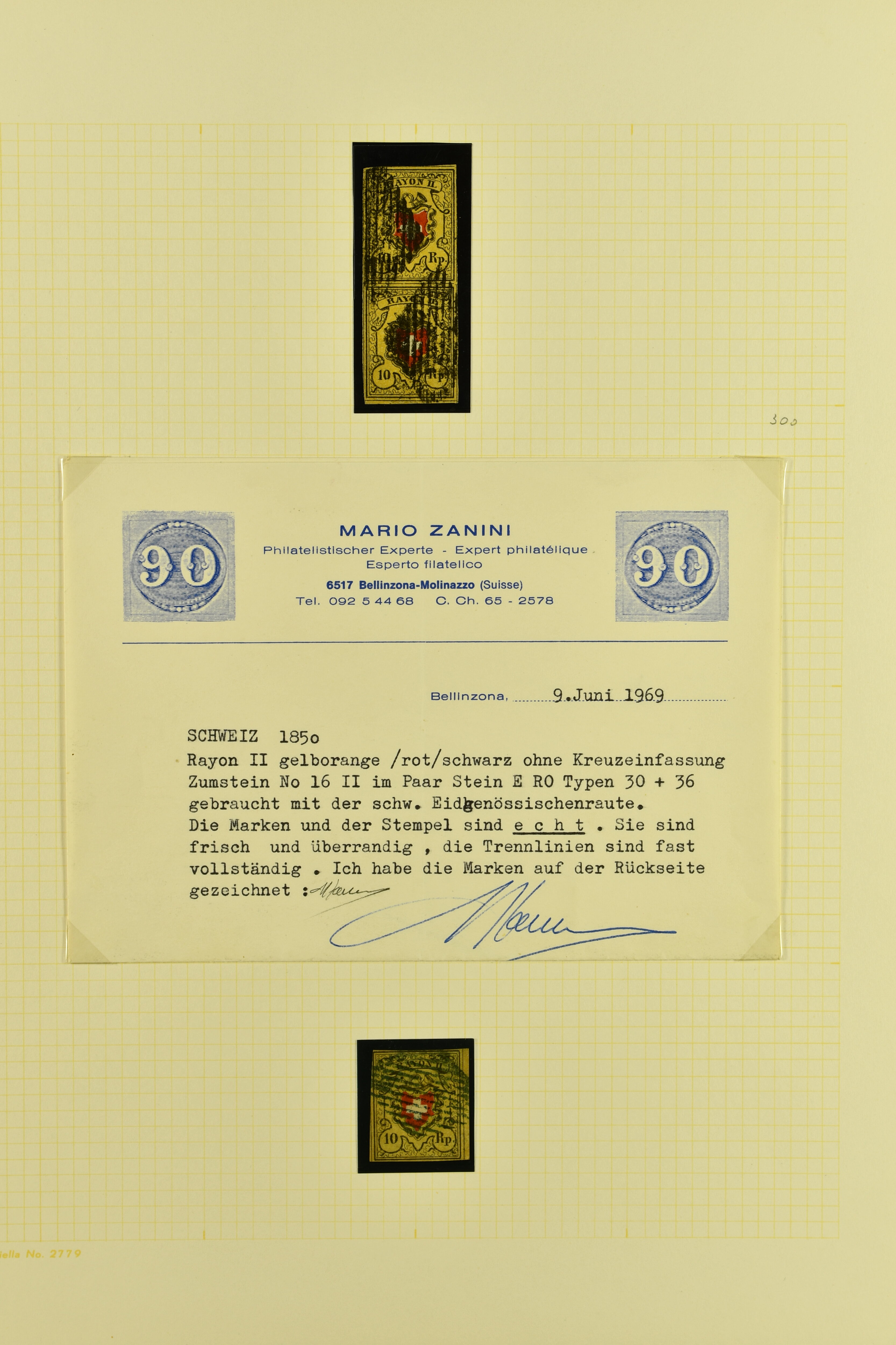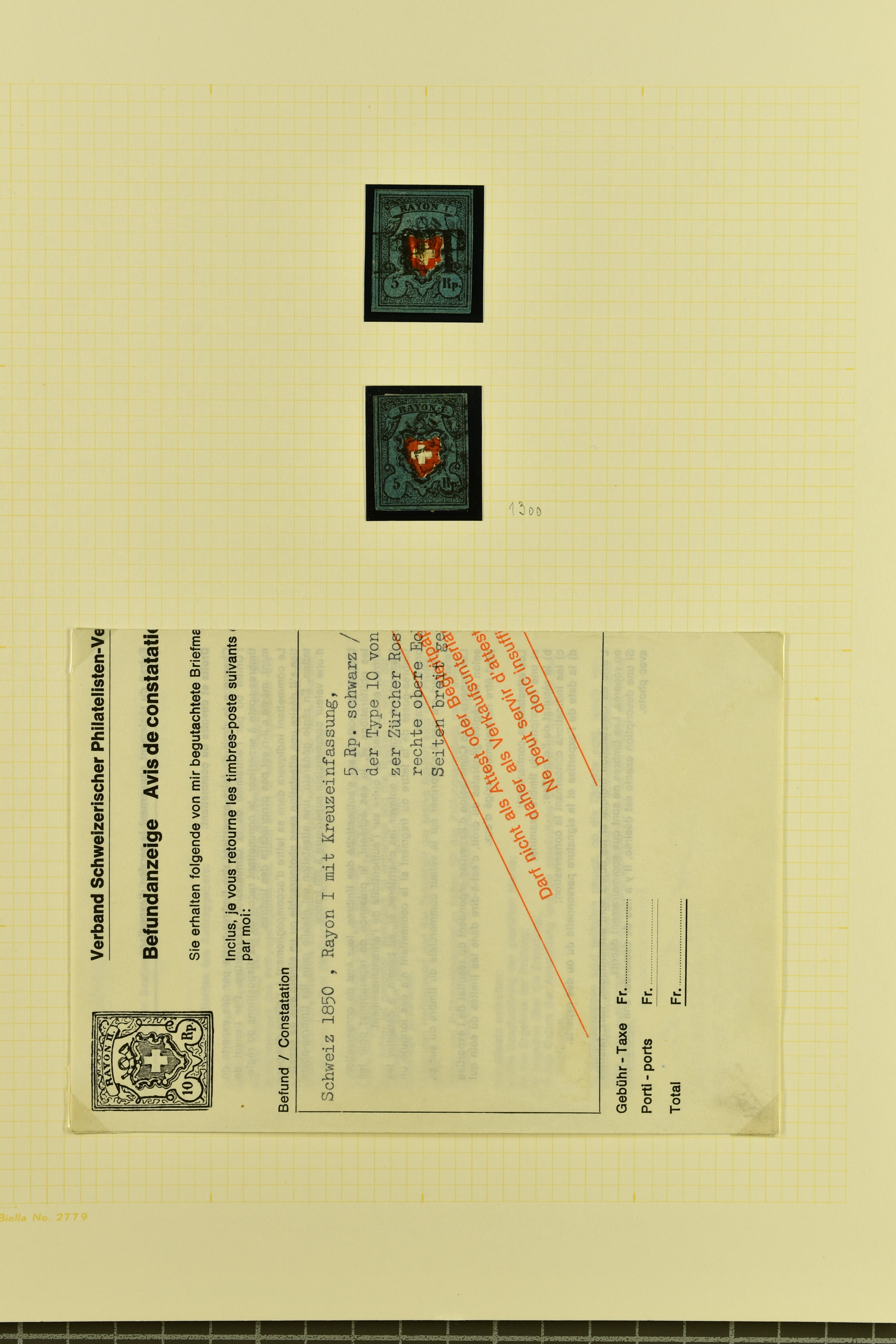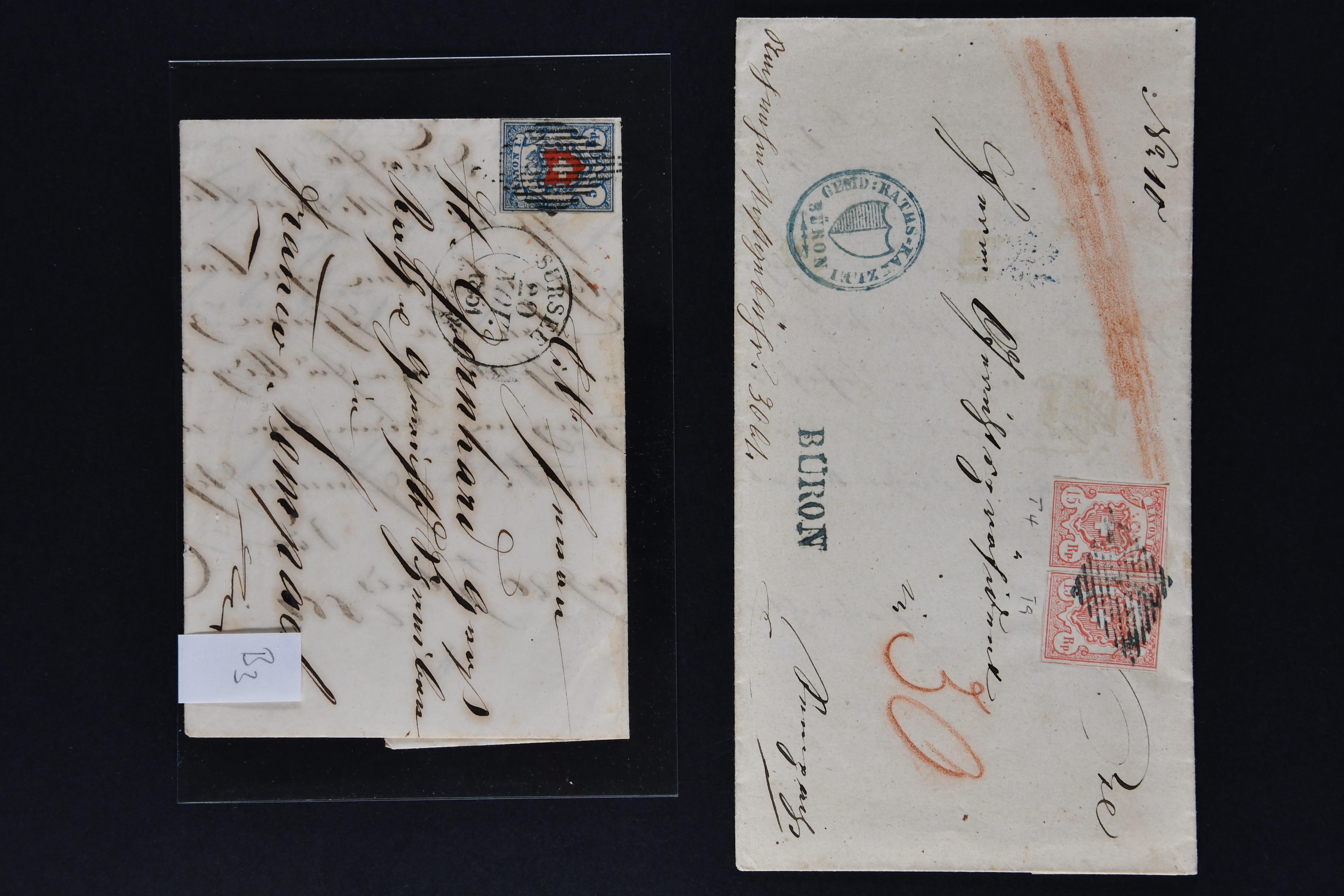 9746 image1850/54: Hochwertige Partie der Durheim-Ausgaben mit neun Einzelwerten, zwei Paaren und zwei Briefen. Dabei Poste Locale, Type 4 in der tiefschwarzen & braunroten Nuance (SBK 14/Ib), klar entw. mit schwarzer eidg. Raute, Rayon I (7) inkl. Typen 33+34 im waagr. Paar mit Bogenecke links unten, zwei Einzelwerte mit breiten Bogenrändern und vielfältige Entwertungen wie schwarze Zürcher Rosette (AW 1), Aargauer Raute (AW 29/30), "P.P." des IX. Postkreises (AW 243) oder "FRANCO" im Kästchen von Basel (AW 440), Rayon II (2) mit je einem Exemplar der Drucksteine A1 und A2, Rayon I hellblau (SBK 17/II), Unbekannter Stein: Typen 23+24 r/o im waagr. Paar und Rayon III, kl. Wertziffer (SBK 18), Type 9 mit breitem Bogenrand links. Ausserdem Rayon I hellbau, Stein B3: Type 21 r/o, klar und übergehend entw. mit schwarzer eidg. Raute mit nebenges. gr. Zierkreisstp. "SURSEE 29 NOV. 1851" auf schönem Faltbrief nach Sempach und Rayon III, gr. Wertziffer: Typen 4 und 9 auf eingeschriebener Portonachnahme von Büron nach Sempach. Eine attraktive Auswahl in meist guter bis sehr guter Erhaltung; ein Befund, acht Atteste. SBK=CHF 11'940 (Image 1) (Image 2) (Image 3) (Image 4) (Image 5) (Image 6) (Image 7) (Image 8) (Image 9) (Image 10) (Image 11) (Image 12)