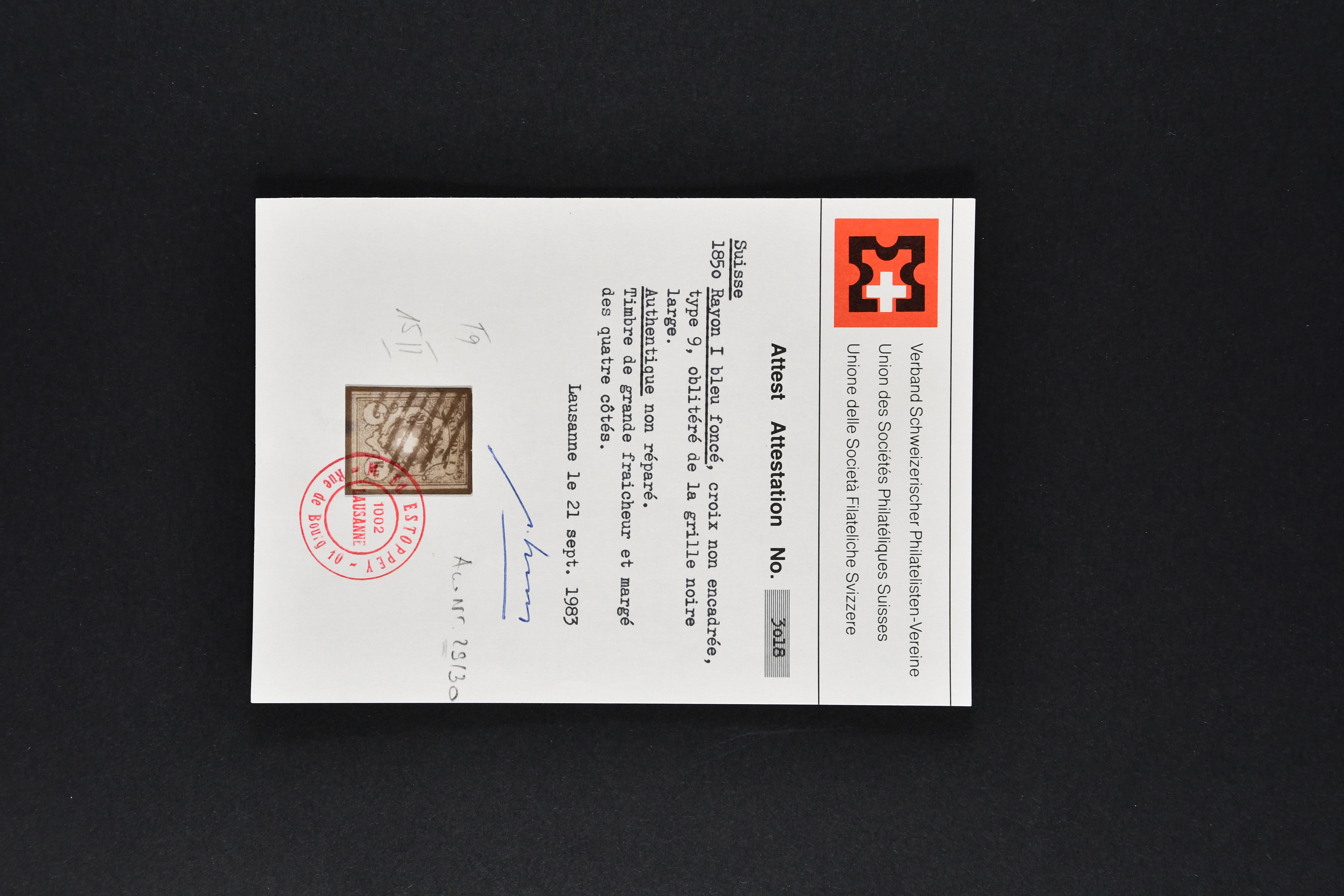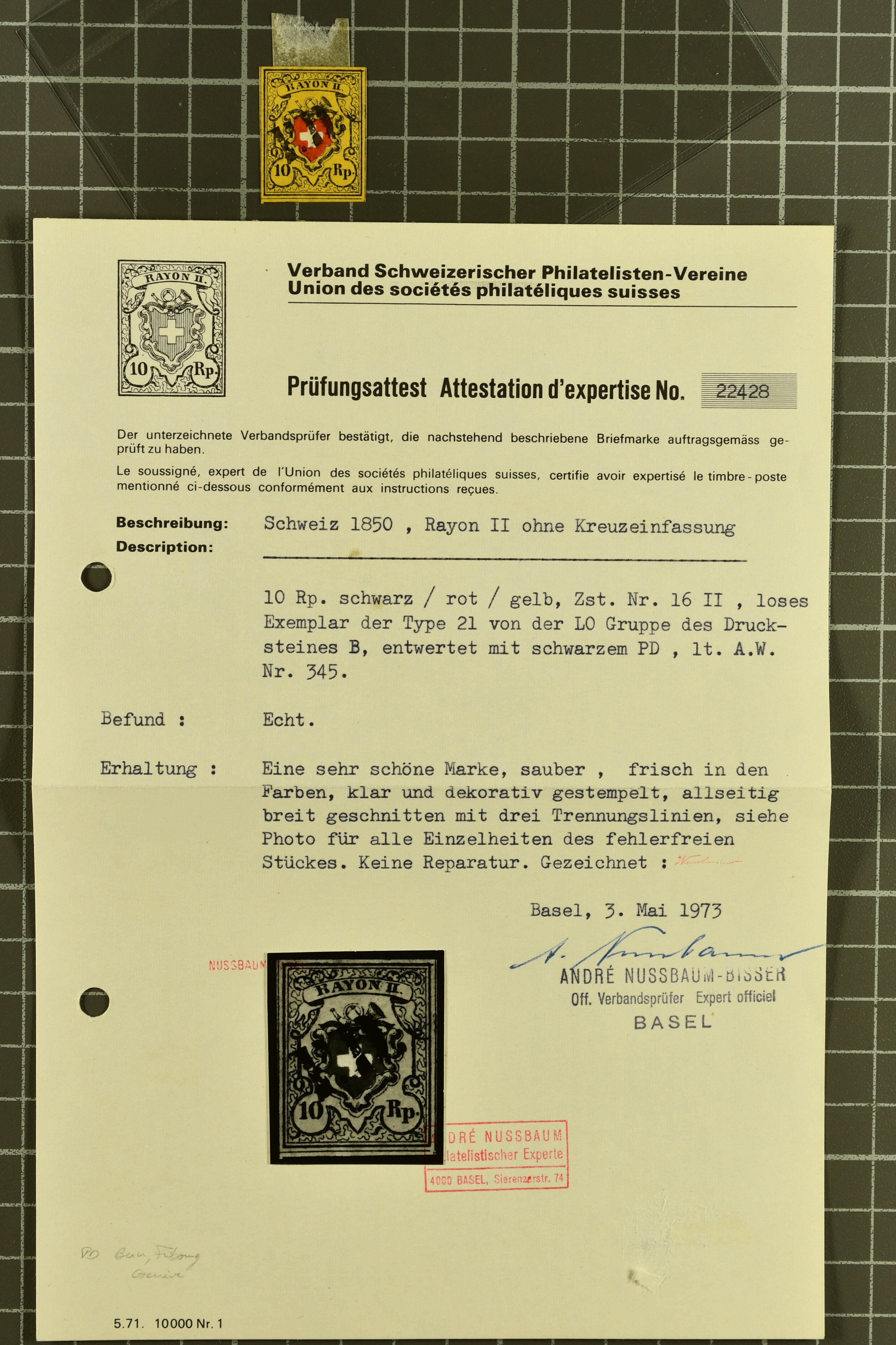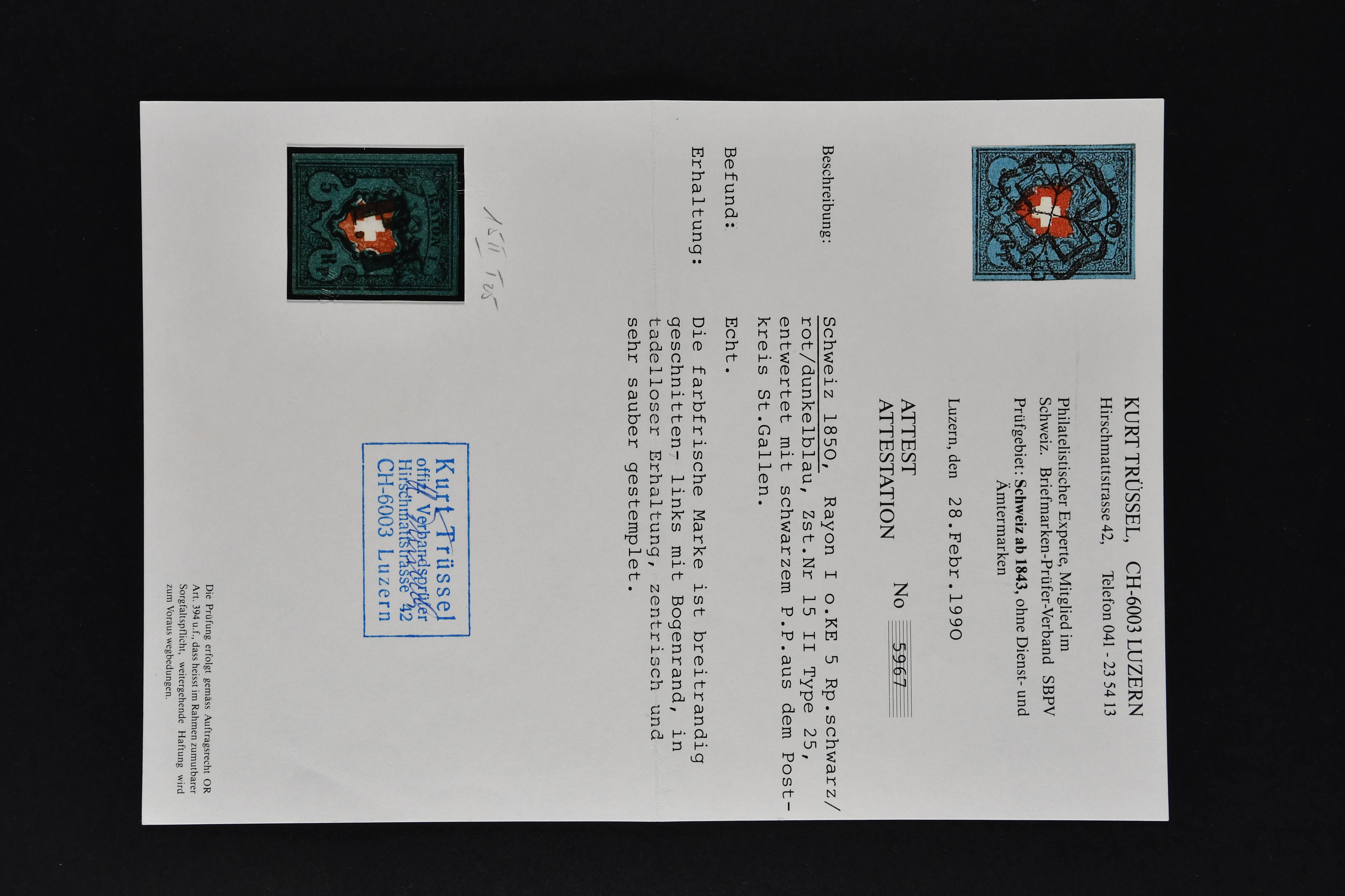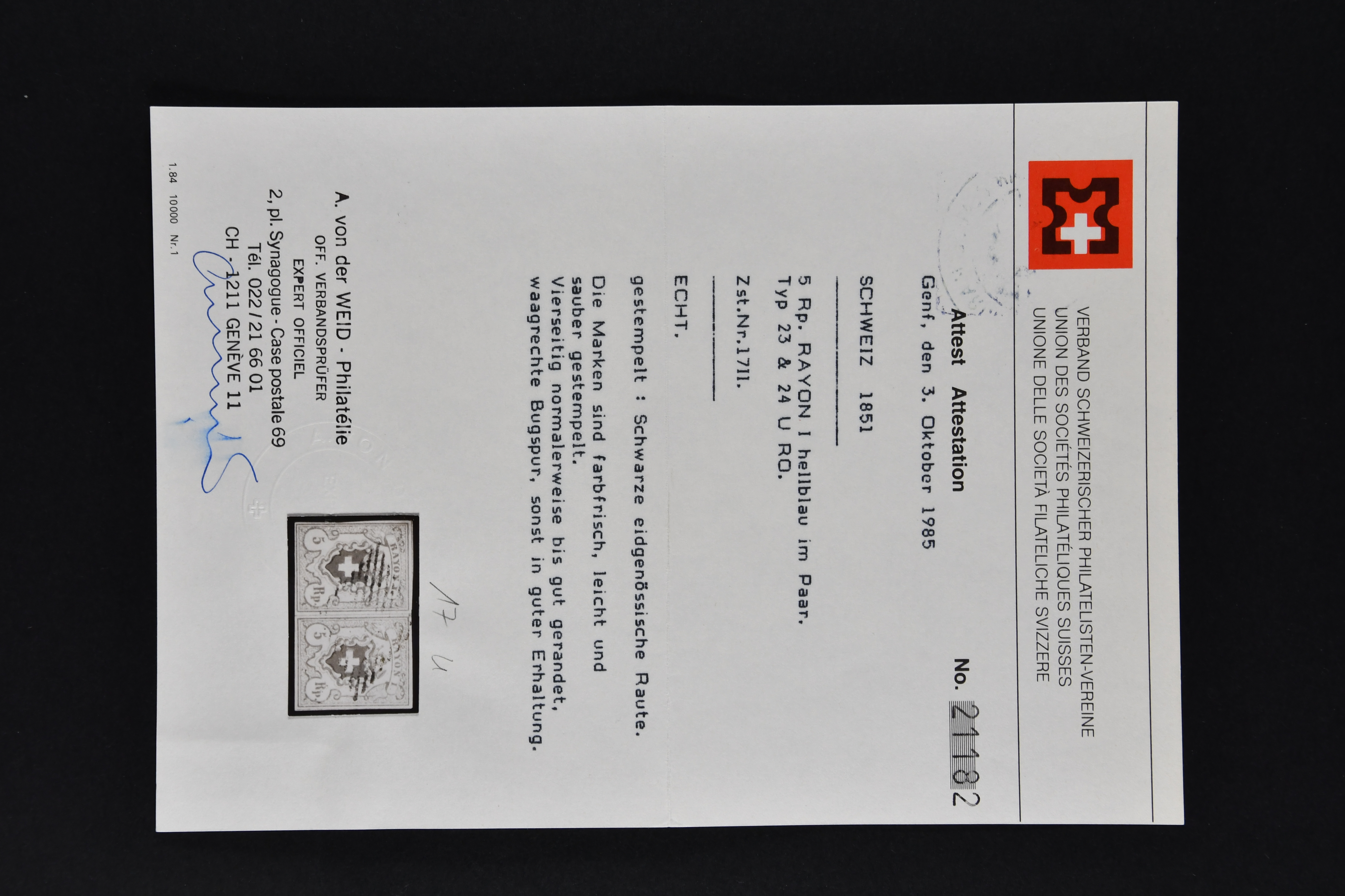 9746 image1850/54: Hochwertige Partie der Durheim-Ausgaben mit neun Einzelwerten, zwei Paaren und zwei Briefen. Dabei Poste Locale, Type 4 in der tiefschwarzen & braunroten Nuance (SBK 14/Ib), klar entw. mit schwarzer eidg. Raute, Rayon I (7) inkl. Typen 33+34 im waagr. Paar mit Bogenecke links unten, zwei Einzelwerte mit breiten Bogenrändern und vielfältige Entwertungen wie schwarze Zürcher Rosette (AW 1), Aargauer Raute (AW 29/30), "P.P." des IX. Postkreises (AW 243) oder "FRANCO" im Kästchen von Basel (AW 440), Rayon II (2) mit je einem Exemplar der Drucksteine A1 und A2, Rayon I hellblau (SBK 17/II), Unbekannter Stein: Typen 23+24 r/o im waagr. Paar und Rayon III, kl. Wertziffer (SBK 18), Type 9 mit breitem Bogenrand links. Ausserdem Rayon I hellbau, Stein B3: Type 21 r/o, klar und übergehend entw. mit schwarzer eidg. Raute mit nebenges. gr. Zierkreisstp. "SURSEE 29 NOV. 1851" auf schönem Faltbrief nach Sempach und Rayon III, gr. Wertziffer: Typen 4 und 9 auf eingeschriebener Portonachnahme von Büron nach Sempach. Eine attraktive Auswahl in meist guter bis sehr guter Erhaltung; ein Befund, acht Atteste. SBK=CHF 11'940 (Image 1) (Image 2) (Image 3) (Image 4) (Image 5) (Image 6) (Image 7) (Image 8) (Image 9) (Image 10) (Image 11) (Image 12)