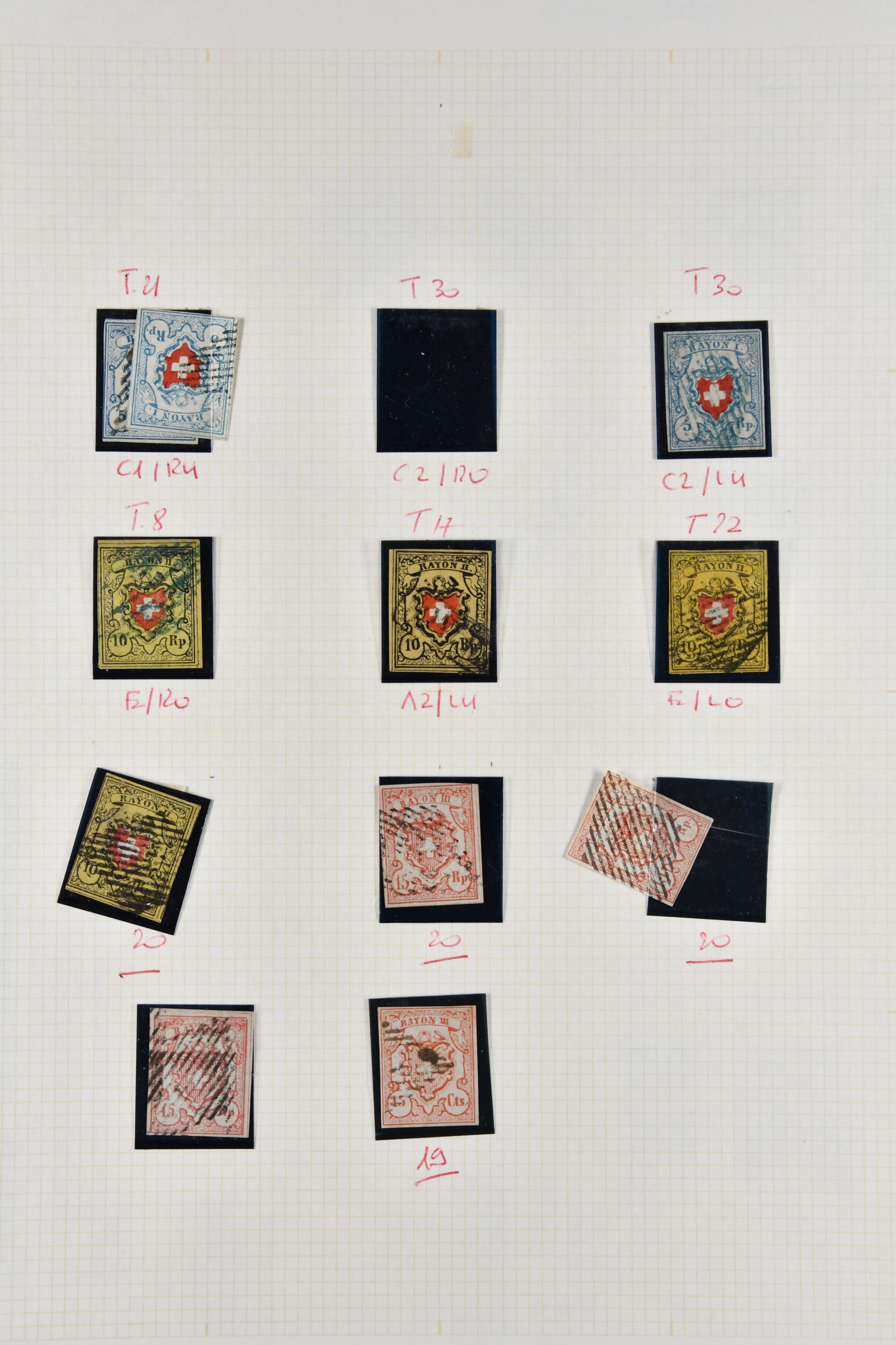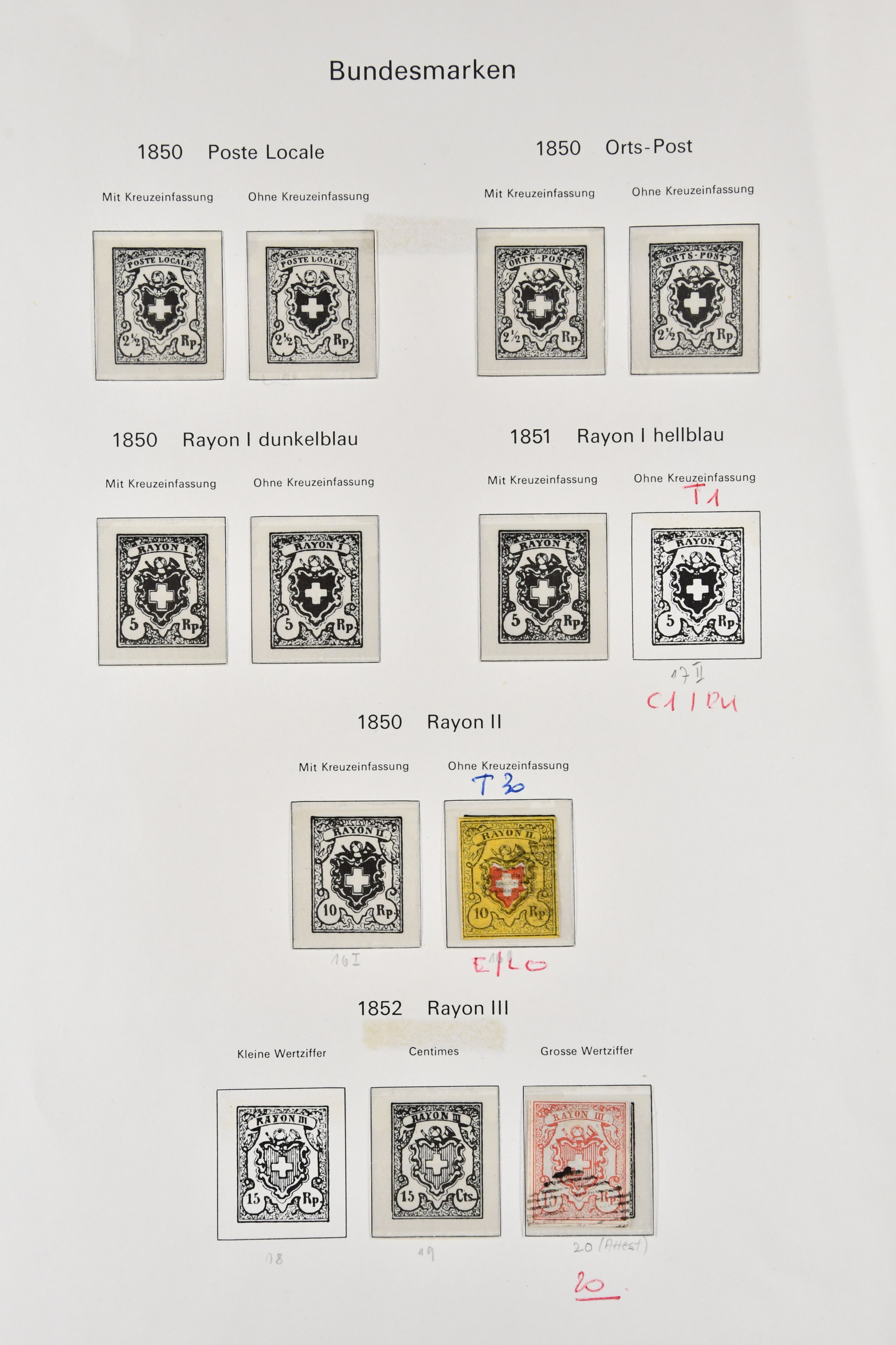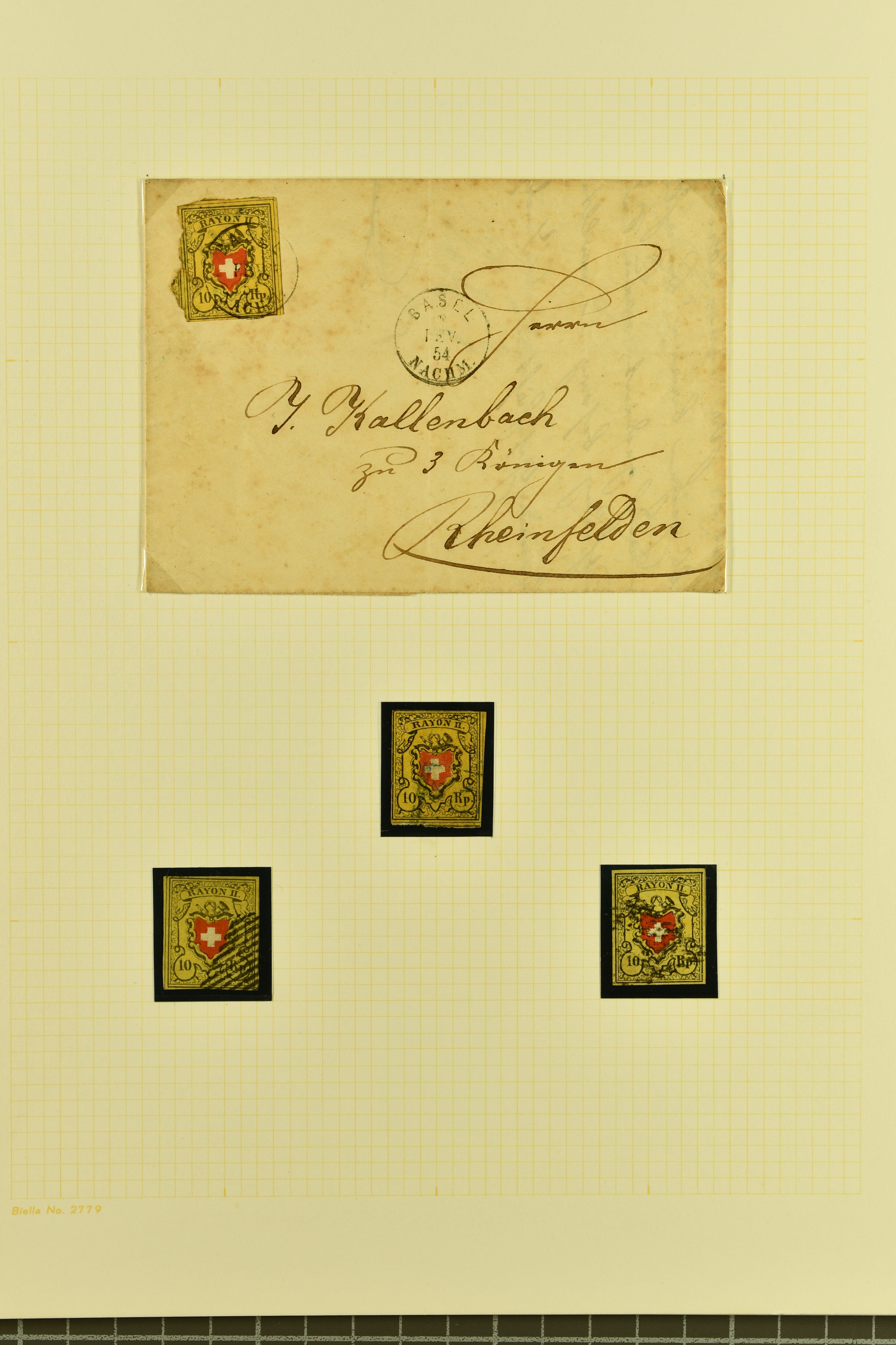 9747 image1850/54: Sammlung 19 Einzelwerte und ein Brief der Durheim-Ausgaben auf acht alten Albumblättern. Dabei Ortspost mit KE (SBK 13/I), Type 5, zart und zentr. entw. mit schwarzem "P.P." des Postkreis Zürich (AW 232), Poste Locale mit KE in der tiefschwarzen & braunroten Nuance (SBK 14/Ib), Rayon I mit und ohne KE (SBK 15/I+15/II), Rayon II (9) inkl. einem schönen Randstück mit seltener grüner eidg. Raute, Stein B: Type 21 l/o entw. mit schwarzem "P.D." des Postkreis Bern (AW 345), Stein E: Typen 30+36 r/o im senkr. Paar sowie Type 12, zart und übergehend entw. mit Einkreisstp. "BASEL 5 FEV. 54 NACHM." auf Brief nach Rheinfelden, Rayon I hellblau (3), Rayon III kl. Wertziffer, Centimes (2) und gr. Wertziffer (2). Etwas unterschiedliche Erhaltung; zwei Befunde, drei Atteste. SBK=CHF 14'300 (Image 1) (Image 2) (Image 3) (Image 4) (Image 5) (Image 6) (Image 7) (Image 8) (Image 9)