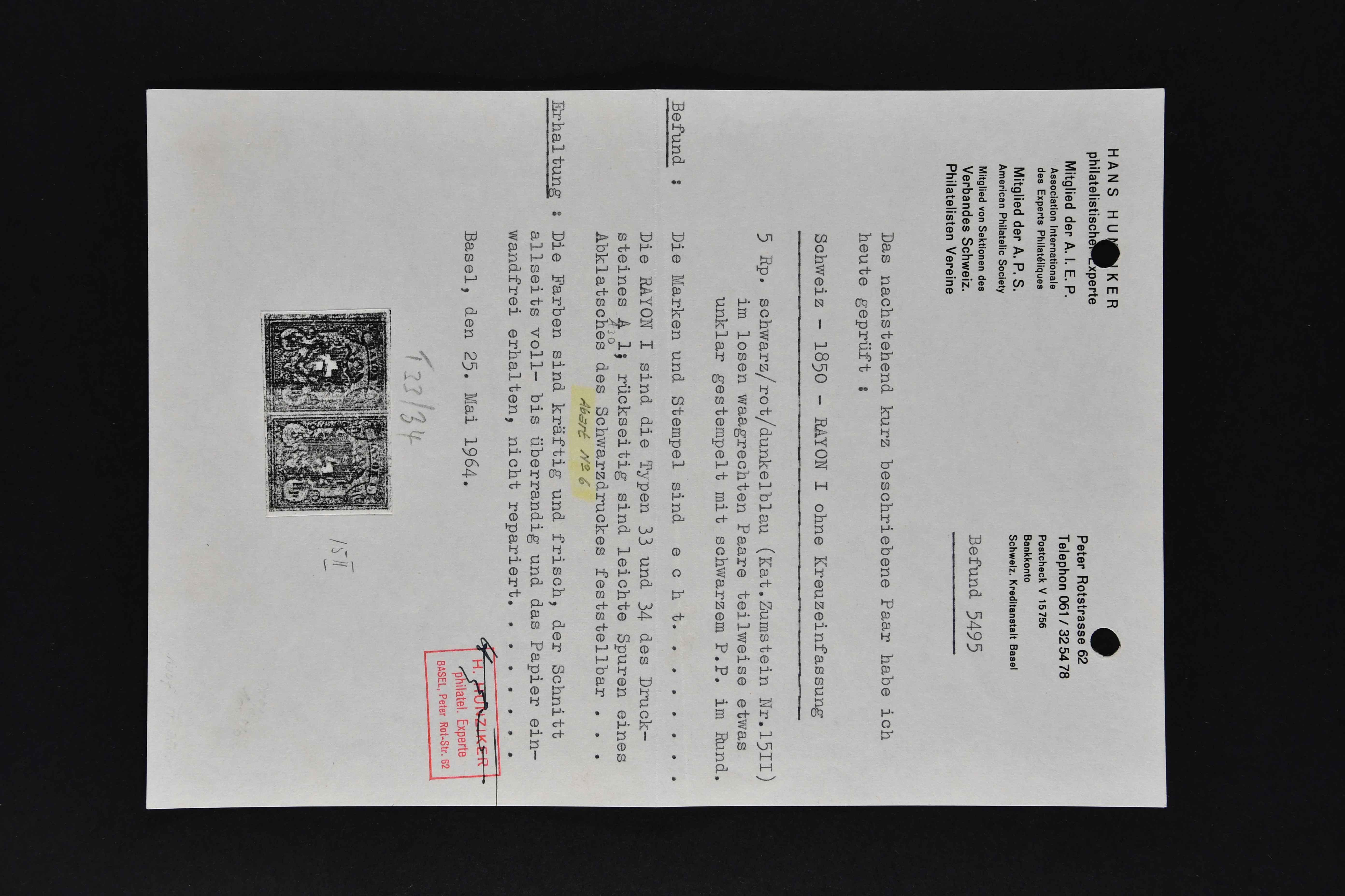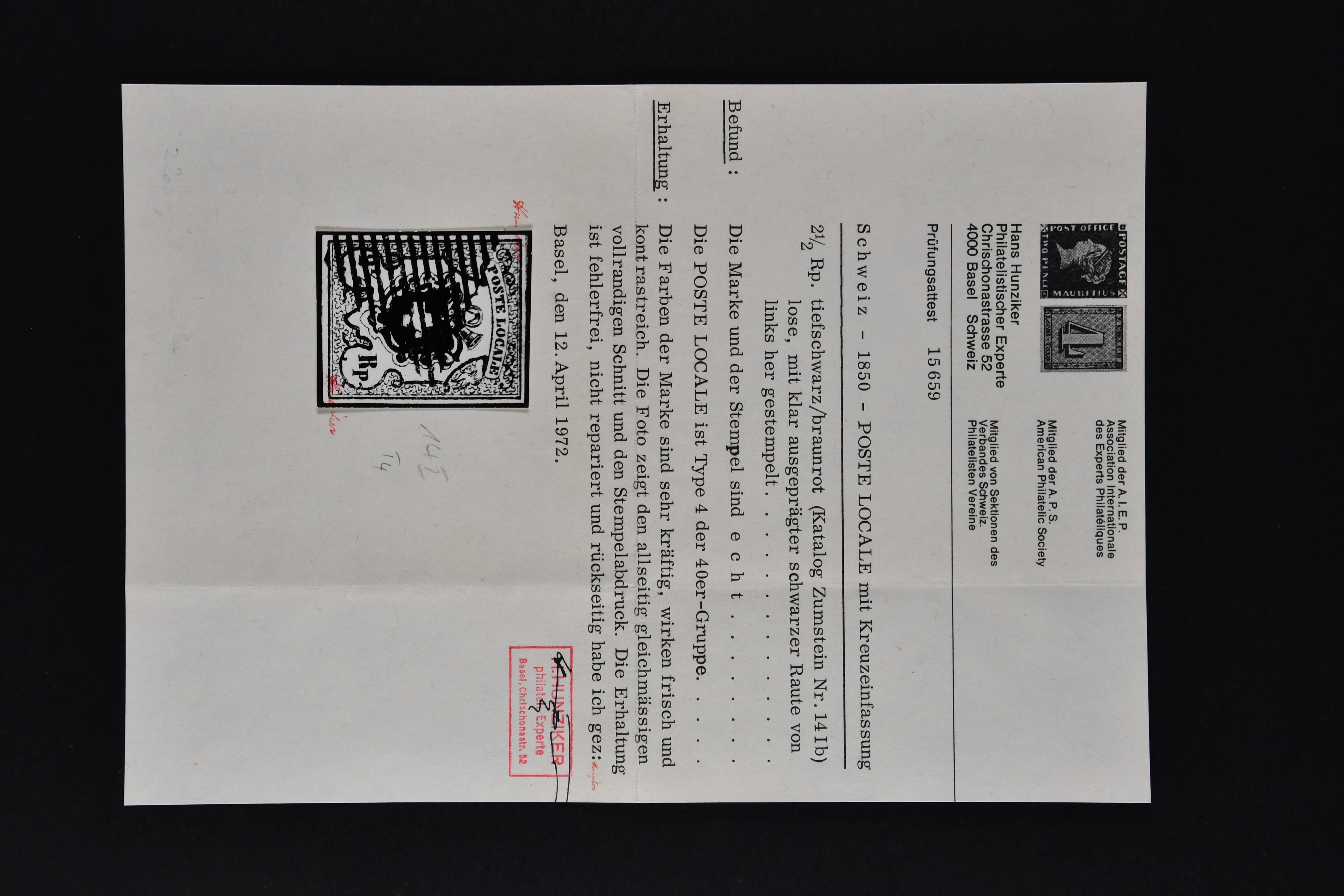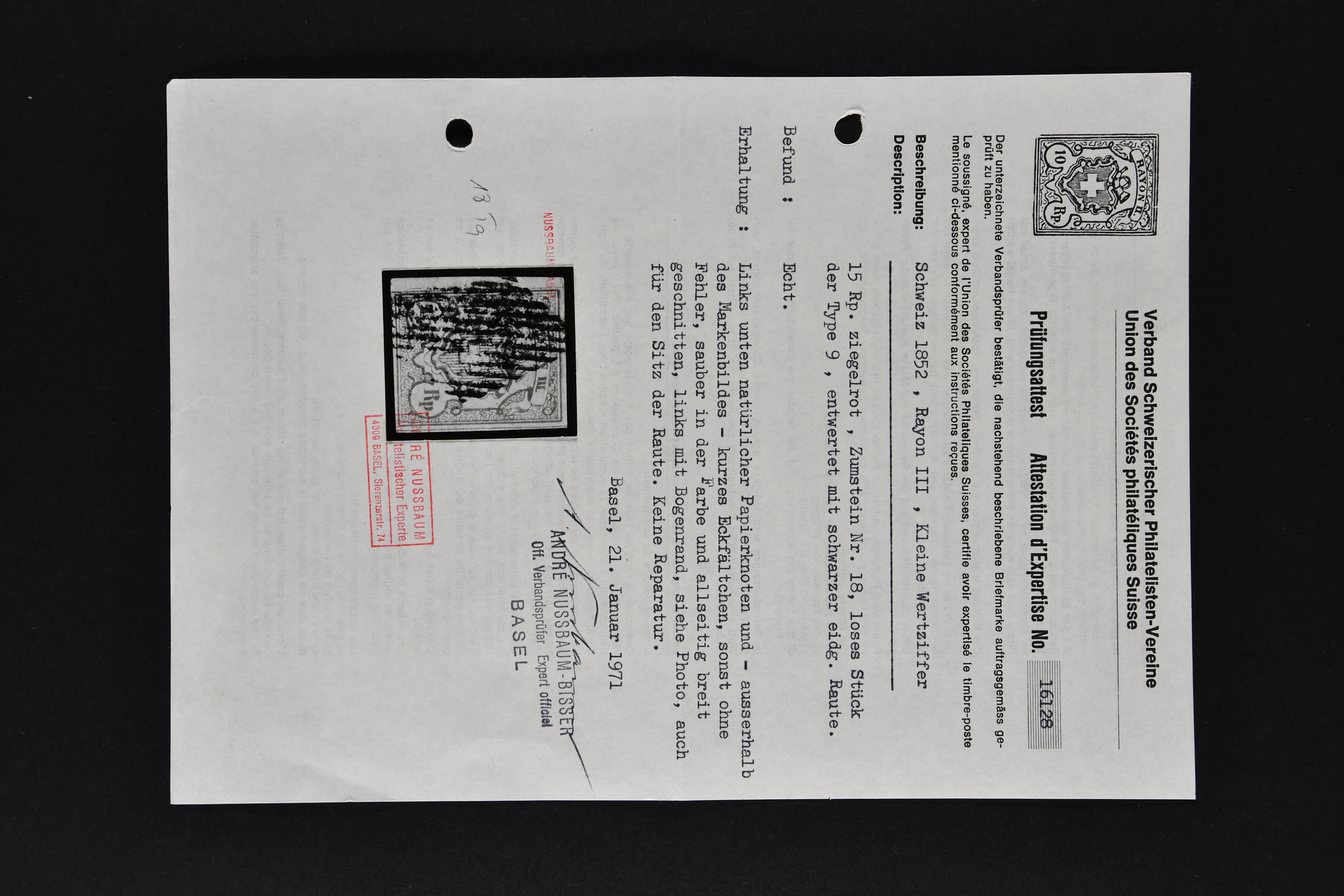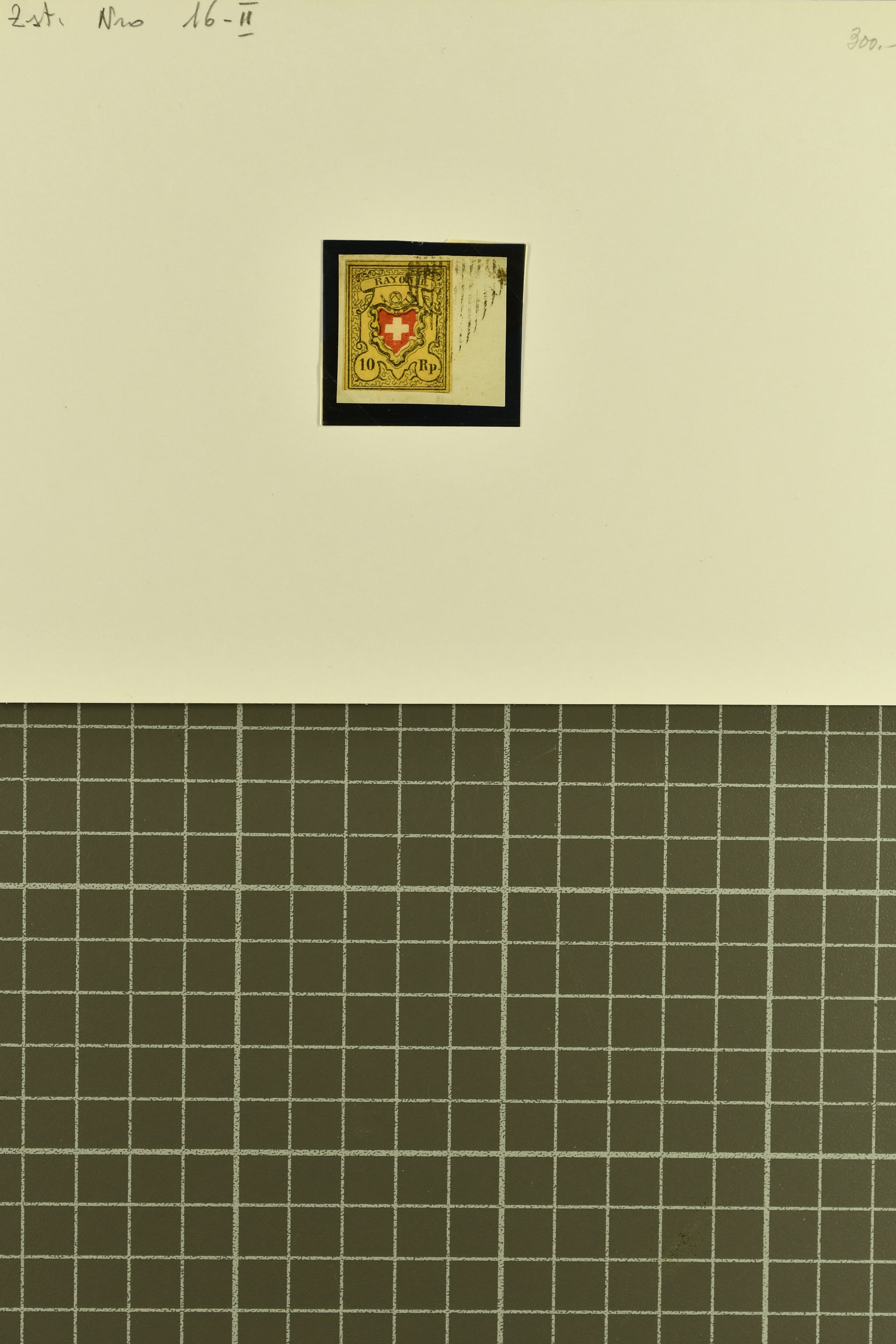 9747 image1850/54: Sammlung 19 Einzelwerte und ein Brief der Durheim-Ausgaben auf acht alten Albumblättern. Dabei Ortspost mit KE (SBK 13/I), Type 5, zart und zentr. entw. mit schwarzem "P.P." des Postkreis Zürich (AW 232), Poste Locale mit KE in der tiefschwarzen & braunroten Nuance (SBK 14/Ib), Rayon I mit und ohne KE (SBK 15/I+15/II), Rayon II (9) inkl. einem schönen Randstück mit seltener grüner eidg. Raute, Stein B: Type 21 l/o entw. mit schwarzem "P.D." des Postkreis Bern (AW 345), Stein E: Typen 30+36 r/o im senkr. Paar sowie Type 12, zart und übergehend entw. mit Einkreisstp. "BASEL 5 FEV. 54 NACHM." auf Brief nach Rheinfelden, Rayon I hellblau (3), Rayon III kl. Wertziffer, Centimes (2) und gr. Wertziffer (2). Etwas unterschiedliche Erhaltung; zwei Befunde, drei Atteste. SBK=CHF 14'300 (Image 1) (Image 2) (Image 3) (Image 4) (Image 5) (Image 6) (Image 7) (Image 8) (Image 9)