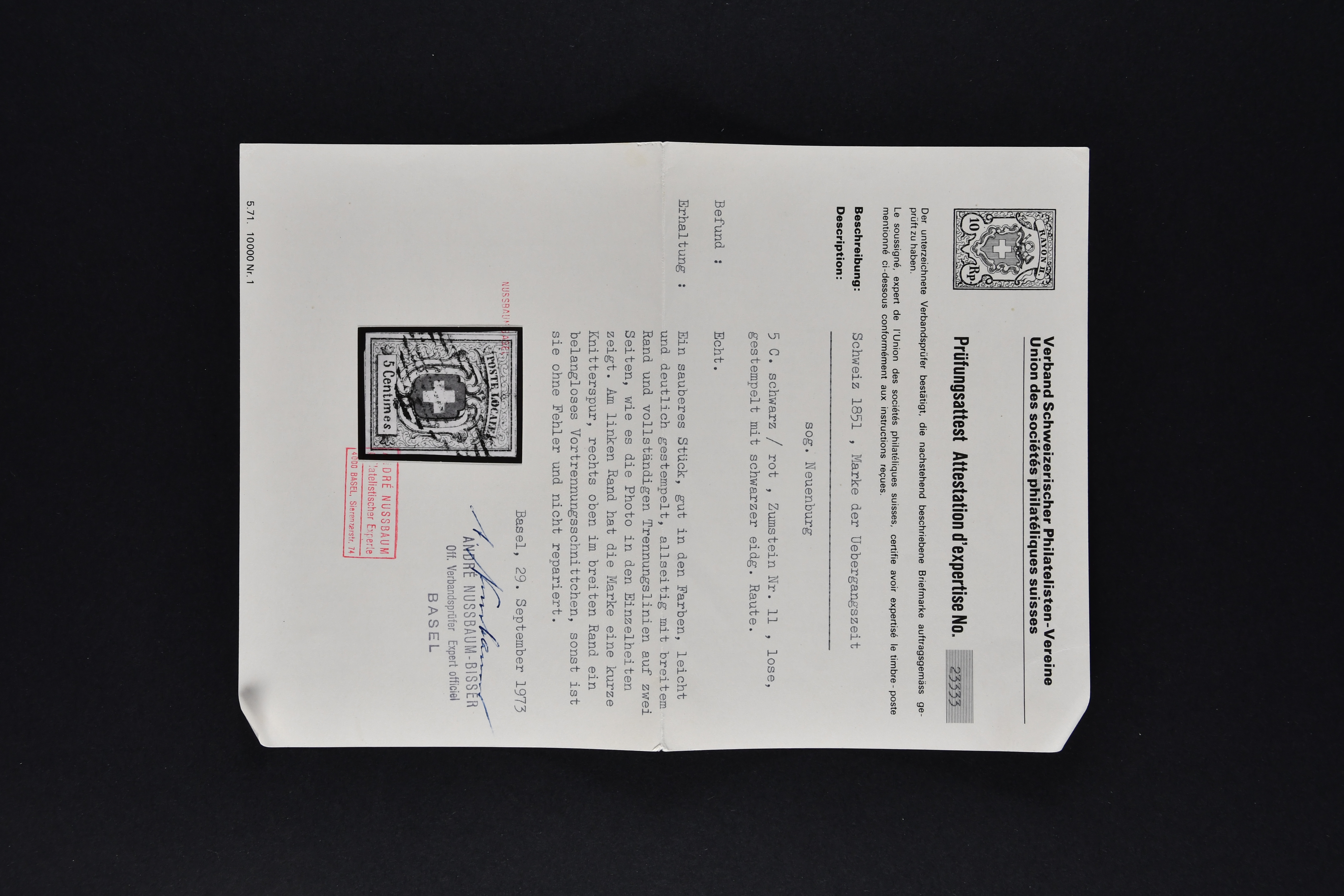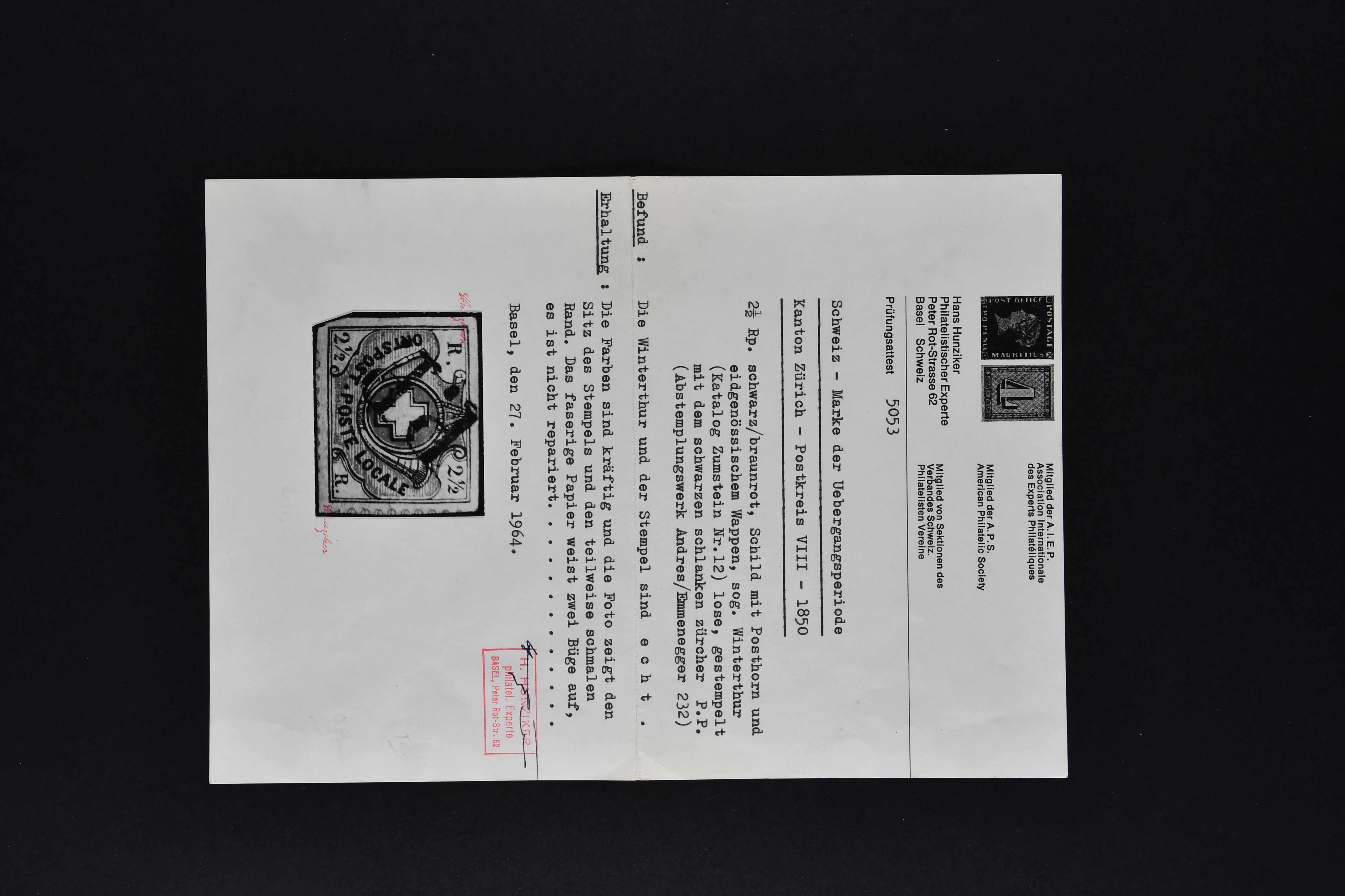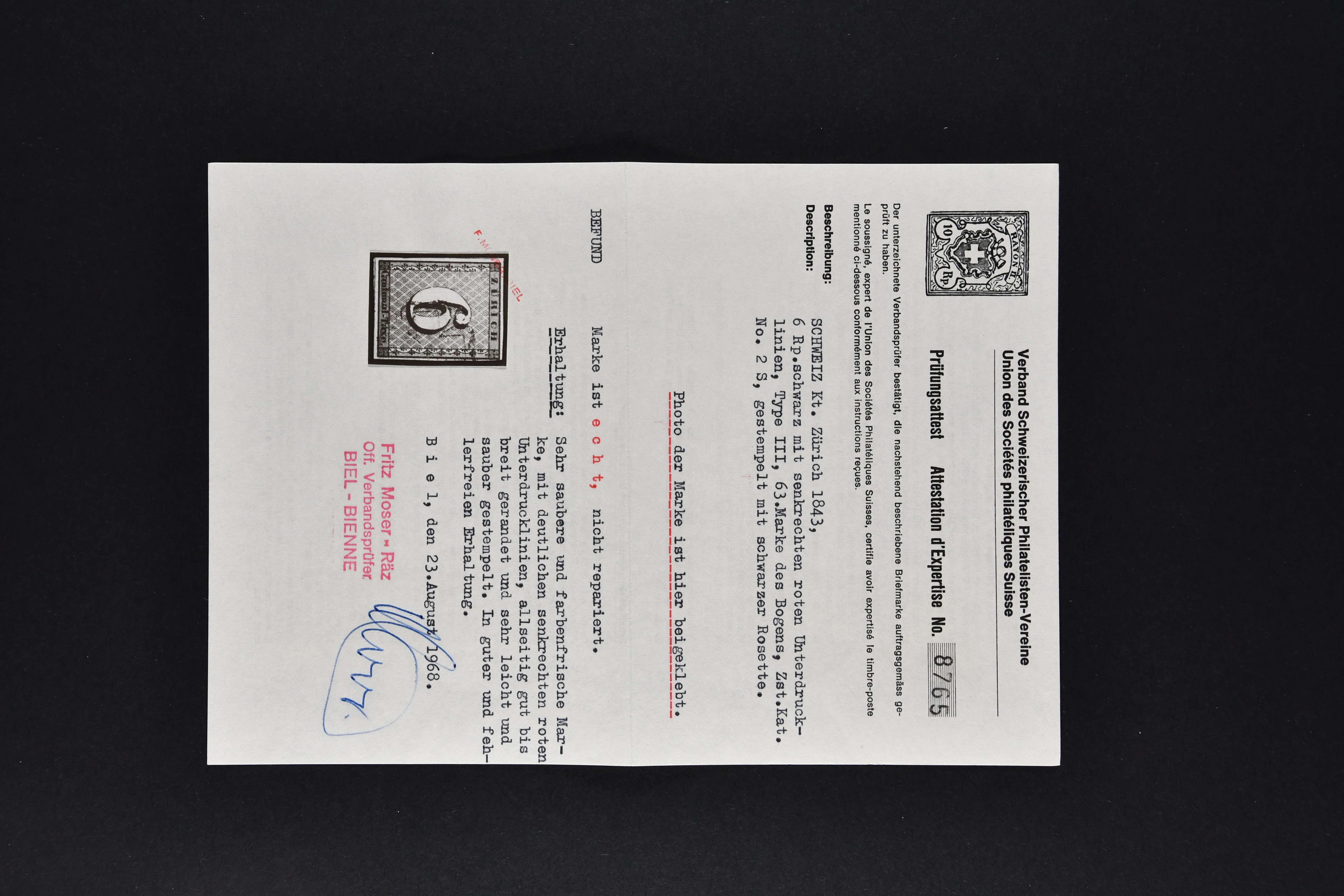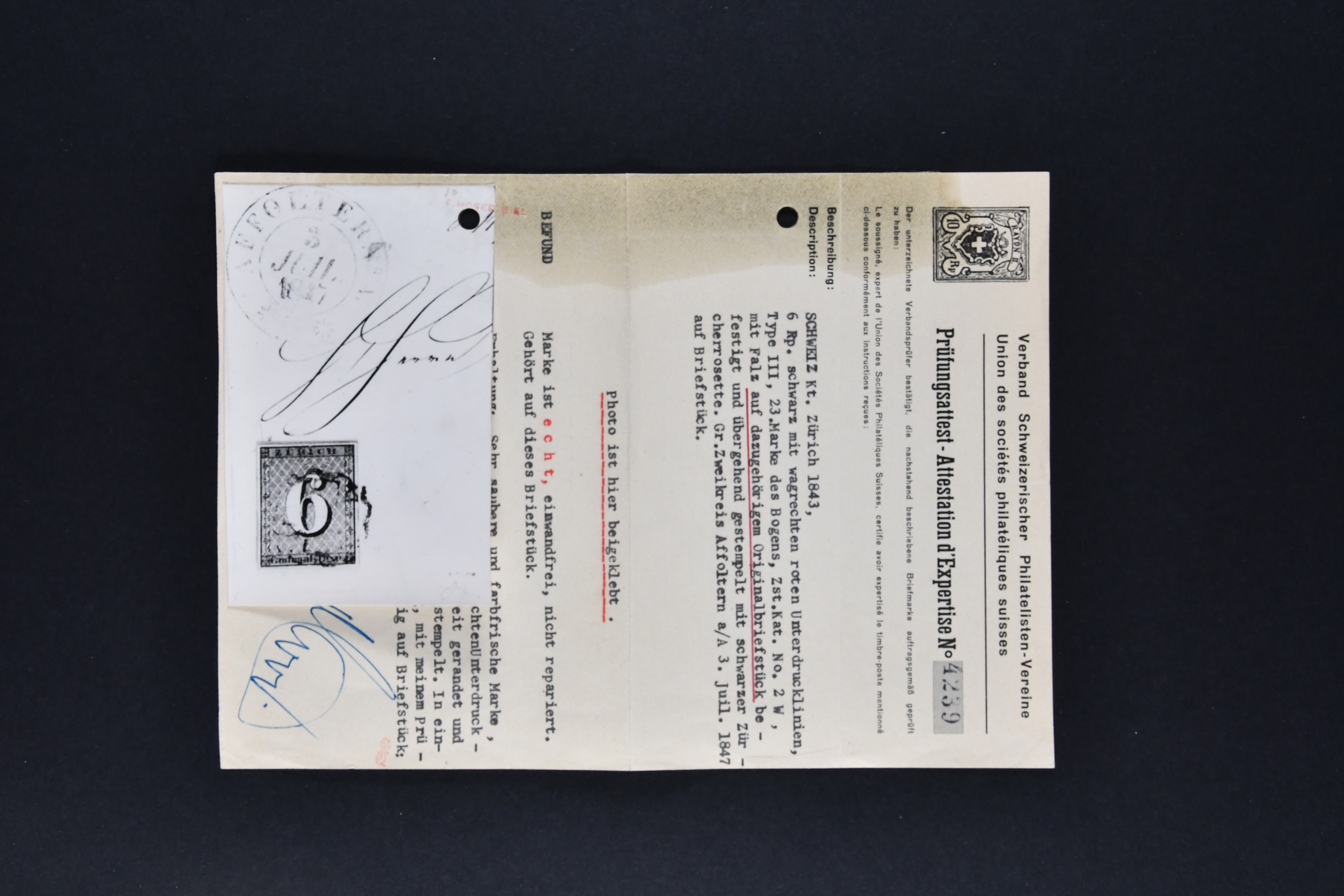 9727 image1843/50: Kantonalmarken-Lot mit vier Einzelwerten und zwei Briefstücken. Dabei Zürich 6 mit senkr. Unterdrucklinien (SBK 2S), zart entw. mit schwarzer Zürcher Rosette (AW 1), Zürich 6 mit waagr. Unterdrucklinien (SBK 2W), klar und übergehend entw. mit schwarzer Zürcher Rosette (AW 1) auf Briefstück mit nebenges. gr. Zierkreisstp. "AFFOLTERN A/A 3 JUIL 1847" in ders. Farbe, Winterthur (SBK 12), klar und voll aufges. entw. mit schwarzem "P.P." des Postkreis Zürich (AW 232) Kl. Adler (SBK 5) auf Briefstück, Gr. Adler (SBK 6) und Neuenburg (SBK 11), zart entw. mit schwarzer eidg. Raute. Unterschiedliche Erhaltung; vier Atteste. SBK=CHF 21'160 (Image 1) (Image 2) (Image 3) (Image 4) (Image 5)