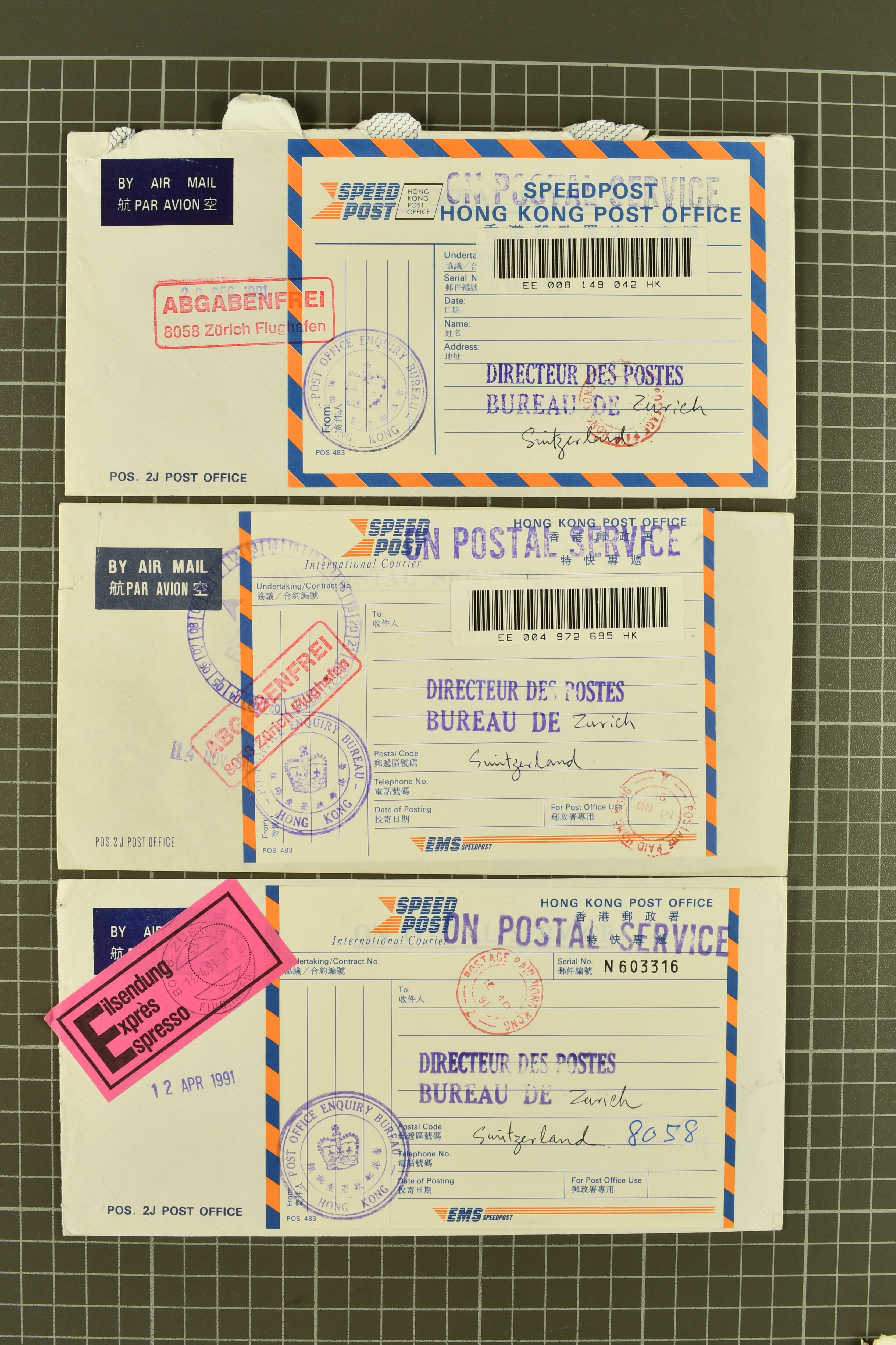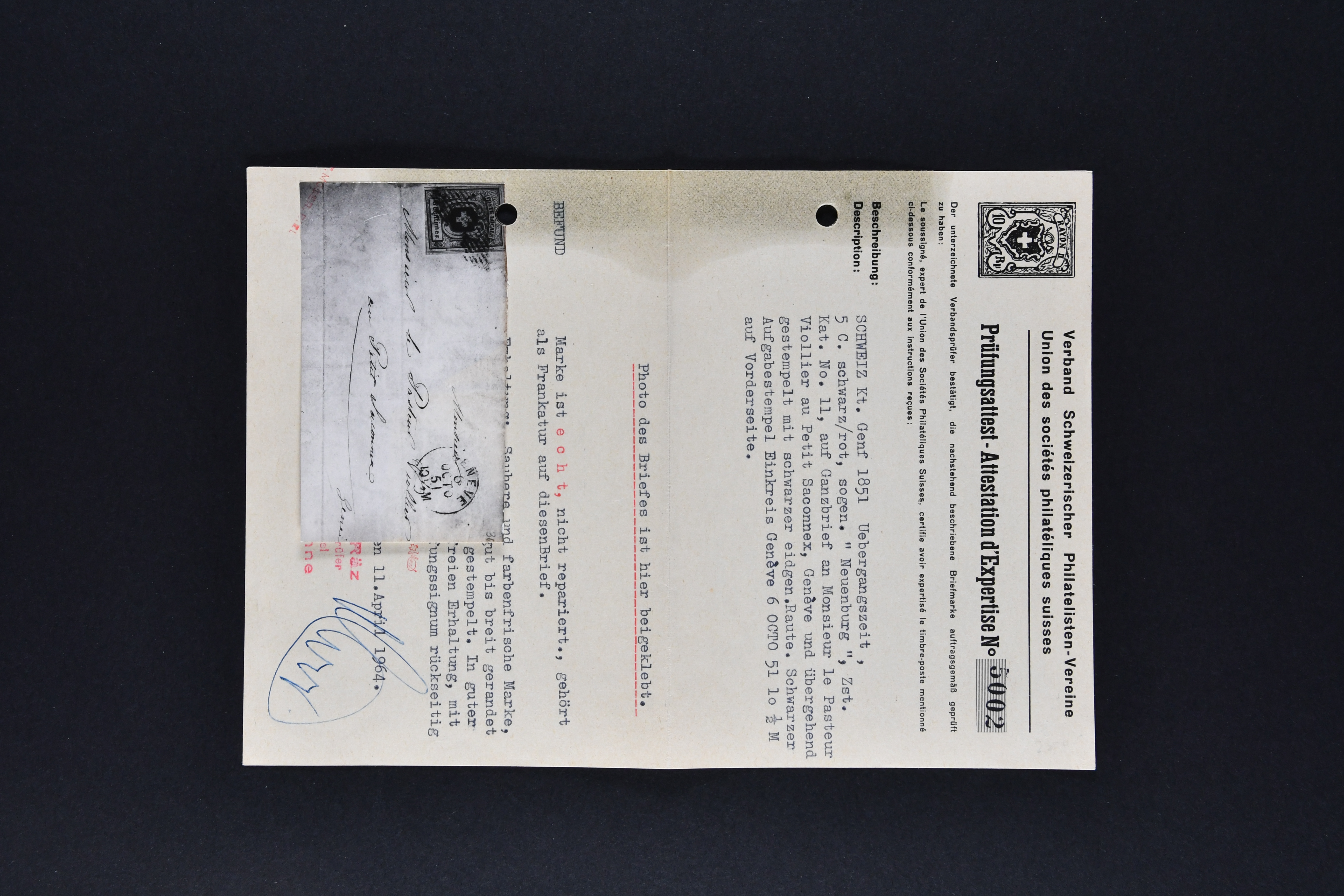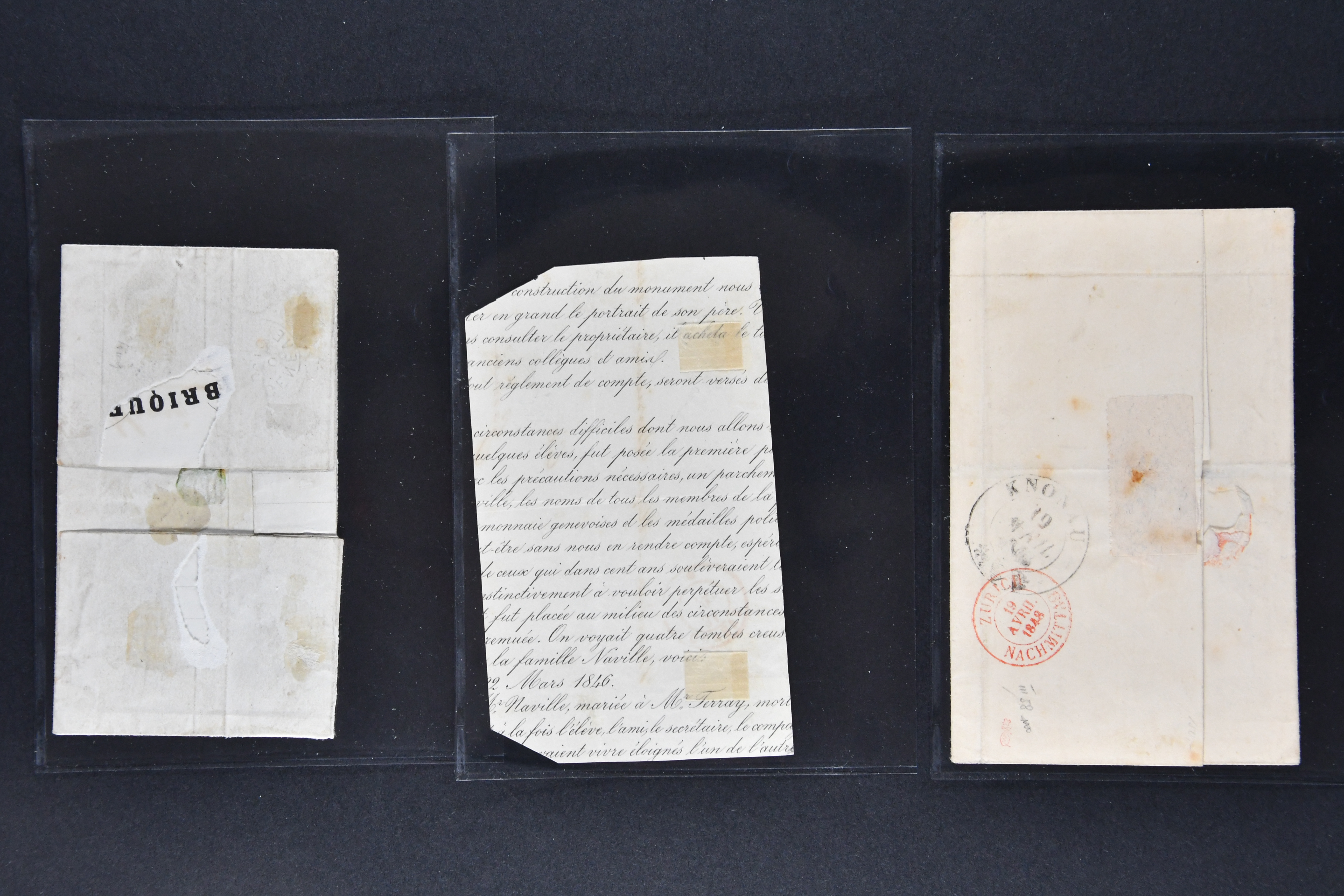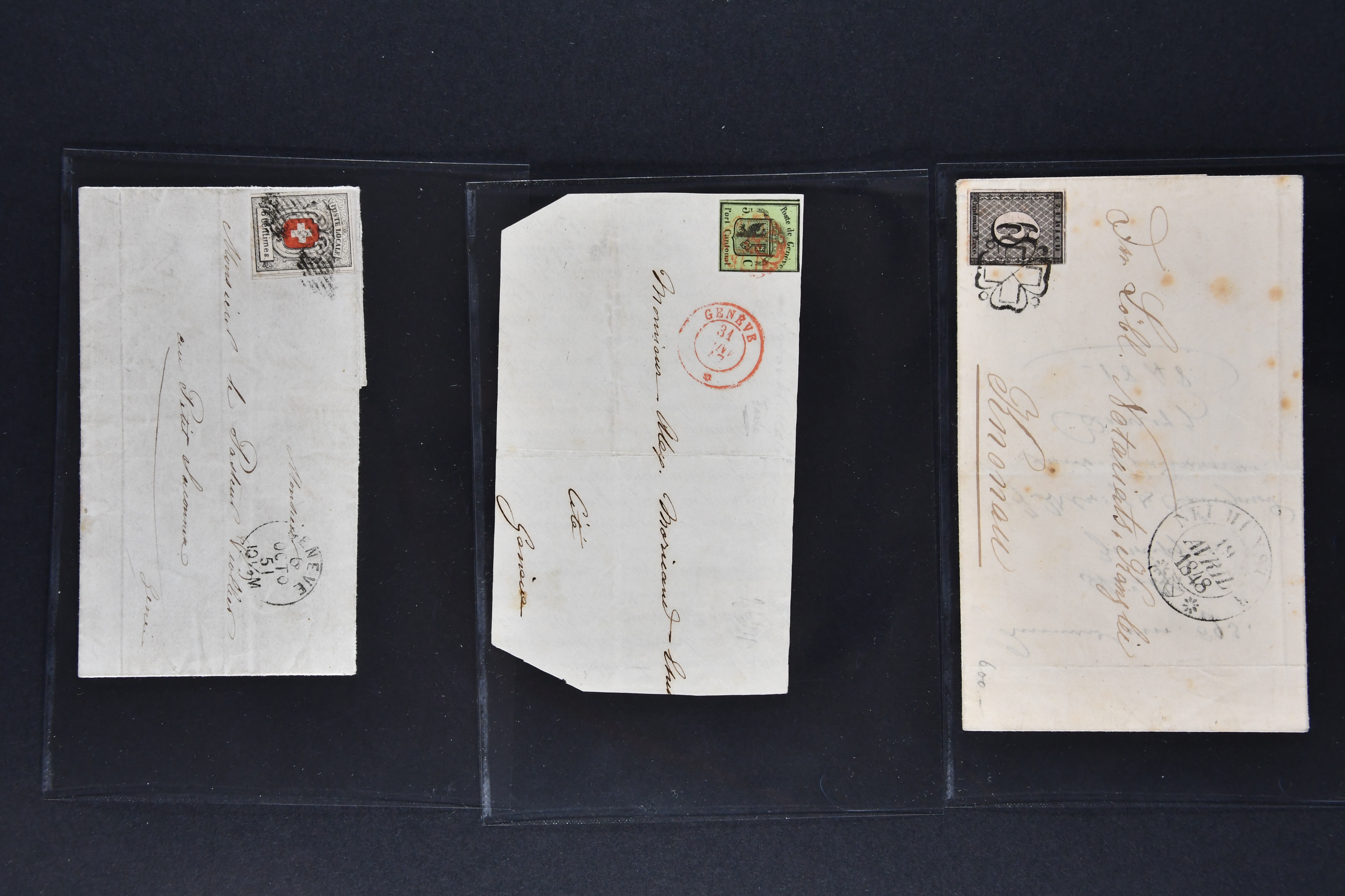 9729 cover image1843/50: Bemerkenswertes Lot drei Kantonalmarken-Frankaturen. Dabei Zürich 6 mit waagr. Unterdrucklinien (SBK 2W), Type III, die 58. Marke des Hunderterbogens, klar und übergehend entw. mit schön ausgeprägter schwarzer Zürcher Rosette (AW 1) mit nebenges. gr. Zierkreisstp. "NEUMÜNSTER 19 AVRIL 1848" auf vollst. Faltbrief nach Knonau, Kl. Adler (SBK 5) mit Randlinie der linken Nebenmarke auf Briefvorderseite in der Stadt und Neuenburg (SBK 11) auf vollst. Faltbrief von Genf nach Le Petit-Saconnex. Leicht unterschiedliche Erhaltung; drei Atteste. SBK=CHF 20'000+ (Image 1) (Image 2) (Image 3) (Image 4) (Image 5)
