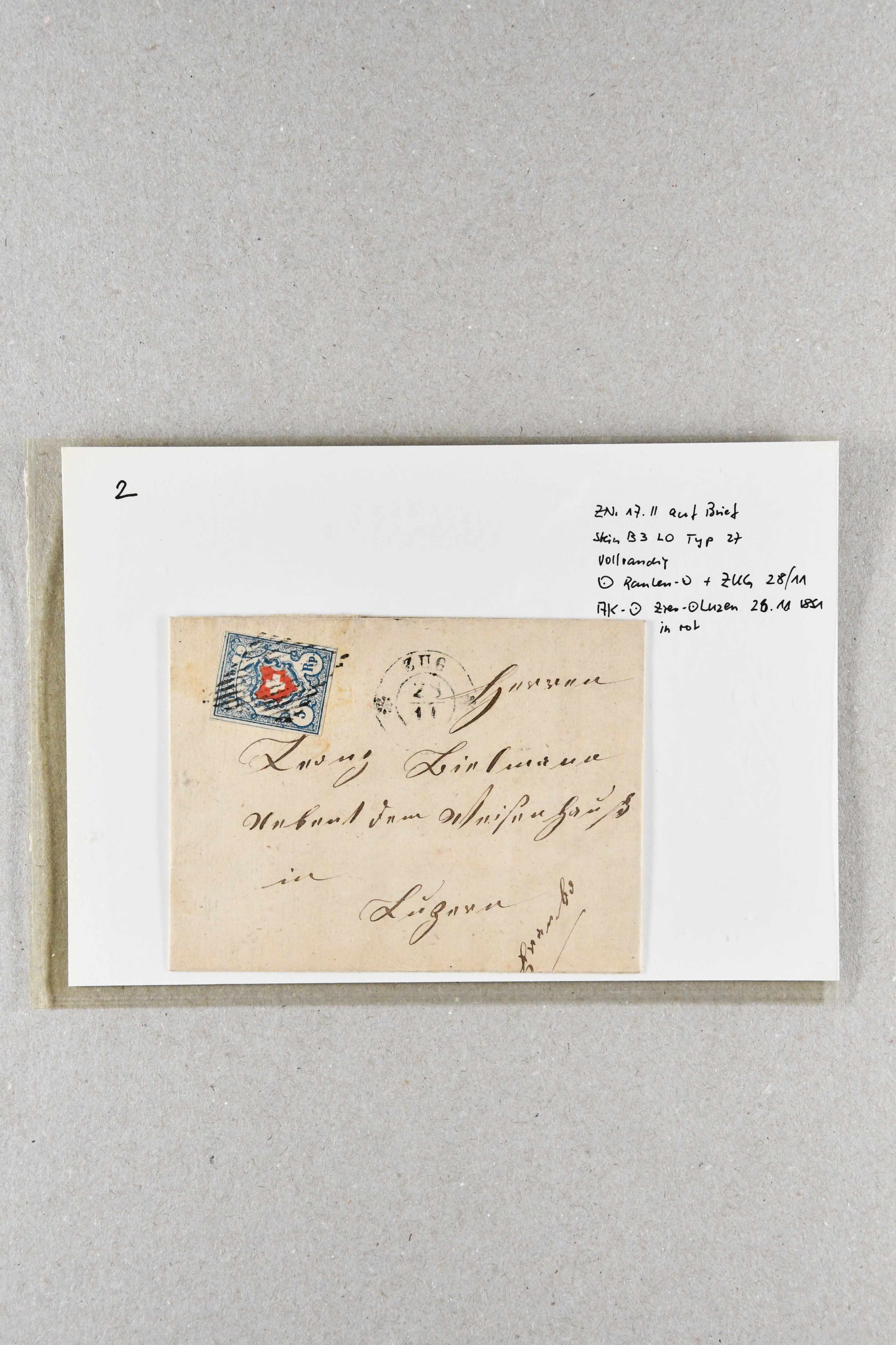 9740 image1850/54: Lot 13 lose, jeweils vollrandige Rayon-Marken, dabei schöne Nr. 15 Cts. Nr. 19 sign. Brun und 15 Rp. Nr. 20 mit Befund und signiert Moser. Dazu ein Brief mit 5 Rp. 17II B3LO von ZUG n. LUZERN (Image 1) (Image 2) (Image 3) (Image 4)