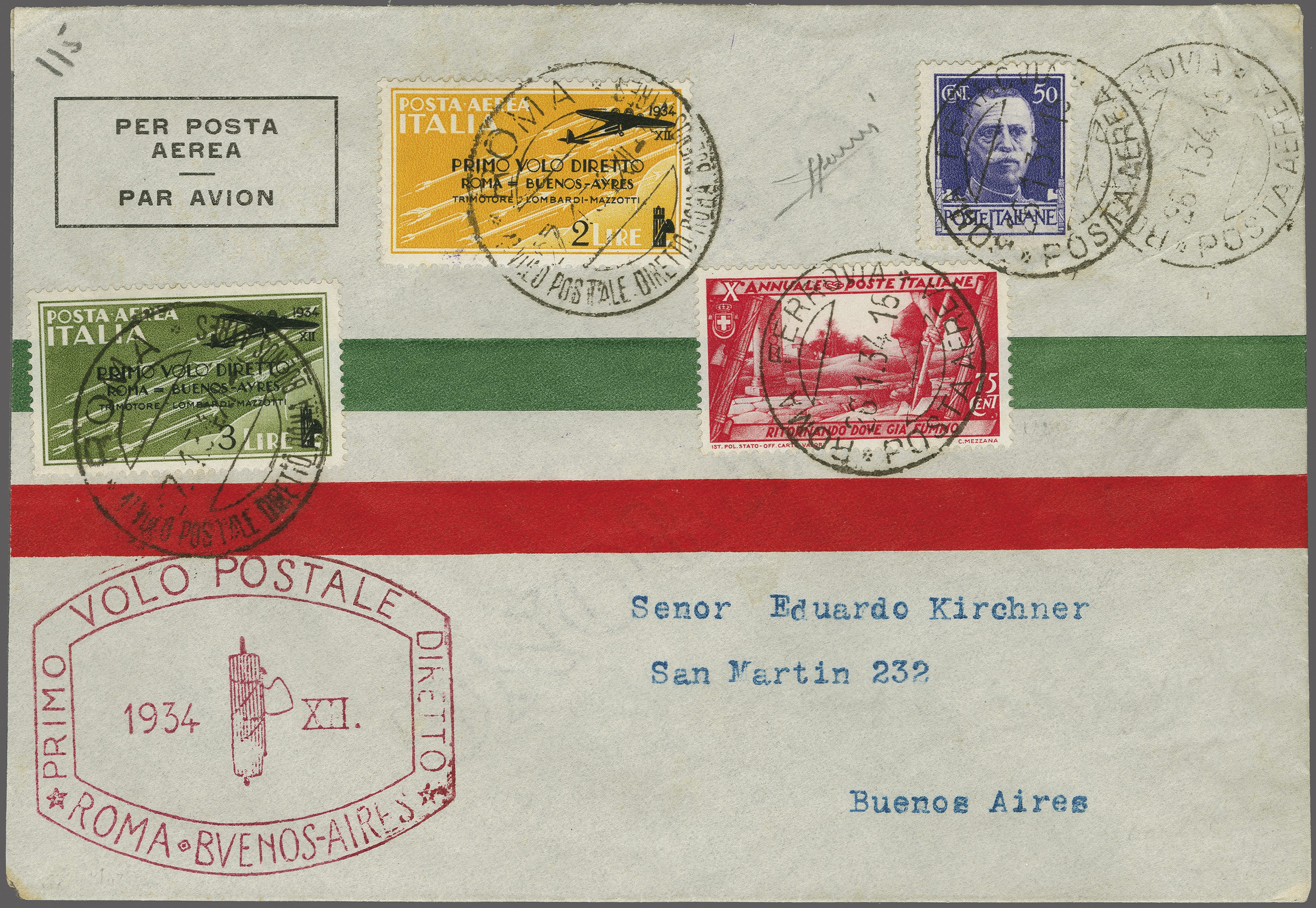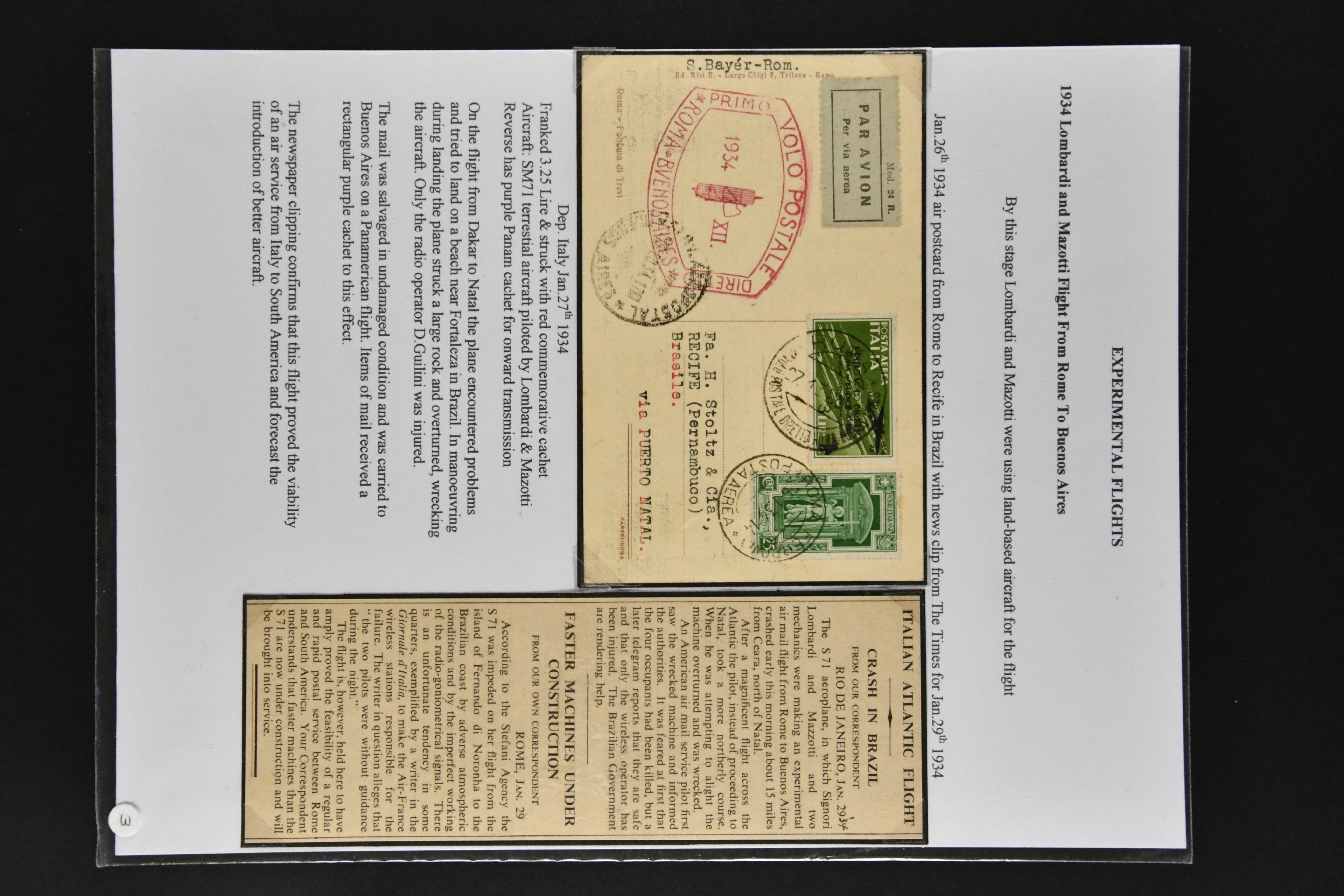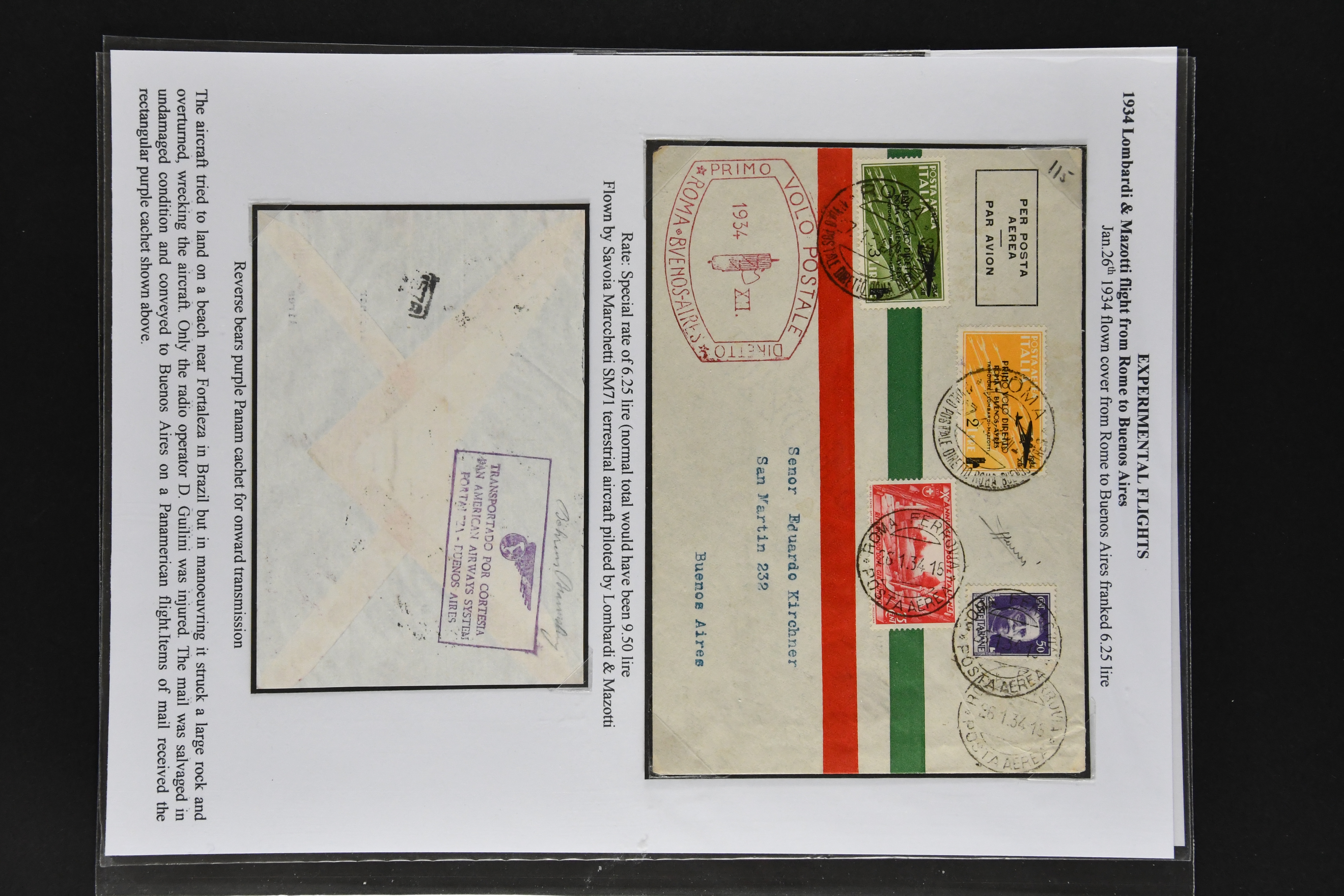 1465 cover imageFrancis Lombardi 'Primo Volo Diretto Roma - Buenos Aires' 1934 (Jan. 24): Registered envelope franked at 6.25 L. special rate overprinted 'Primo volo diretto Roma - Buenos Aires' 2 L. and 3 L. with adjacent special cachet: "ROMA 1o VOLO DIRETTO ROMA - BUENOS AIRES" in dark red alongside and on reverse boxed PANAM cachet in violet, in addition postcard franked with 25 c. and flight issue 3 L.to Recife Brasil with Buenos Aires arrival mark (Feb. 2.). On the flight from Dakar to Natal the plane encountered problems and tried to land on a beach near Fortaleza in Brazil. The salvaged mail was carried to Buenos Aires on a Panamerican flight, mounted on album pages with a newspaper clip confirming the crash in Brazil Longhi 3068 = R1, Sassone GP 64, Nierinck 340128a (Image 1) (Image 2) (Image 3) (Image 4)