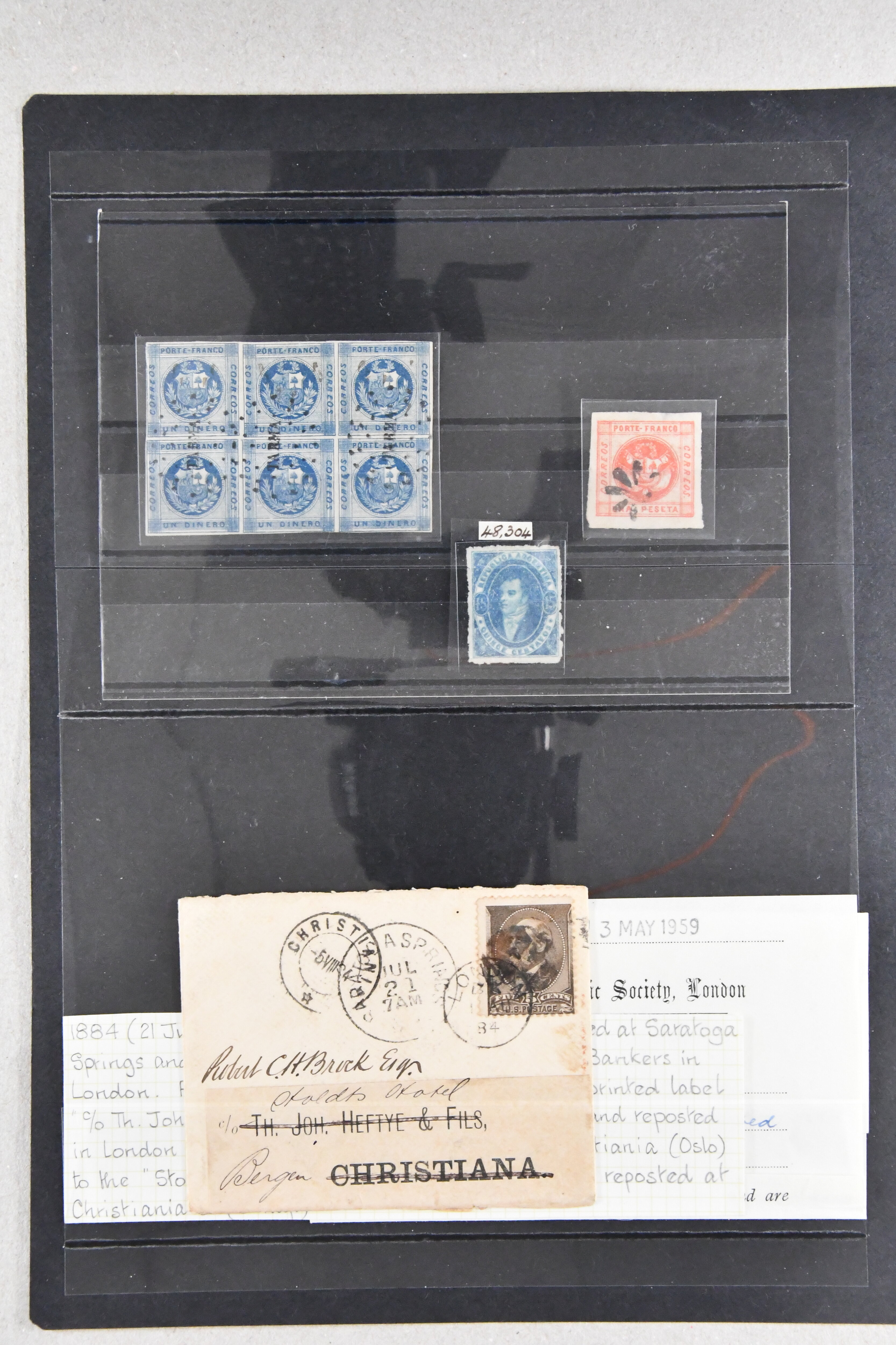 1462 image1858/84ca: Lot eight primarily used adhesives and two Latim America covers incl. Argentina Federation 1858 5 c. red tied by fancy "SALTA / FRANCA" handstamp to 1858 cover to Rosario de Santafee; Argentina Republic 1864 Rivadavia 15 c. blue on ribbed paper unused; Buenos Aires 1859 1 p. blue tied by oval grill to cover to Goya; Peru 1858 1 p. red, 1860/61 1 d. blue in a block of six cancelled by dotted TARMA handstamp in black; in addition USA 5 c. letter rate from Saratoga Springs to London, re-directed three times between London and Christiania, Norway (Image 1) (Image 2)