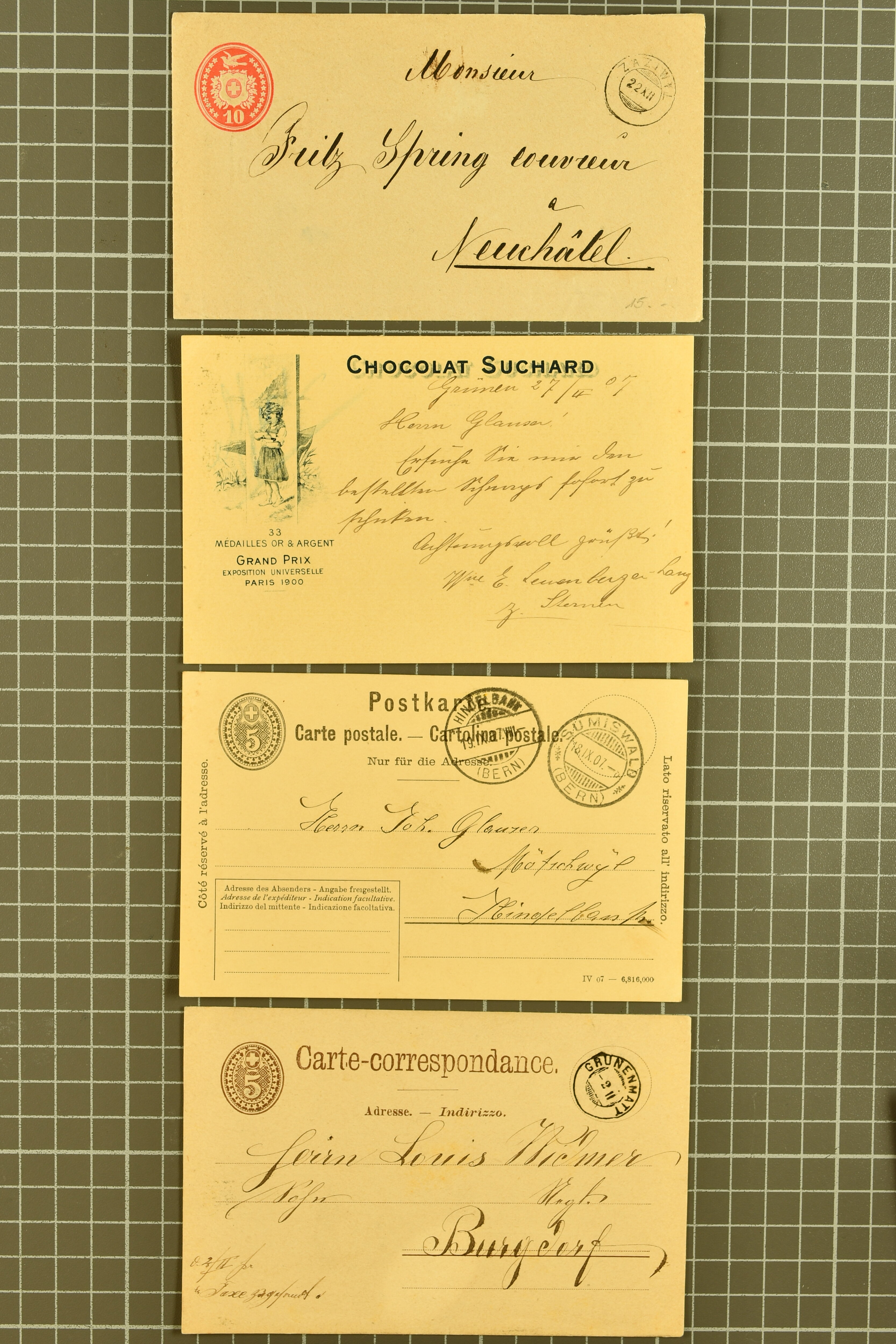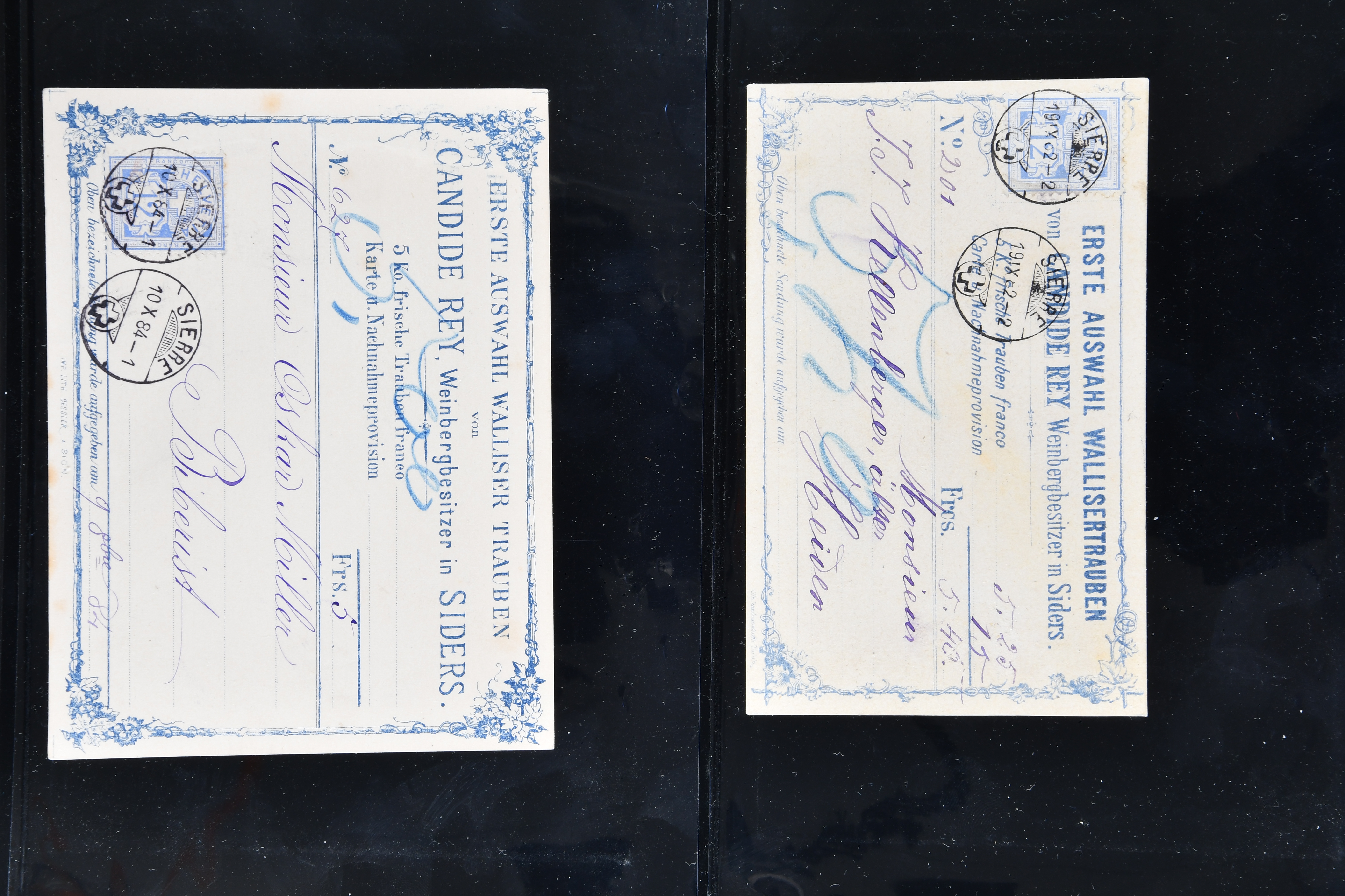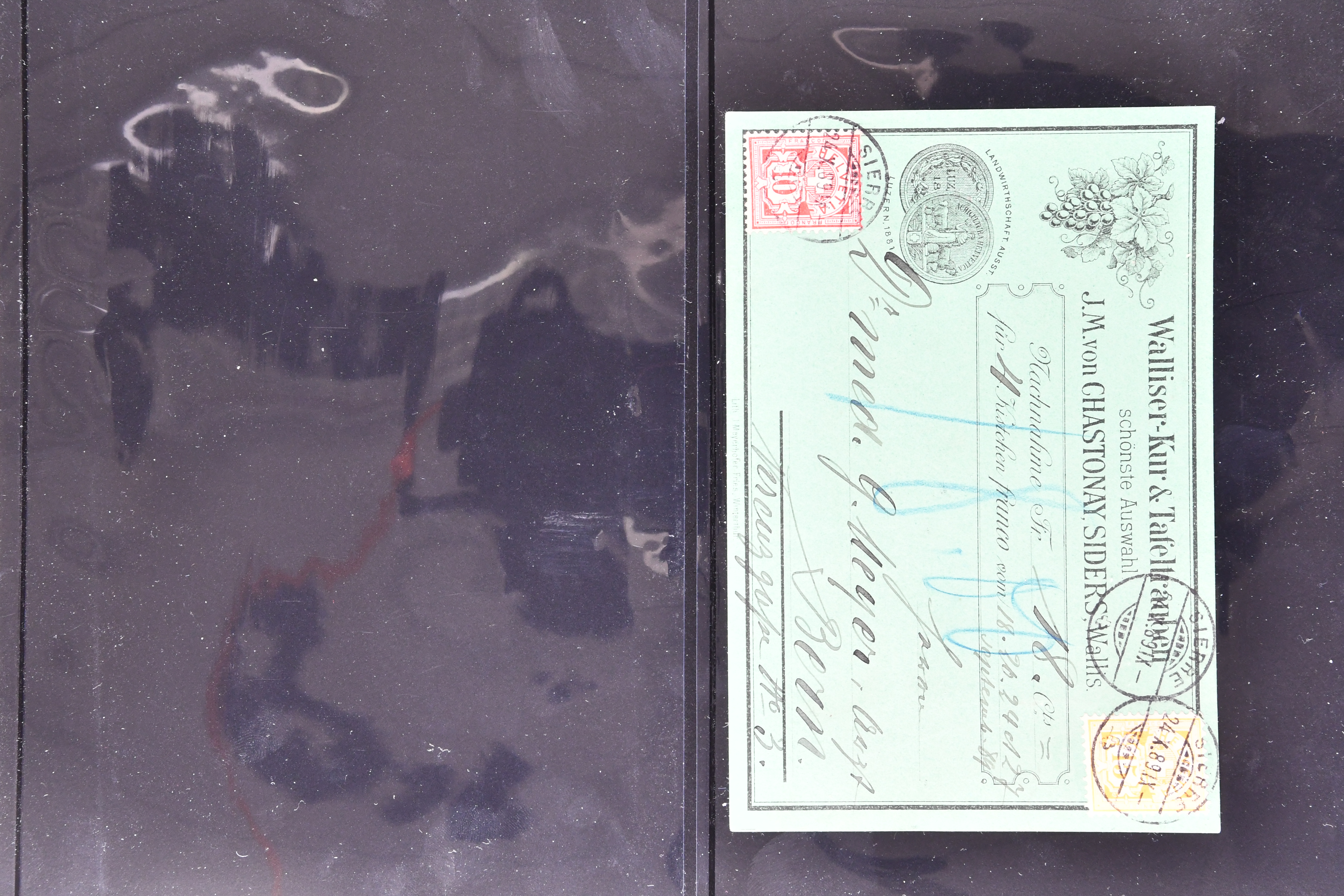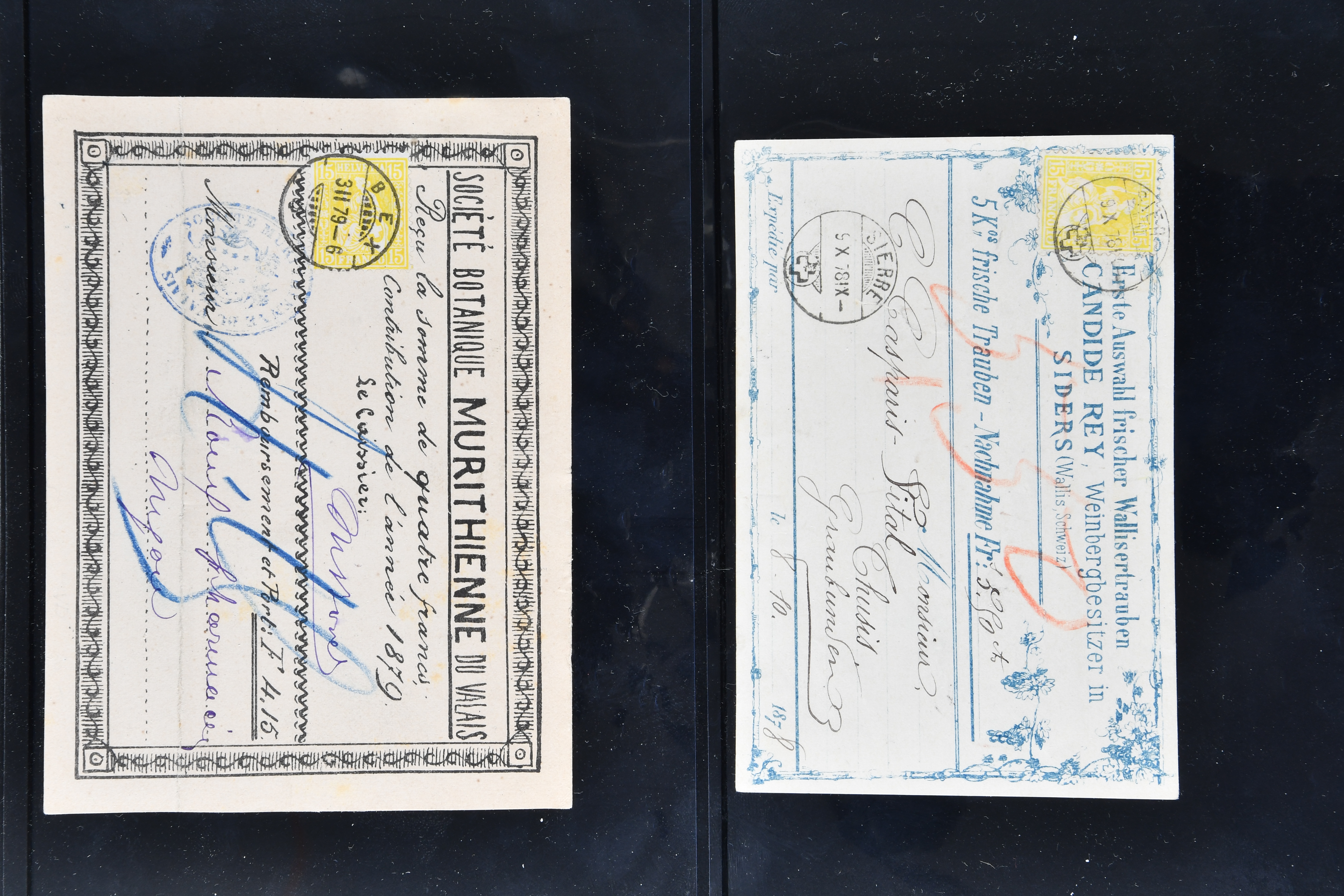 9867 cover image1878/89: Lot fünf illustrierte Nachnahme-Karten aus dem Kanton Wallis. Dabei eine handgezeichnete und vervielfältigte Karte der "Société Botanique Murithienne du Valais" frankiert mit Sitzender Helvetia 15 Rp. gelb (SBK 39), ideal klar gest. "BEX 3.II.79-6" und als Postkarte mit Nachnahme über Fr. 4.15 nach Nyon adressiert, drei Karten aus der bekannten Produktion von Candide Rey "Erste Auswahl frischer Wallisertrauben" in Sierre, frankiert je einmal mit Sitzender Helvetia 15 Rp. gelb sowie Ziffermuster 12 Rp. ultramarin auf weissem resp. Faserpapier sowie eine Karte von J. M. von Chastonnay "schönste Auswahl Walliser Kur-&Tafeltrauben" in Sierre frankiert mit Ziffermuster 10 Rp. karmin und 15 Rp. gelb (SBK 61+63A) und als Postkarte mit Nachnahme über Fr. 18.50 nach Bern adressiert. Leicht unterschiedlich aber eine attraktive Zusammenstellung (Image 1) (Image 2) (Image 3)