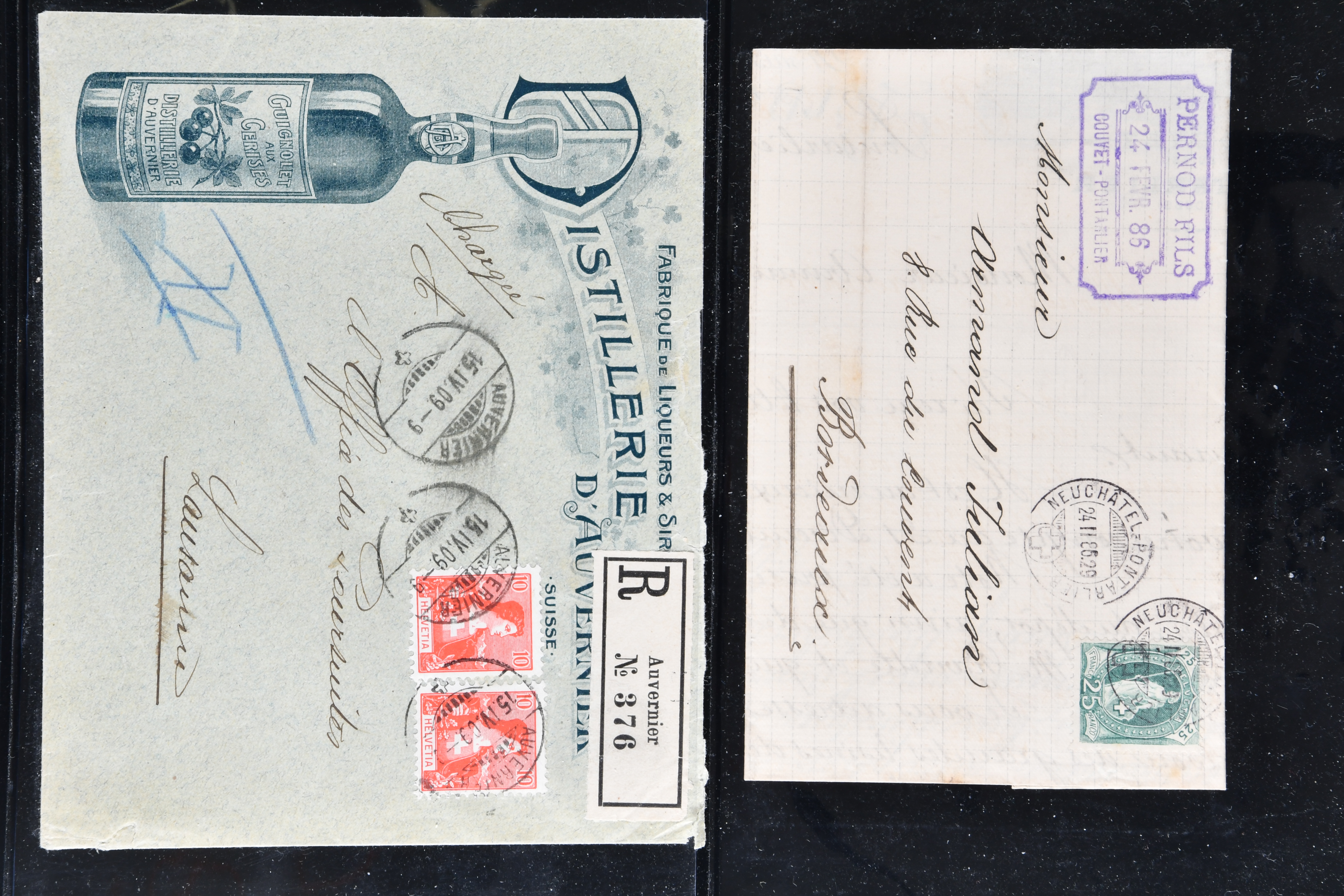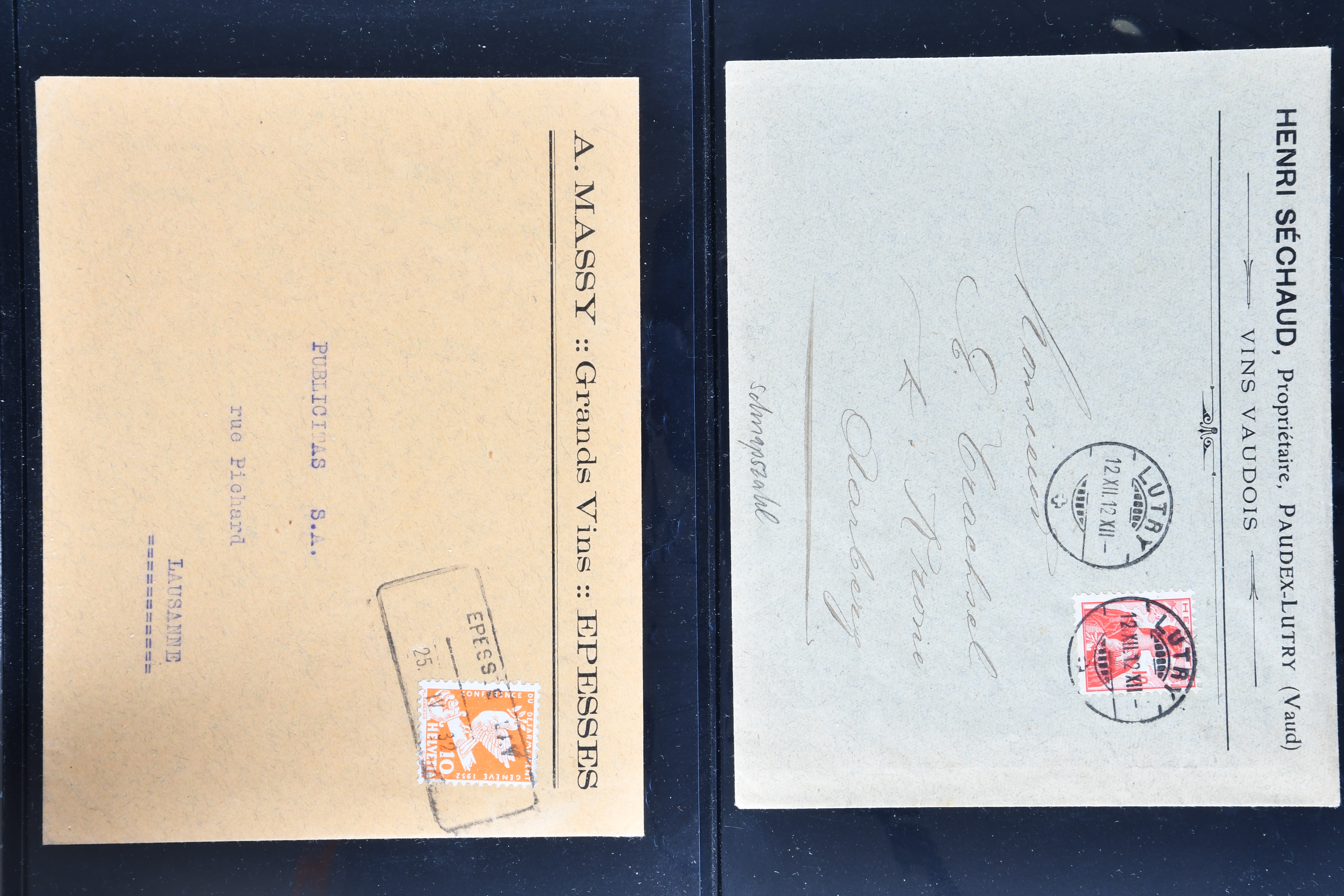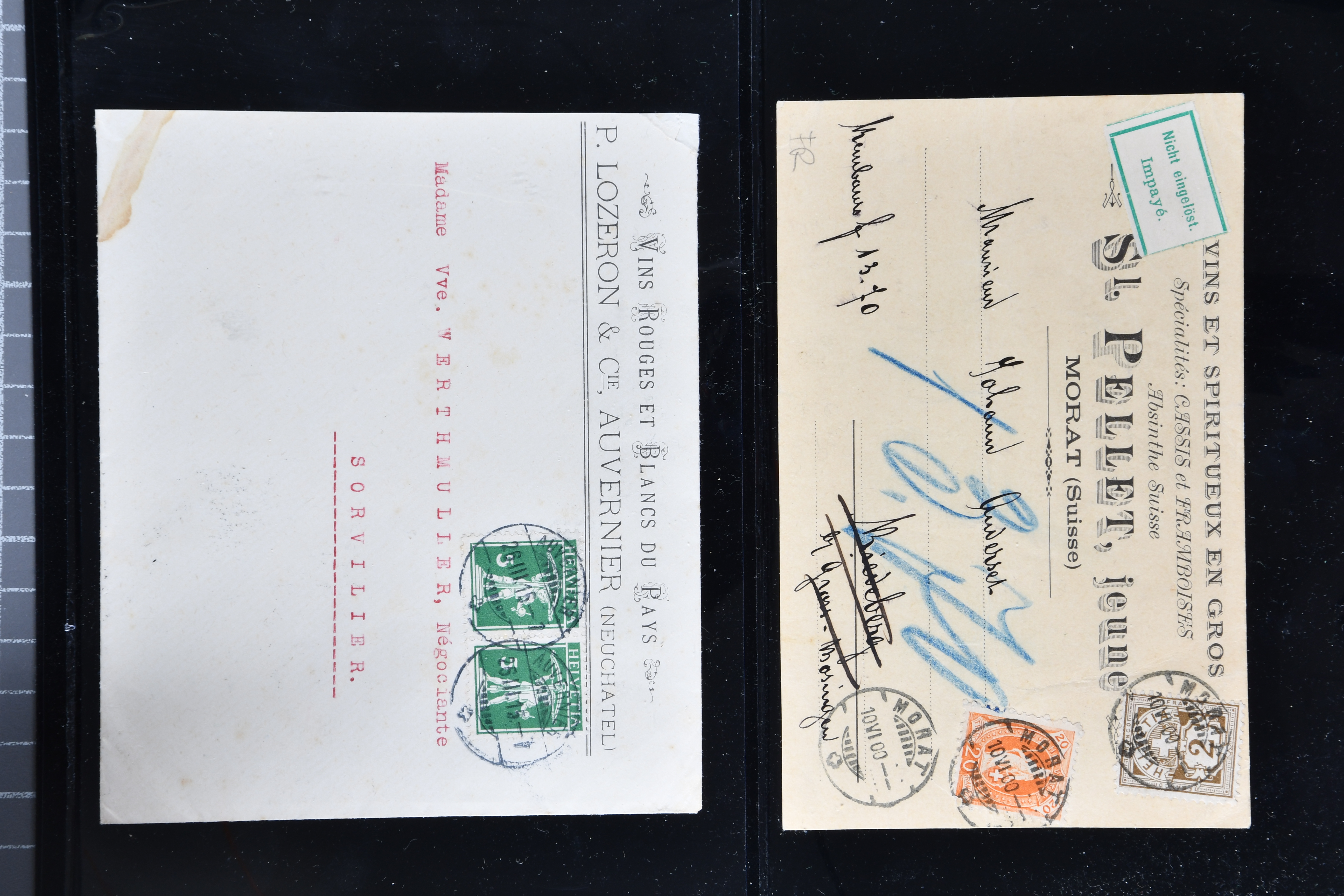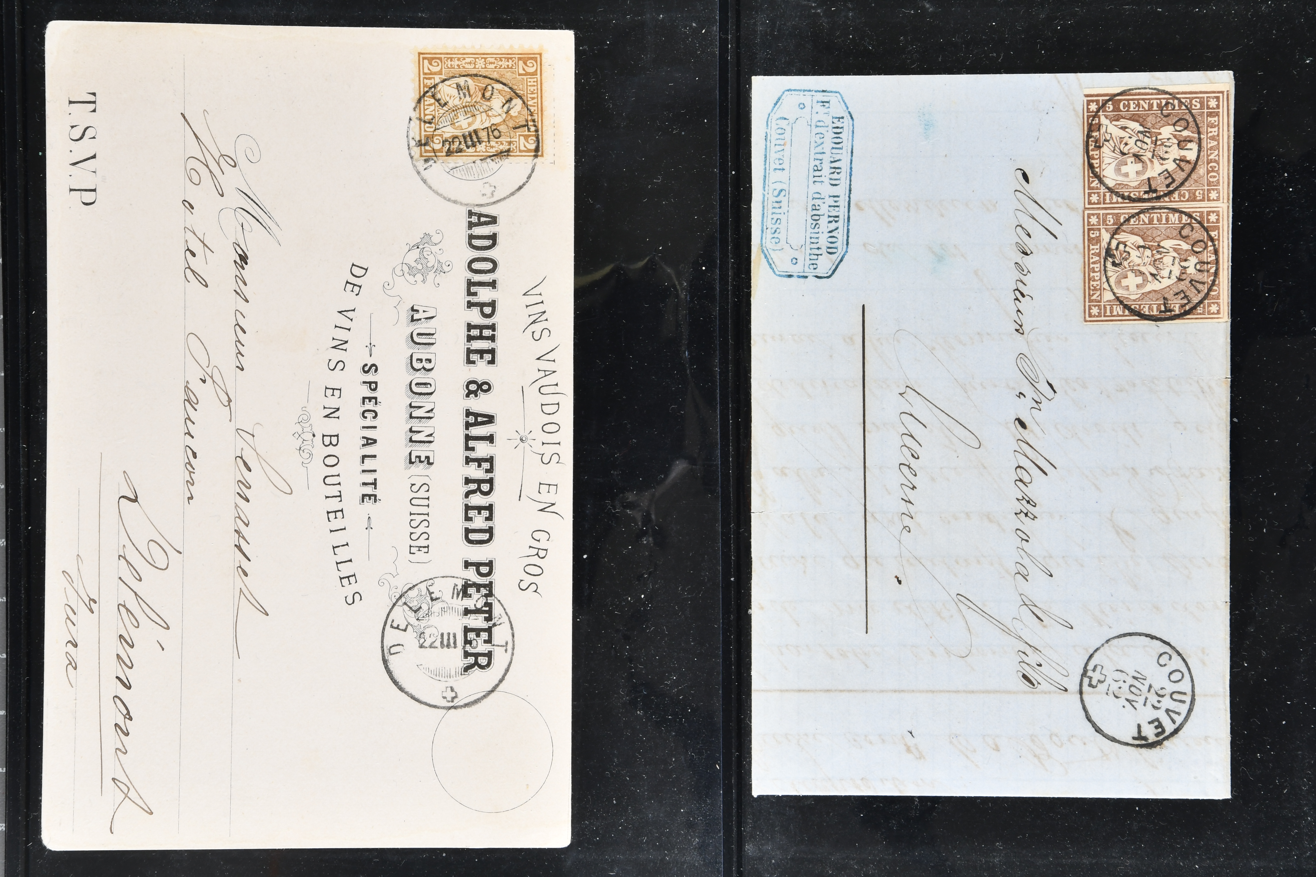 9865 cover imageWeinbau 1862/1930 (ca.): Thematische Sammlung von 23 Briefen und Karten mit Bezug zum Weinbau oder zur Schnappsbrennerei in der Romandie. Dabei Strubel 5 Rp. braun (SBK 22G) im waagr. Paar mit Bogenrand links, je ideal klar und vol aufges. entw. mit Fingerhutstp. "COUVET 22 NOV. 62" auf Faltbrief mit Absenderstp. "EDOUARD PERNOD / F.t. d'Extrait d'Absinthe / Couvet (Suisse)" in blau nach Luzern, eine frühe Postkarte (1876) von Adolphe & Alfred Peter "Vins Vaudois en gros" in Aubonne frankiert mit Sitzender Helvetia 2 Rp. oliv (SBK 37) und nach Delémont adressiert, später verschiedentlich reich illustrierte Briefe und Postkarten, Vignetten, interessante Frankaturen oder Entwertungen wie Aushilfsstp. "EPESSES 25.IV.32". Eine charmante Sammlung in ebensolcher Erhaltung (Image 1) (Image 2) (Image 3) (Image 4) (Image 5) (Image 6) (Image 7) (Image 8) (Image 9) (Image 10) (Image 11) (Image 12)