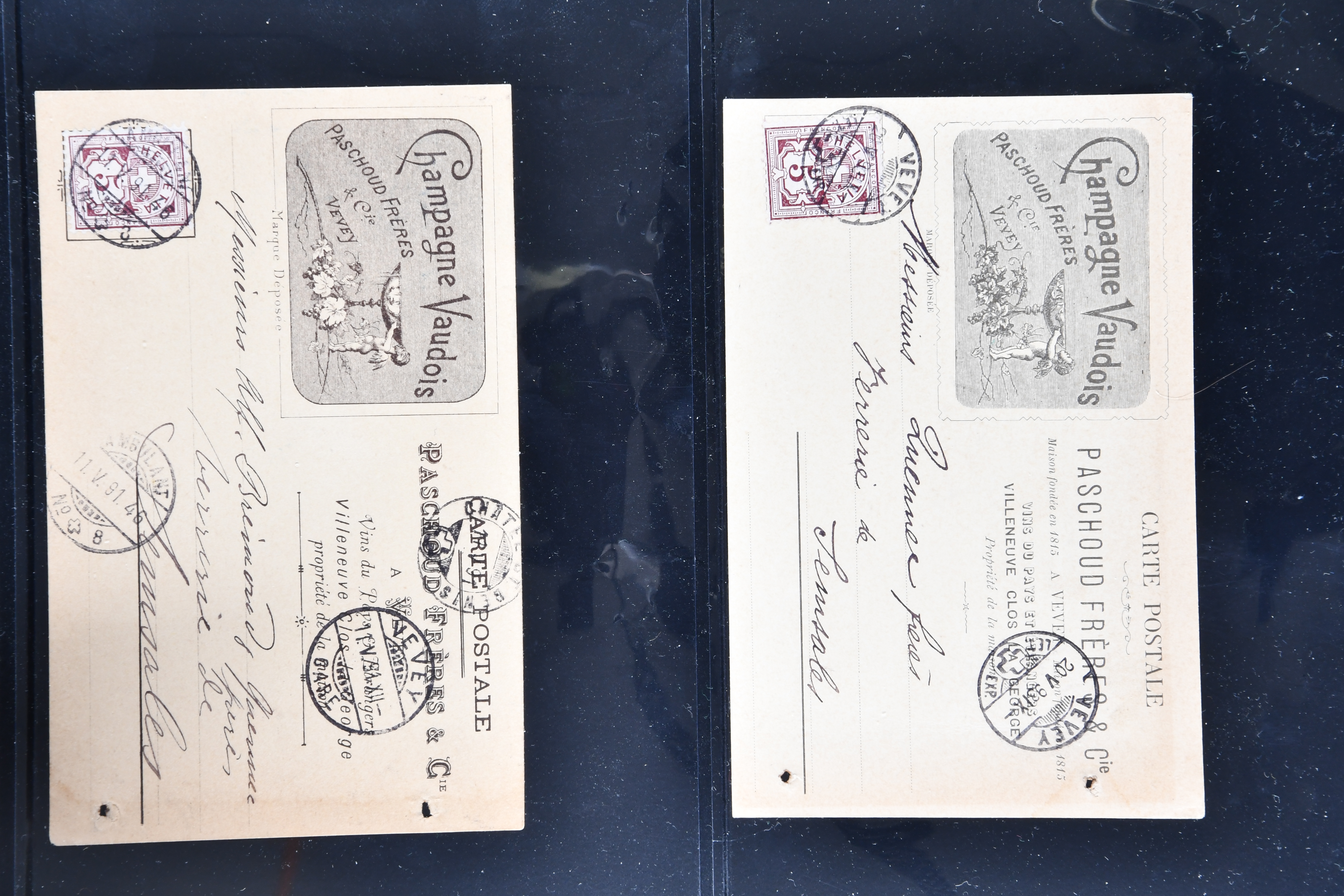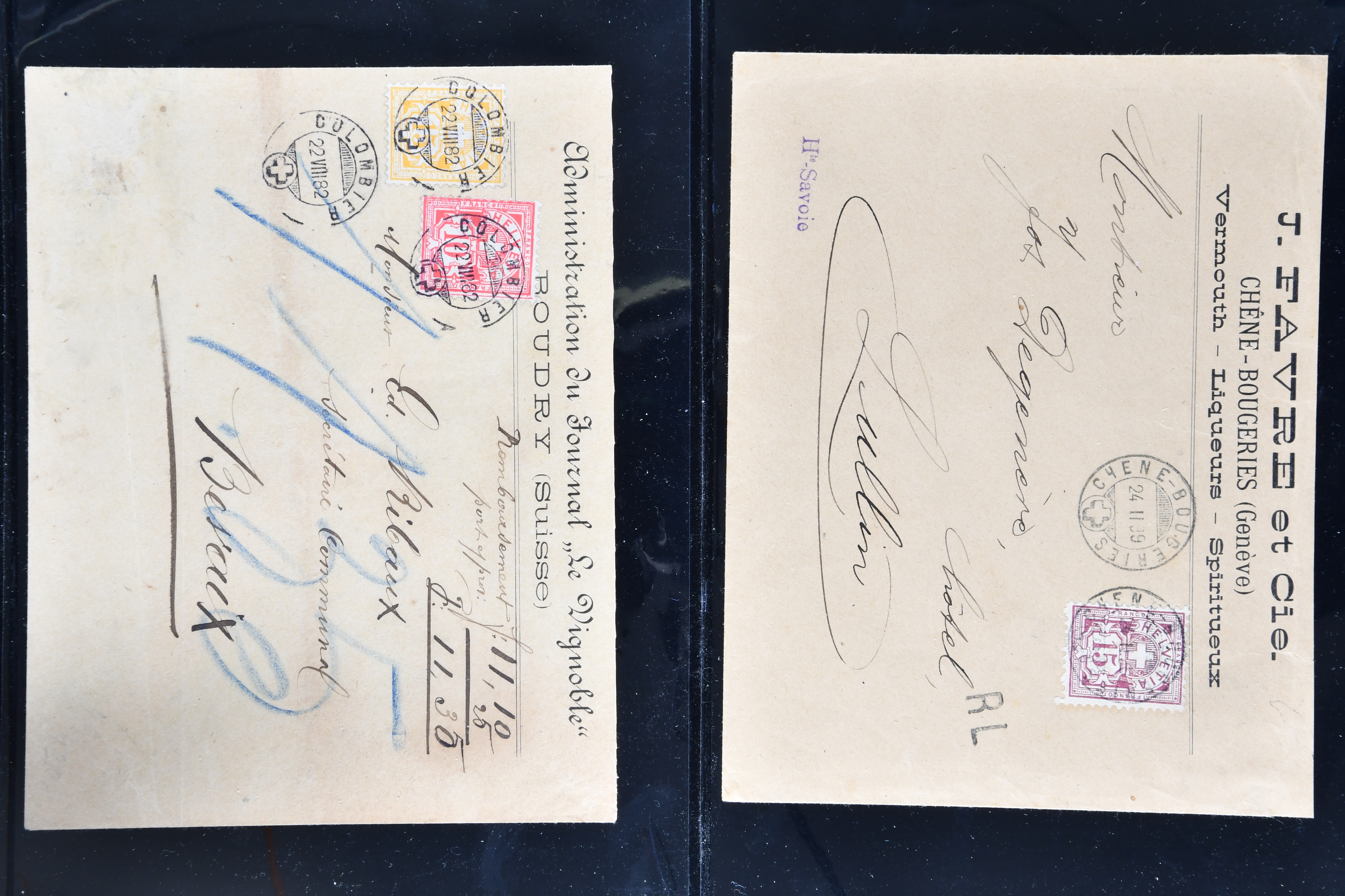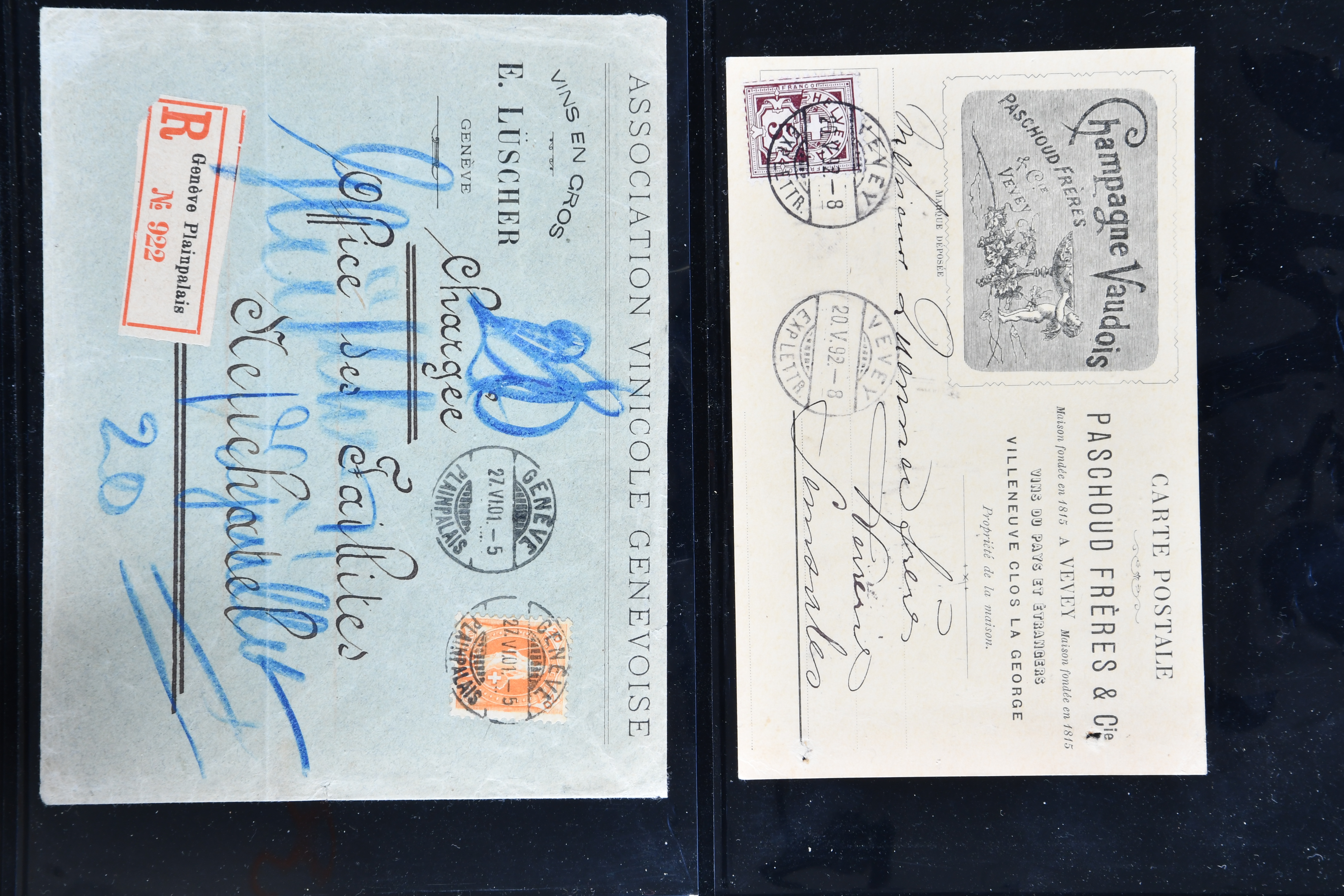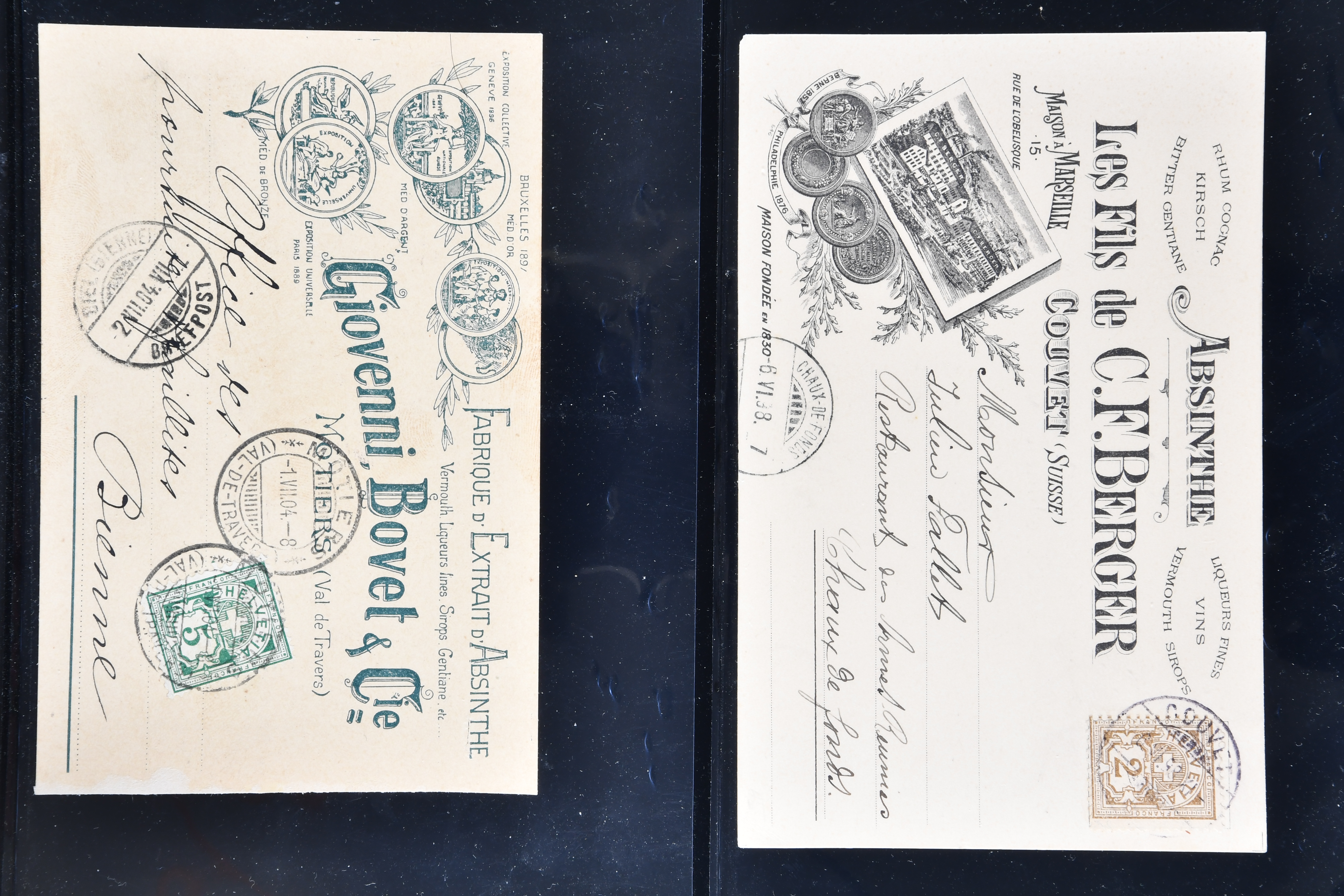 9865 cover imageWeinbau 1862/1930 (ca.): Thematische Sammlung von 23 Briefen und Karten mit Bezug zum Weinbau oder zur Schnappsbrennerei in der Romandie. Dabei Strubel 5 Rp. braun (SBK 22G) im waagr. Paar mit Bogenrand links, je ideal klar und vol aufges. entw. mit Fingerhutstp. "COUVET 22 NOV. 62" auf Faltbrief mit Absenderstp. "EDOUARD PERNOD / F.t. d'Extrait d'Absinthe / Couvet (Suisse)" in blau nach Luzern, eine frühe Postkarte (1876) von Adolphe & Alfred Peter "Vins Vaudois en gros" in Aubonne frankiert mit Sitzender Helvetia 2 Rp. oliv (SBK 37) und nach Delémont adressiert, später verschiedentlich reich illustrierte Briefe und Postkarten, Vignetten, interessante Frankaturen oder Entwertungen wie Aushilfsstp. "EPESSES 25.IV.32". Eine charmante Sammlung in ebensolcher Erhaltung (Image 1) (Image 2) (Image 3) (Image 4) (Image 5) (Image 6) (Image 7) (Image 8) (Image 9) (Image 10) (Image 11) (Image 12)