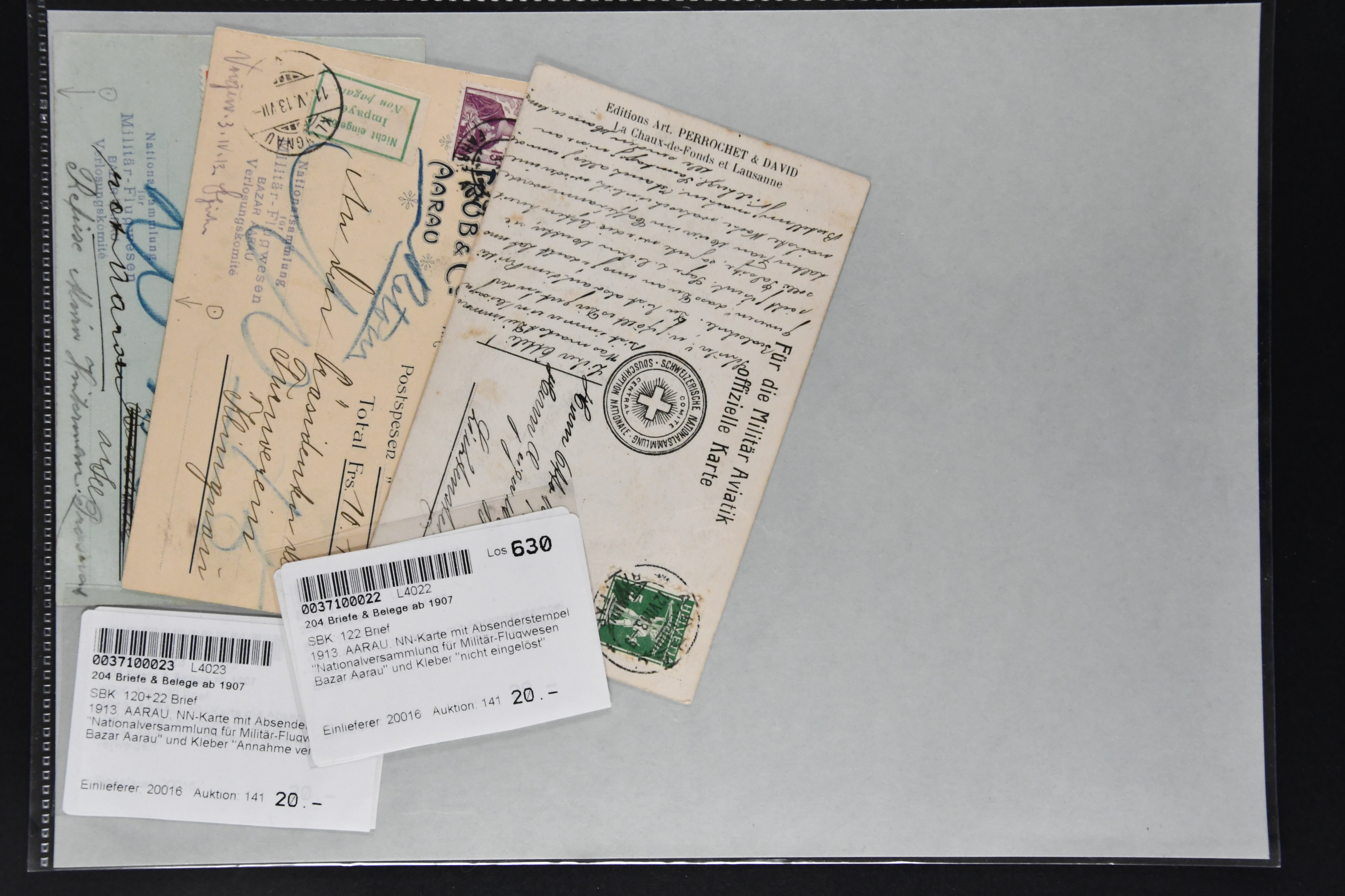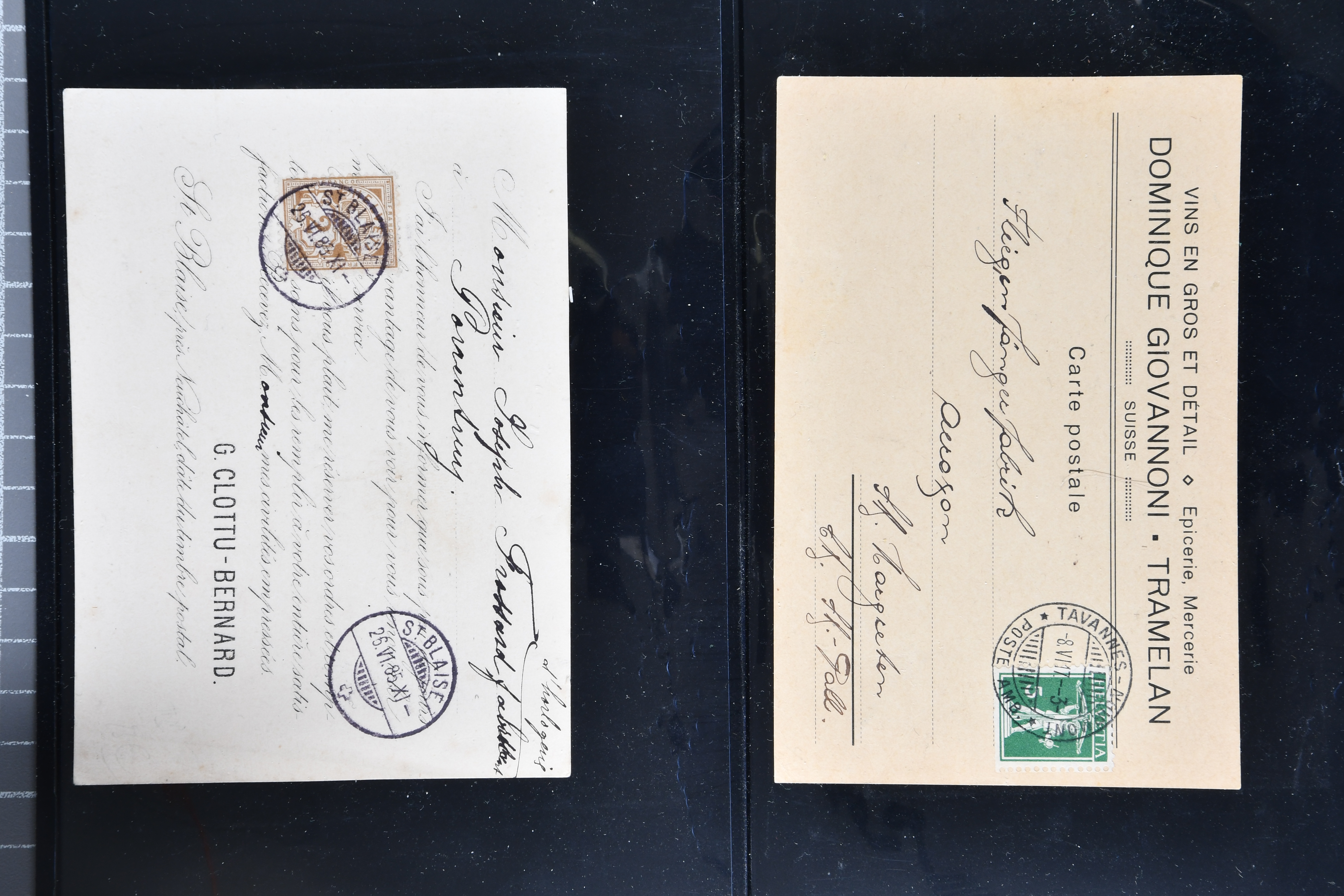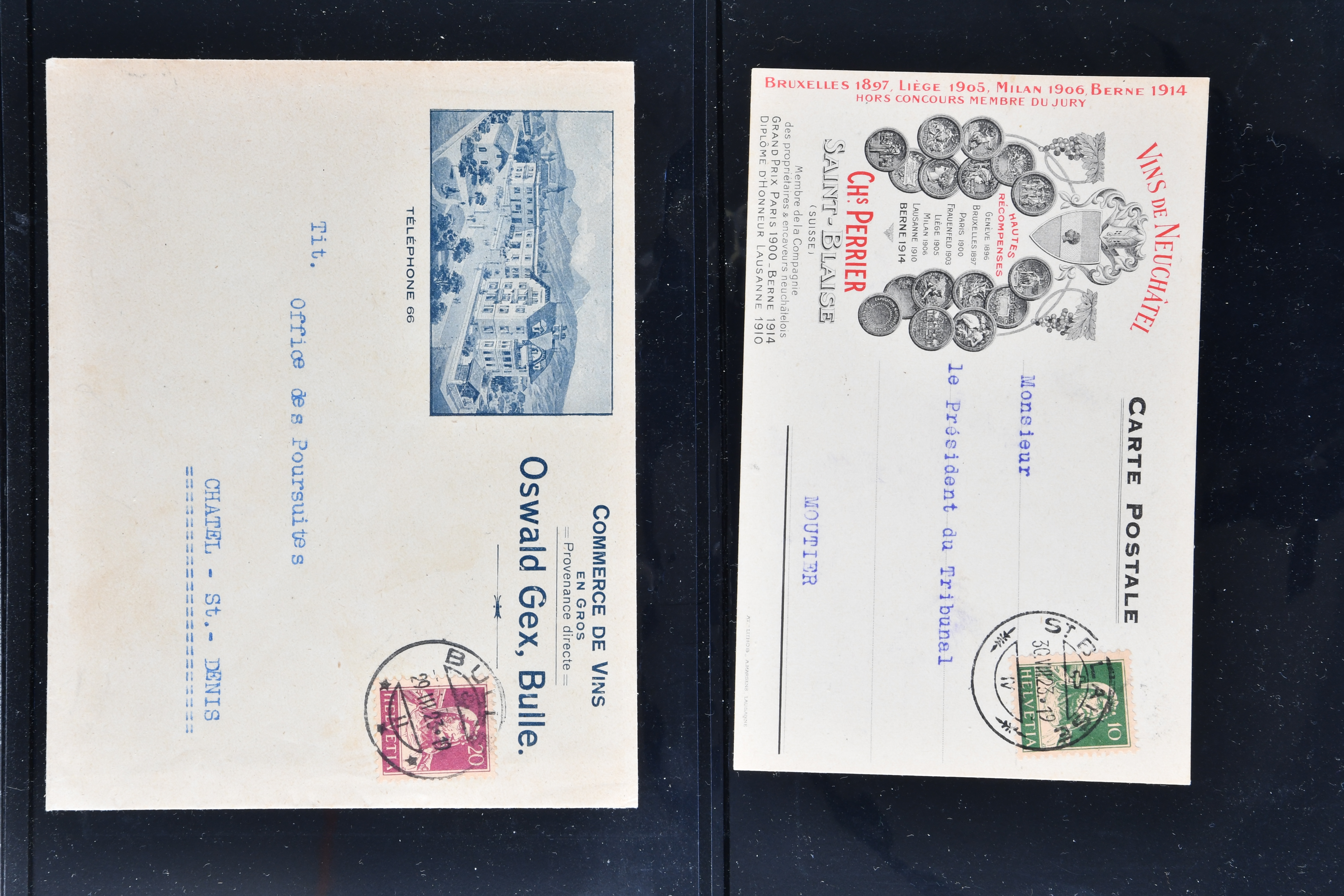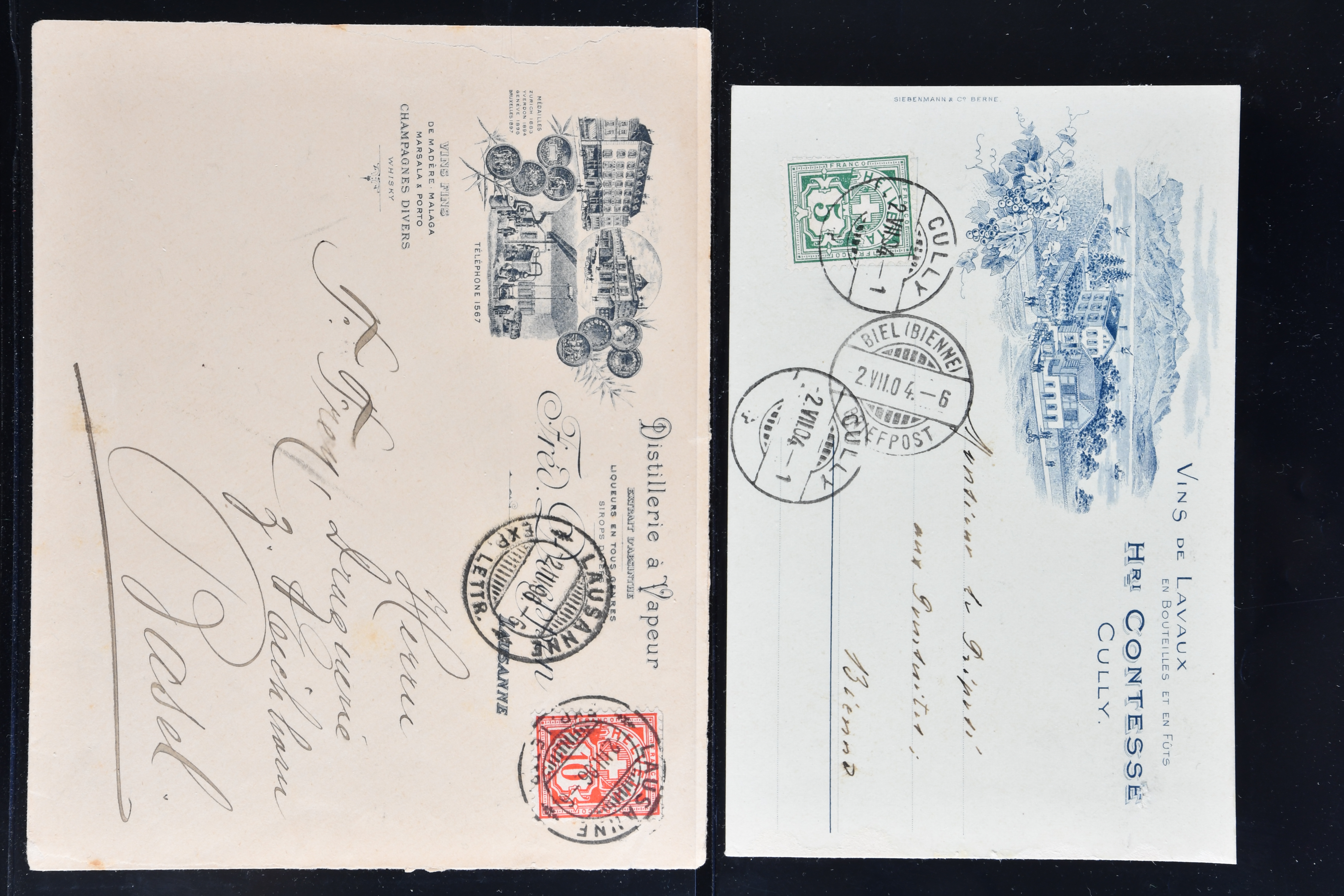 9865 cover imageWeinbau 1862/1930 (ca.): Thematische Sammlung von 23 Briefen und Karten mit Bezug zum Weinbau oder zur Schnappsbrennerei in der Romandie. Dabei Strubel 5 Rp. braun (SBK 22G) im waagr. Paar mit Bogenrand links, je ideal klar und vol aufges. entw. mit Fingerhutstp. "COUVET 22 NOV. 62" auf Faltbrief mit Absenderstp. "EDOUARD PERNOD / F.t. d'Extrait d'Absinthe / Couvet (Suisse)" in blau nach Luzern, eine frühe Postkarte (1876) von Adolphe & Alfred Peter "Vins Vaudois en gros" in Aubonne frankiert mit Sitzender Helvetia 2 Rp. oliv (SBK 37) und nach Delémont adressiert, später verschiedentlich reich illustrierte Briefe und Postkarten, Vignetten, interessante Frankaturen oder Entwertungen wie Aushilfsstp. "EPESSES 25.IV.32". Eine charmante Sammlung in ebensolcher Erhaltung (Image 1) (Image 2) (Image 3) (Image 4) (Image 5) (Image 6) (Image 7) (Image 8) (Image 9) (Image 10) (Image 11) (Image 12)