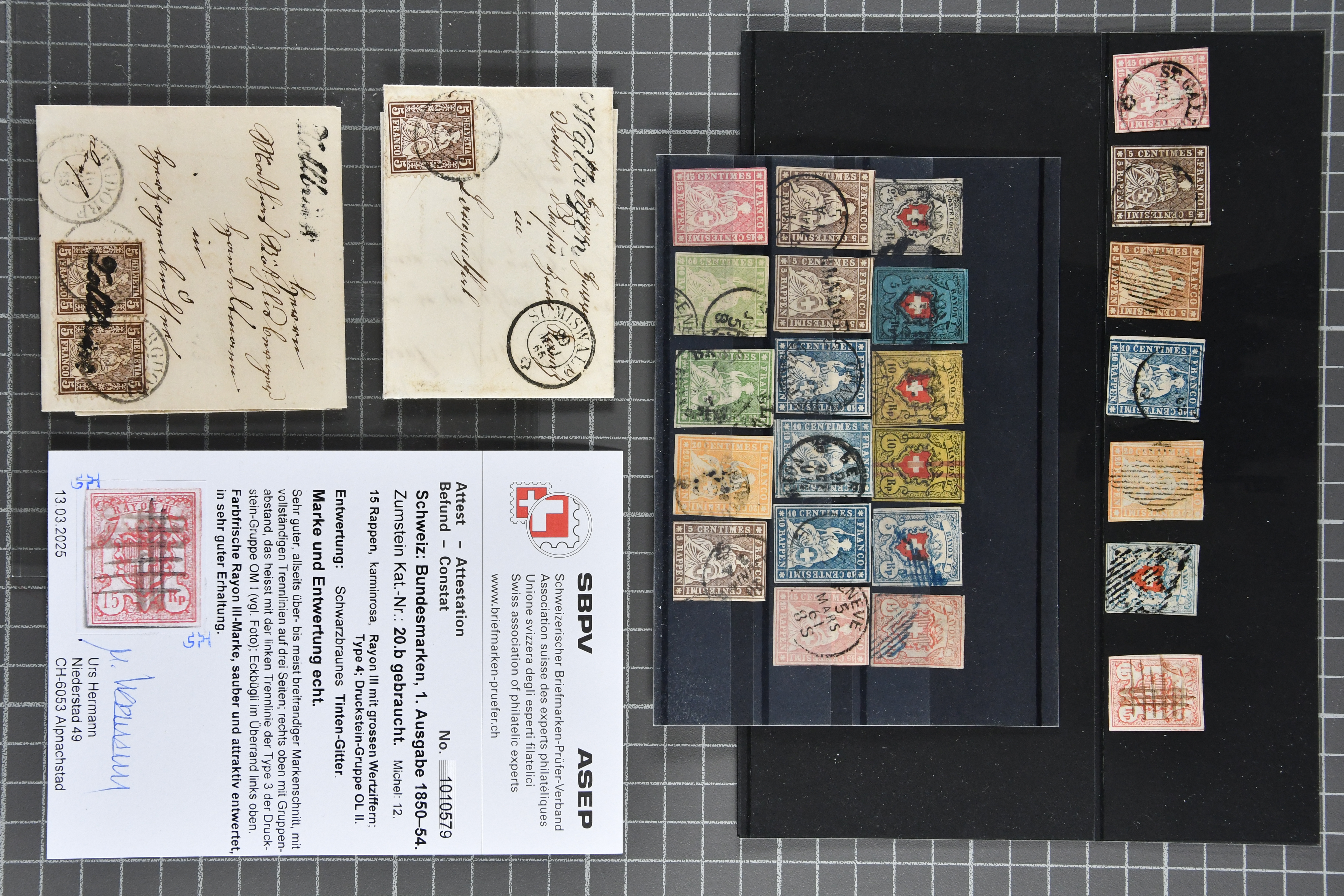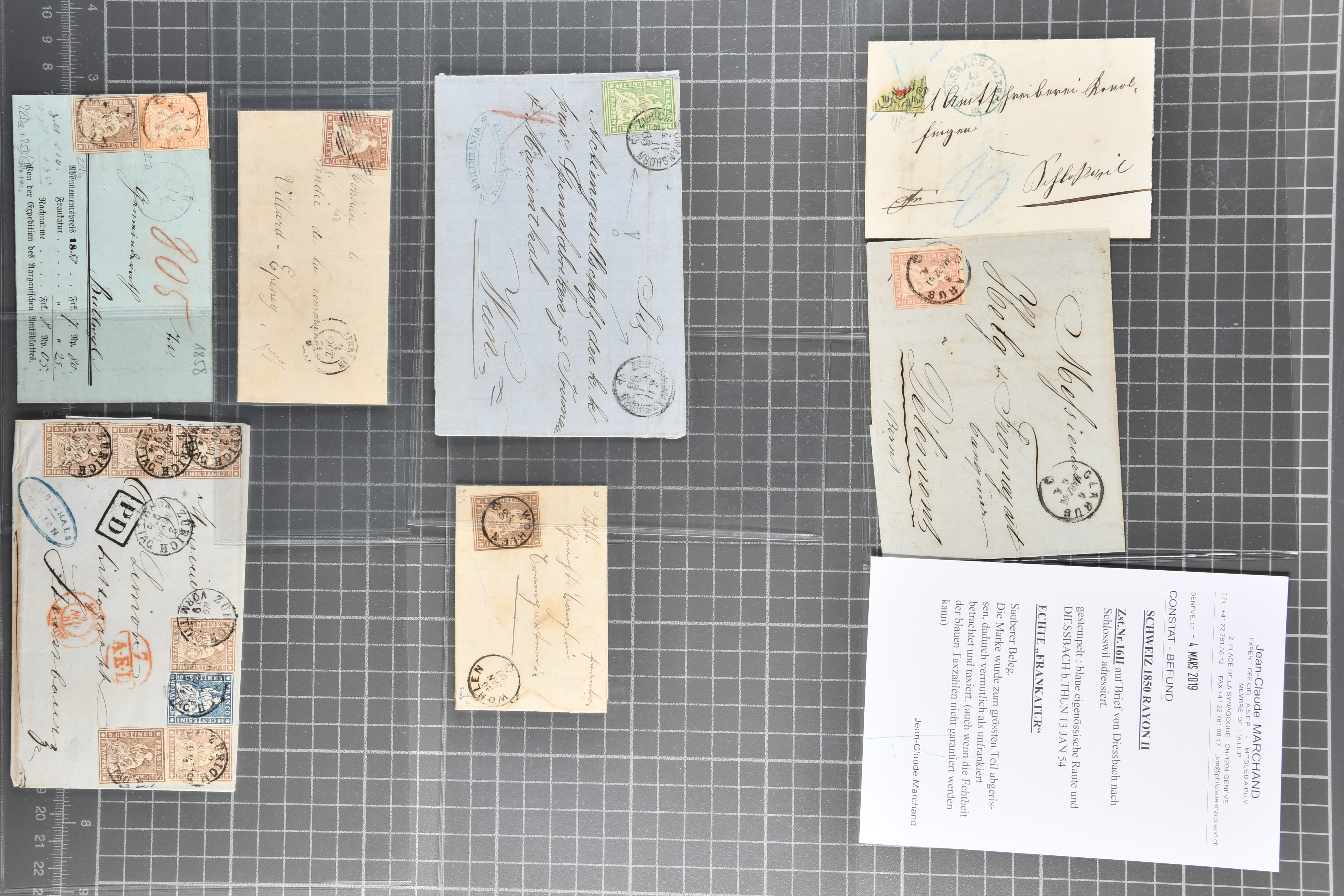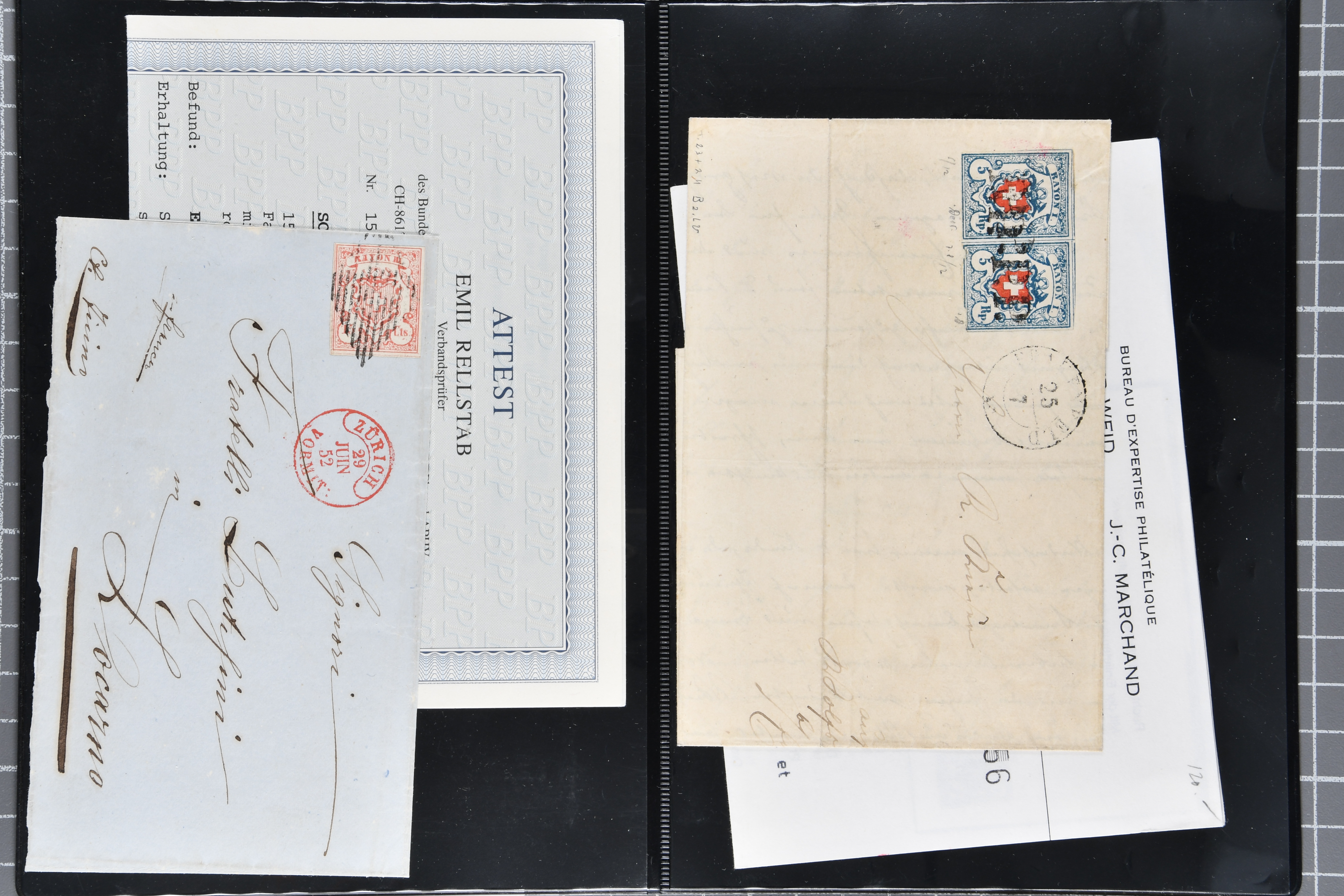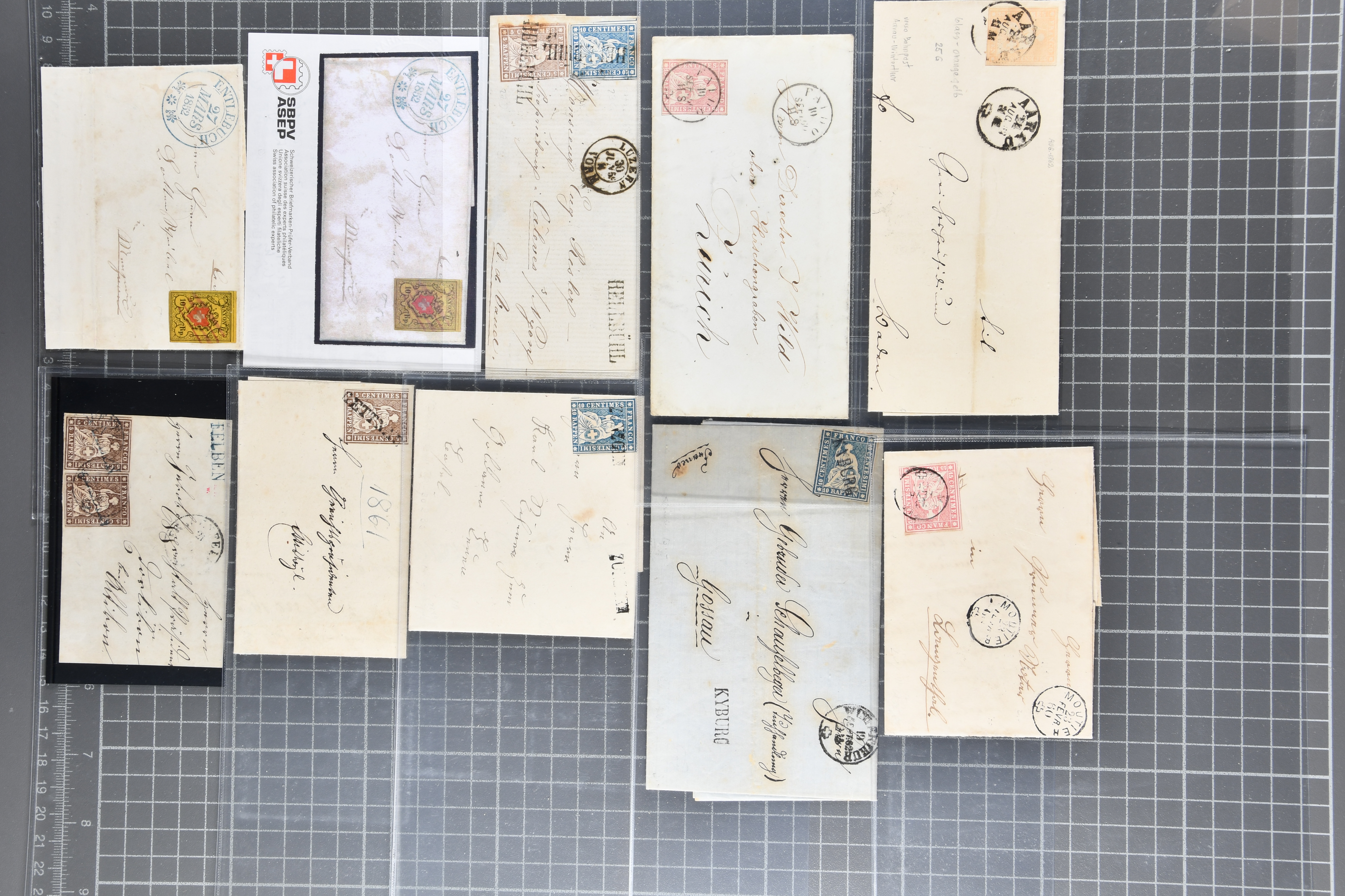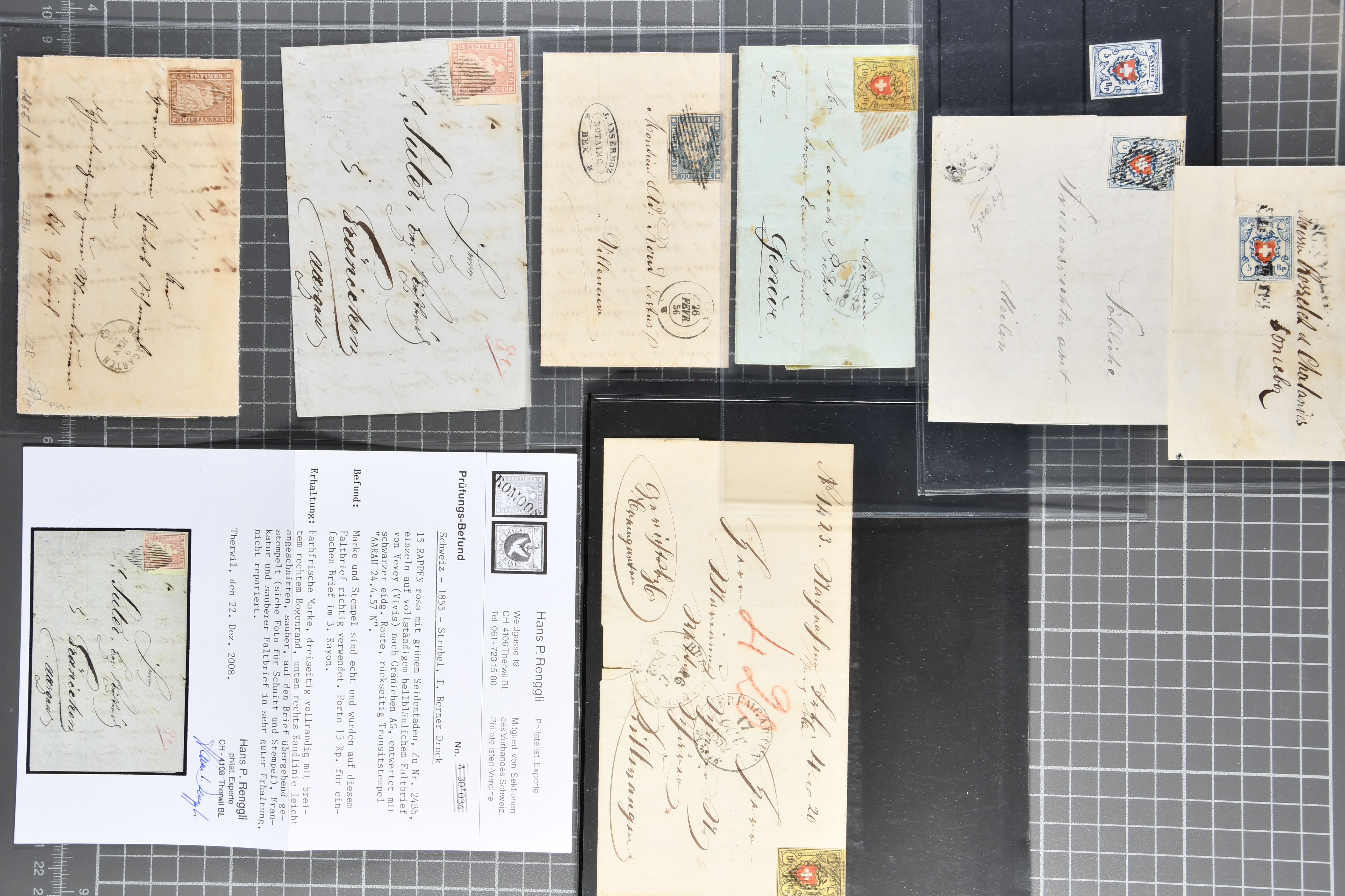 9879 cover image1850/62: Lot acht bessere Altschweiz-Frankaturen. Dabei Ortspost mit Kreuzeinfassung entw. mit schwarzer Aargauer Raute (AW 29/30) auf dekorativem Drucksachen-Streifband von Zofingen nach Niederbipp (BE), Rayon I Type 21 entw. mit schwarzem Stabstp. "BURGDORF" auf Faltbrief im 1. Briefkreis nach Langnau i.E., Rayon I hellblau (3) mit Unbekanntem Stein, Type 10 r/u mit grossem Teil der rechten Nebenmarke, klar und übergehend entw. mit blauer eidg. Raute mit nebenges. Zierlinienstempel "REINACH 5. P.K. 21 SEPT. 52" auf ungenügend frankiertem Faltbrieflein im 3. Briefkreis, nachtaxiert mit "10" Rp. in roter Tinte oder Stein B2: Typen 23+34 l/u im waagr. Paar, Rayon III, Centimes, Type 7 auf Faltbrief von Zürich nach Locarno, gr. Wertziffrer, Type 1 mit grossem Teil der linken Nebenmarke auf Faltbrieflein von Avenches nach Lausanne sowie Strubel 15 Rp. rotkarmin (SBK 24A) auf Faltbrief von Vevey nach Genf. Vereinzelt kleinere Mängel, meist aber in guter Erhaltung. Zwei Befunde, sechs Atteste. SBK=CHF 17'150 (Image 1) (Image 2) (Image 3) (Image 4) (Image 5) (Image 6) (Image 7) (Image 8)