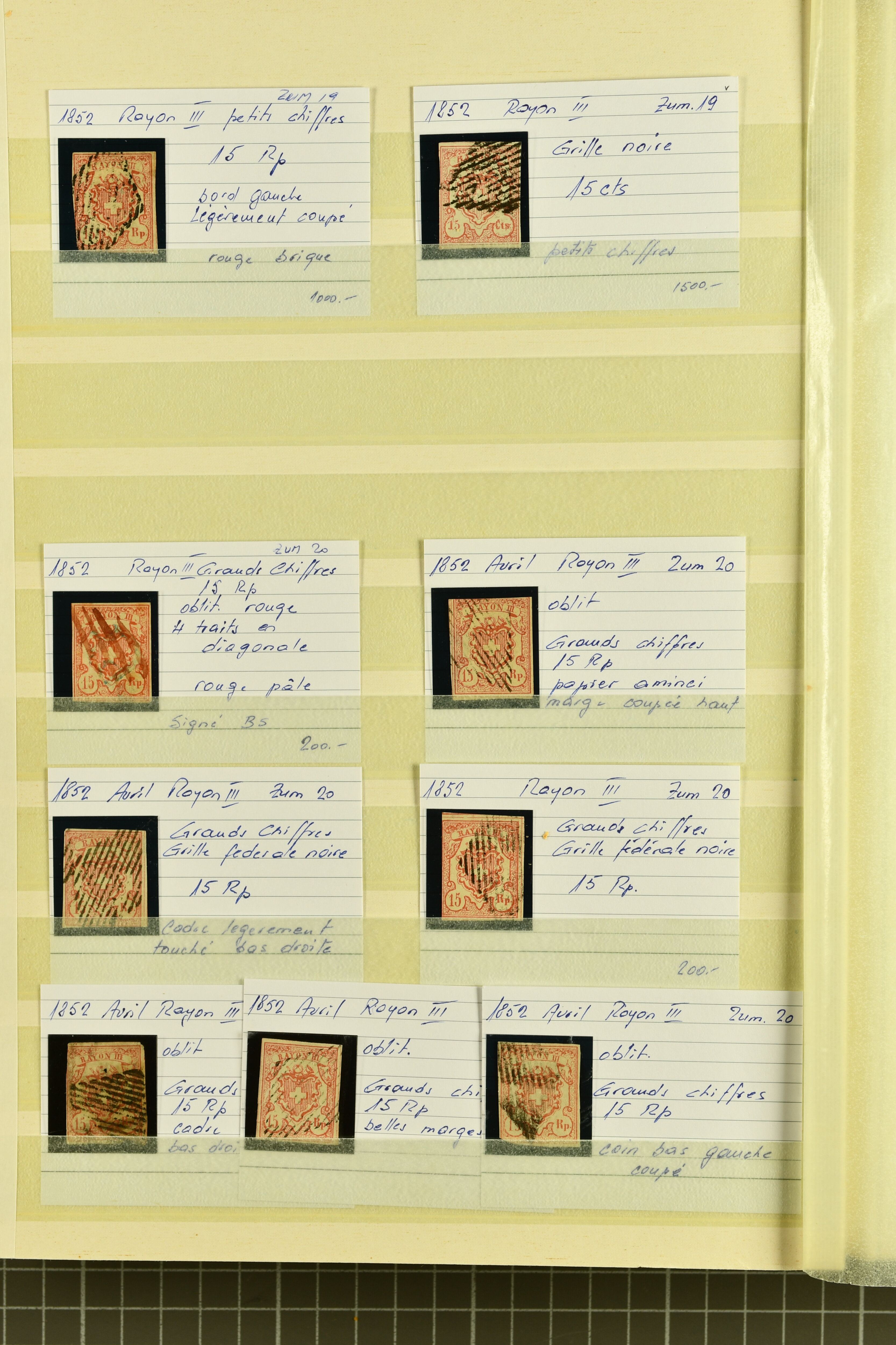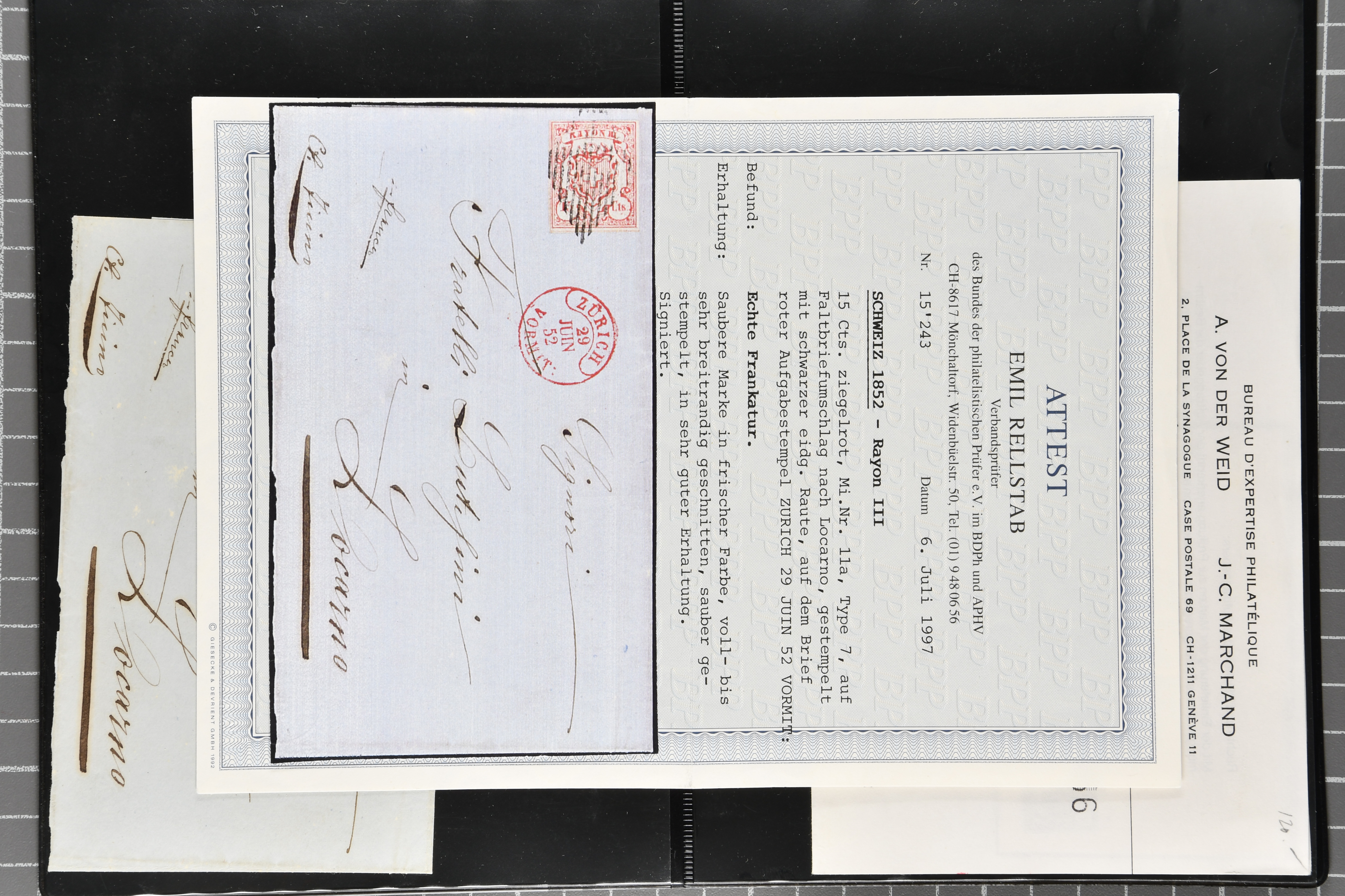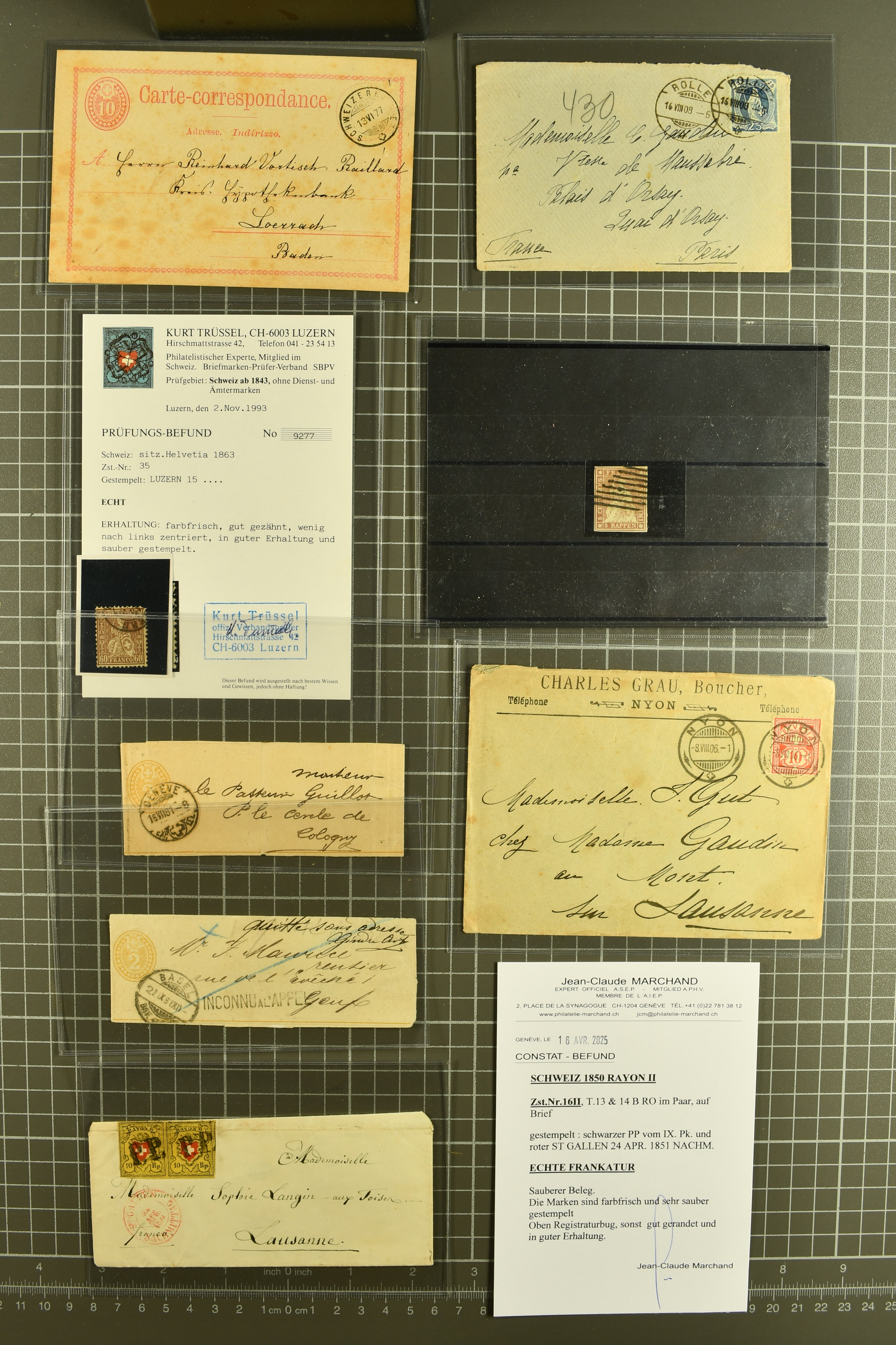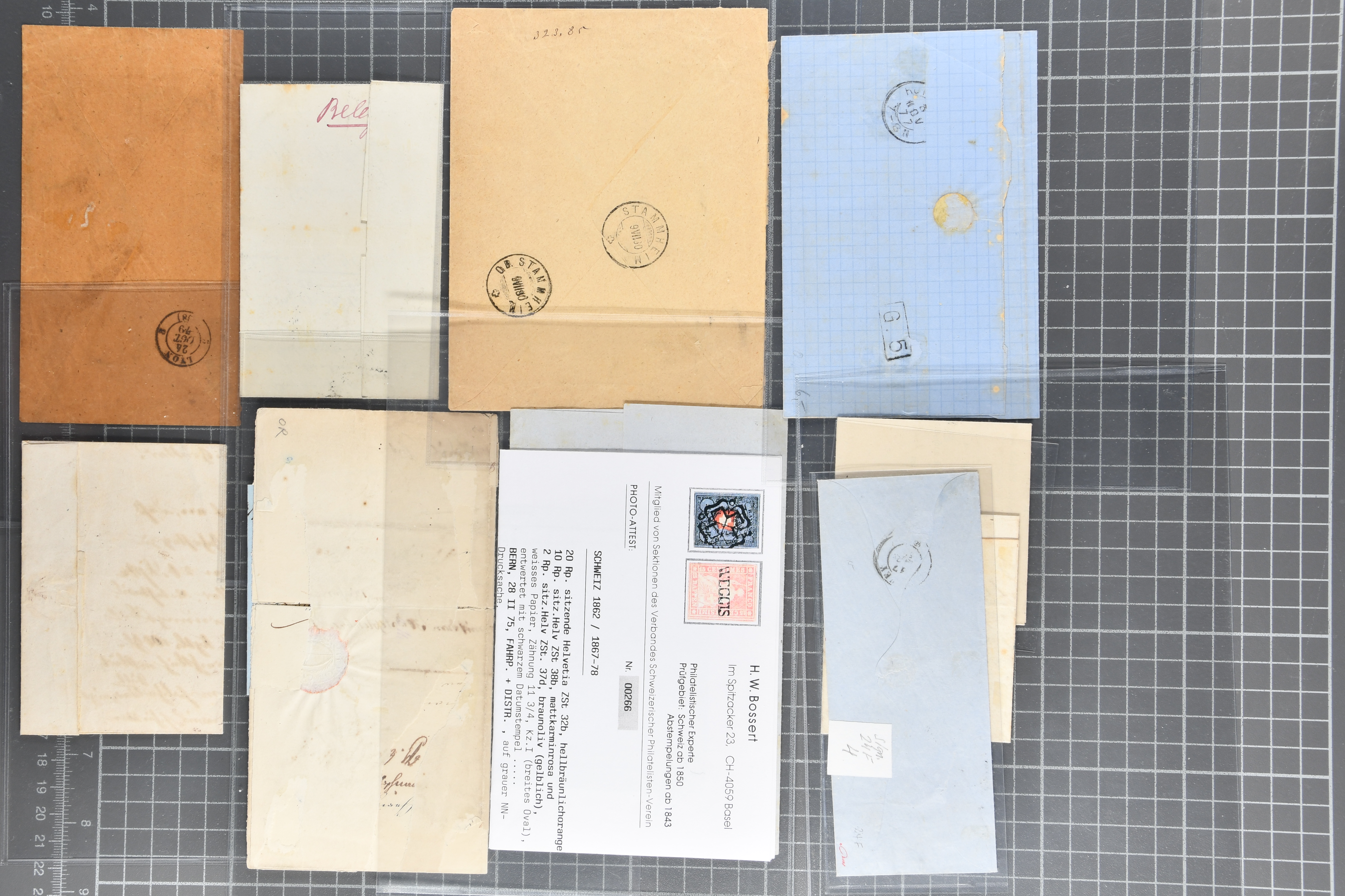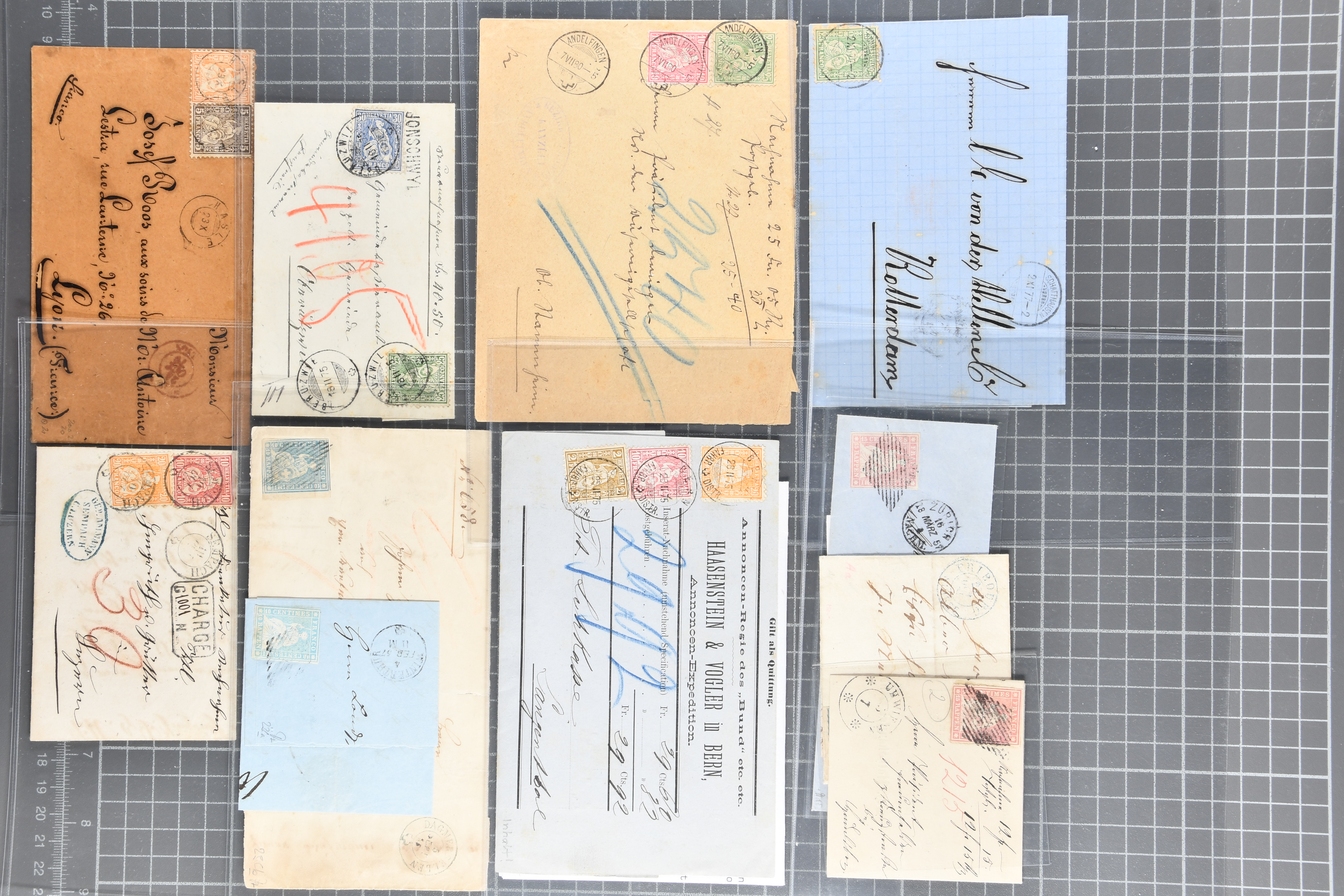 9879 cover image1850/62: Lot acht bessere Altschweiz-Frankaturen. Dabei Ortspost mit Kreuzeinfassung entw. mit schwarzer Aargauer Raute (AW 29/30) auf dekorativem Drucksachen-Streifband von Zofingen nach Niederbipp (BE), Rayon I Type 21 entw. mit schwarzem Stabstp. "BURGDORF" auf Faltbrief im 1. Briefkreis nach Langnau i.E., Rayon I hellblau (3) mit Unbekanntem Stein, Type 10 r/u mit grossem Teil der rechten Nebenmarke, klar und übergehend entw. mit blauer eidg. Raute mit nebenges. Zierlinienstempel "REINACH 5. P.K. 21 SEPT. 52" auf ungenügend frankiertem Faltbrieflein im 3. Briefkreis, nachtaxiert mit "10" Rp. in roter Tinte oder Stein B2: Typen 23+34 l/u im waagr. Paar, Rayon III, Centimes, Type 7 auf Faltbrief von Zürich nach Locarno, gr. Wertziffrer, Type 1 mit grossem Teil der linken Nebenmarke auf Faltbrieflein von Avenches nach Lausanne sowie Strubel 15 Rp. rotkarmin (SBK 24A) auf Faltbrief von Vevey nach Genf. Vereinzelt kleinere Mängel, meist aber in guter Erhaltung. Zwei Befunde, sechs Atteste. SBK=CHF 17'150 (Image 1) (Image 2) (Image 3) (Image 4) (Image 5) (Image 6) (Image 7) (Image 8)