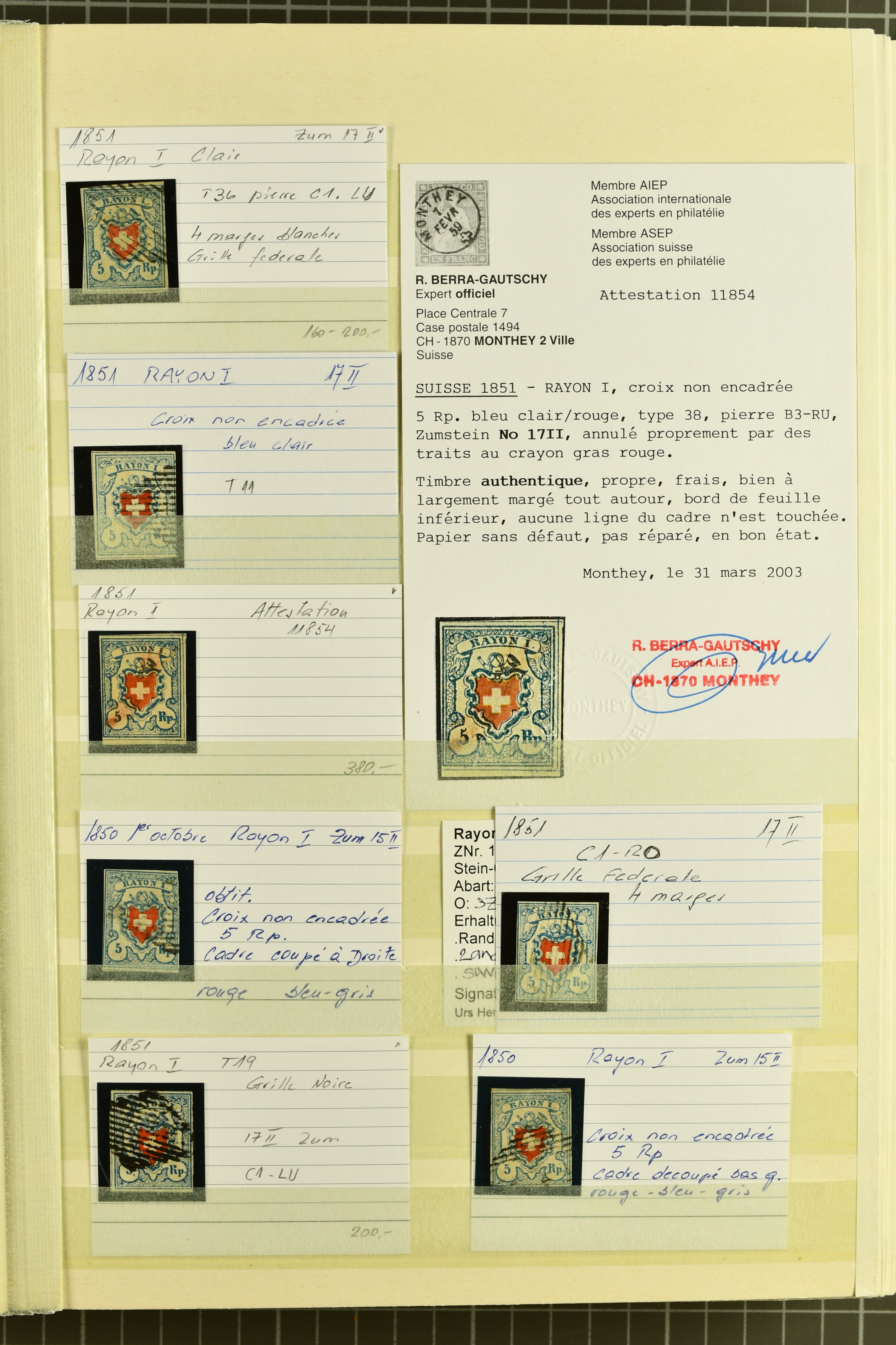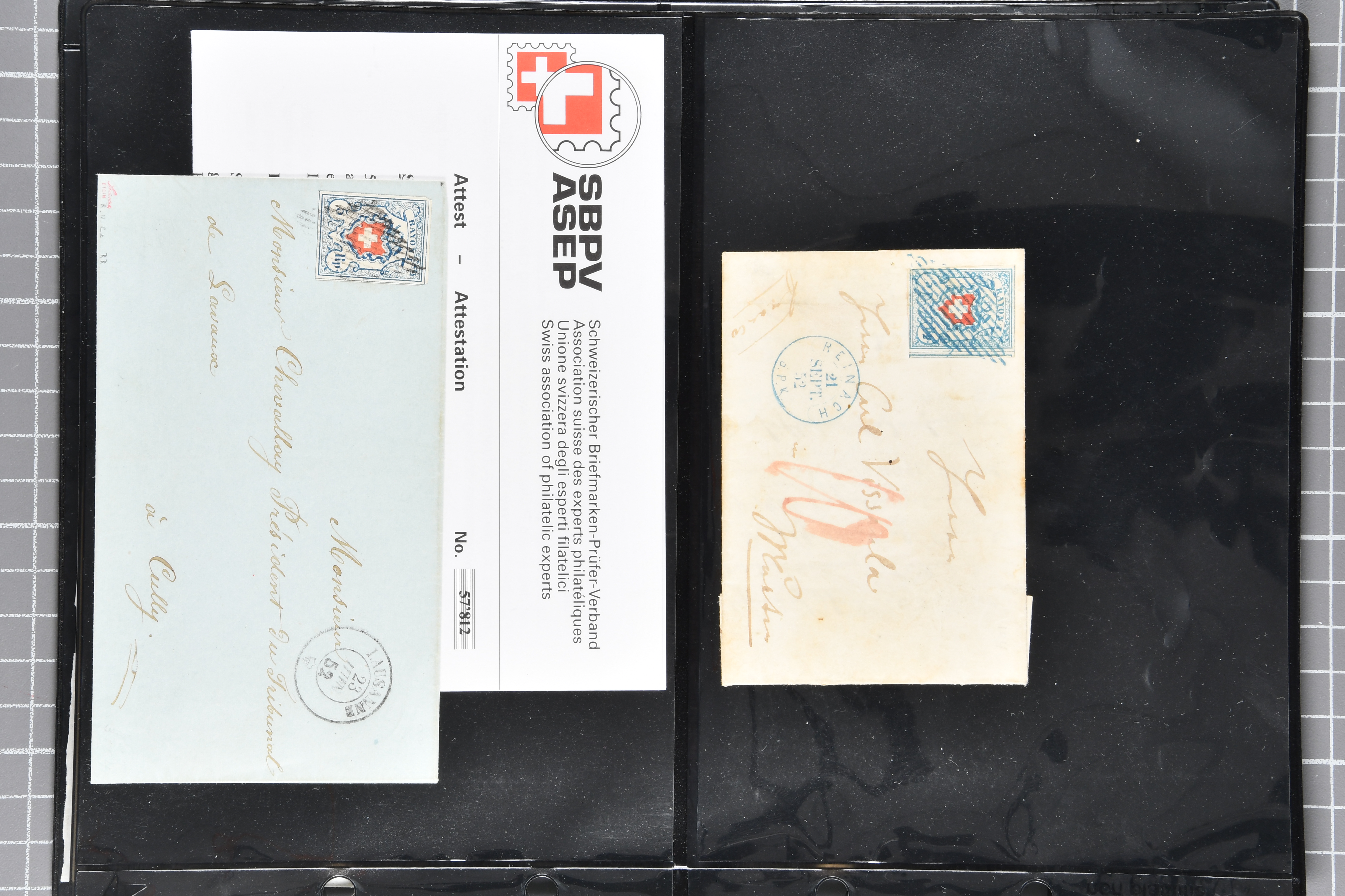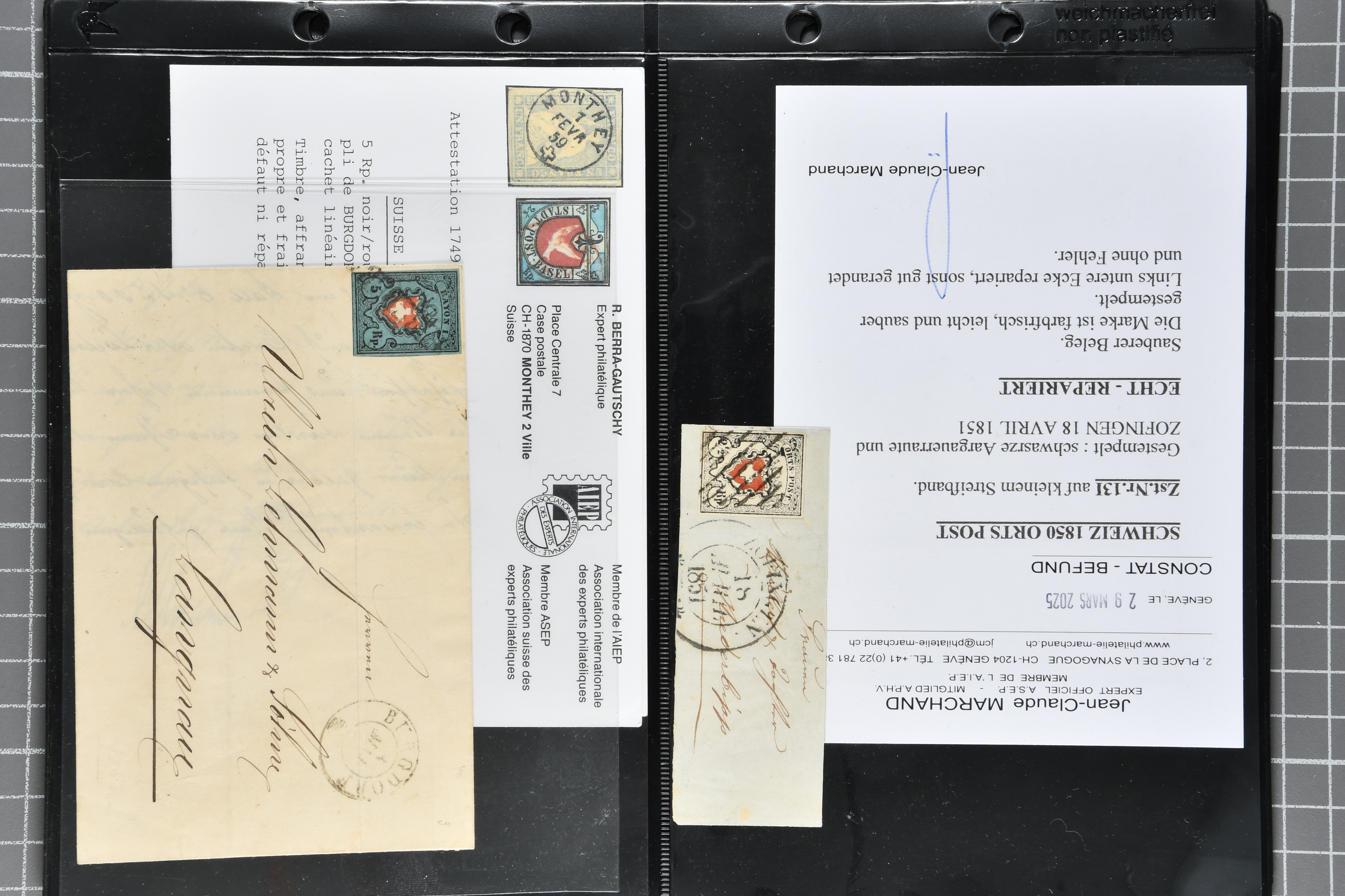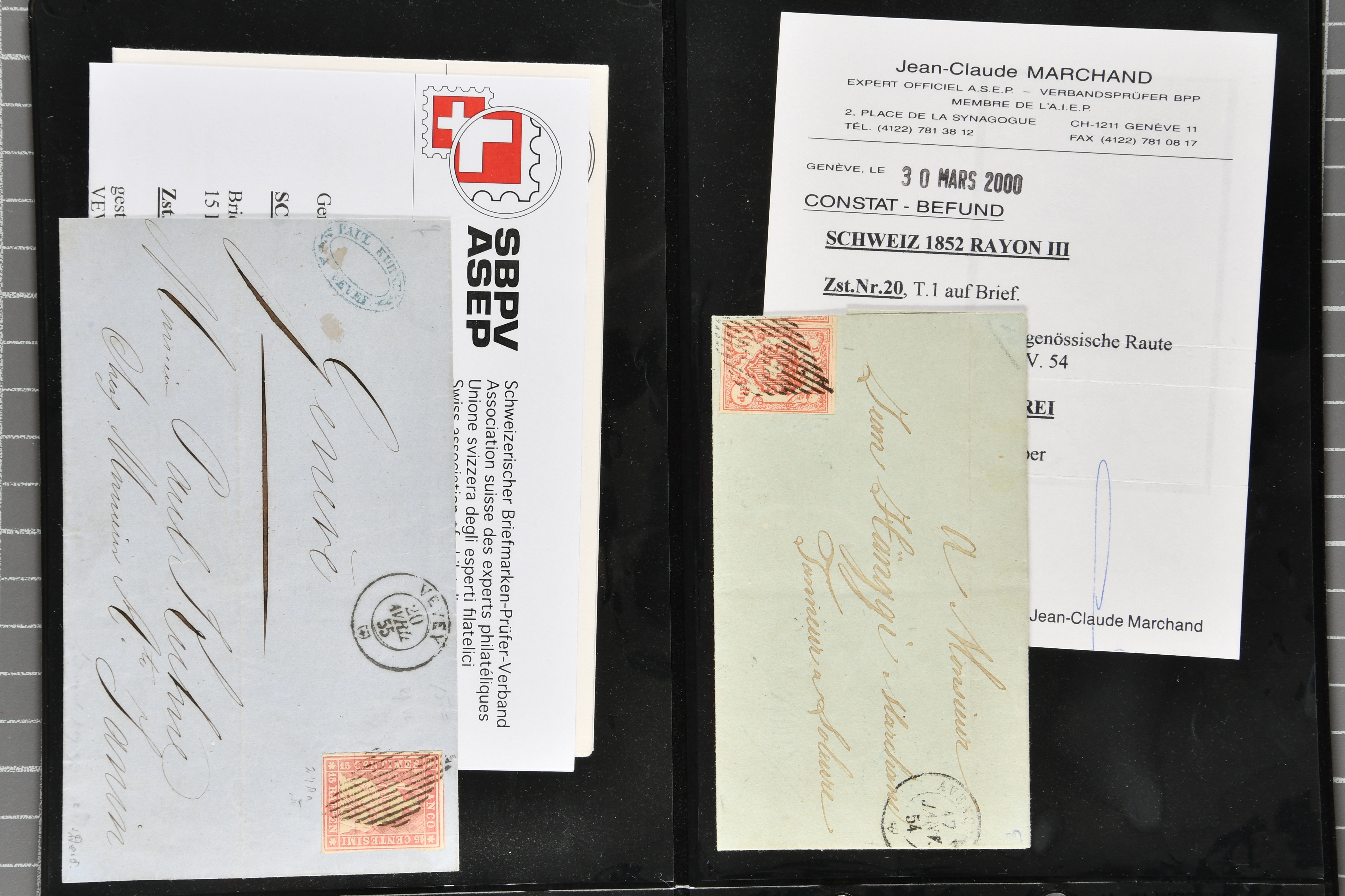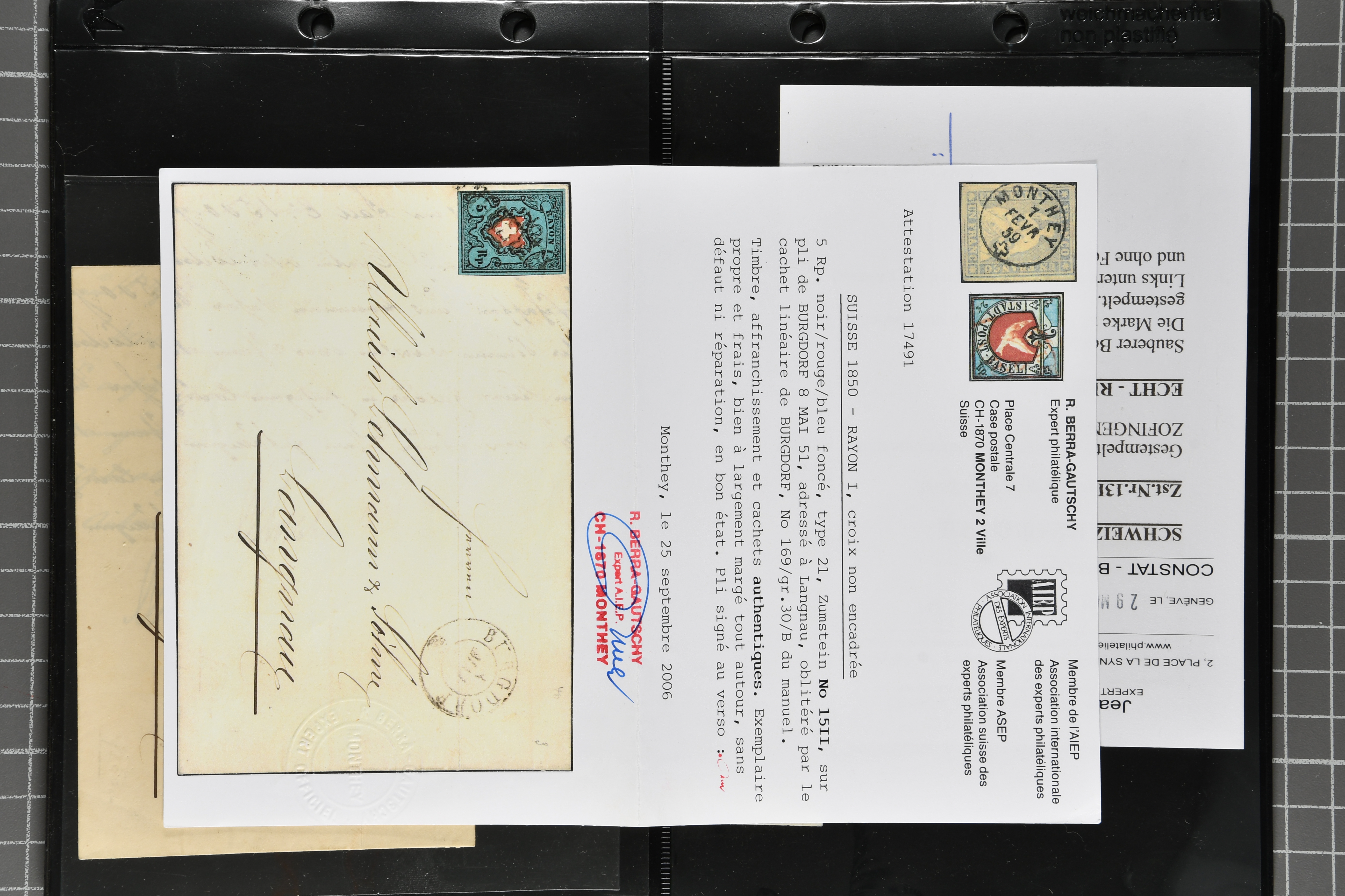 9879 cover image1850/62: Lot acht bessere Altschweiz-Frankaturen. Dabei Ortspost mit Kreuzeinfassung entw. mit schwarzer Aargauer Raute (AW 29/30) auf dekorativem Drucksachen-Streifband von Zofingen nach Niederbipp (BE), Rayon I Type 21 entw. mit schwarzem Stabstp. "BURGDORF" auf Faltbrief im 1. Briefkreis nach Langnau i.E., Rayon I hellblau (3) mit Unbekanntem Stein, Type 10 r/u mit grossem Teil der rechten Nebenmarke, klar und übergehend entw. mit blauer eidg. Raute mit nebenges. Zierlinienstempel "REINACH 5. P.K. 21 SEPT. 52" auf ungenügend frankiertem Faltbrieflein im 3. Briefkreis, nachtaxiert mit "10" Rp. in roter Tinte oder Stein B2: Typen 23+34 l/u im waagr. Paar, Rayon III, Centimes, Type 7 auf Faltbrief von Zürich nach Locarno, gr. Wertziffrer, Type 1 mit grossem Teil der linken Nebenmarke auf Faltbrieflein von Avenches nach Lausanne sowie Strubel 15 Rp. rotkarmin (SBK 24A) auf Faltbrief von Vevey nach Genf. Vereinzelt kleinere Mängel, meist aber in guter Erhaltung. Zwei Befunde, sechs Atteste. SBK=CHF 17'150 (Image 1) (Image 2) (Image 3) (Image 4) (Image 5) (Image 6) (Image 7) (Image 8)