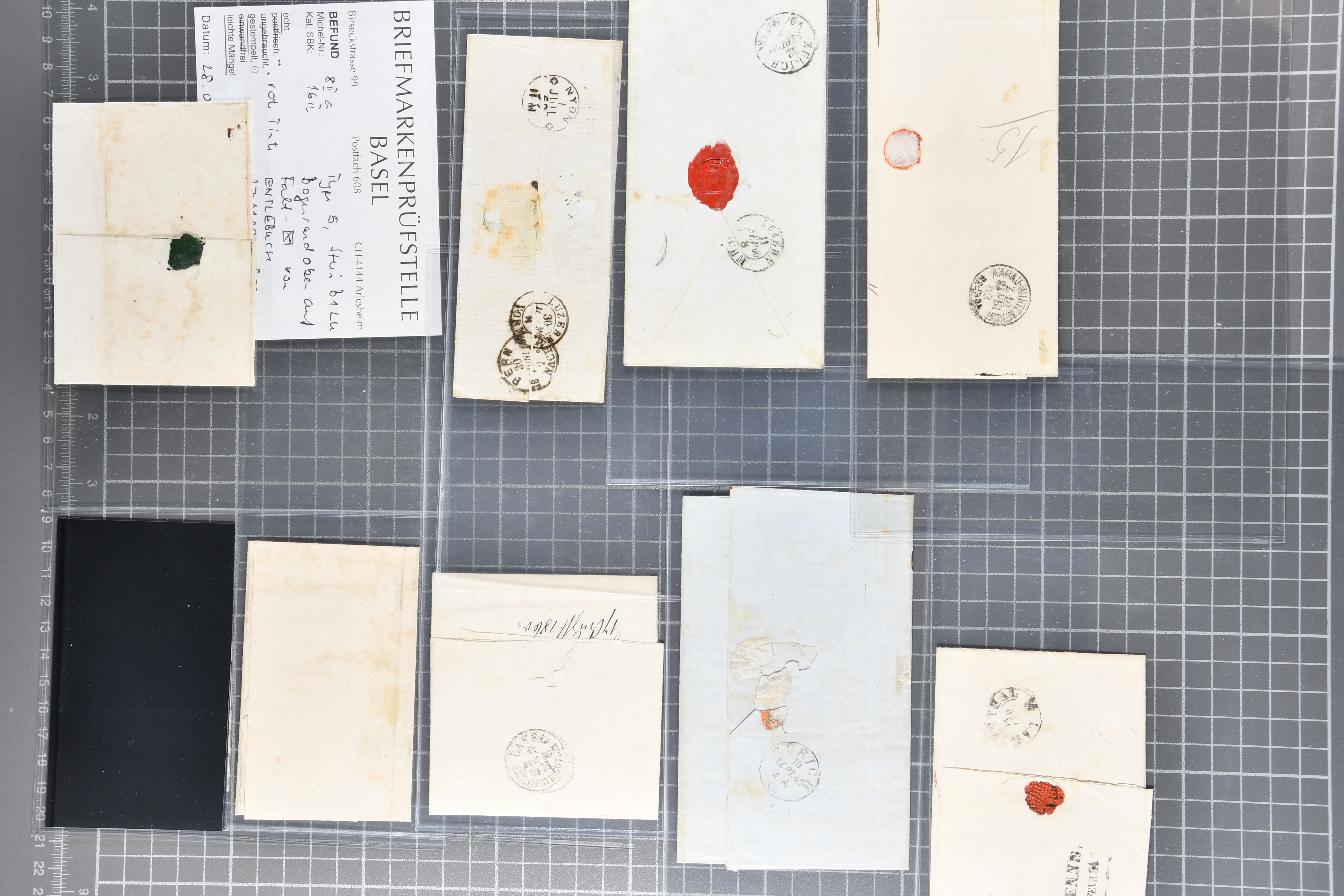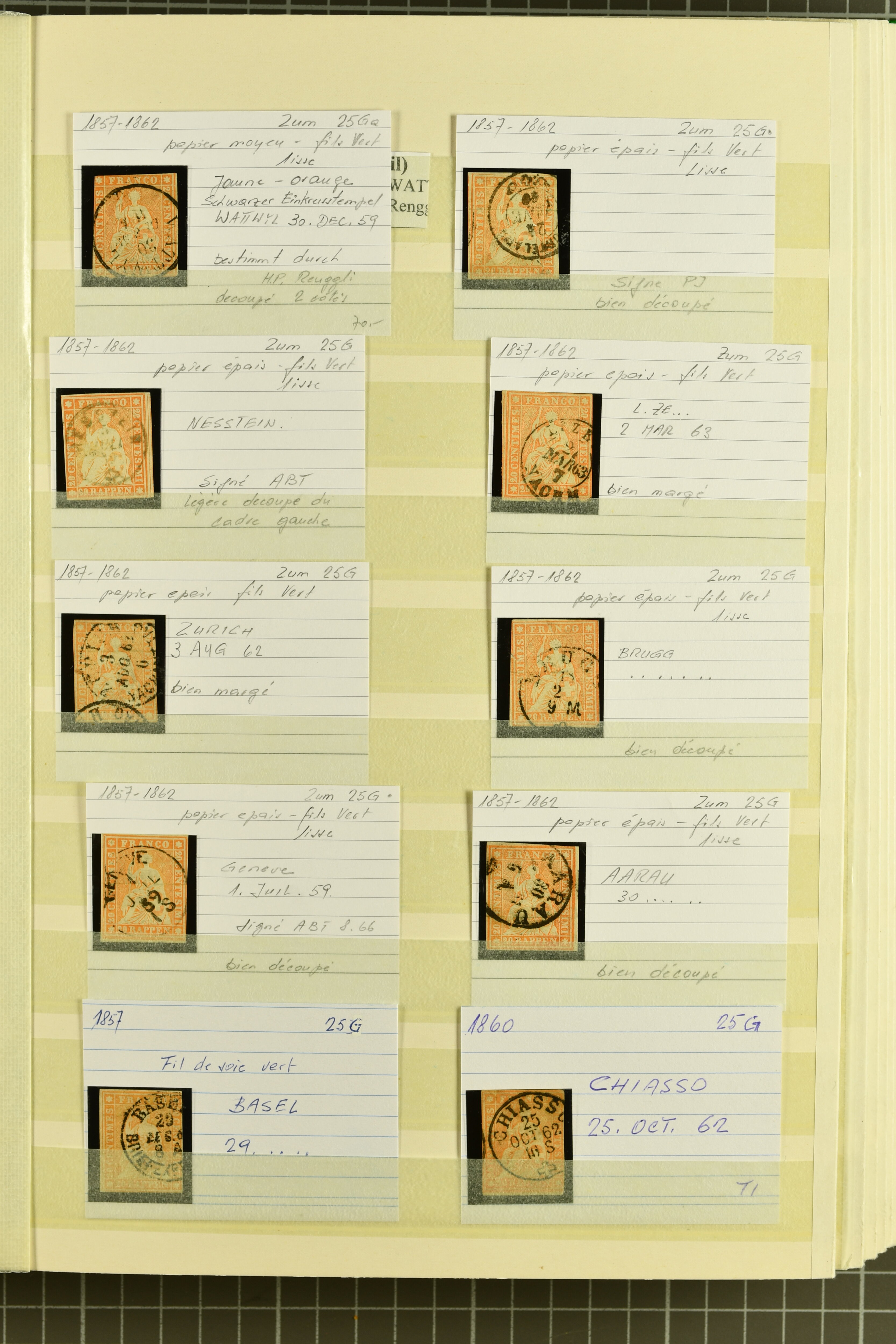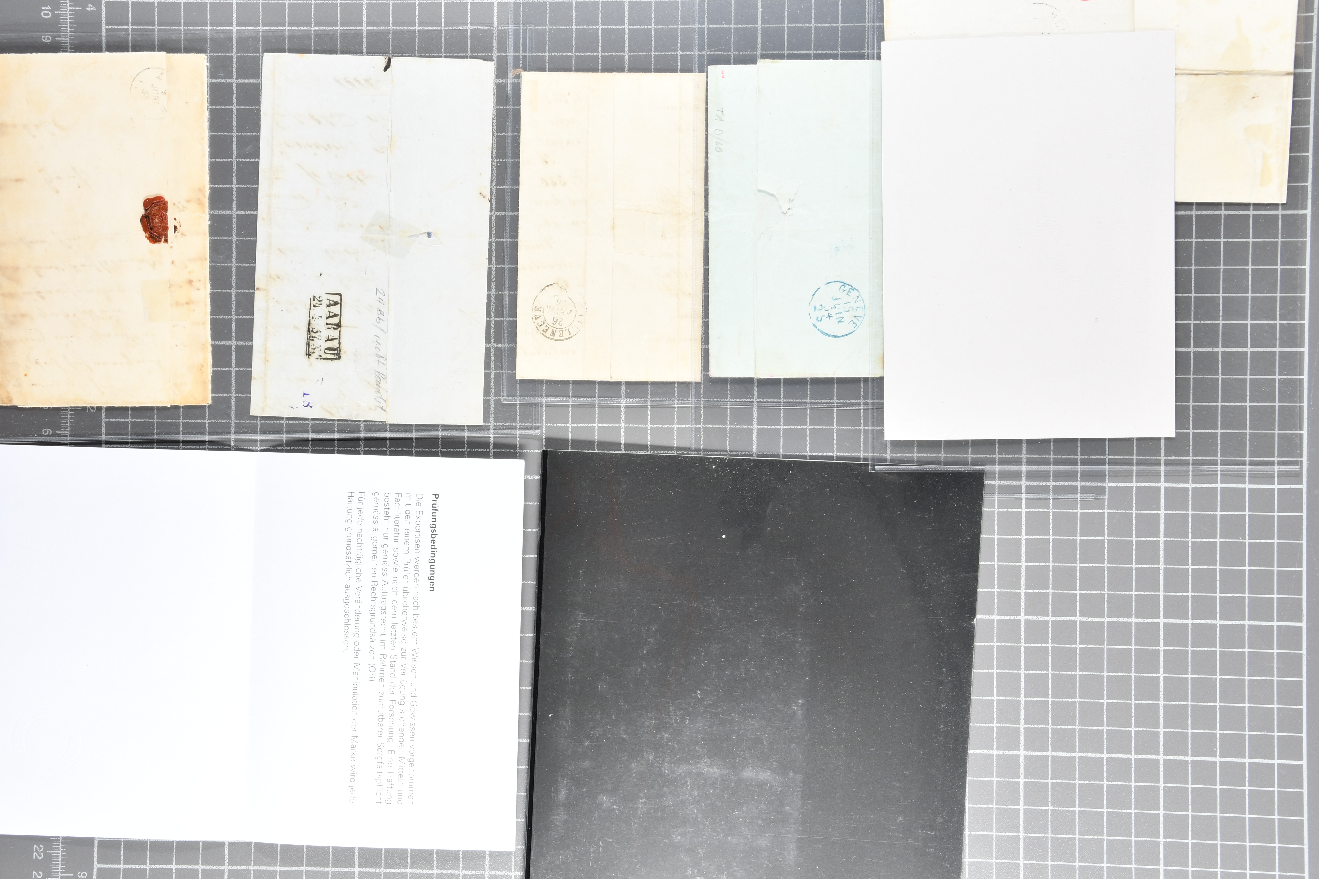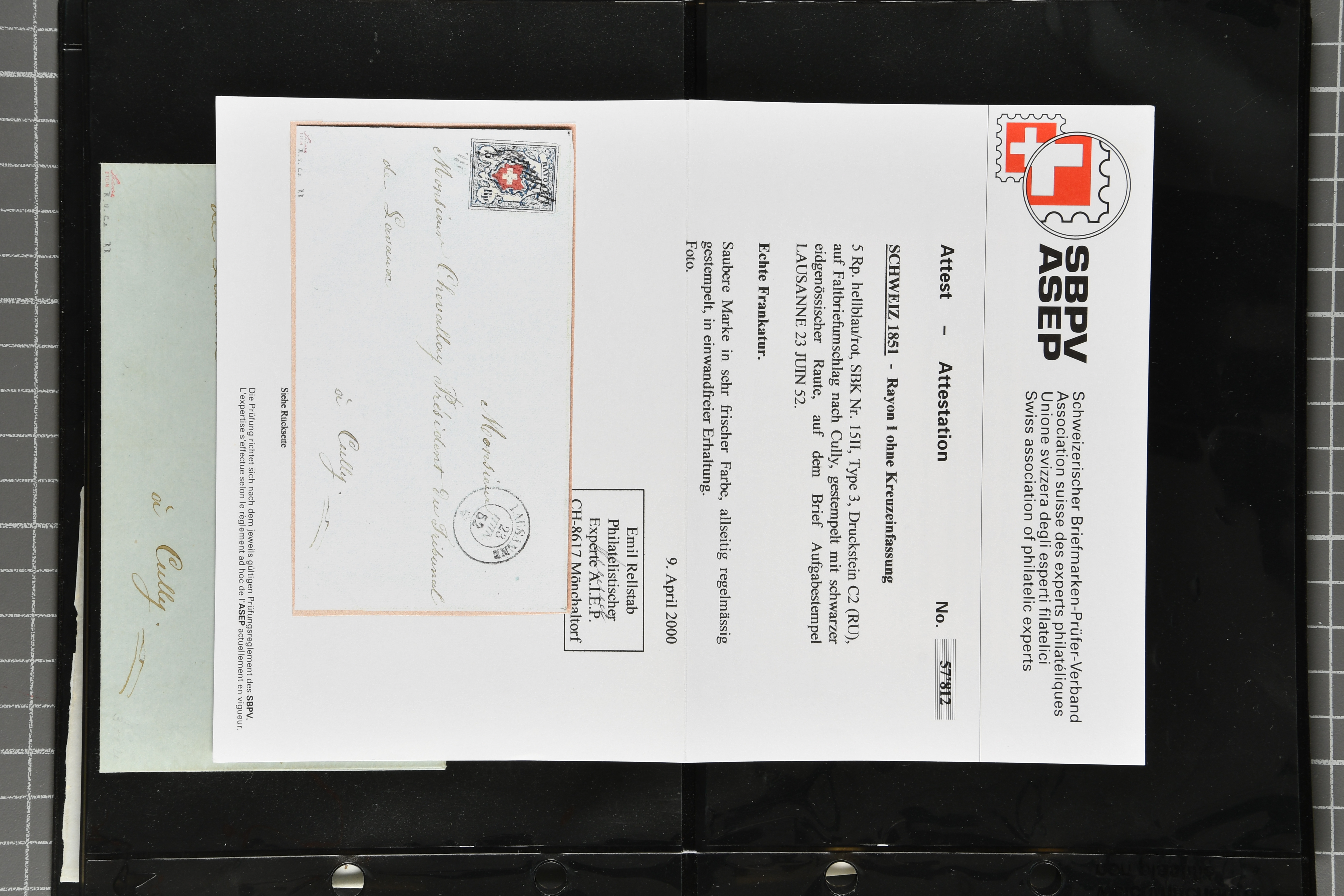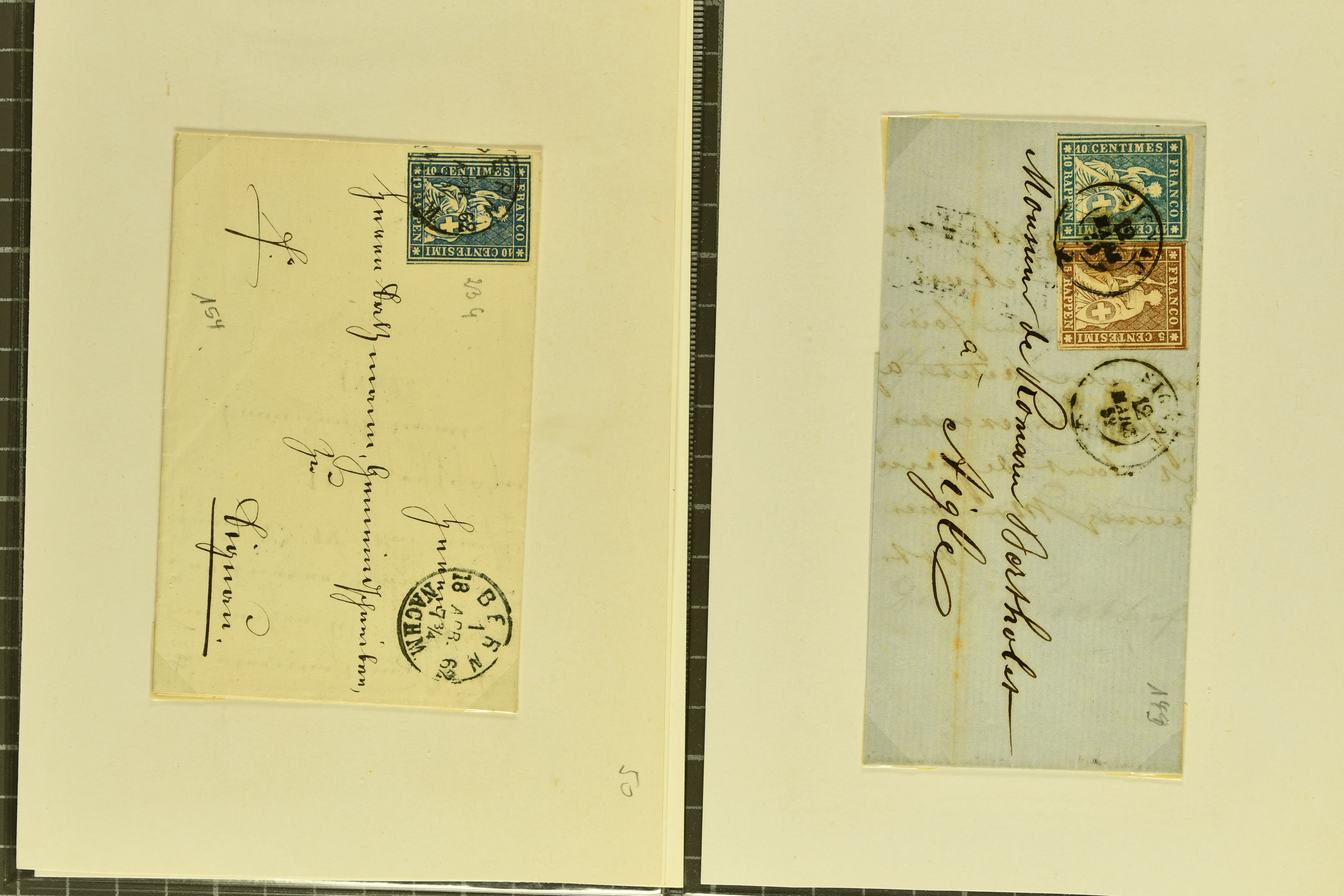 9879 cover image1850/62: Lot acht bessere Altschweiz-Frankaturen. Dabei Ortspost mit Kreuzeinfassung entw. mit schwarzer Aargauer Raute (AW 29/30) auf dekorativem Drucksachen-Streifband von Zofingen nach Niederbipp (BE), Rayon I Type 21 entw. mit schwarzem Stabstp. "BURGDORF" auf Faltbrief im 1. Briefkreis nach Langnau i.E., Rayon I hellblau (3) mit Unbekanntem Stein, Type 10 r/u mit grossem Teil der rechten Nebenmarke, klar und übergehend entw. mit blauer eidg. Raute mit nebenges. Zierlinienstempel "REINACH 5. P.K. 21 SEPT. 52" auf ungenügend frankiertem Faltbrieflein im 3. Briefkreis, nachtaxiert mit "10" Rp. in roter Tinte oder Stein B2: Typen 23+34 l/u im waagr. Paar, Rayon III, Centimes, Type 7 auf Faltbrief von Zürich nach Locarno, gr. Wertziffrer, Type 1 mit grossem Teil der linken Nebenmarke auf Faltbrieflein von Avenches nach Lausanne sowie Strubel 15 Rp. rotkarmin (SBK 24A) auf Faltbrief von Vevey nach Genf. Vereinzelt kleinere Mängel, meist aber in guter Erhaltung. Zwei Befunde, sechs Atteste. SBK=CHF 17'150 (Image 1) (Image 2) (Image 3) (Image 4) (Image 5) (Image 6) (Image 7) (Image 8)