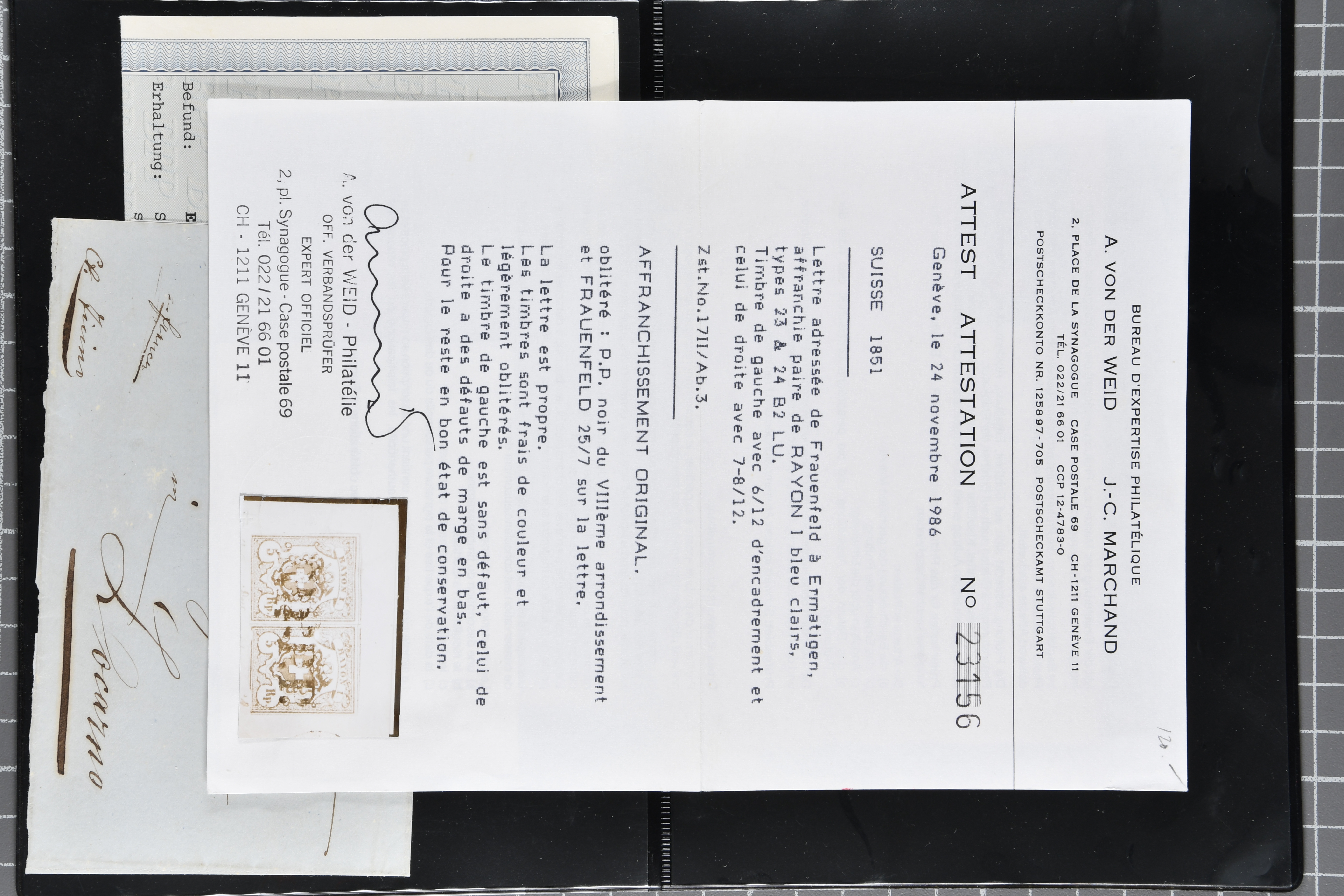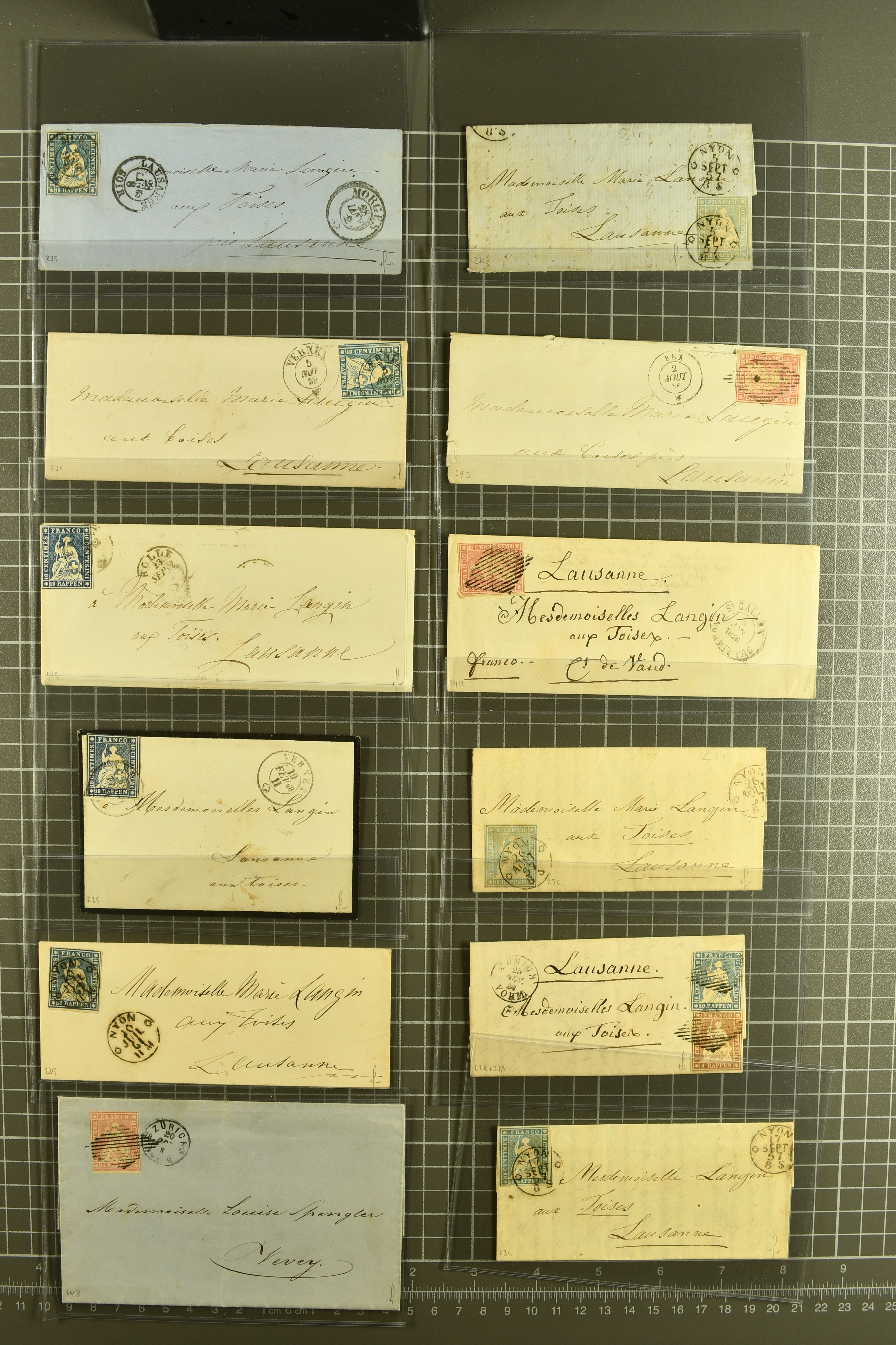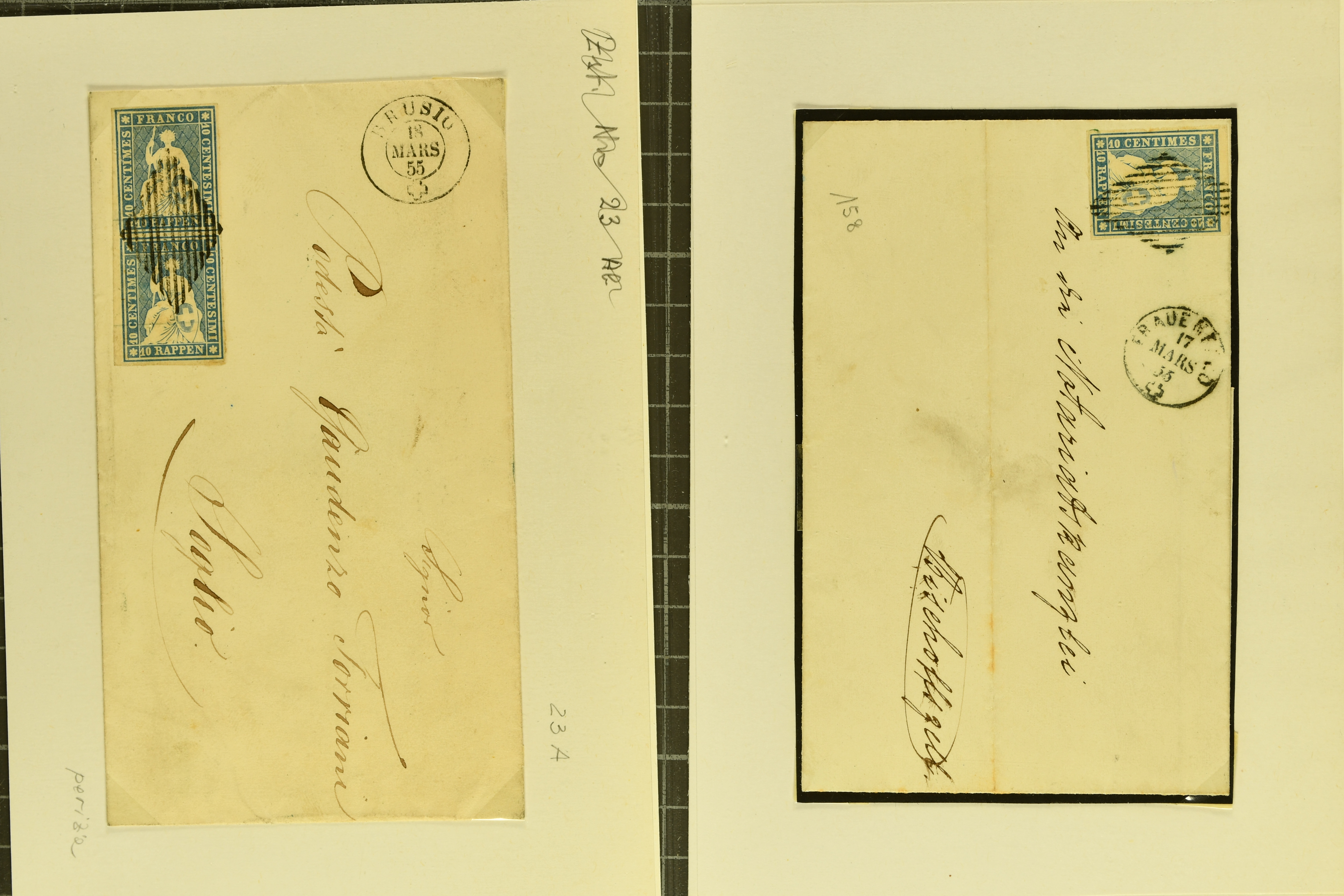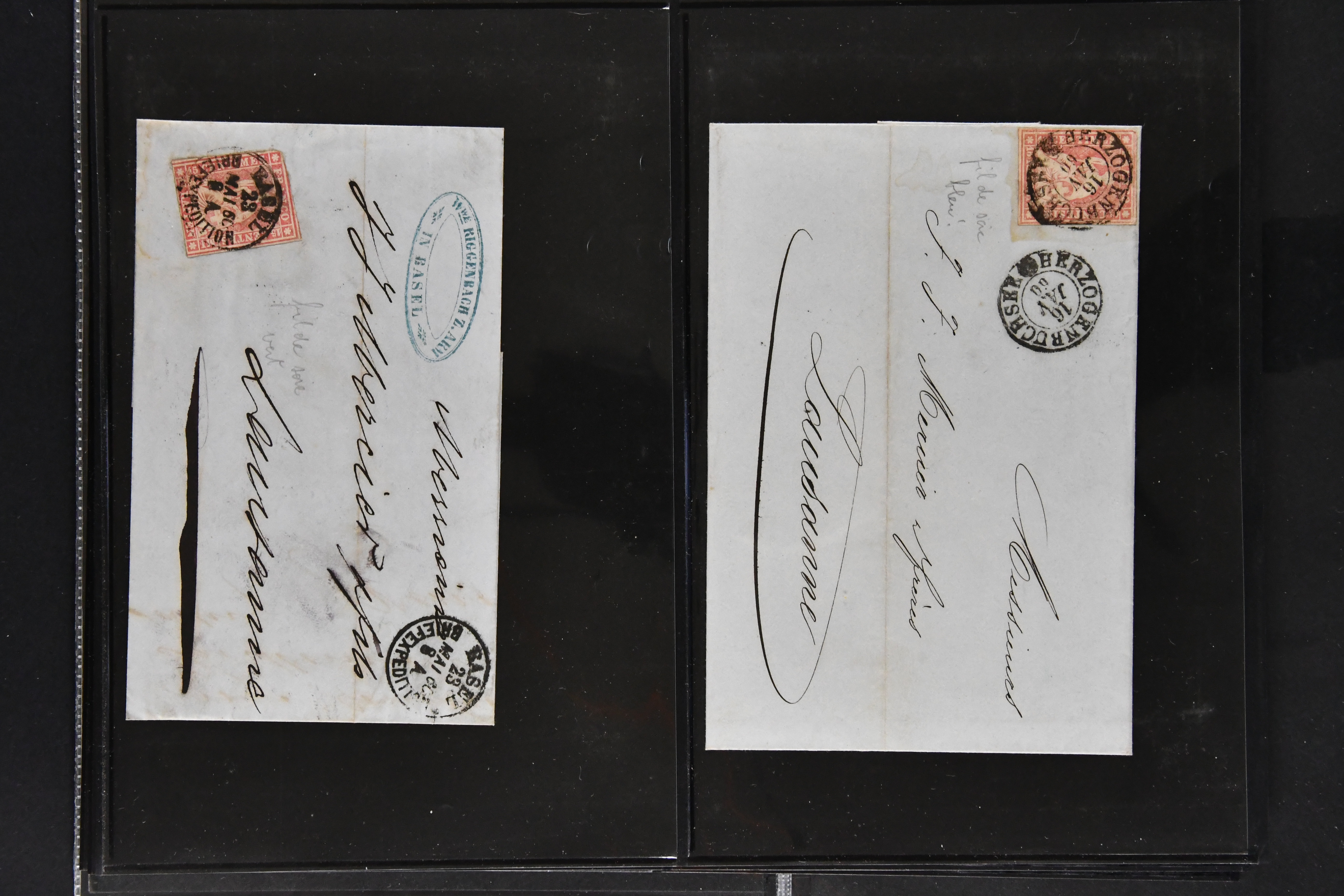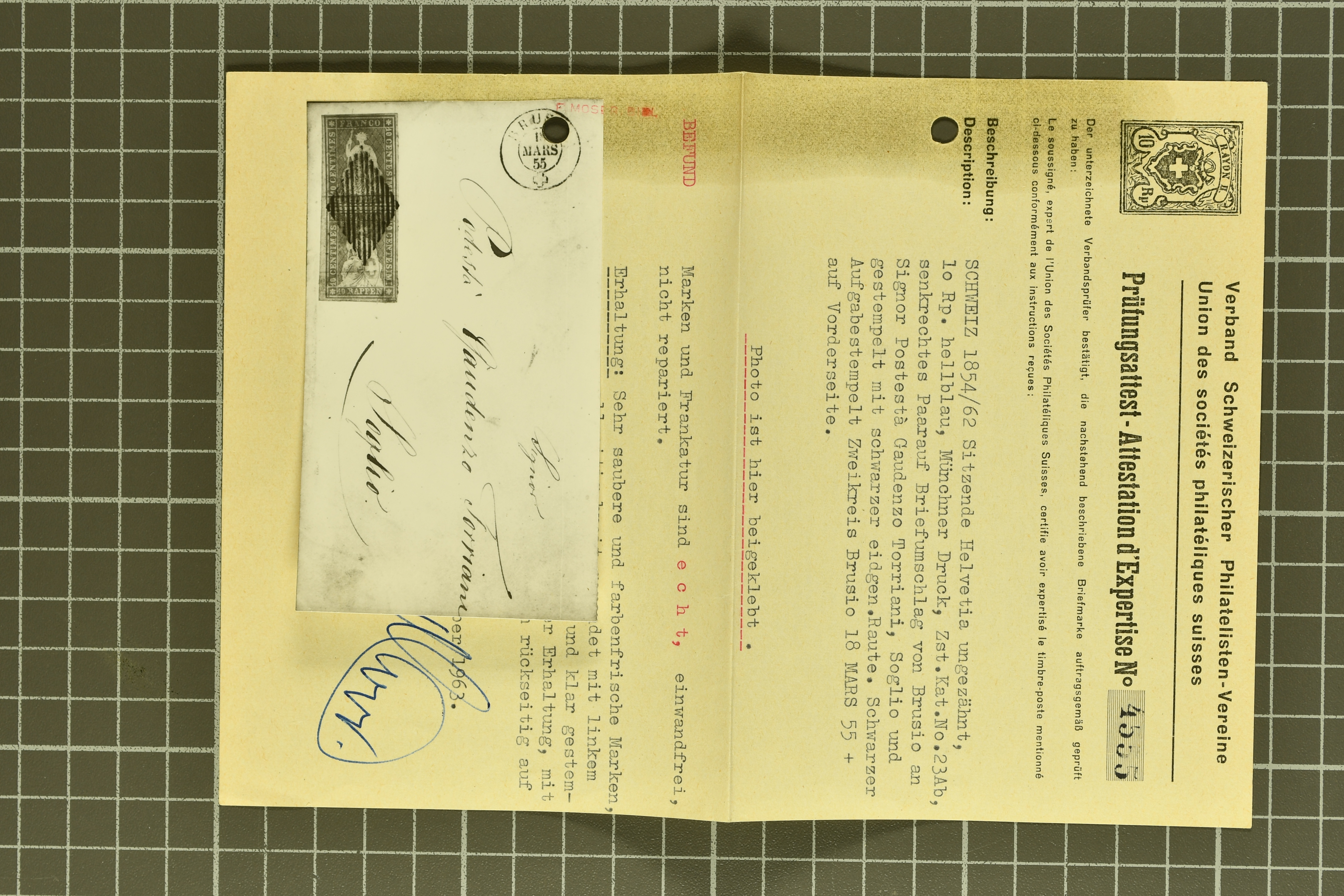 9879 cover image1850/62: Lot acht bessere Altschweiz-Frankaturen. Dabei Ortspost mit Kreuzeinfassung entw. mit schwarzer Aargauer Raute (AW 29/30) auf dekorativem Drucksachen-Streifband von Zofingen nach Niederbipp (BE), Rayon I Type 21 entw. mit schwarzem Stabstp. "BURGDORF" auf Faltbrief im 1. Briefkreis nach Langnau i.E., Rayon I hellblau (3) mit Unbekanntem Stein, Type 10 r/u mit grossem Teil der rechten Nebenmarke, klar und übergehend entw. mit blauer eidg. Raute mit nebenges. Zierlinienstempel "REINACH 5. P.K. 21 SEPT. 52" auf ungenügend frankiertem Faltbrieflein im 3. Briefkreis, nachtaxiert mit "10" Rp. in roter Tinte oder Stein B2: Typen 23+34 l/u im waagr. Paar, Rayon III, Centimes, Type 7 auf Faltbrief von Zürich nach Locarno, gr. Wertziffrer, Type 1 mit grossem Teil der linken Nebenmarke auf Faltbrieflein von Avenches nach Lausanne sowie Strubel 15 Rp. rotkarmin (SBK 24A) auf Faltbrief von Vevey nach Genf. Vereinzelt kleinere Mängel, meist aber in guter Erhaltung. Zwei Befunde, sechs Atteste. SBK=CHF 17'150 (Image 1) (Image 2) (Image 3) (Image 4) (Image 5) (Image 6) (Image 7) (Image 8)