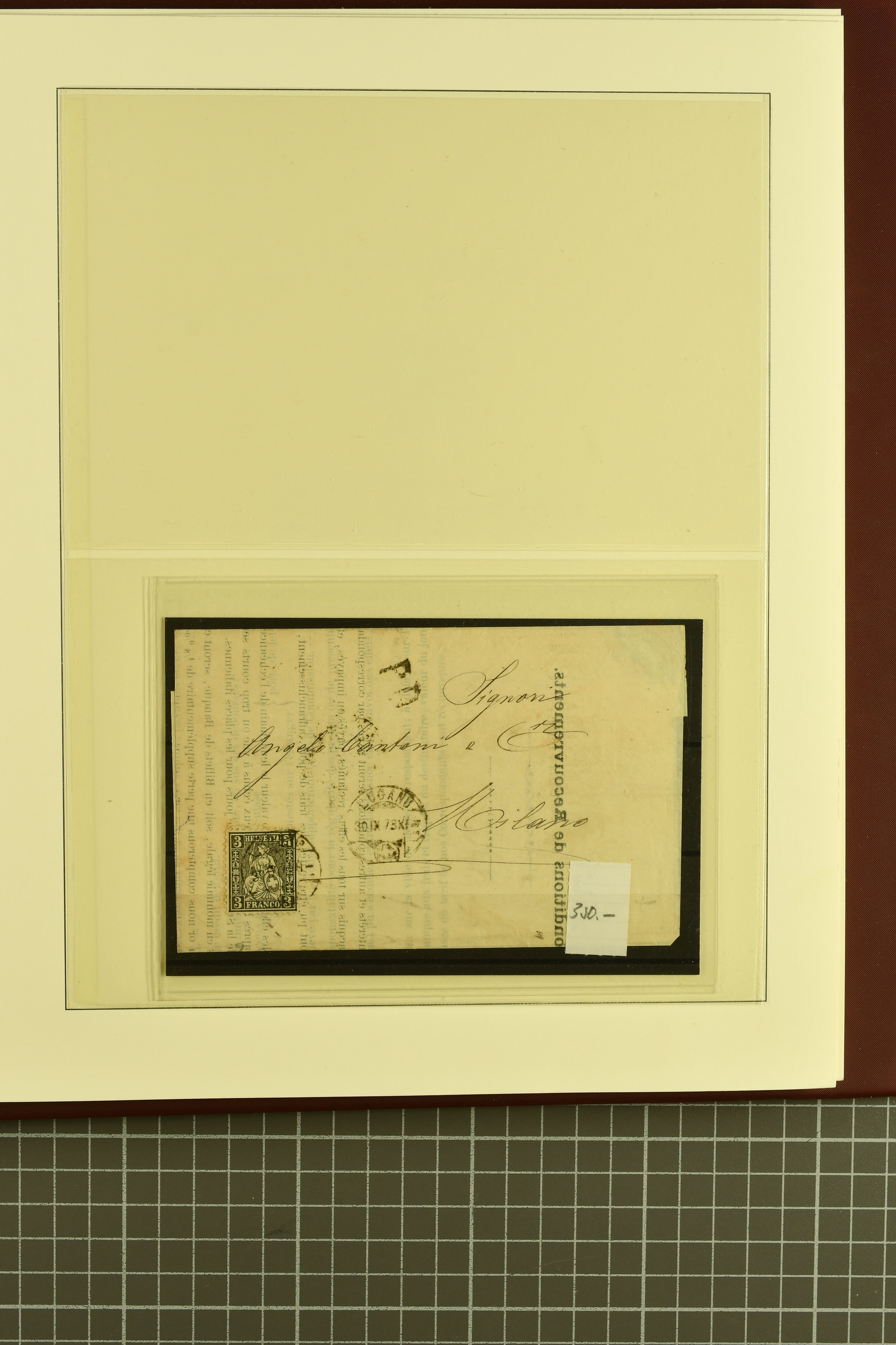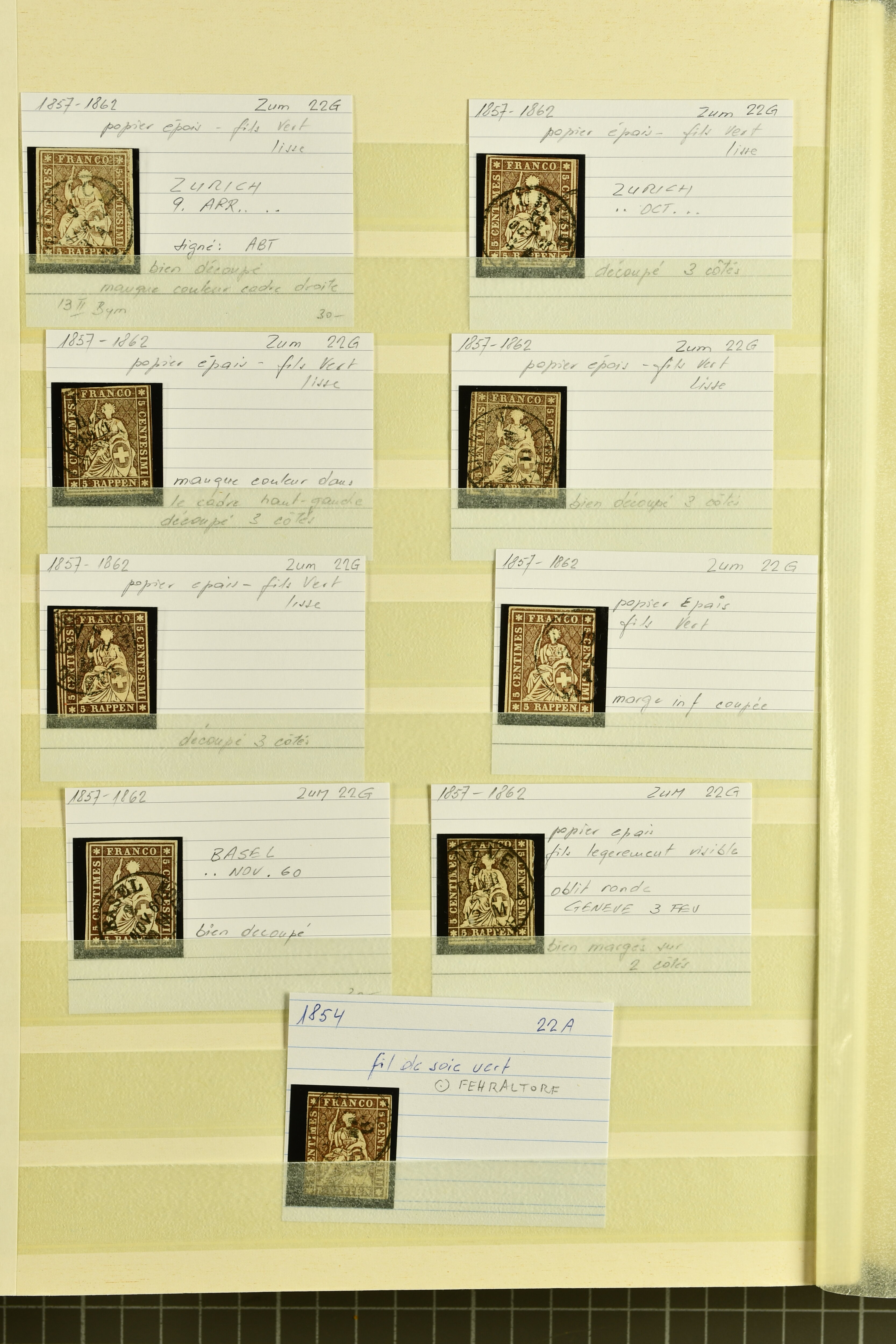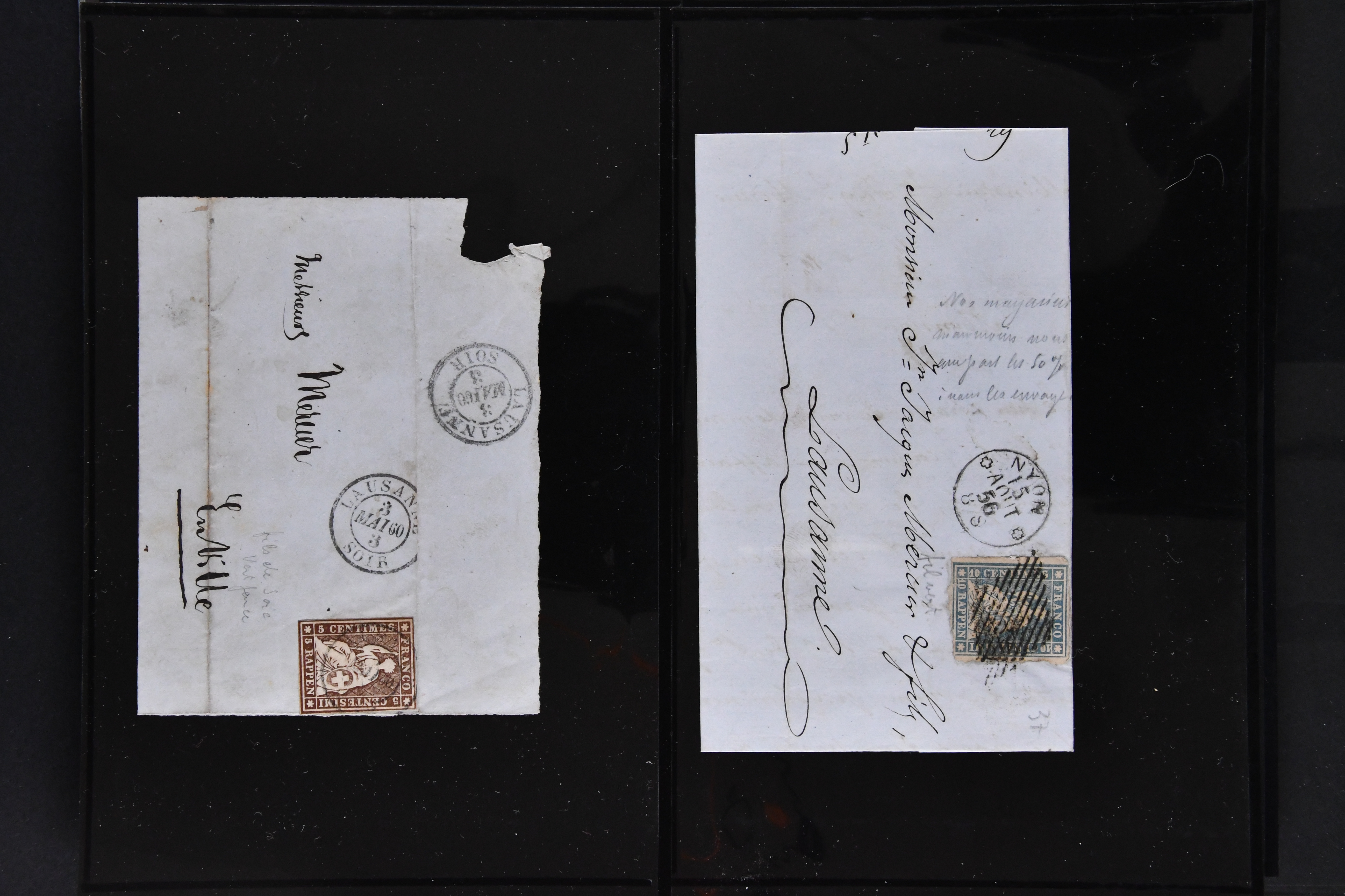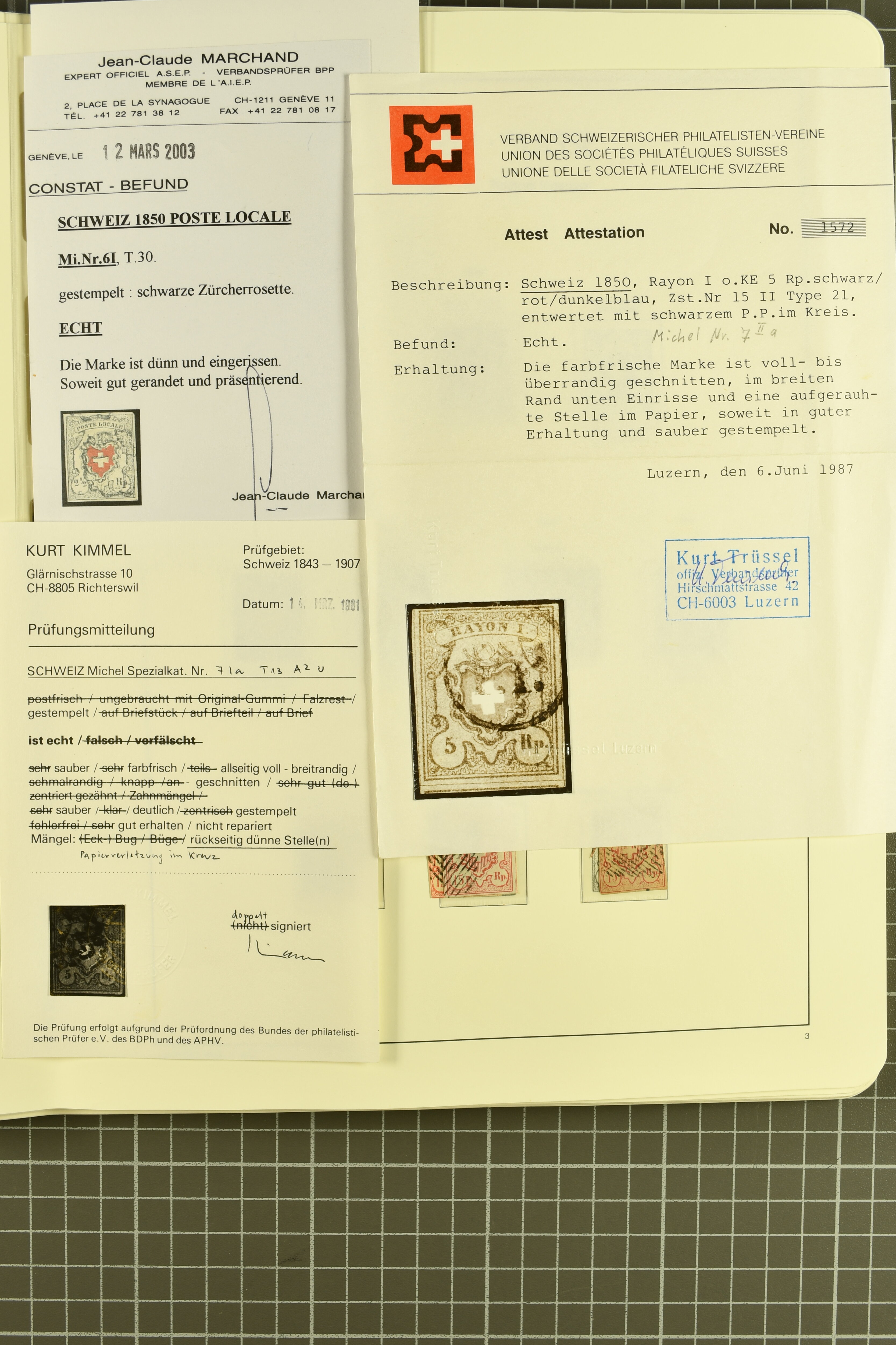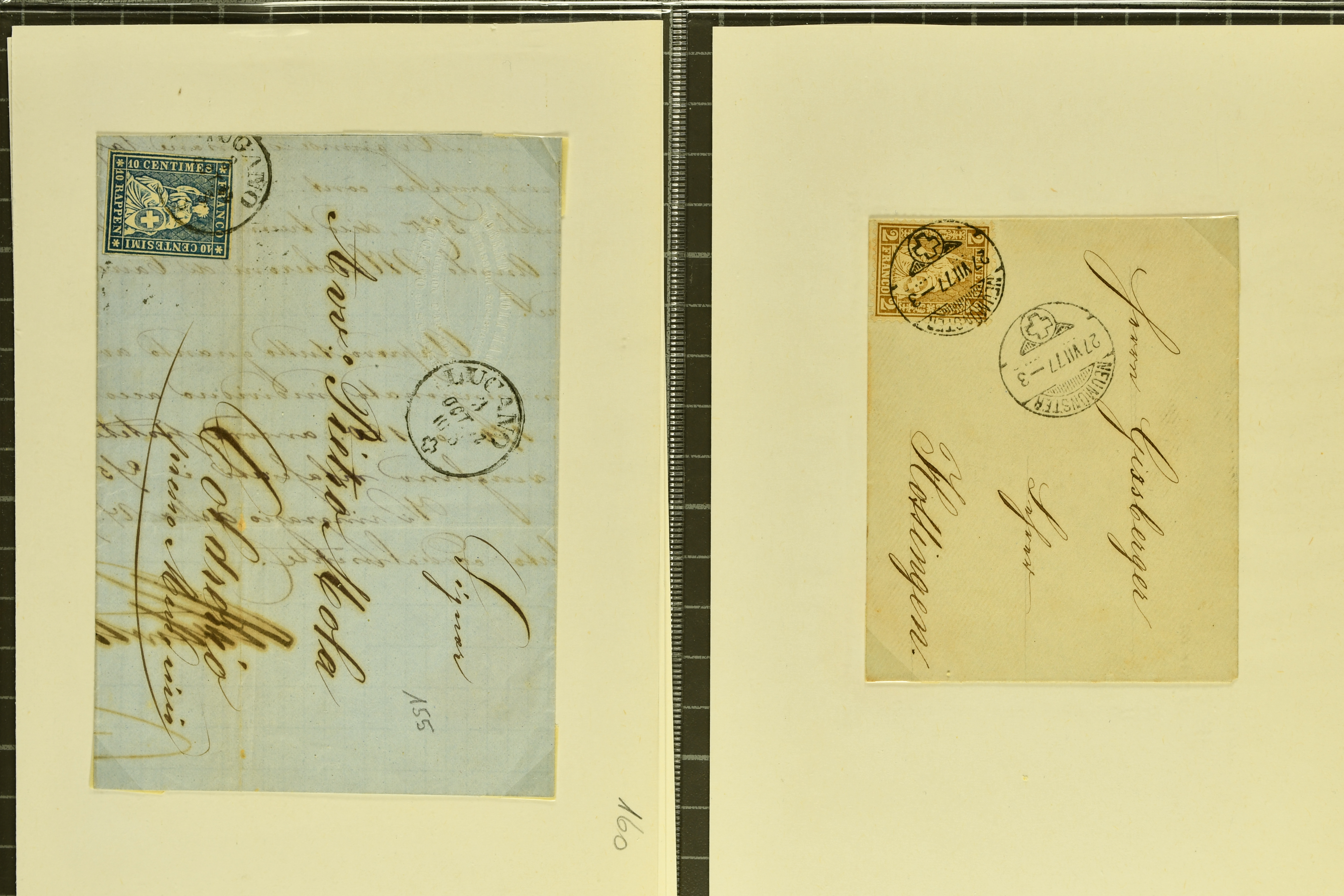 9879 cover image1850/62: Lot acht bessere Altschweiz-Frankaturen. Dabei Ortspost mit Kreuzeinfassung entw. mit schwarzer Aargauer Raute (AW 29/30) auf dekorativem Drucksachen-Streifband von Zofingen nach Niederbipp (BE), Rayon I Type 21 entw. mit schwarzem Stabstp. "BURGDORF" auf Faltbrief im 1. Briefkreis nach Langnau i.E., Rayon I hellblau (3) mit Unbekanntem Stein, Type 10 r/u mit grossem Teil der rechten Nebenmarke, klar und übergehend entw. mit blauer eidg. Raute mit nebenges. Zierlinienstempel "REINACH 5. P.K. 21 SEPT. 52" auf ungenügend frankiertem Faltbrieflein im 3. Briefkreis, nachtaxiert mit "10" Rp. in roter Tinte oder Stein B2: Typen 23+34 l/u im waagr. Paar, Rayon III, Centimes, Type 7 auf Faltbrief von Zürich nach Locarno, gr. Wertziffrer, Type 1 mit grossem Teil der linken Nebenmarke auf Faltbrieflein von Avenches nach Lausanne sowie Strubel 15 Rp. rotkarmin (SBK 24A) auf Faltbrief von Vevey nach Genf. Vereinzelt kleinere Mängel, meist aber in guter Erhaltung. Zwei Befunde, sechs Atteste. SBK=CHF 17'150 (Image 1) (Image 2) (Image 3) (Image 4) (Image 5) (Image 6) (Image 7) (Image 8)