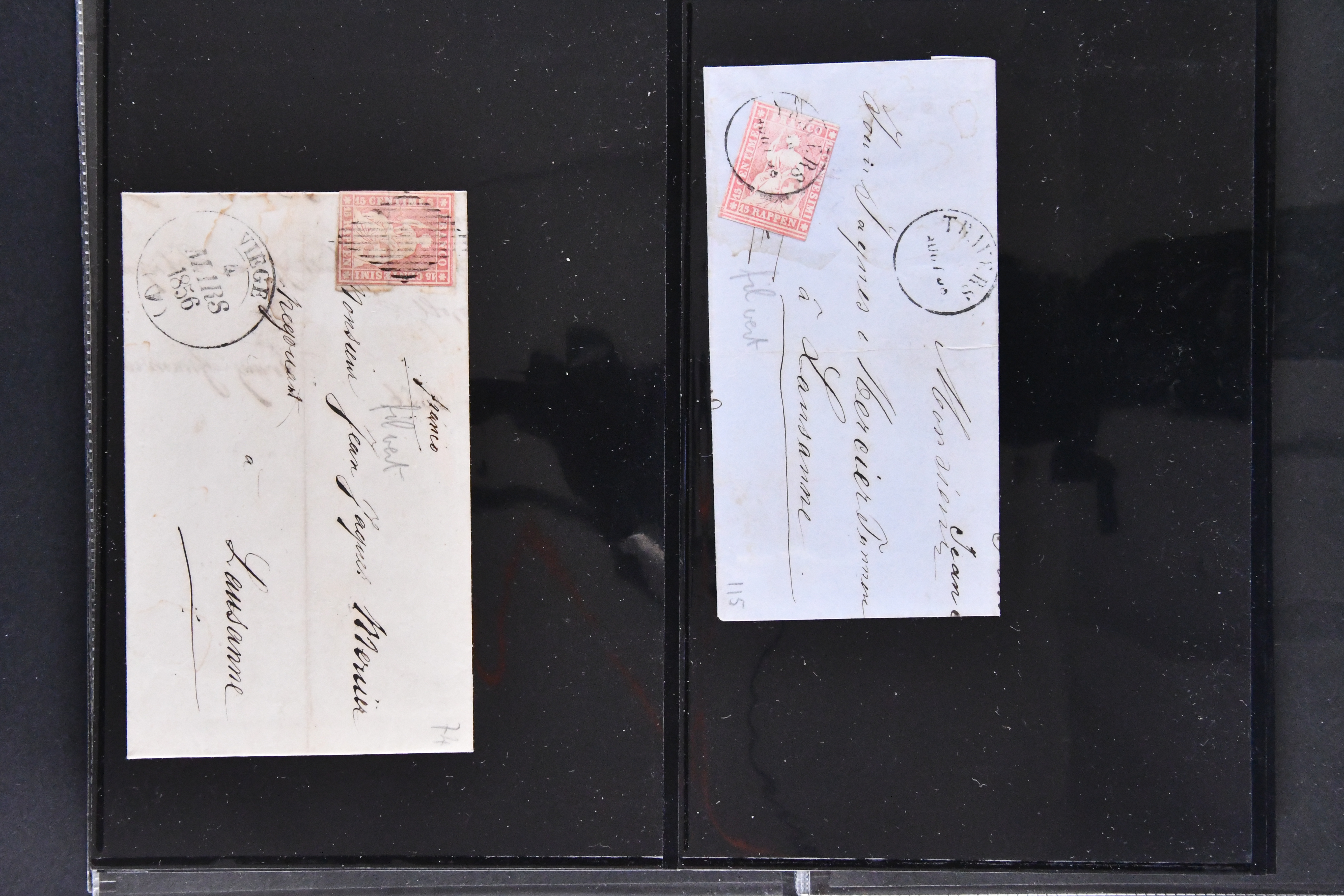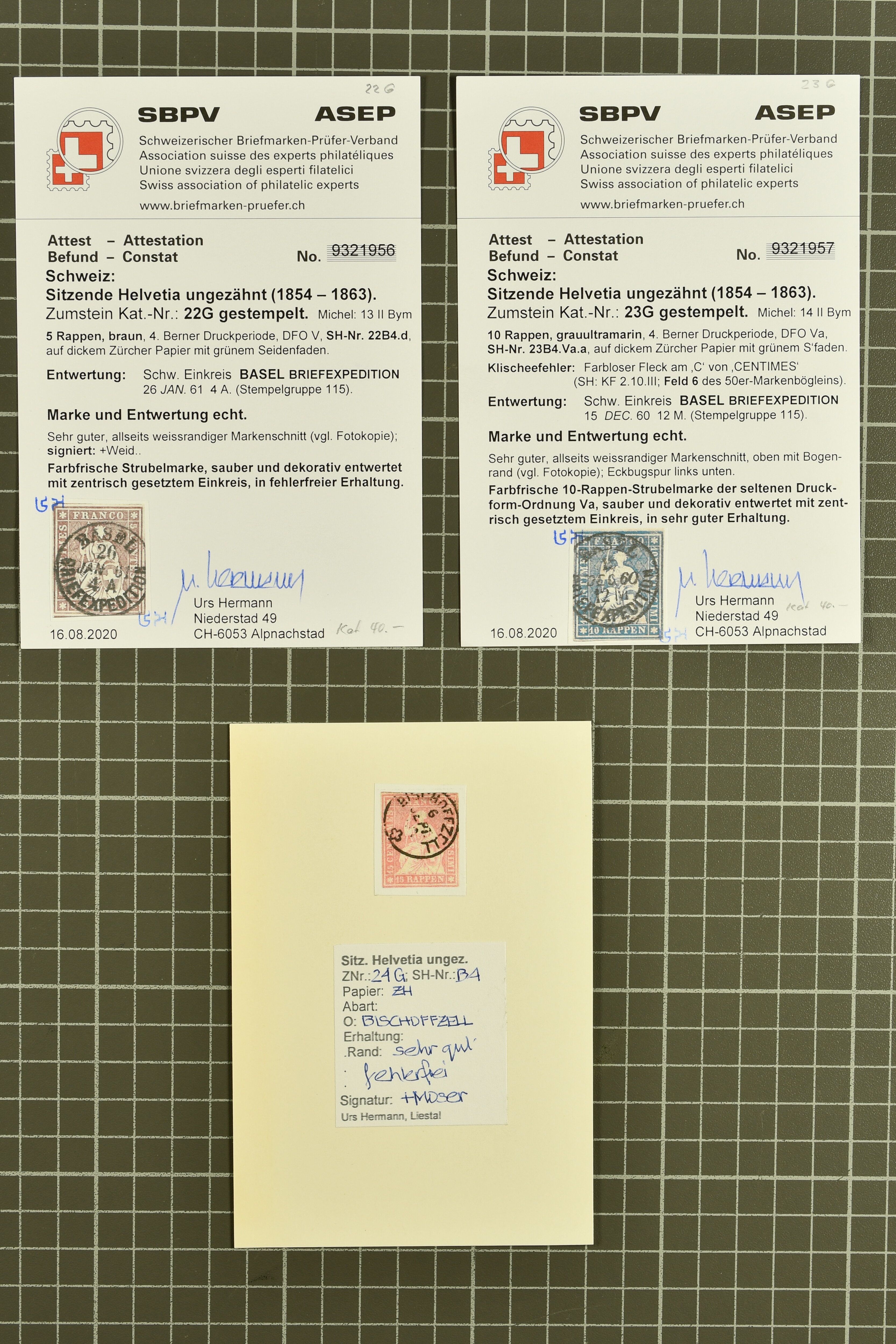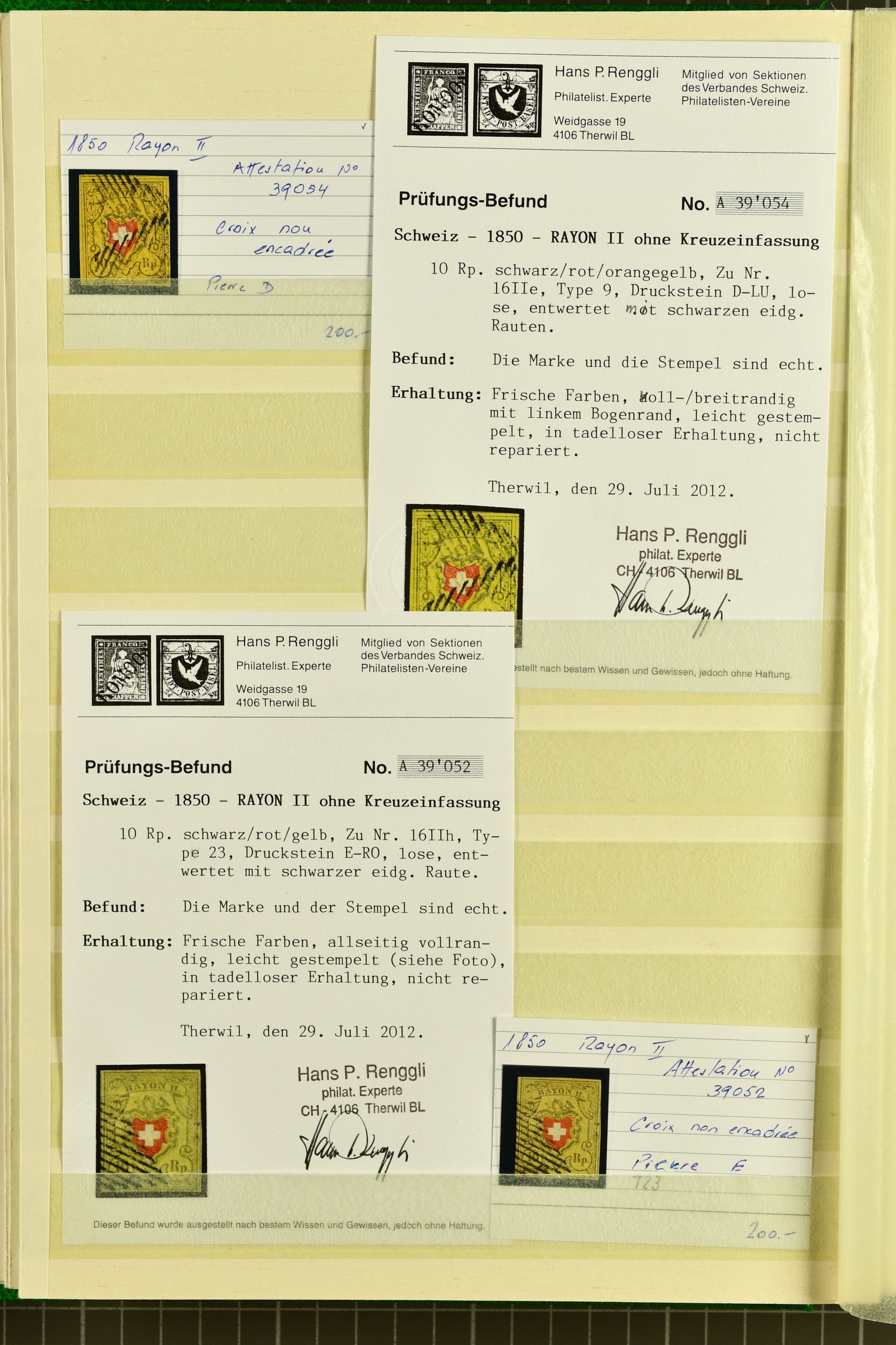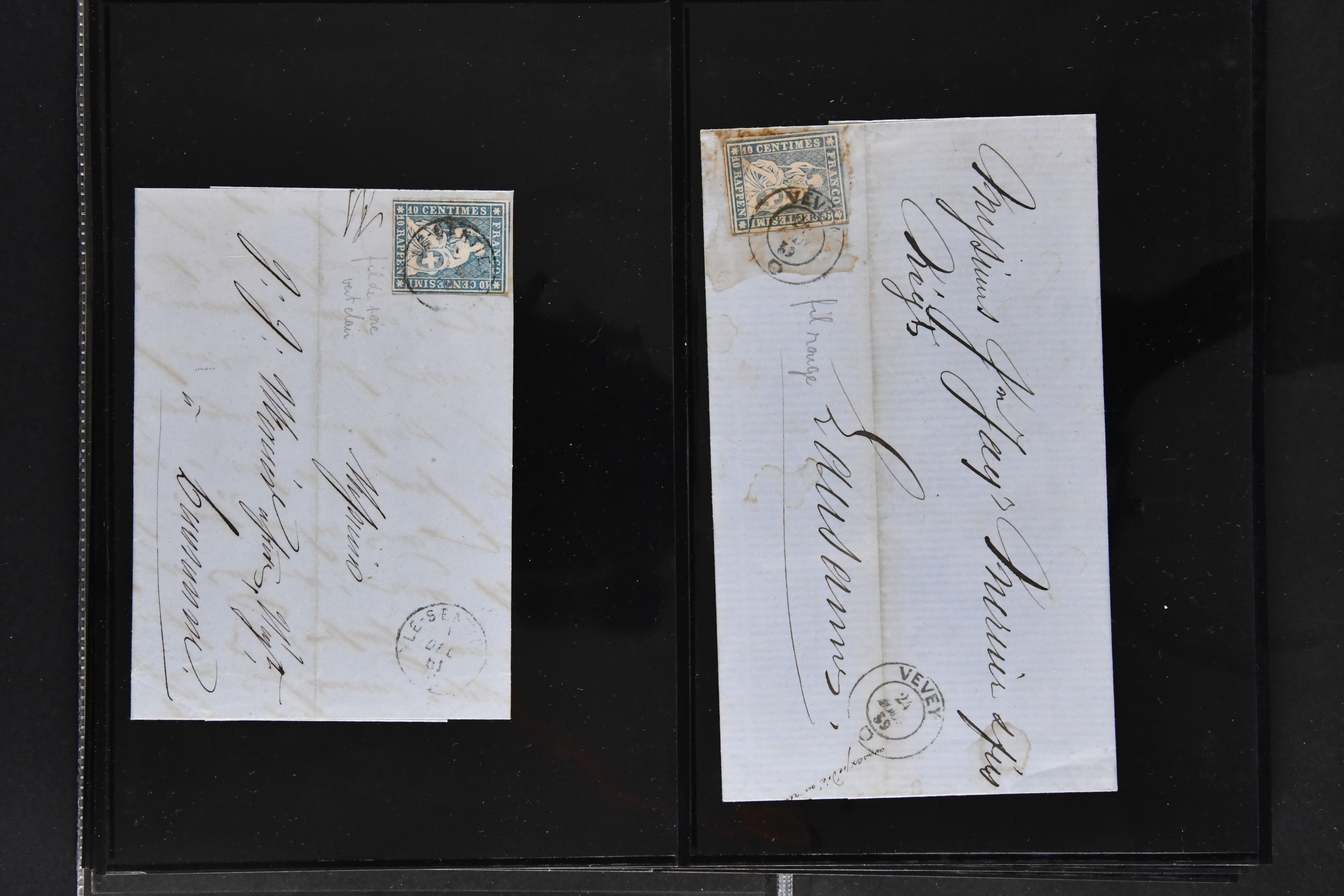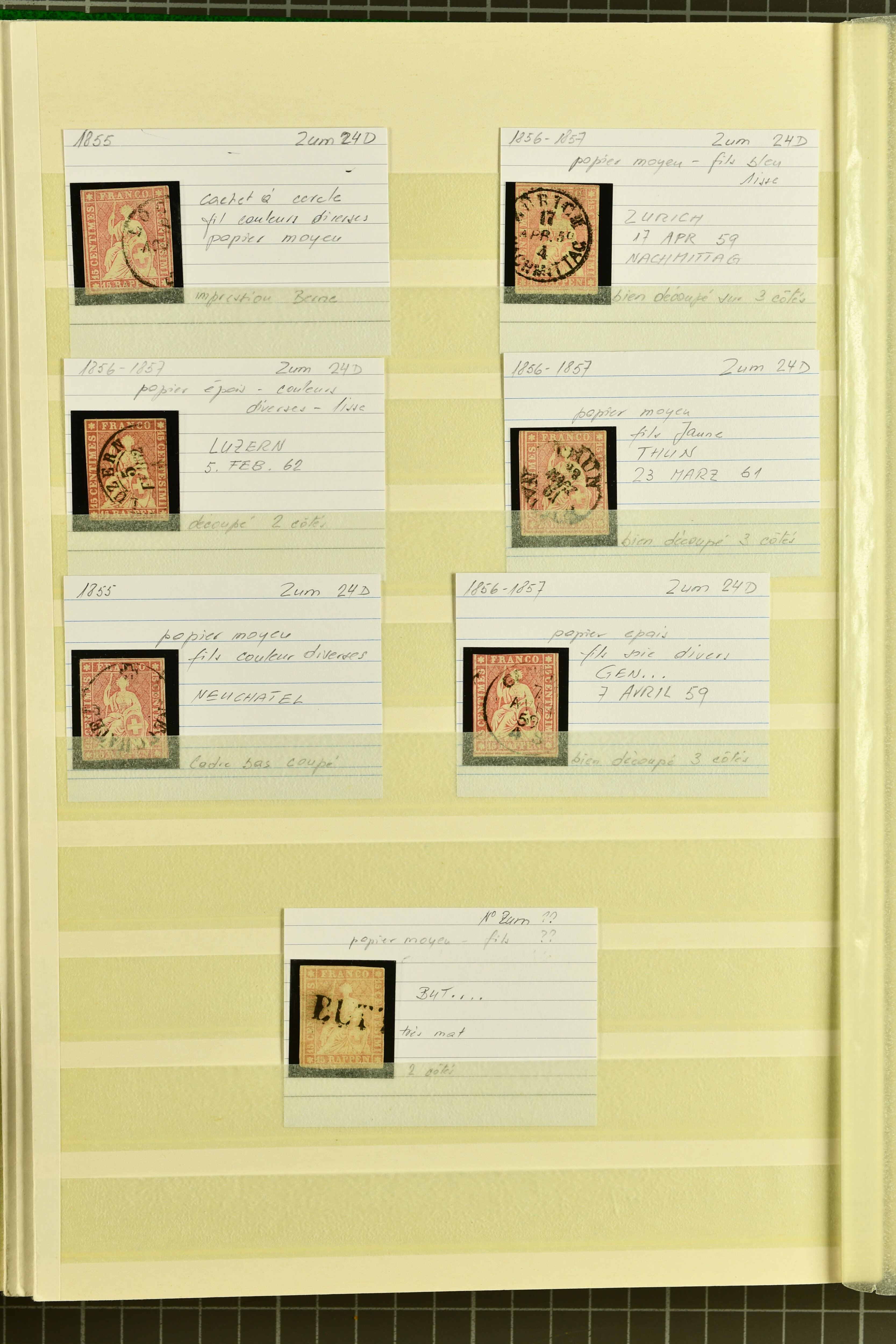 9879 cover image1850/62: Lot acht bessere Altschweiz-Frankaturen. Dabei Ortspost mit Kreuzeinfassung entw. mit schwarzer Aargauer Raute (AW 29/30) auf dekorativem Drucksachen-Streifband von Zofingen nach Niederbipp (BE), Rayon I Type 21 entw. mit schwarzem Stabstp. "BURGDORF" auf Faltbrief im 1. Briefkreis nach Langnau i.E., Rayon I hellblau (3) mit Unbekanntem Stein, Type 10 r/u mit grossem Teil der rechten Nebenmarke, klar und übergehend entw. mit blauer eidg. Raute mit nebenges. Zierlinienstempel "REINACH 5. P.K. 21 SEPT. 52" auf ungenügend frankiertem Faltbrieflein im 3. Briefkreis, nachtaxiert mit "10" Rp. in roter Tinte oder Stein B2: Typen 23+34 l/u im waagr. Paar, Rayon III, Centimes, Type 7 auf Faltbrief von Zürich nach Locarno, gr. Wertziffrer, Type 1 mit grossem Teil der linken Nebenmarke auf Faltbrieflein von Avenches nach Lausanne sowie Strubel 15 Rp. rotkarmin (SBK 24A) auf Faltbrief von Vevey nach Genf. Vereinzelt kleinere Mängel, meist aber in guter Erhaltung. Zwei Befunde, sechs Atteste. SBK=CHF 17'150 (Image 1) (Image 2) (Image 3) (Image 4) (Image 5) (Image 6) (Image 7) (Image 8)