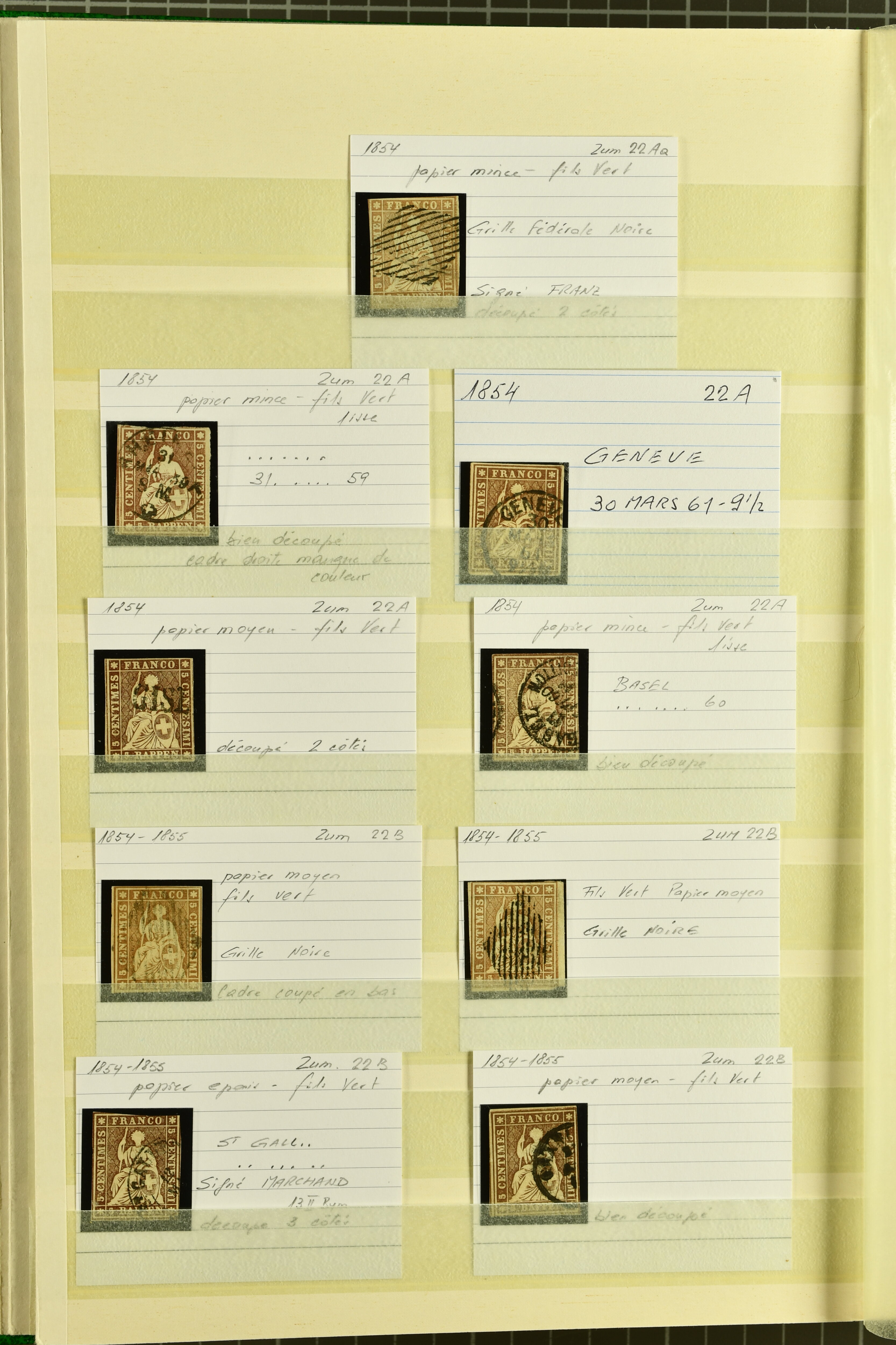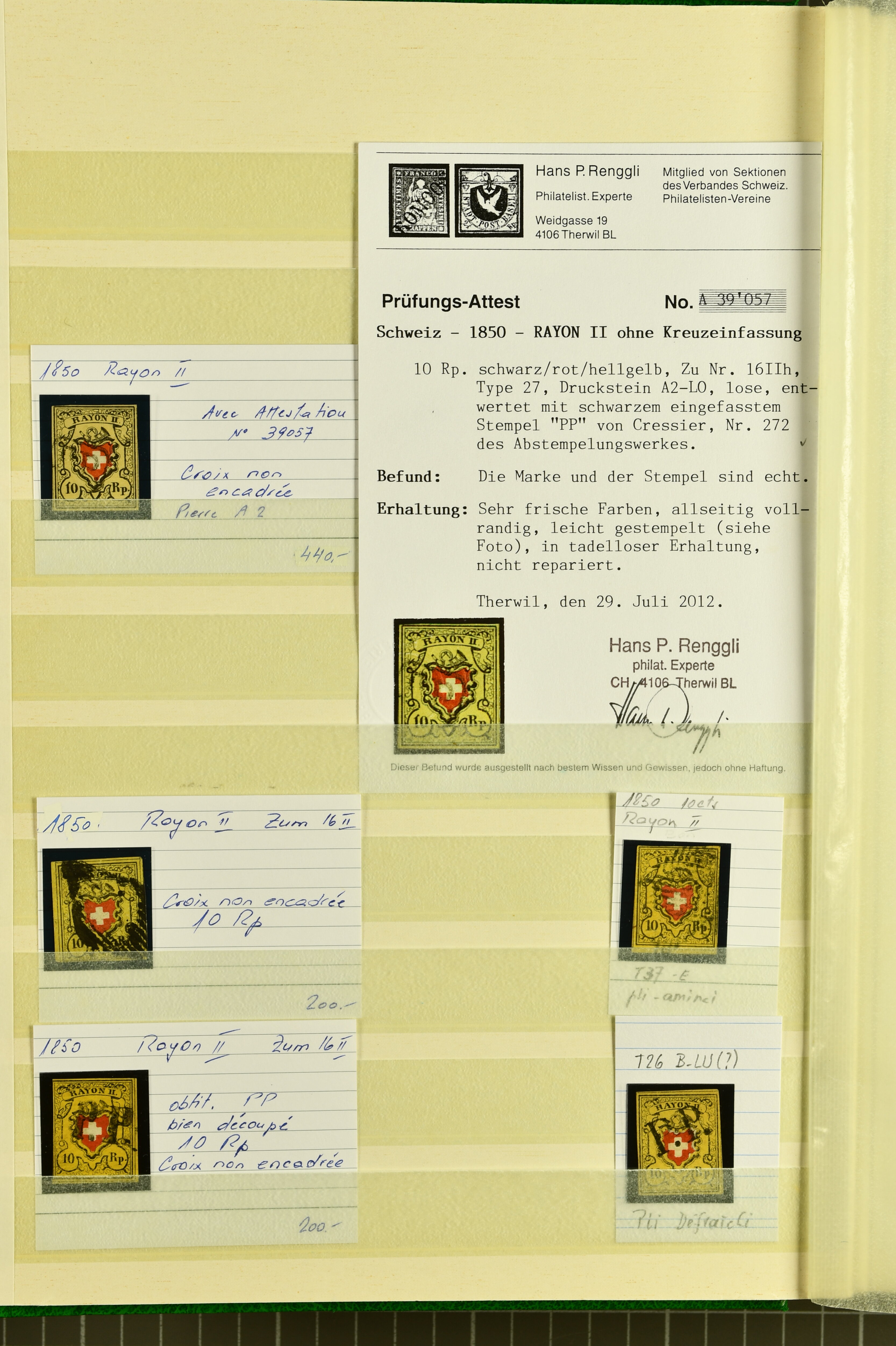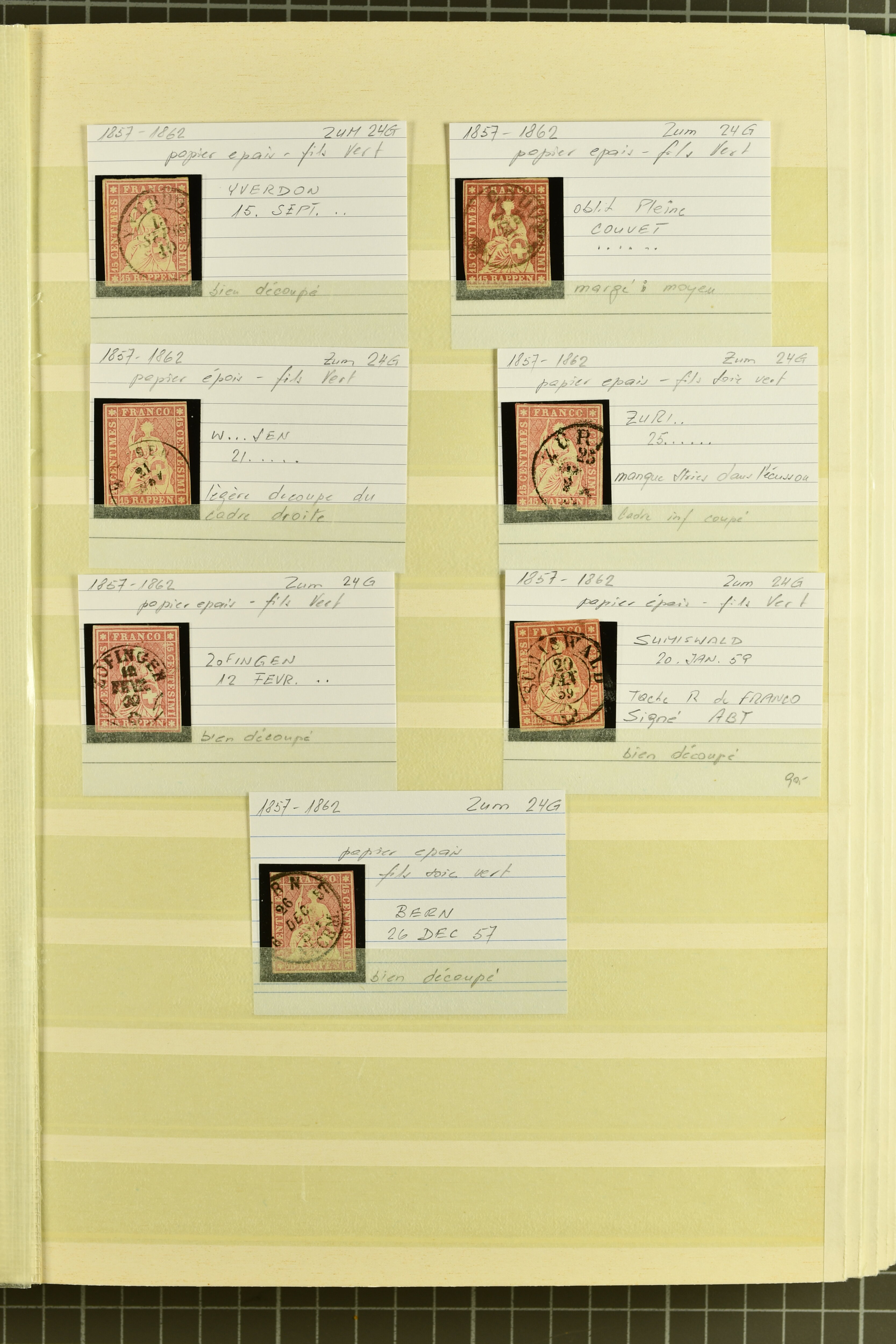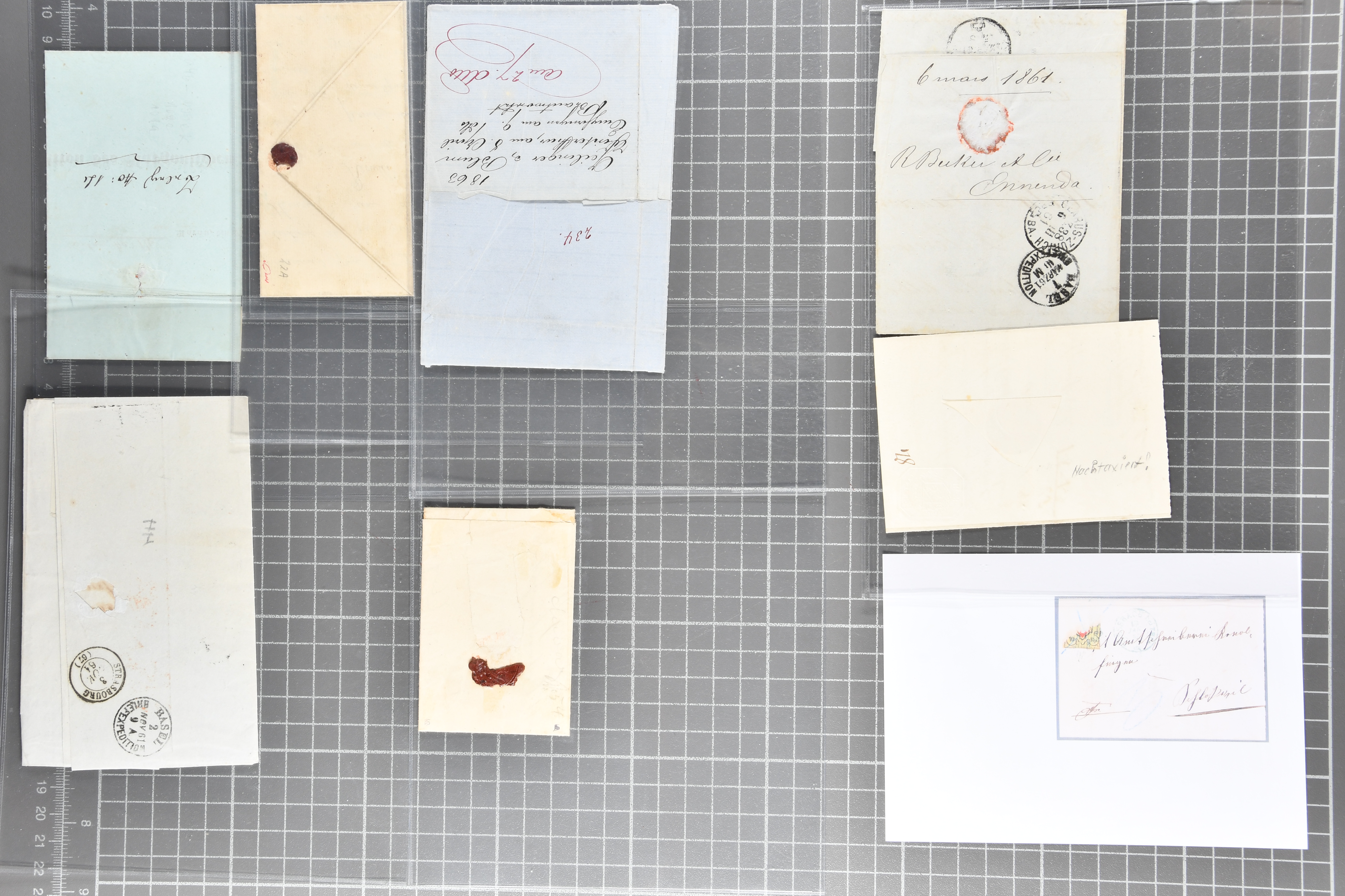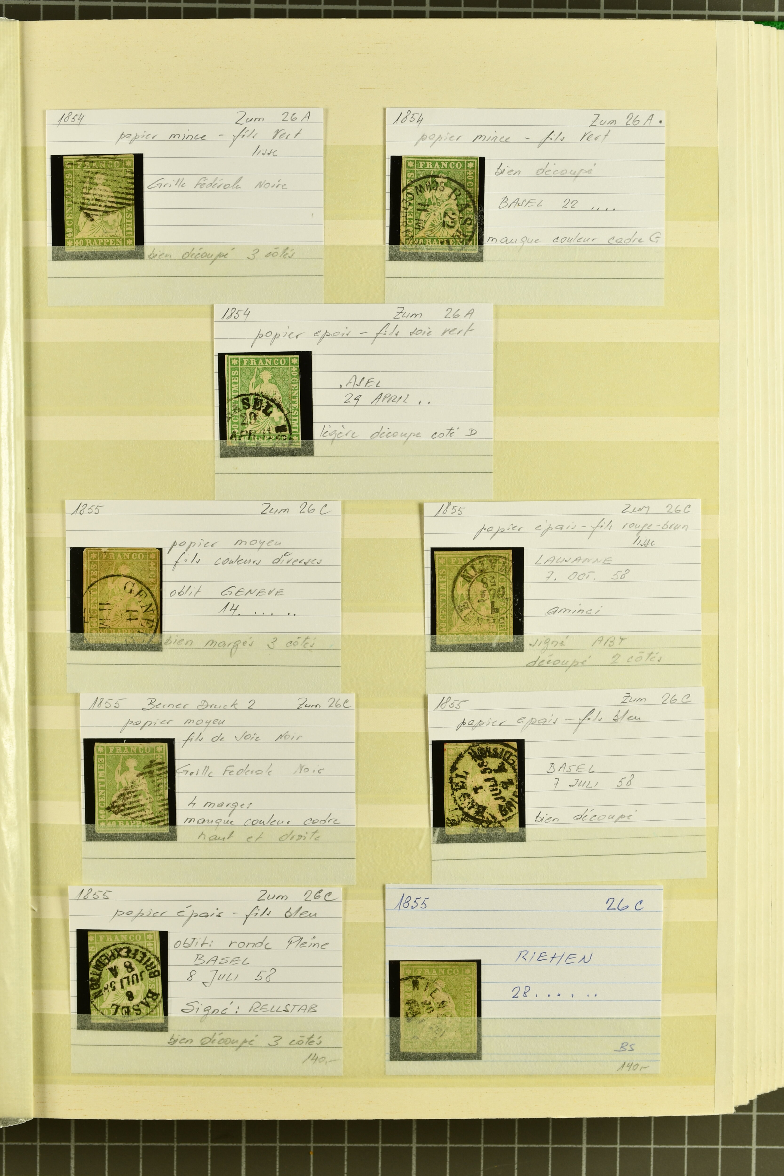 9879 cover image1850/62: Lot acht bessere Altschweiz-Frankaturen. Dabei Ortspost mit Kreuzeinfassung entw. mit schwarzer Aargauer Raute (AW 29/30) auf dekorativem Drucksachen-Streifband von Zofingen nach Niederbipp (BE), Rayon I Type 21 entw. mit schwarzem Stabstp. "BURGDORF" auf Faltbrief im 1. Briefkreis nach Langnau i.E., Rayon I hellblau (3) mit Unbekanntem Stein, Type 10 r/u mit grossem Teil der rechten Nebenmarke, klar und übergehend entw. mit blauer eidg. Raute mit nebenges. Zierlinienstempel "REINACH 5. P.K. 21 SEPT. 52" auf ungenügend frankiertem Faltbrieflein im 3. Briefkreis, nachtaxiert mit "10" Rp. in roter Tinte oder Stein B2: Typen 23+34 l/u im waagr. Paar, Rayon III, Centimes, Type 7 auf Faltbrief von Zürich nach Locarno, gr. Wertziffrer, Type 1 mit grossem Teil der linken Nebenmarke auf Faltbrieflein von Avenches nach Lausanne sowie Strubel 15 Rp. rotkarmin (SBK 24A) auf Faltbrief von Vevey nach Genf. Vereinzelt kleinere Mängel, meist aber in guter Erhaltung. Zwei Befunde, sechs Atteste. SBK=CHF 17'150 (Image 1) (Image 2) (Image 3) (Image 4) (Image 5) (Image 6) (Image 7) (Image 8)