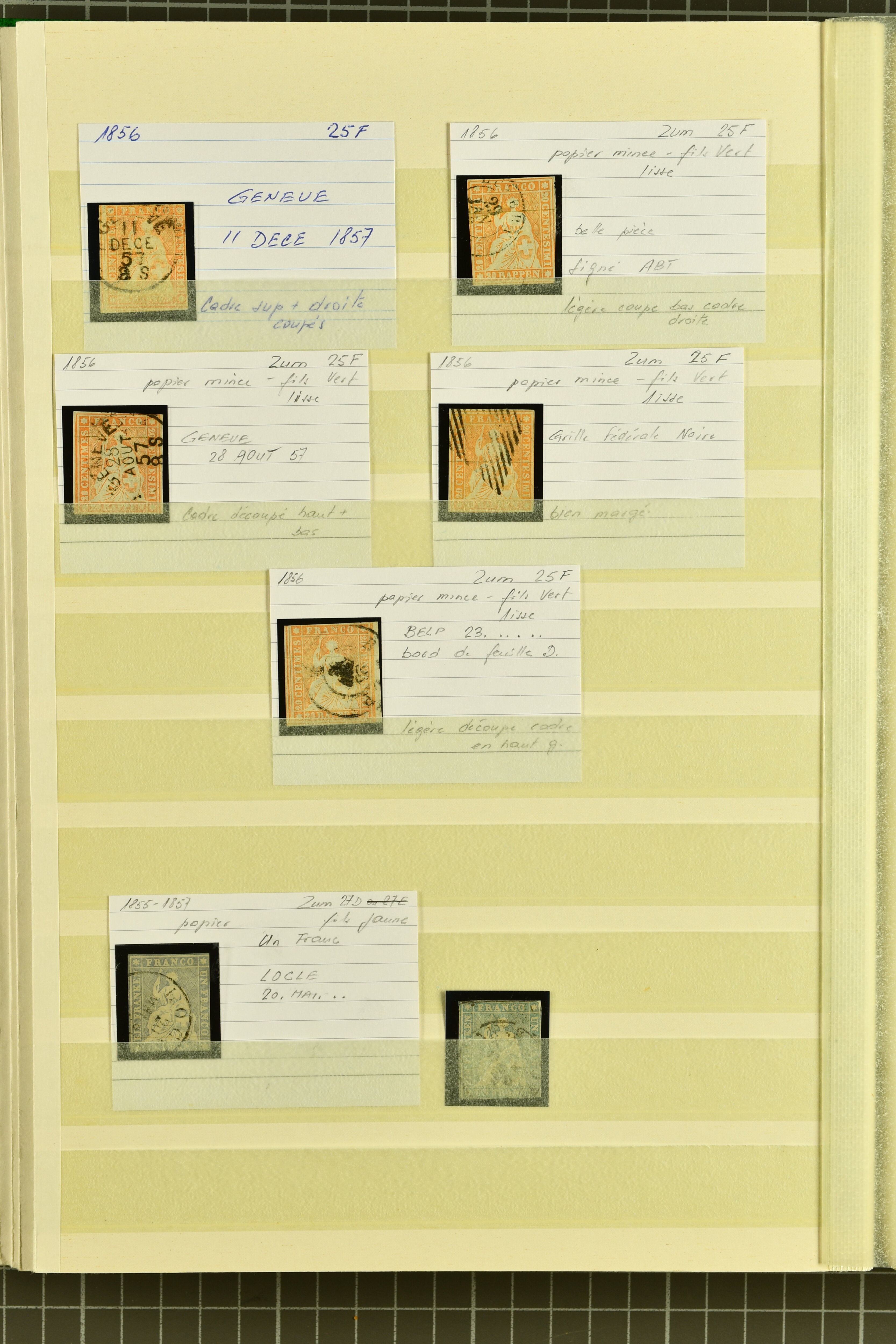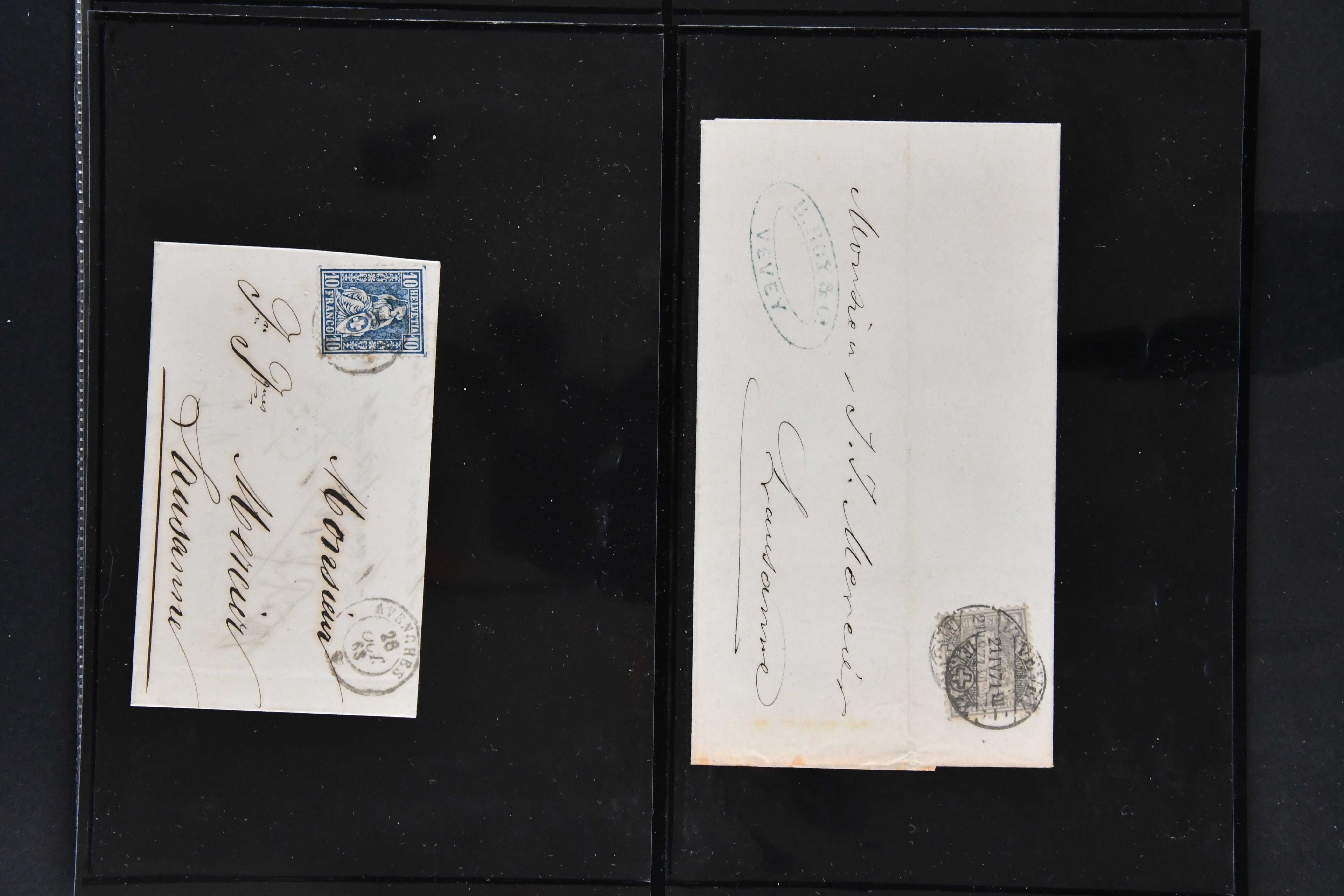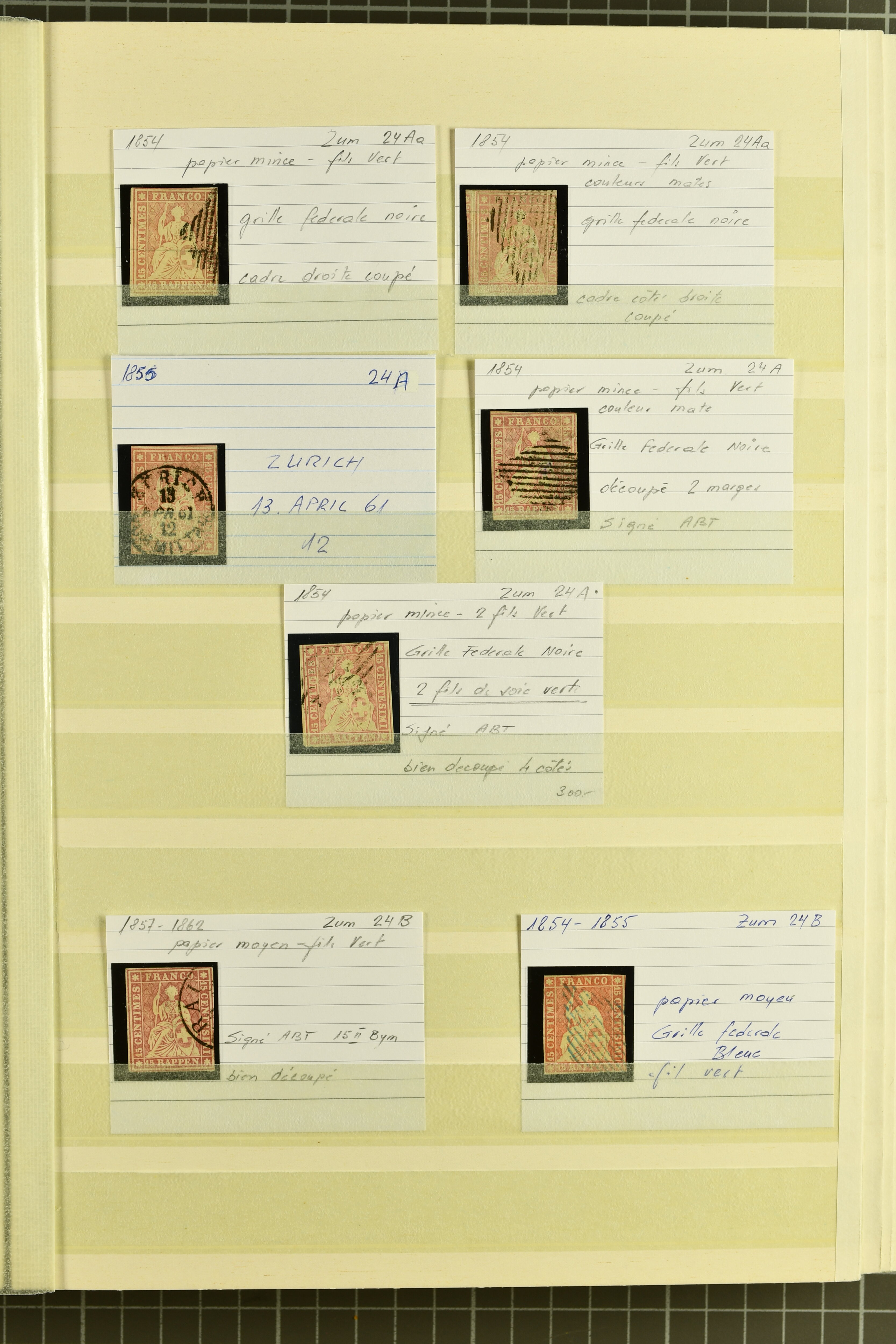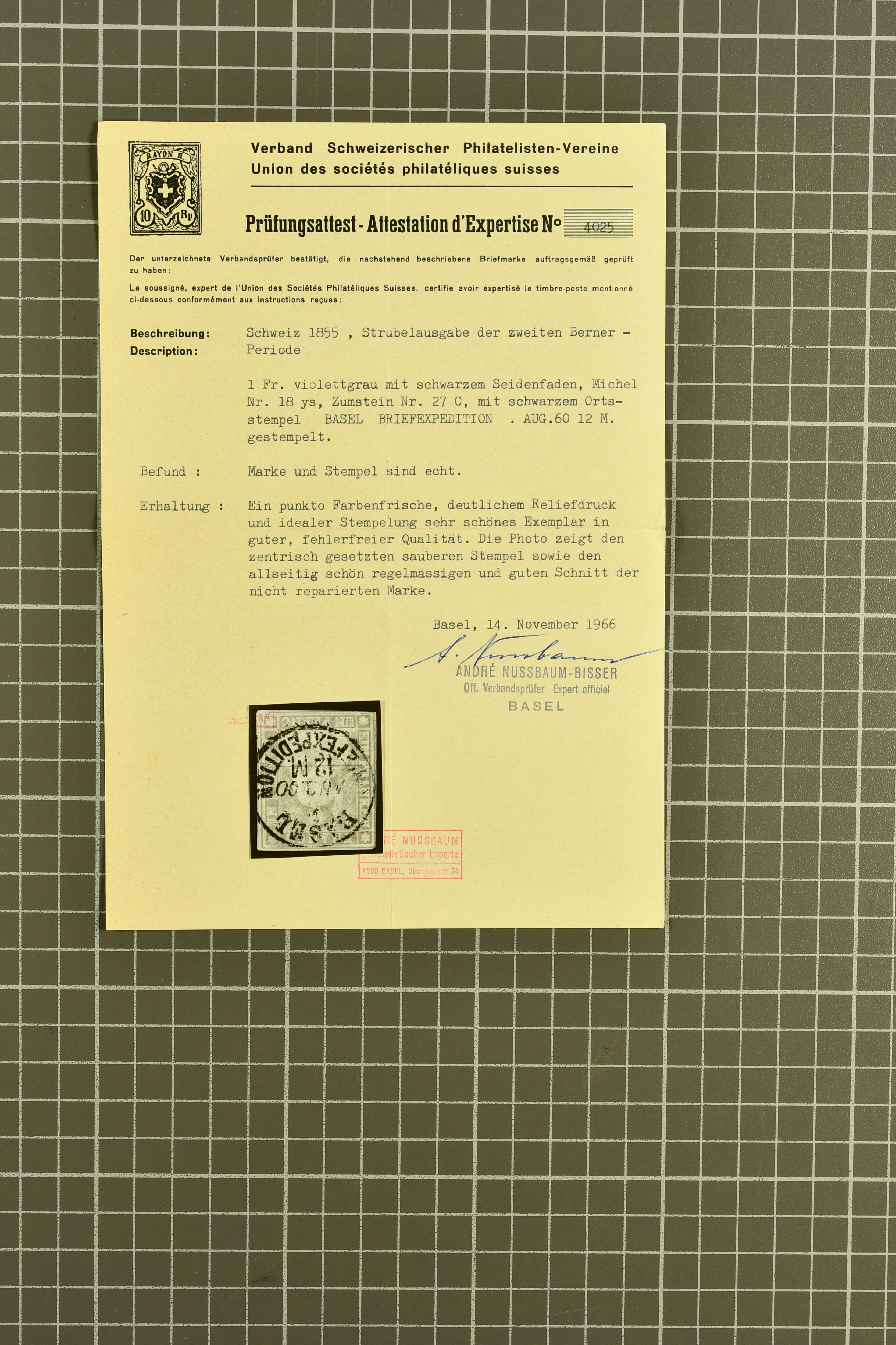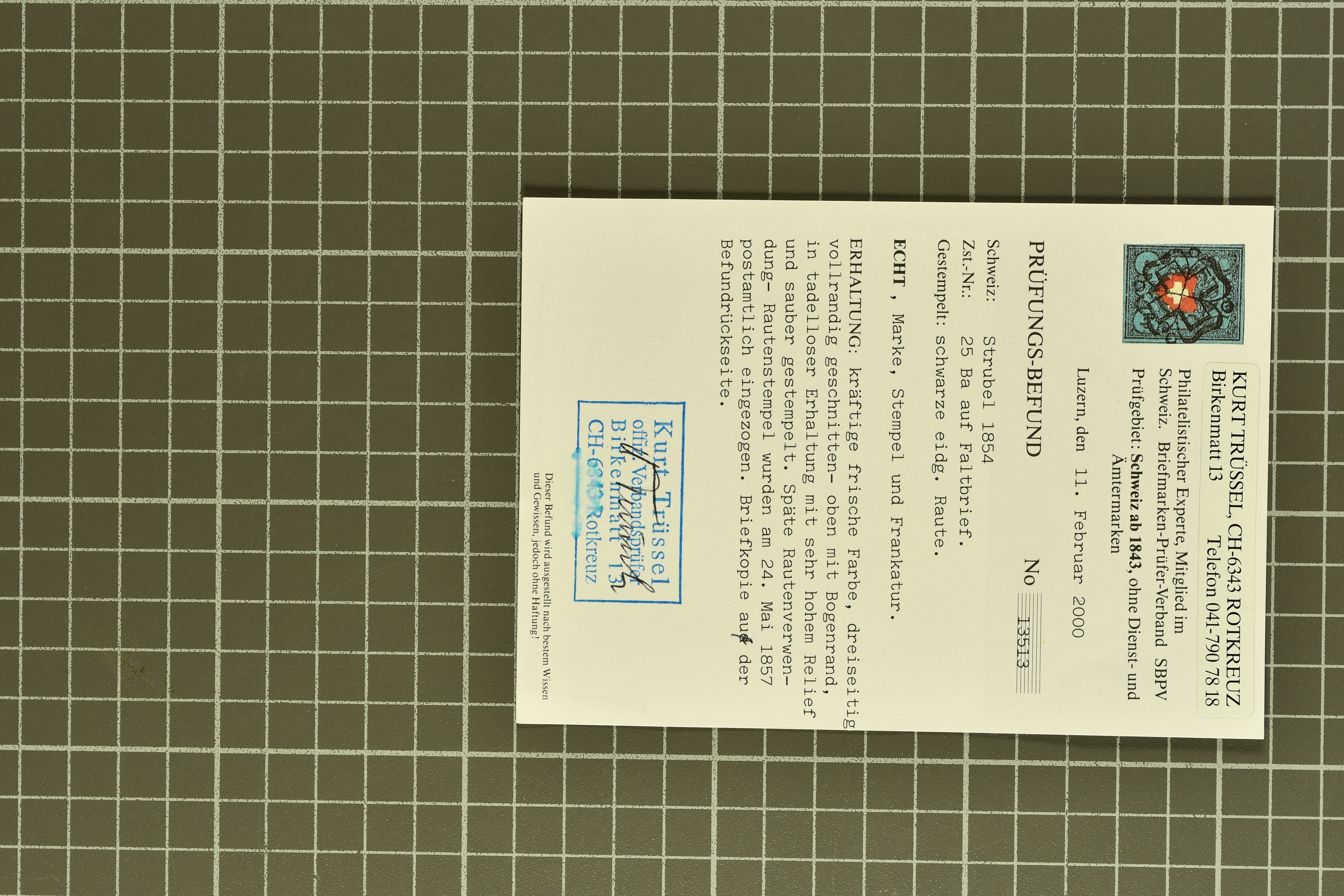 9879 cover image1850/62: Lot acht bessere Altschweiz-Frankaturen. Dabei Ortspost mit Kreuzeinfassung entw. mit schwarzer Aargauer Raute (AW 29/30) auf dekorativem Drucksachen-Streifband von Zofingen nach Niederbipp (BE), Rayon I Type 21 entw. mit schwarzem Stabstp. "BURGDORF" auf Faltbrief im 1. Briefkreis nach Langnau i.E., Rayon I hellblau (3) mit Unbekanntem Stein, Type 10 r/u mit grossem Teil der rechten Nebenmarke, klar und übergehend entw. mit blauer eidg. Raute mit nebenges. Zierlinienstempel "REINACH 5. P.K. 21 SEPT. 52" auf ungenügend frankiertem Faltbrieflein im 3. Briefkreis, nachtaxiert mit "10" Rp. in roter Tinte oder Stein B2: Typen 23+34 l/u im waagr. Paar, Rayon III, Centimes, Type 7 auf Faltbrief von Zürich nach Locarno, gr. Wertziffrer, Type 1 mit grossem Teil der linken Nebenmarke auf Faltbrieflein von Avenches nach Lausanne sowie Strubel 15 Rp. rotkarmin (SBK 24A) auf Faltbrief von Vevey nach Genf. Vereinzelt kleinere Mängel, meist aber in guter Erhaltung. Zwei Befunde, sechs Atteste. SBK=CHF 17'150 (Image 1) (Image 2) (Image 3) (Image 4) (Image 5) (Image 6) (Image 7) (Image 8)