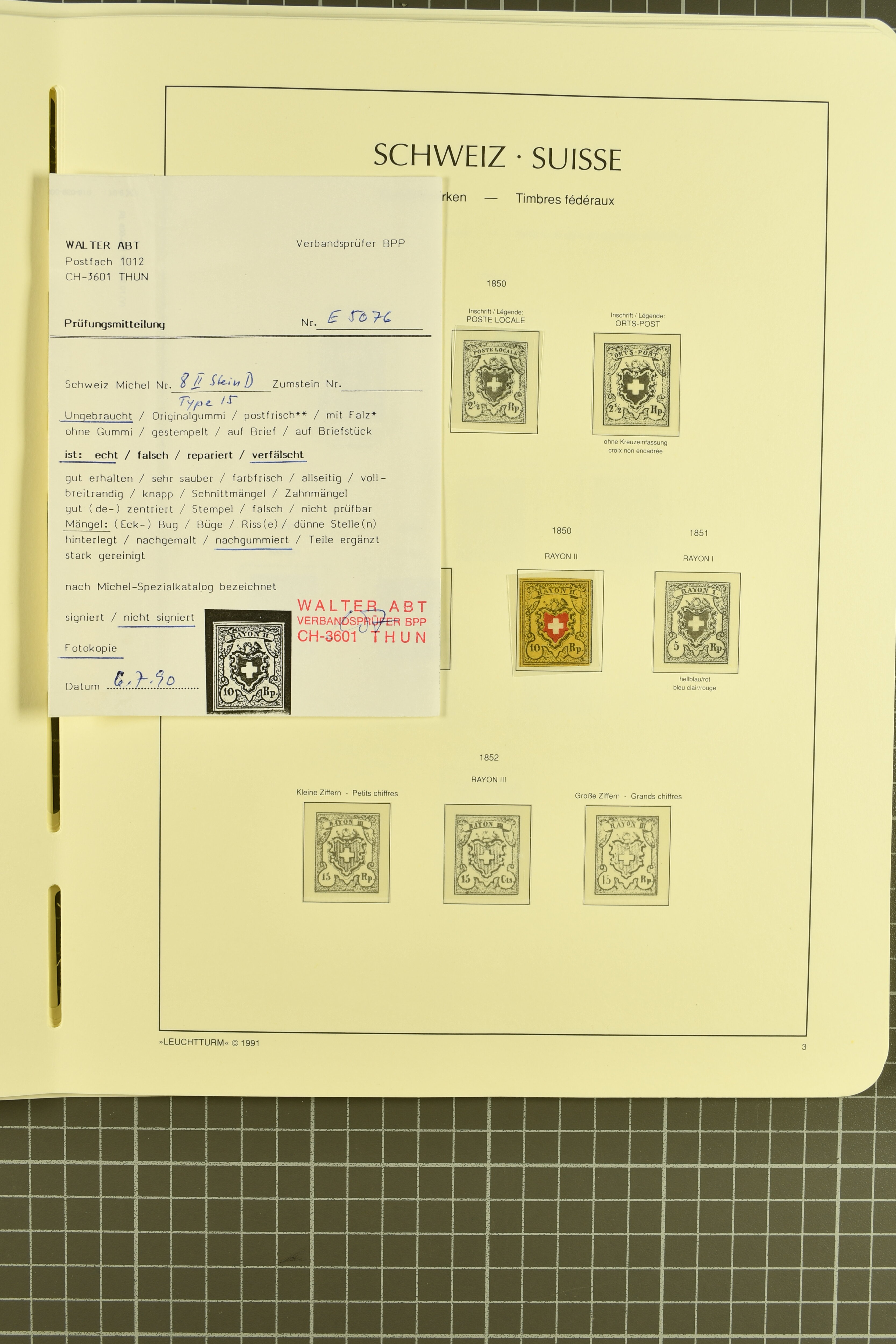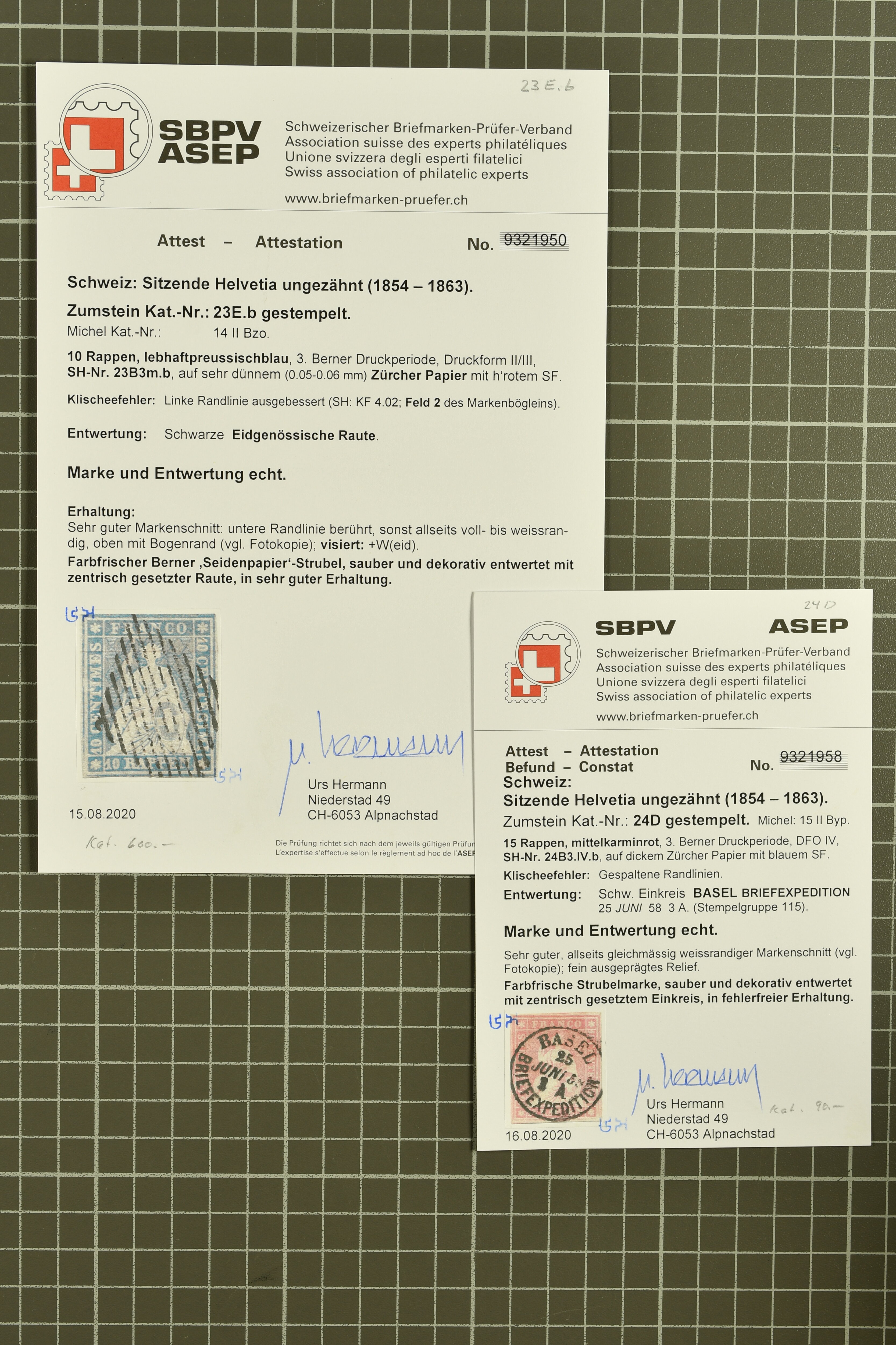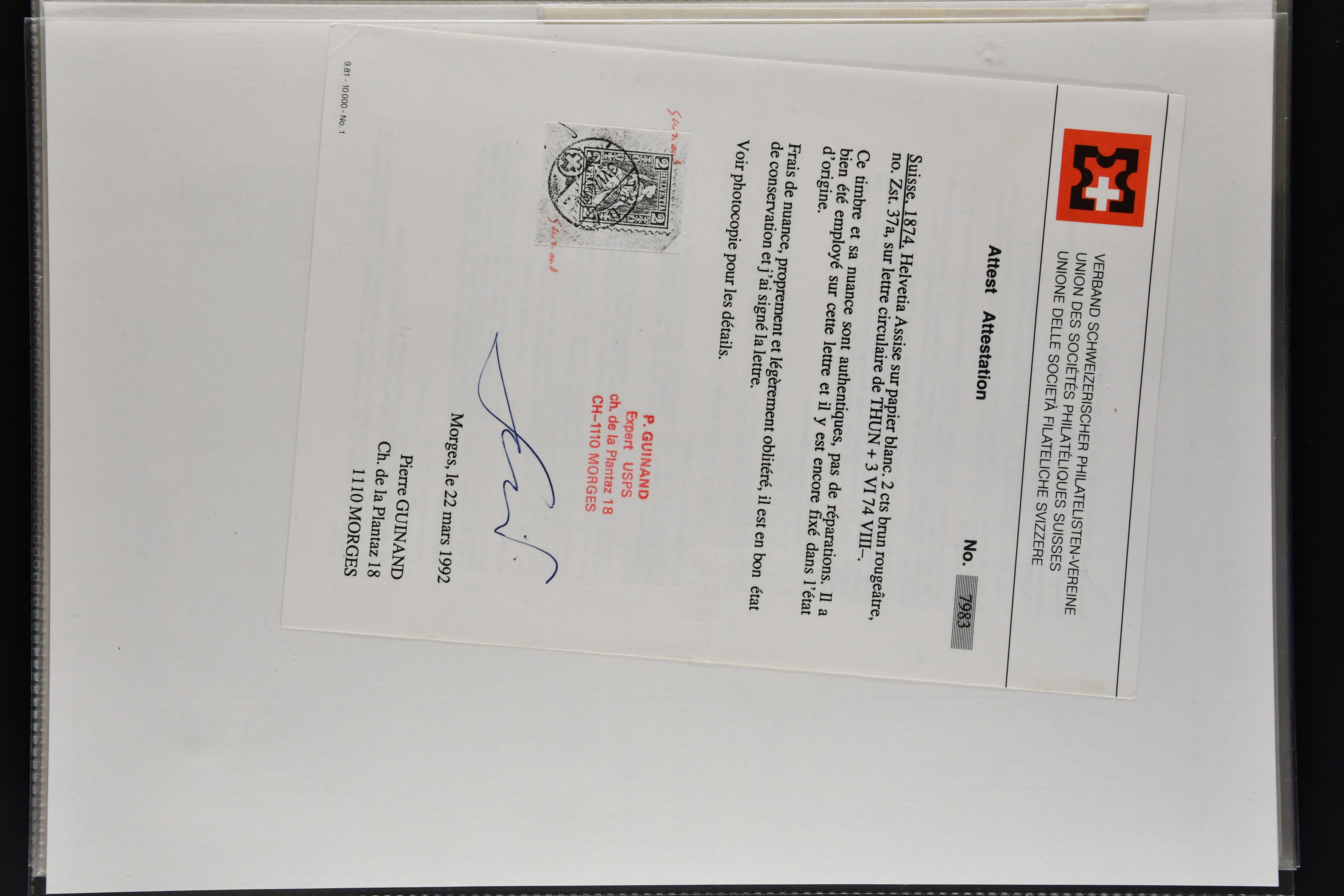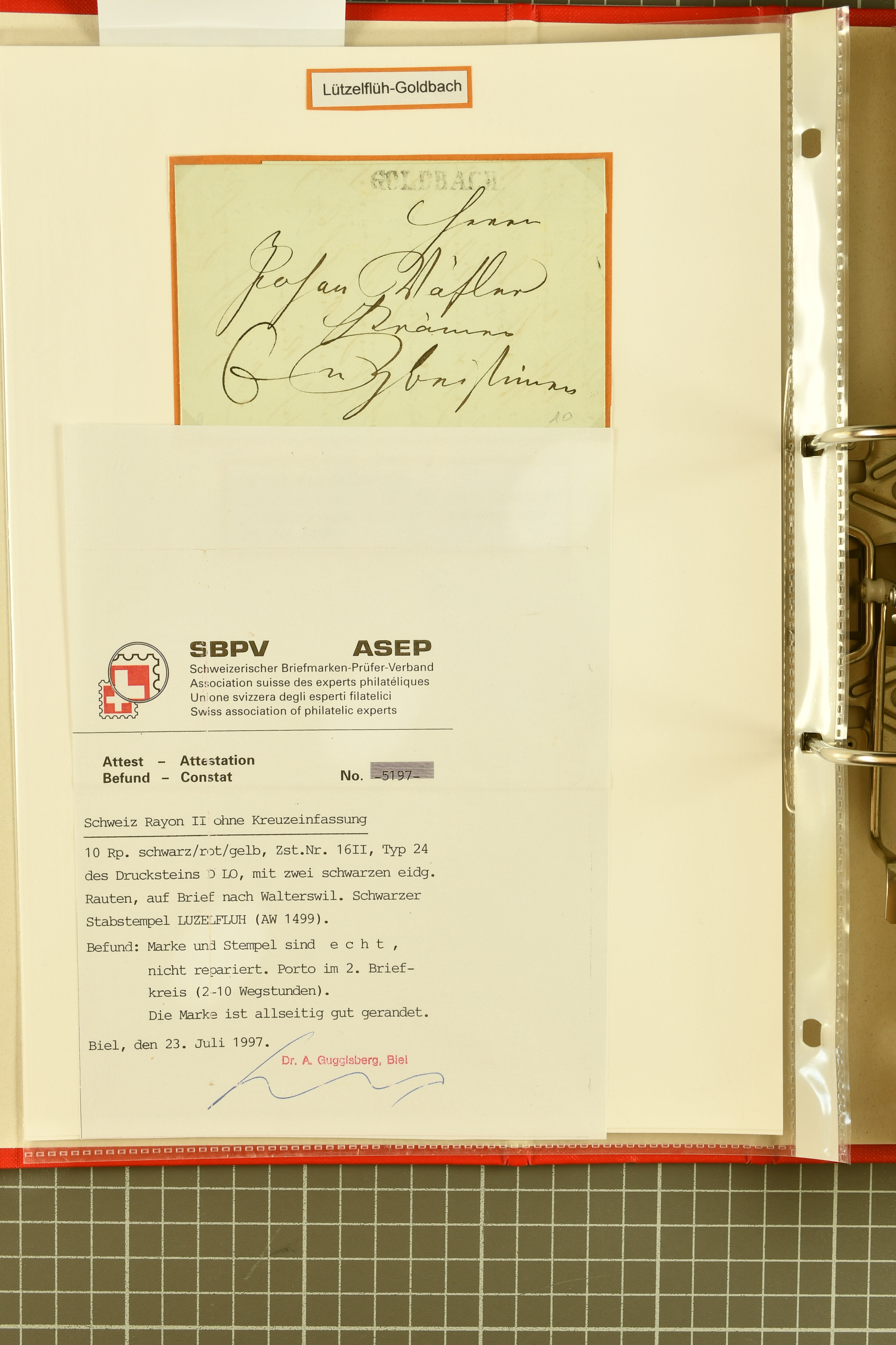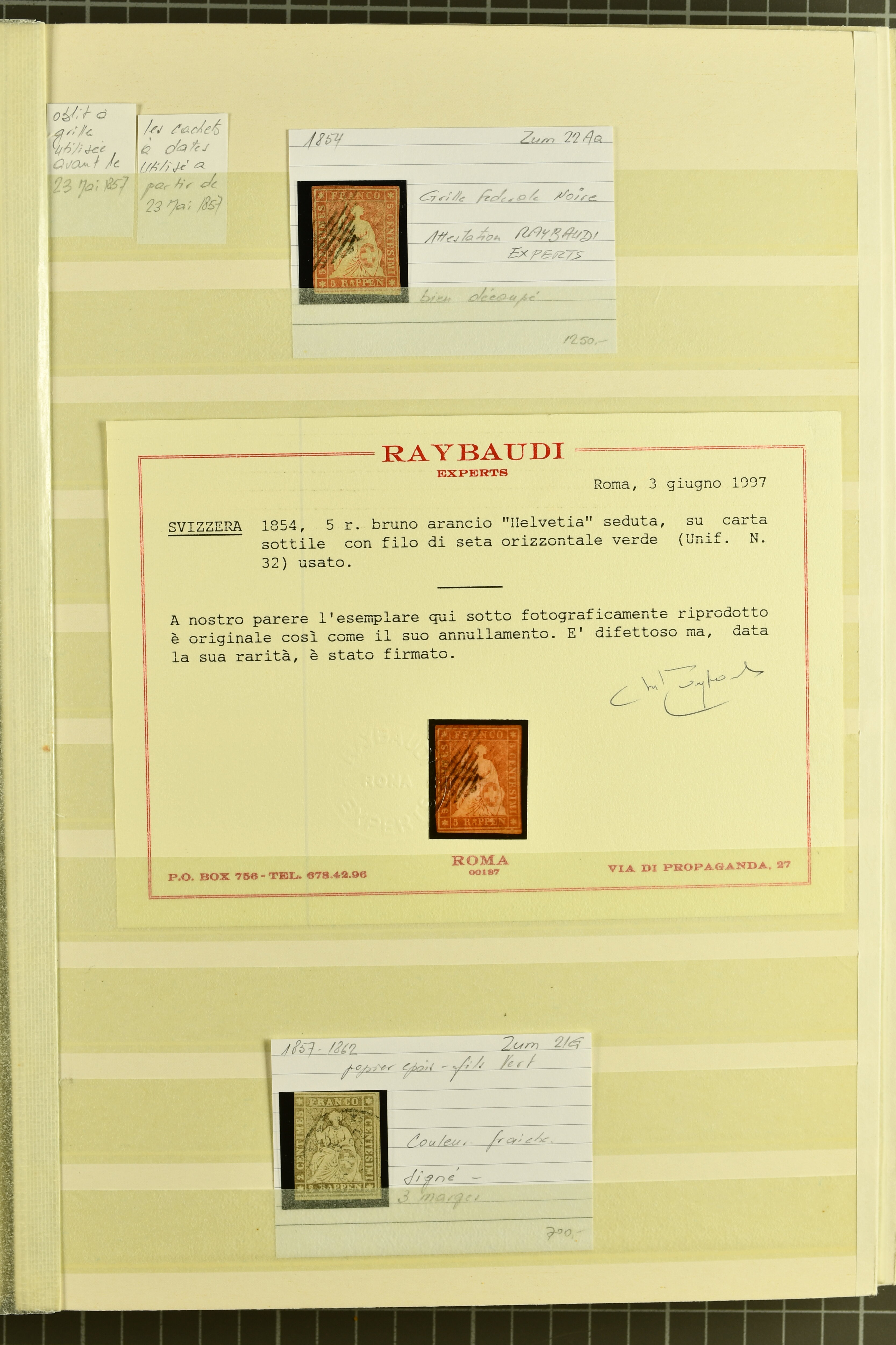 9879 cover image1850/62: Lot acht bessere Altschweiz-Frankaturen. Dabei Ortspost mit Kreuzeinfassung entw. mit schwarzer Aargauer Raute (AW 29/30) auf dekorativem Drucksachen-Streifband von Zofingen nach Niederbipp (BE), Rayon I Type 21 entw. mit schwarzem Stabstp. "BURGDORF" auf Faltbrief im 1. Briefkreis nach Langnau i.E., Rayon I hellblau (3) mit Unbekanntem Stein, Type 10 r/u mit grossem Teil der rechten Nebenmarke, klar und übergehend entw. mit blauer eidg. Raute mit nebenges. Zierlinienstempel "REINACH 5. P.K. 21 SEPT. 52" auf ungenügend frankiertem Faltbrieflein im 3. Briefkreis, nachtaxiert mit "10" Rp. in roter Tinte oder Stein B2: Typen 23+34 l/u im waagr. Paar, Rayon III, Centimes, Type 7 auf Faltbrief von Zürich nach Locarno, gr. Wertziffrer, Type 1 mit grossem Teil der linken Nebenmarke auf Faltbrieflein von Avenches nach Lausanne sowie Strubel 15 Rp. rotkarmin (SBK 24A) auf Faltbrief von Vevey nach Genf. Vereinzelt kleinere Mängel, meist aber in guter Erhaltung. Zwei Befunde, sechs Atteste. SBK=CHF 17'150 (Image 1) (Image 2) (Image 3) (Image 4) (Image 5) (Image 6) (Image 7) (Image 8)